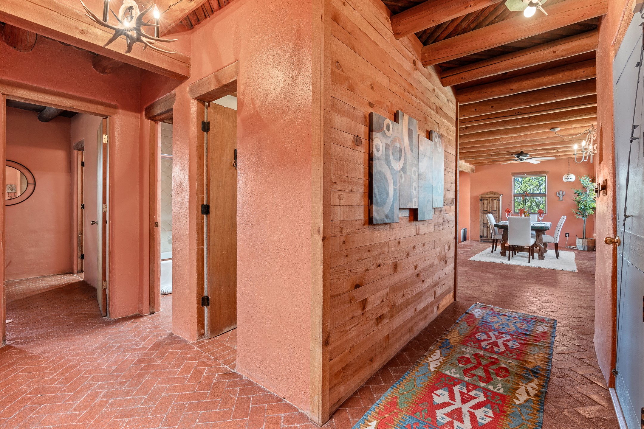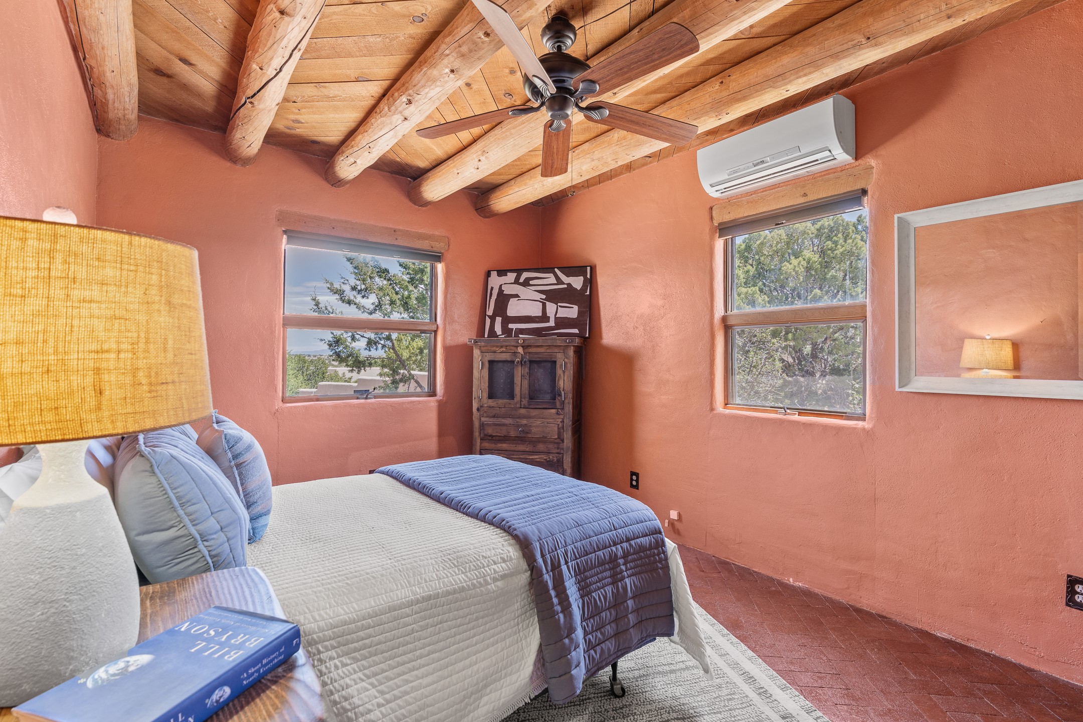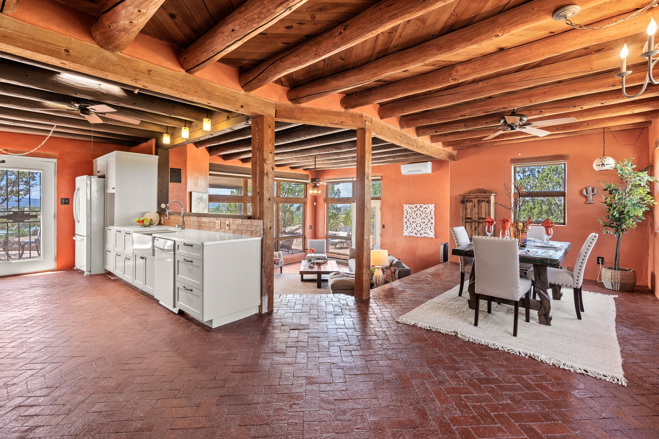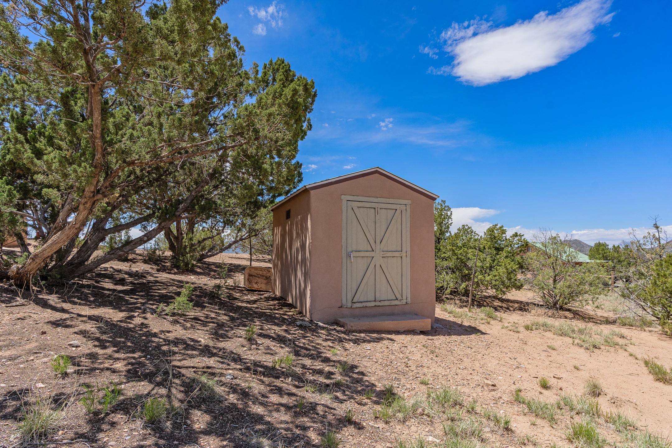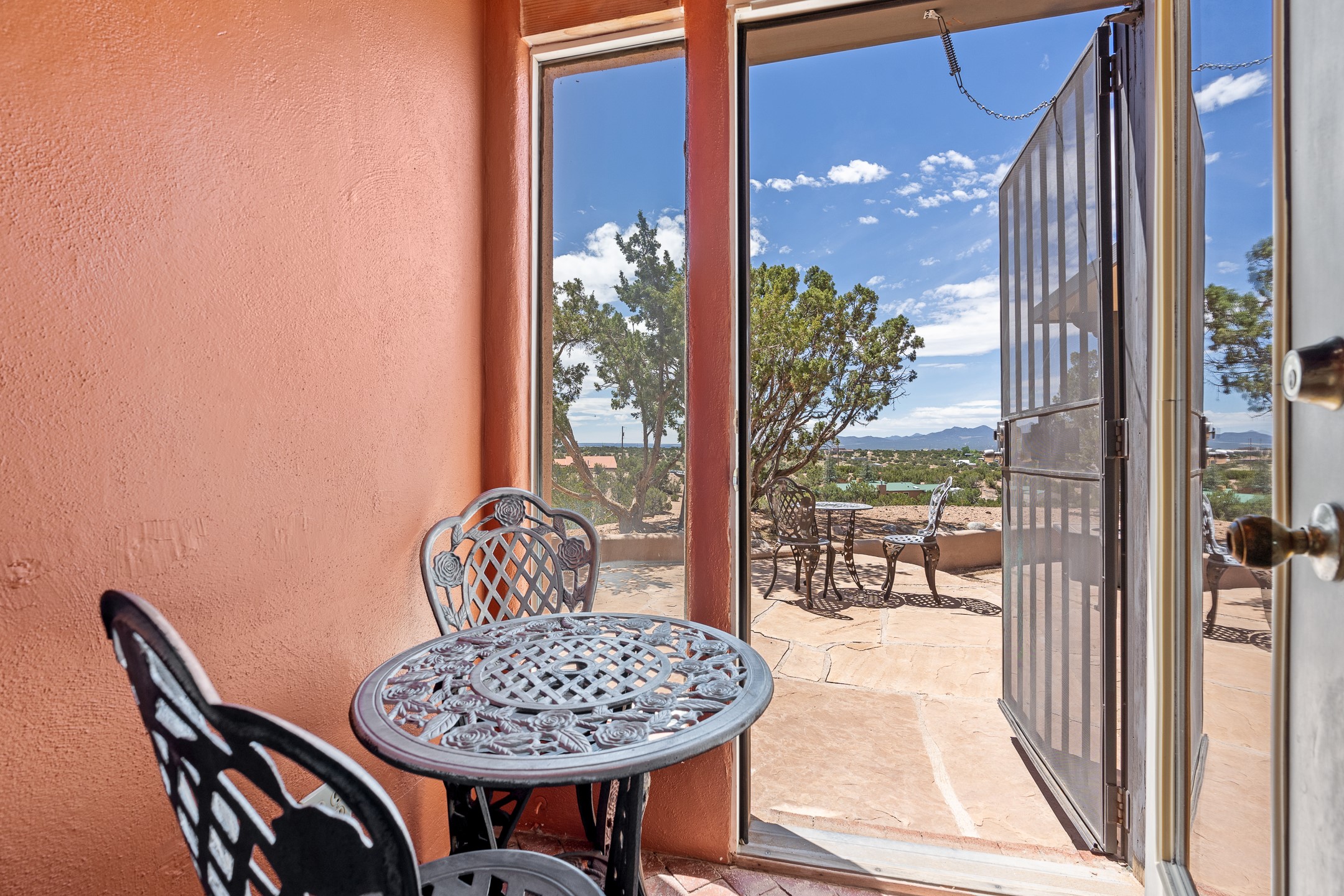 Escape to serenity with this truly unique 2 Bedroom, 2 bath 1520 sq. ft single-family home perched atop a peaceful plateau just off Hwy 14. Situated on 3.5 acres with gated access, this property offers privacy, security, and panoramic mountain views in every direction--perfect for soaking in spectacular sunsets and the quiet stillness of nature. Crafted with rustic charm in mind, the home features brick floors, wood ceilings, exposed vigas, and a traditional kiva fireplace that brings warmth and Southwestern character to the living space. With 2 spacious bedrooms and 2 full baths, it's the ideal size for a peaceful retreat or full-time living. Enjoy the expansive outdoor space, ideal for horses, gardens, or simply enjoying the wide-open sky. The 2-car garage offers ample storage, and the location provides convenient access to Santa Fe while feeling worlds away from the hustle and bustle. If you're seeking a western lifestyle surrounded by natural beauty and timeless charm, this is the one.