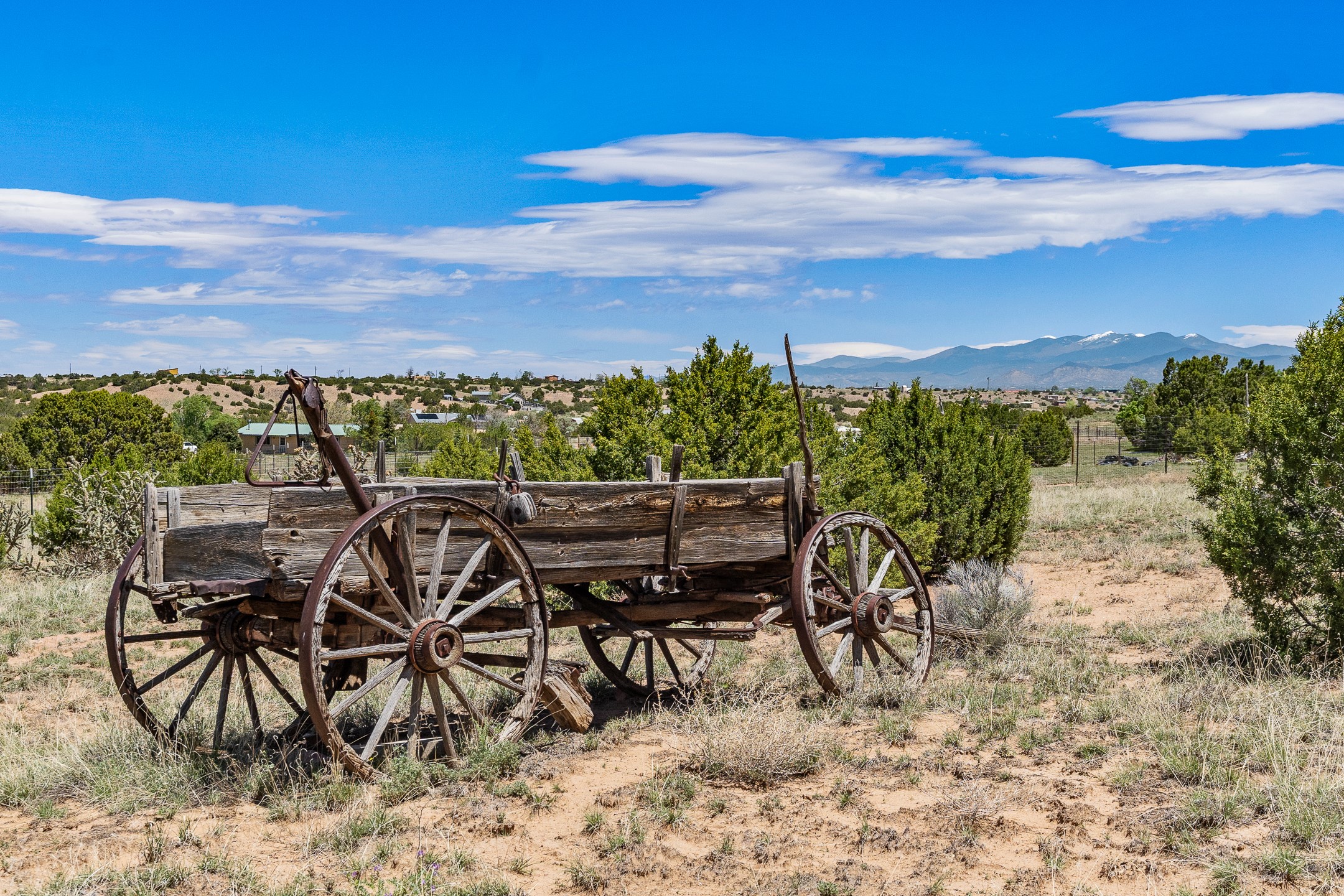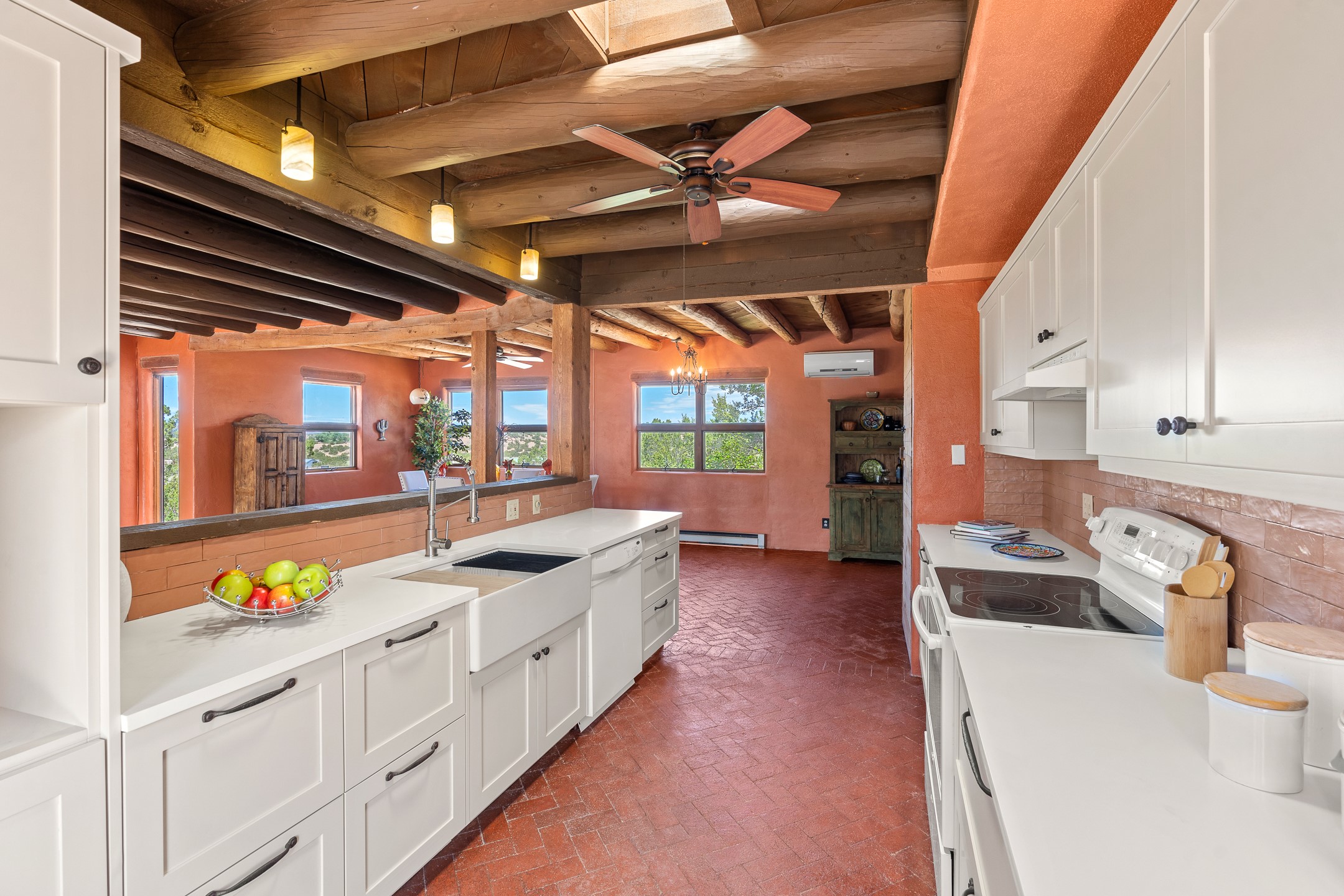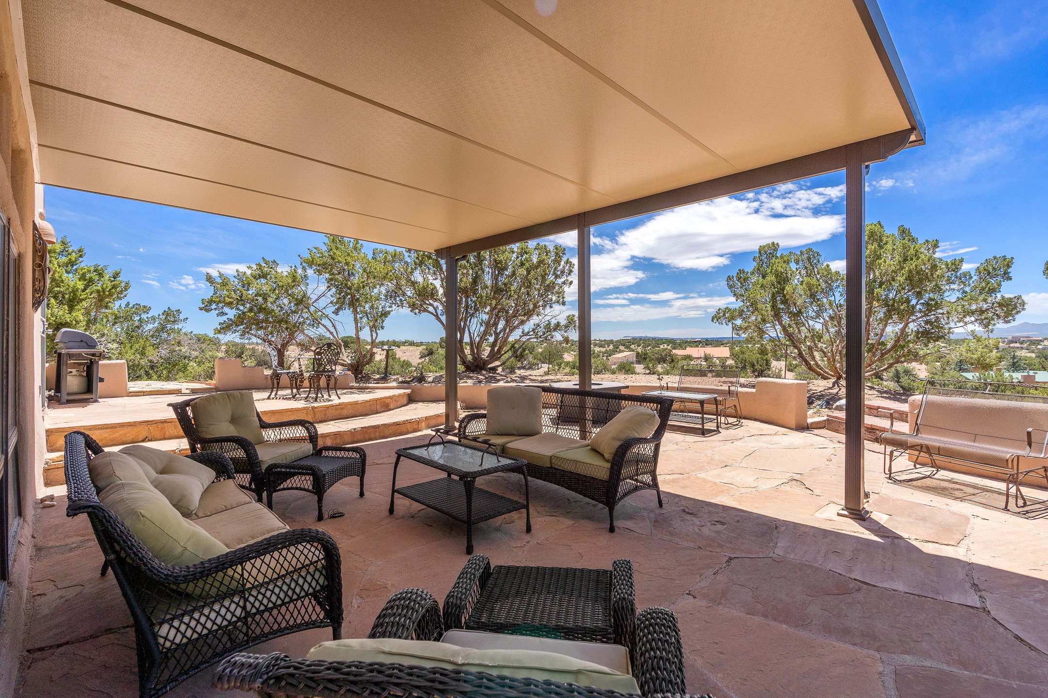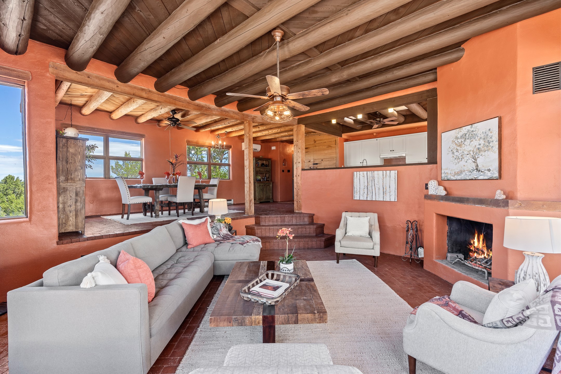 Escape to serenity with this truly unique 2 Bedroom, 2 bath 1520 sq. ft single-family home perched atop a peaceful plateau just off Hwy 14. Situated on 3.5 acres with gated access, this property offers privacy, security, and panoramic mountain views in every direction--perfect for soaking in spectacular sunsets and the quiet stillness of nature. Crafted with rustic charm in mind, the home features brick floors, wood ceilings, exposed vigas, and a traditional kiva fireplace that brings warmth and Southwestern character to the living space. With 2 spacious bedrooms and 2 full baths, it's the ideal size for a peaceful retreat or full-time living. Enjoy the expansive outdoor space, ideal for horses, gardens, or simply enjoying the wide-open sky. The 2-car garage offers ample storage, and the location provides convenient access to Santa Fe while feeling worlds away from the hustle and bustle. If you're seeking a western lifestyle surrounded by natural beauty and timeless charm, this is the one.