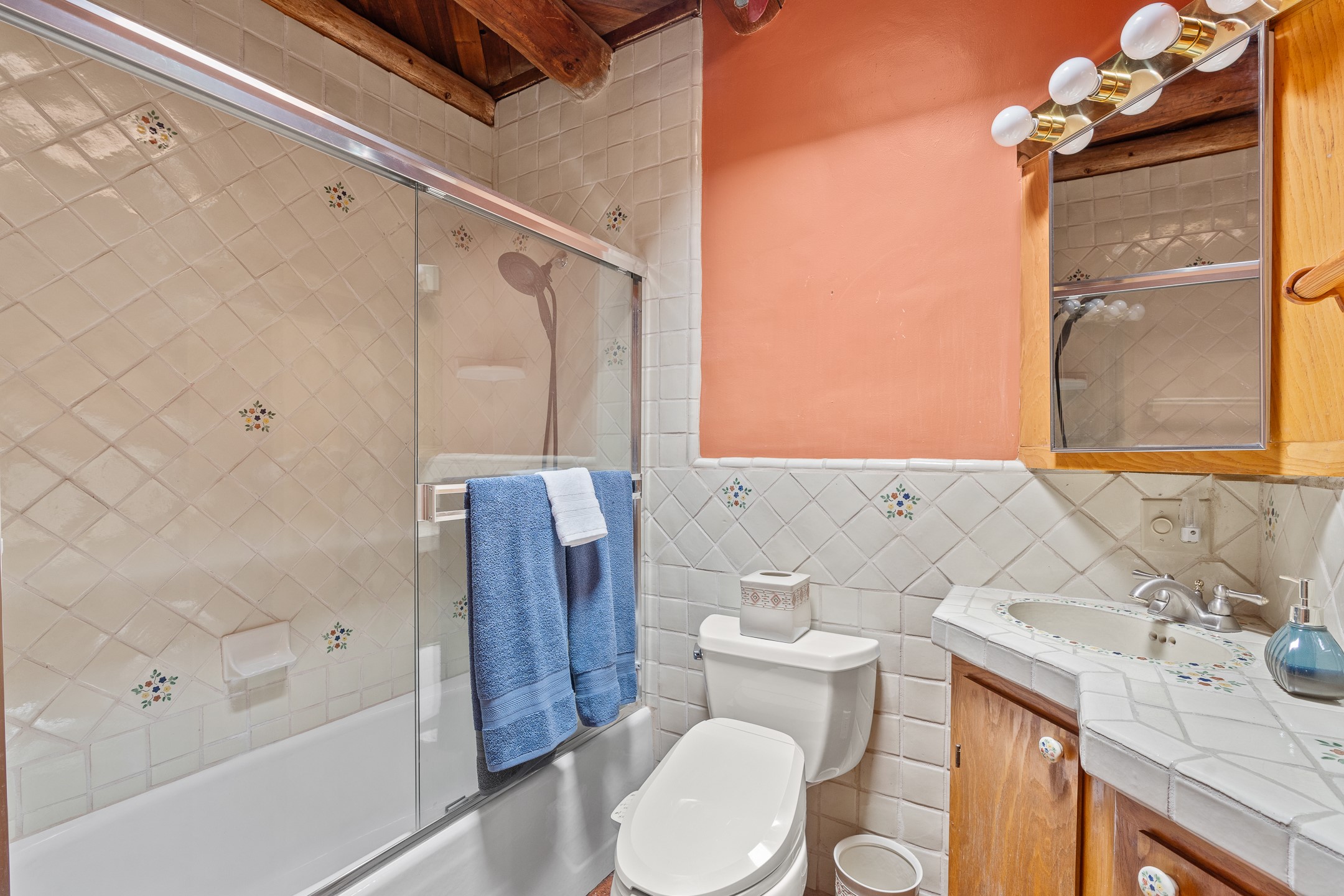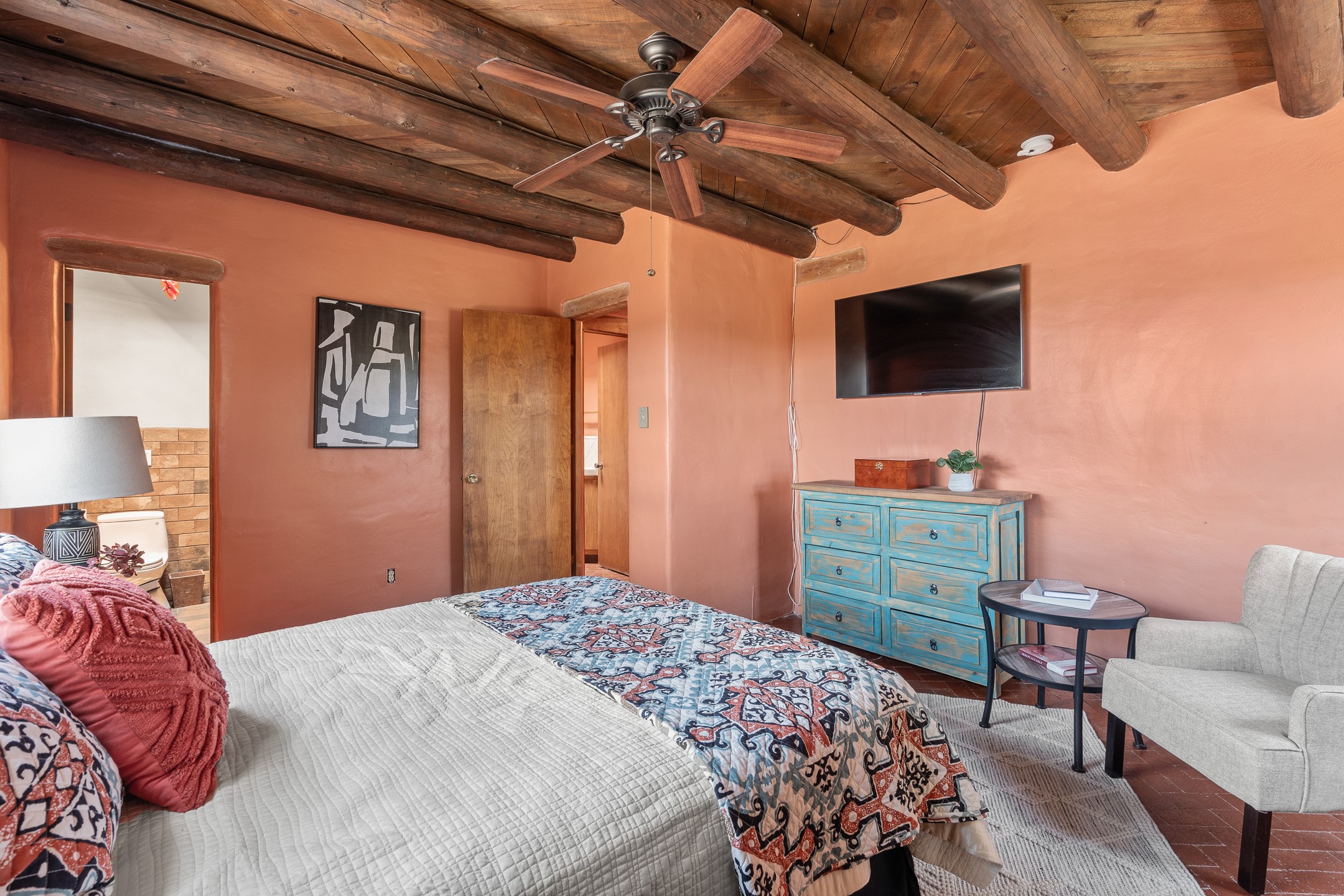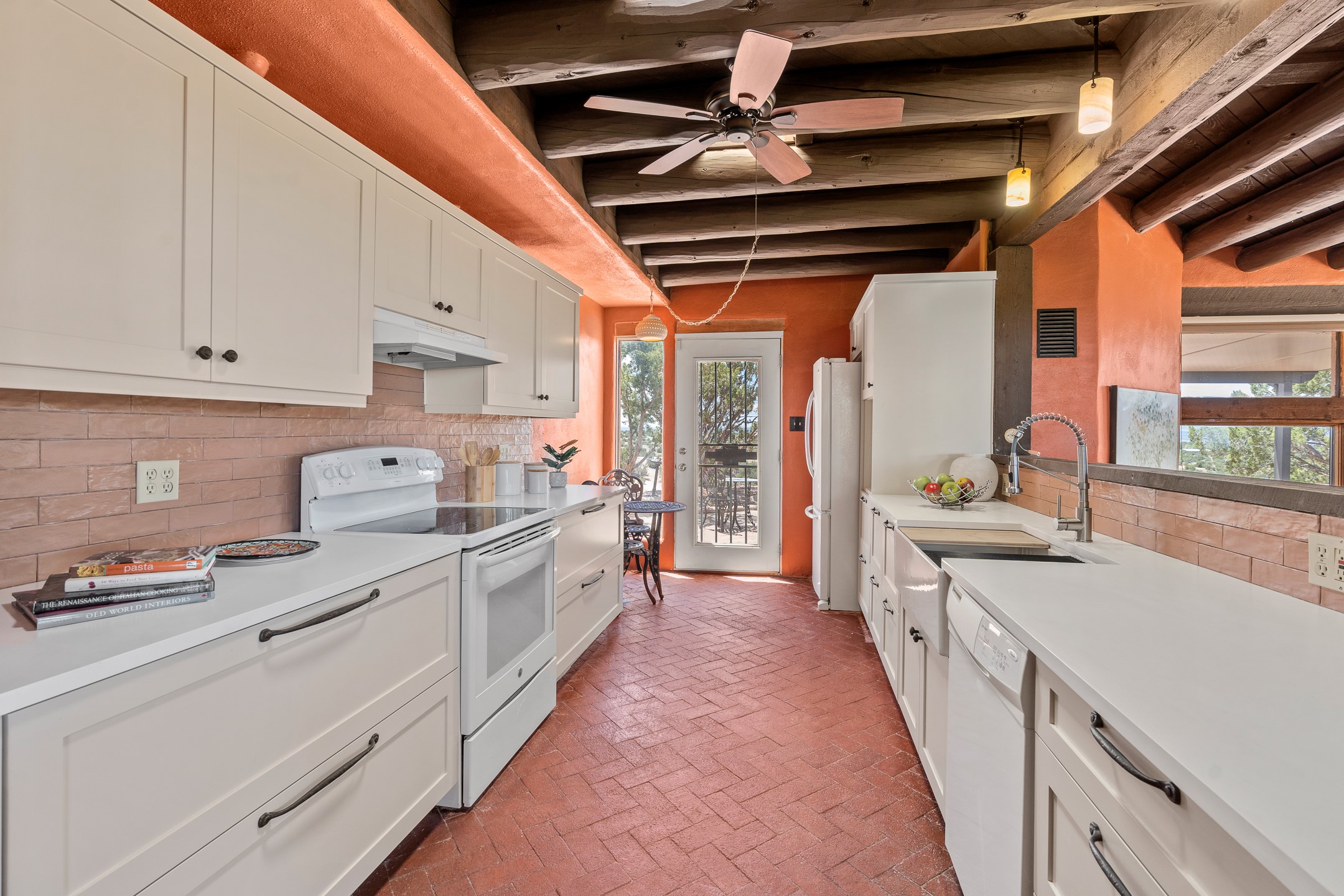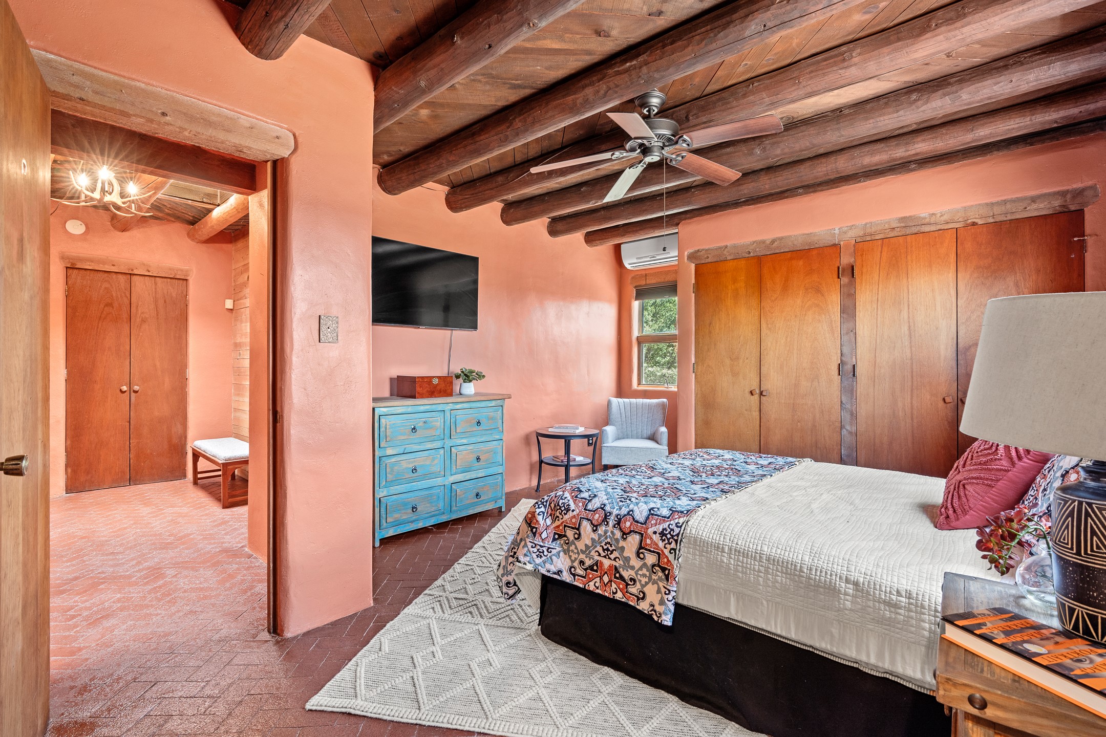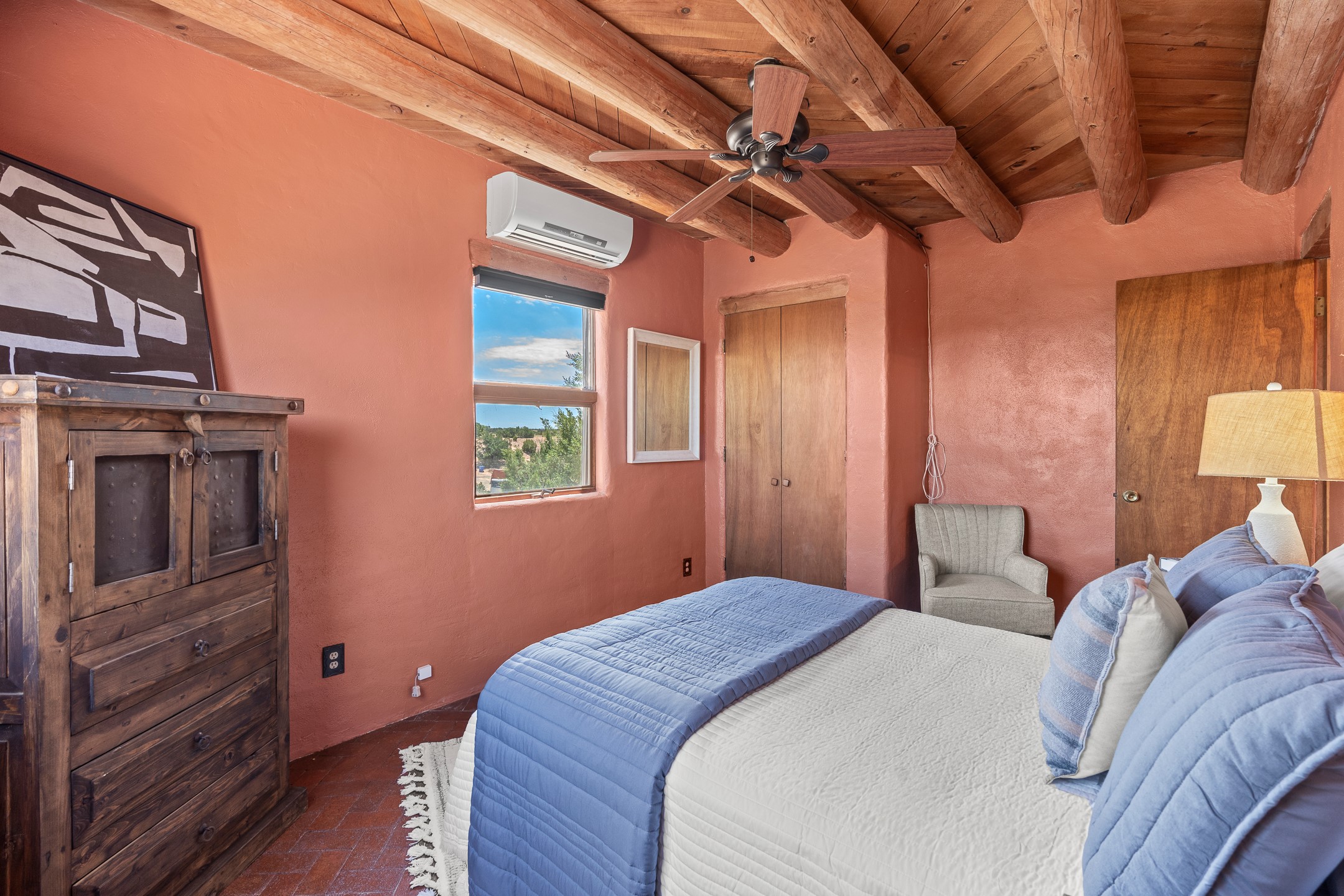 Escape to serenity with this truly unique 2 Bedroom, 2 bath 1520 sq. ft single-family home perched atop a peaceful plateau just off Hwy 14. Situated on 3.5 acres with gated access, this property offers privacy, security, and panoramic mountain views in every direction--perfect for soaking in spectacular sunsets and the quiet stillness of nature. Crafted with rustic charm in mind, the home features brick floors, wood ceilings, exposed vigas, and a traditional kiva fireplace that brings warmth and Southwestern character to the living space. With 2 spacious bedrooms and 2 full baths, it's the ideal size for a peaceful retreat or full-time living. Enjoy the expansive outdoor space, ideal for horses, gardens, or simply enjoying the wide-open sky. The 2-car garage offers ample storage, and the location provides convenient access to Santa Fe while feeling worlds away from the hustle and bustle. If you're seeking a western lifestyle surrounded by natural beauty and timeless charm, this is the one.