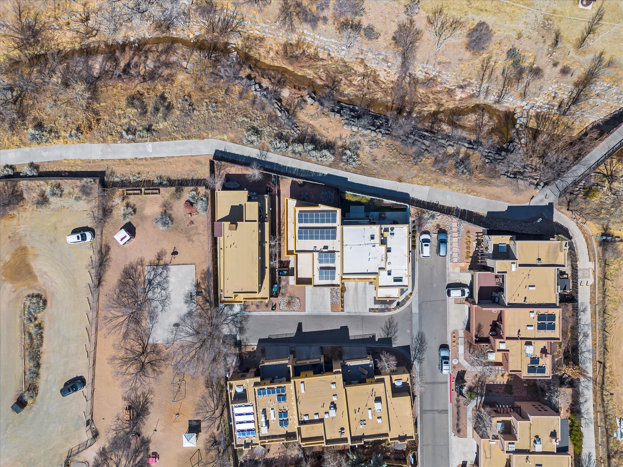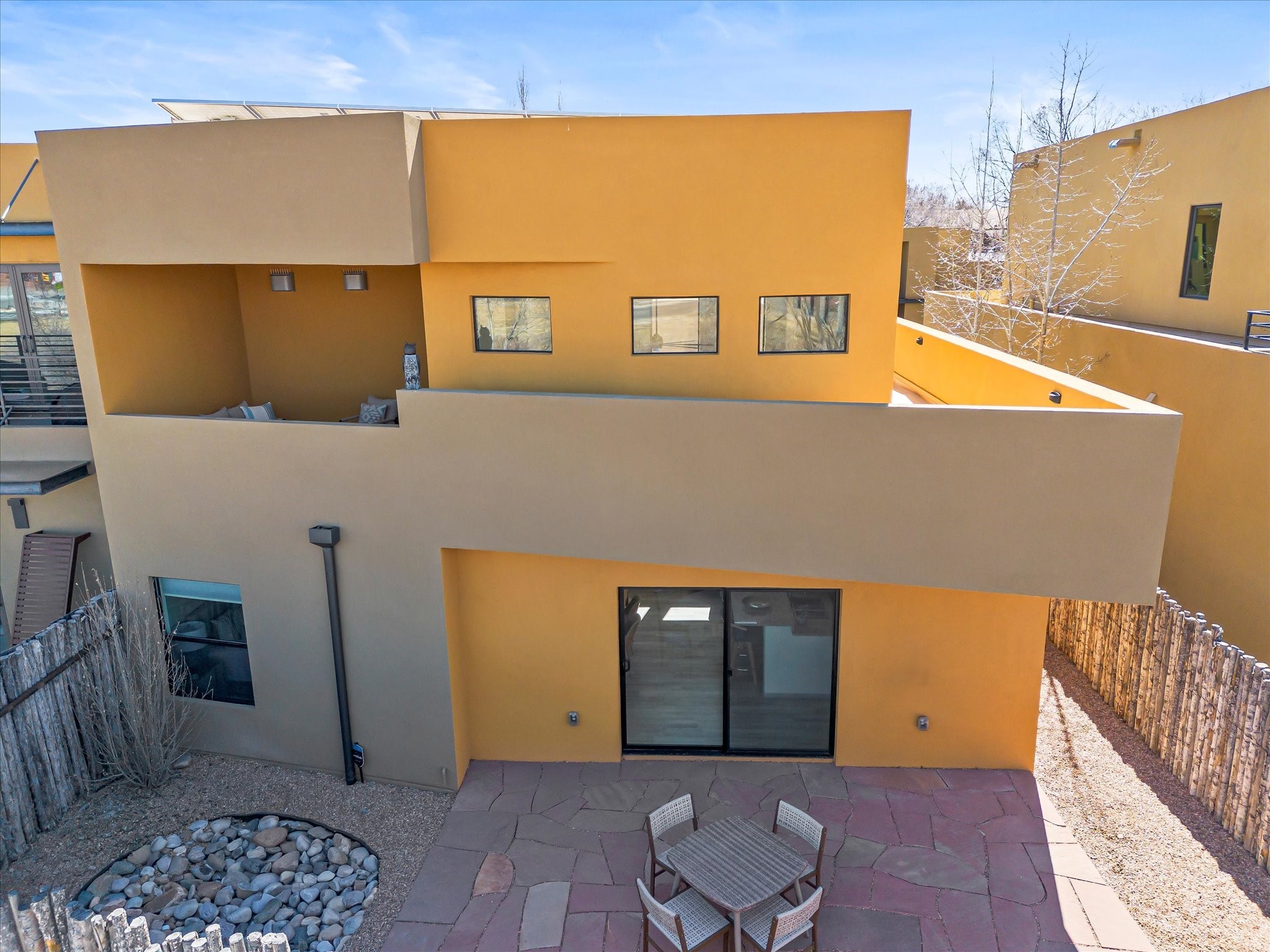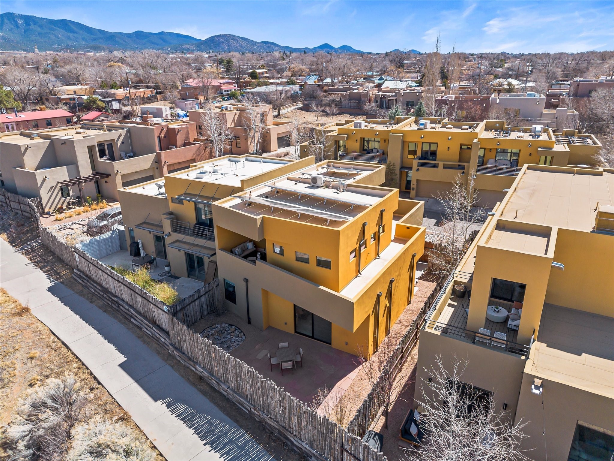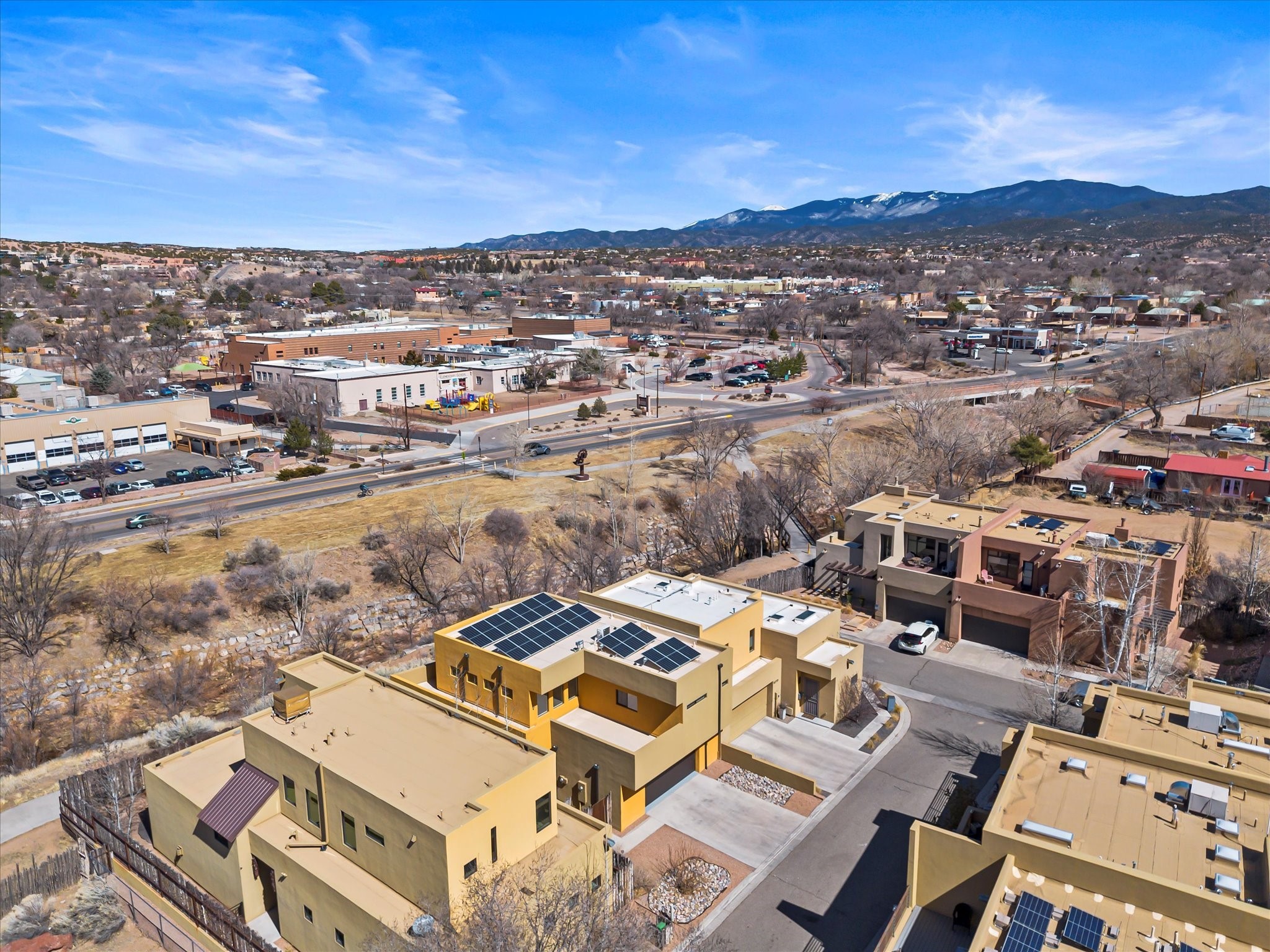 Experience exceptional Santa Fe living in this beautiful, Active Solar, contemporary condominium designed by the current owner. This all Electric, Energy Positive home boasts an Emerald Green NM Certification, Reverse Osmosis water system, new 50 AMP Electric car charger, Radiant Floor Heat (including the garage), Mitsubishi Mini splits and EnergyStar Bosch Kitchen appliances. Top of the line TPO roof with a traction layer covers the wrap-around outdoor deck where you can relax and enjoy views of the Sangre de Cristo mountains. Located in the no-outlet, highly desirable Rio Sendero Complex and nestled up against the Santa Fe River Walk Trail. The River Walk Trail accesses Downtown (1.2 miles); closely connected to two of Santa Fe's most valued areas: The Santa Fe Railyard Area with its restaurants and galleries, and the vibrant, ever-popular Santa Fe Farmers Market (1.1 miles) or go west to enjoy miles of open connected trails. For daily needs, across the street, are restaurants, groceries and a new gastro-pub. At home, the open-plan kitchen and living areas have beautiful soaring ceilings and access to a lovely ground floor rear patio. A downstairs bedroom could double as an office and the primary upstairs bedroom feels separate and cozy with its en suite bath. Low water landscape on drip irrigation. Less than five years old, this home is truly one of a kind and will garner much interest. Must see!The County Assessor shows Square footage at 1231 which differs from the builder's plans. Neither Listing Broker or Seller warrant the square footage of the lot or building. If the size of the home or lot is of material consideration to the Buyer, then the Buyer should have them measured.