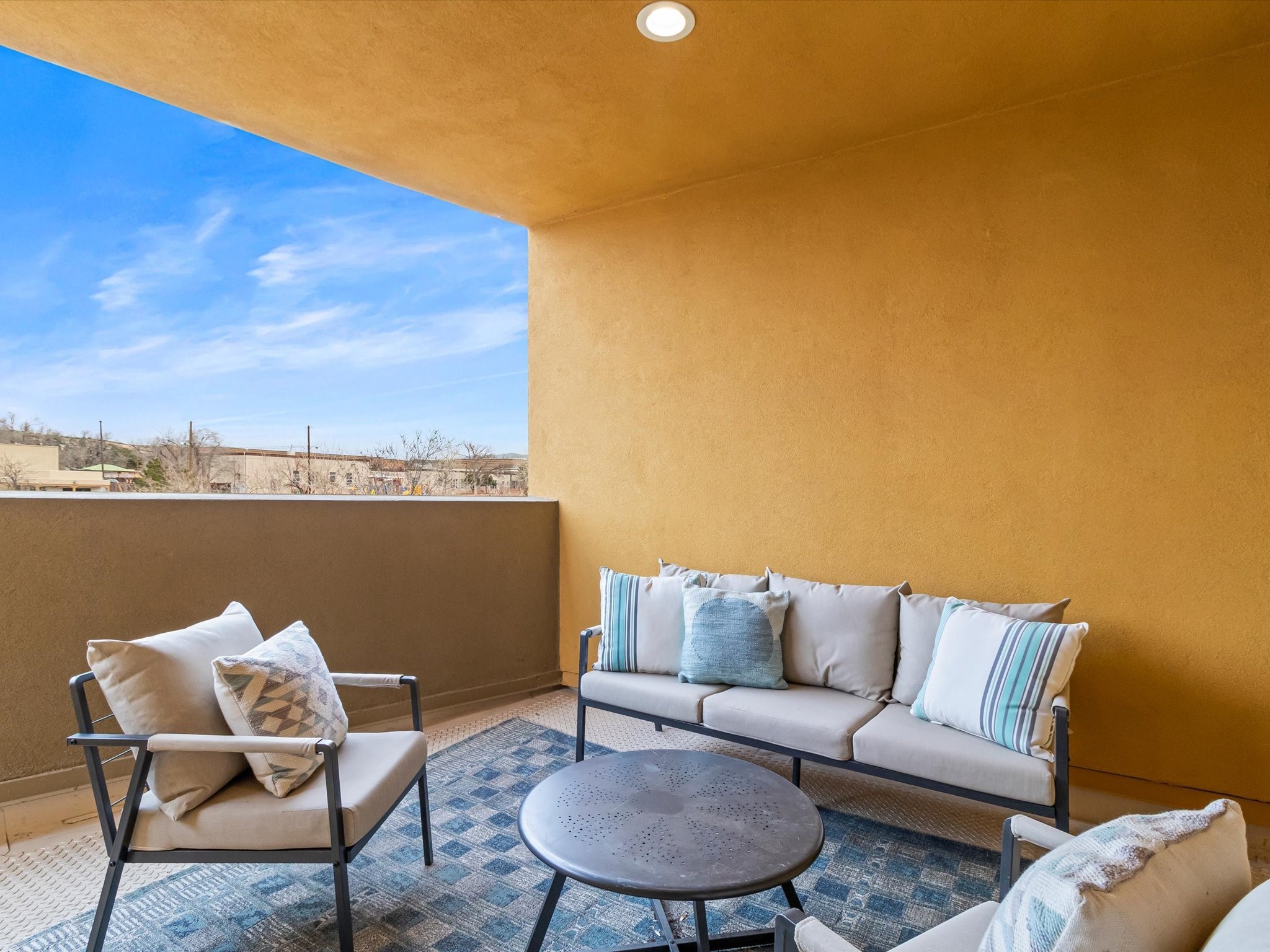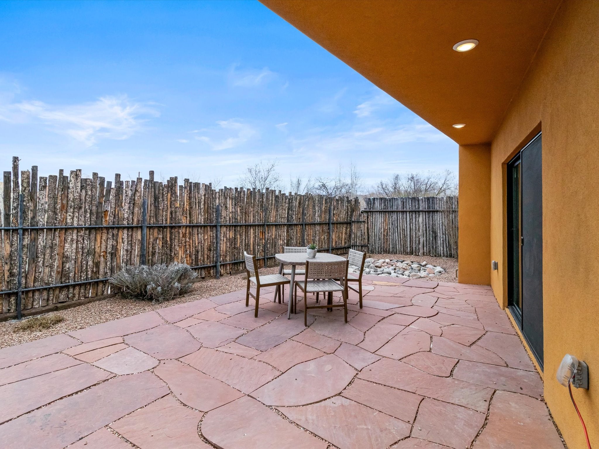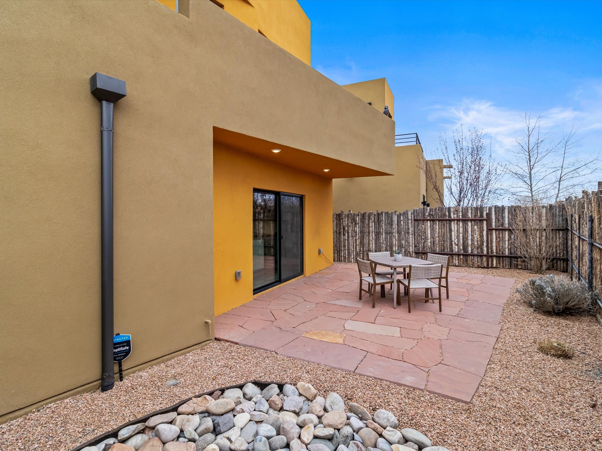 Experience exceptional Santa Fe living in this beautiful, Active Solar, contemporary condominium designed by the current owner. This all Electric, Energy Positive home boasts an Emerald Green NM Certification, Reverse Osmosis water system, new 50 AMP Electric car charger, Radiant Floor Heat (including the garage), Mitsubishi Mini splits and EnergyStar Bosch Kitchen appliances. Top of the line TPO roof with a traction layer covers the wrap-around outdoor deck where you can relax and enjoy views of the Sangre de Cristo mountains. Located in the no-outlet, highly desirable Rio Sendero Complex and nestled up against the Santa Fe River Walk Trail. The River Walk Trail accesses Downtown (1.2 miles); closely connected to two of Santa Fe's most valued areas: The Santa Fe Railyard Area with its restaurants and galleries, and the vibrant, ever-popular Santa Fe Farmers Market (1.1 miles) or go west to enjoy miles of open connected trails. For daily needs, across the street, are restaurants, groceries and a new gastro-pub. At home, the open-plan kitchen and living areas have beautiful soaring ceilings and access to a lovely ground floor rear patio. A downstairs bedroom could double as an office and the primary upstairs bedroom feels separate and cozy with its en suite bath. Low water landscape on drip irrigation. Less than five years old, this home is truly one of a kind and will garner much interest. Must see!The County Assessor shows Square footage at 1231 which differs from the builder's plans. Neither Listing Broker or Seller warrant the square footage of the lot or building. If the size of the home or lot is of material consideration to the Buyer, then the Buyer should have them measured.