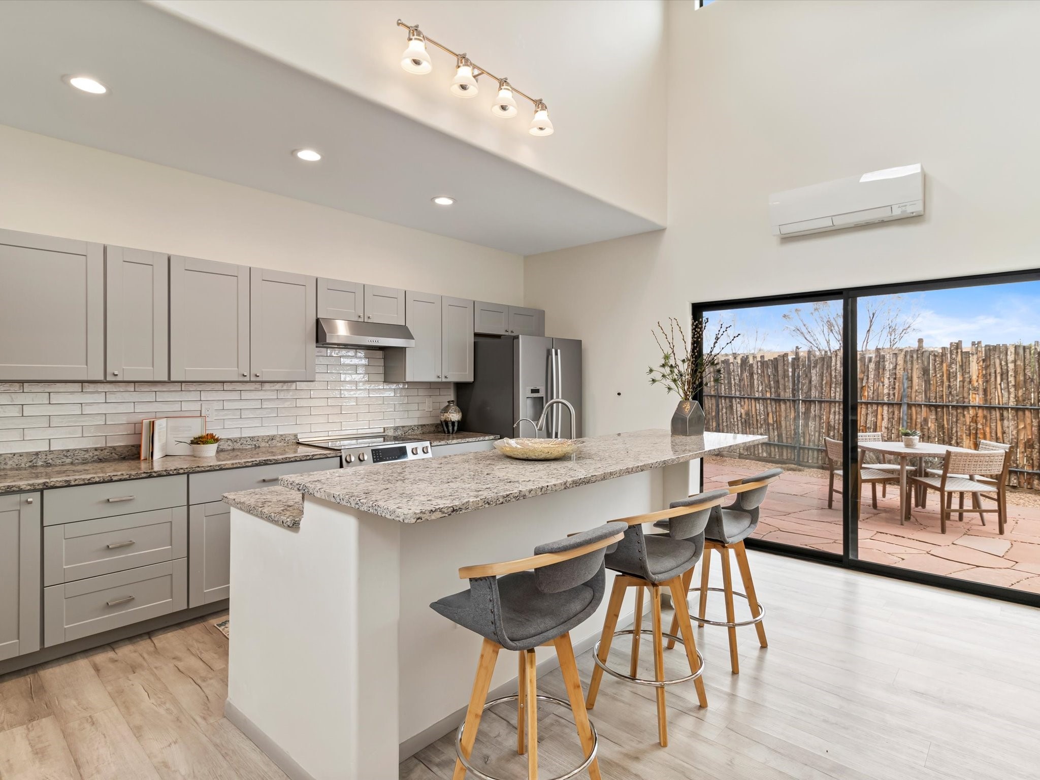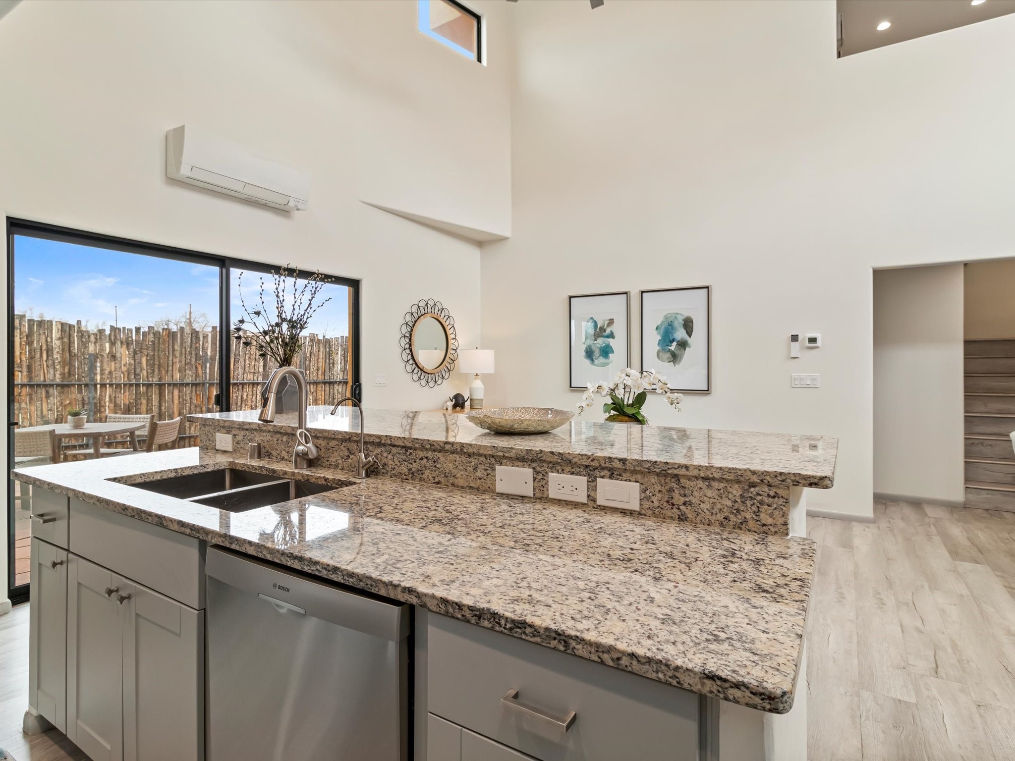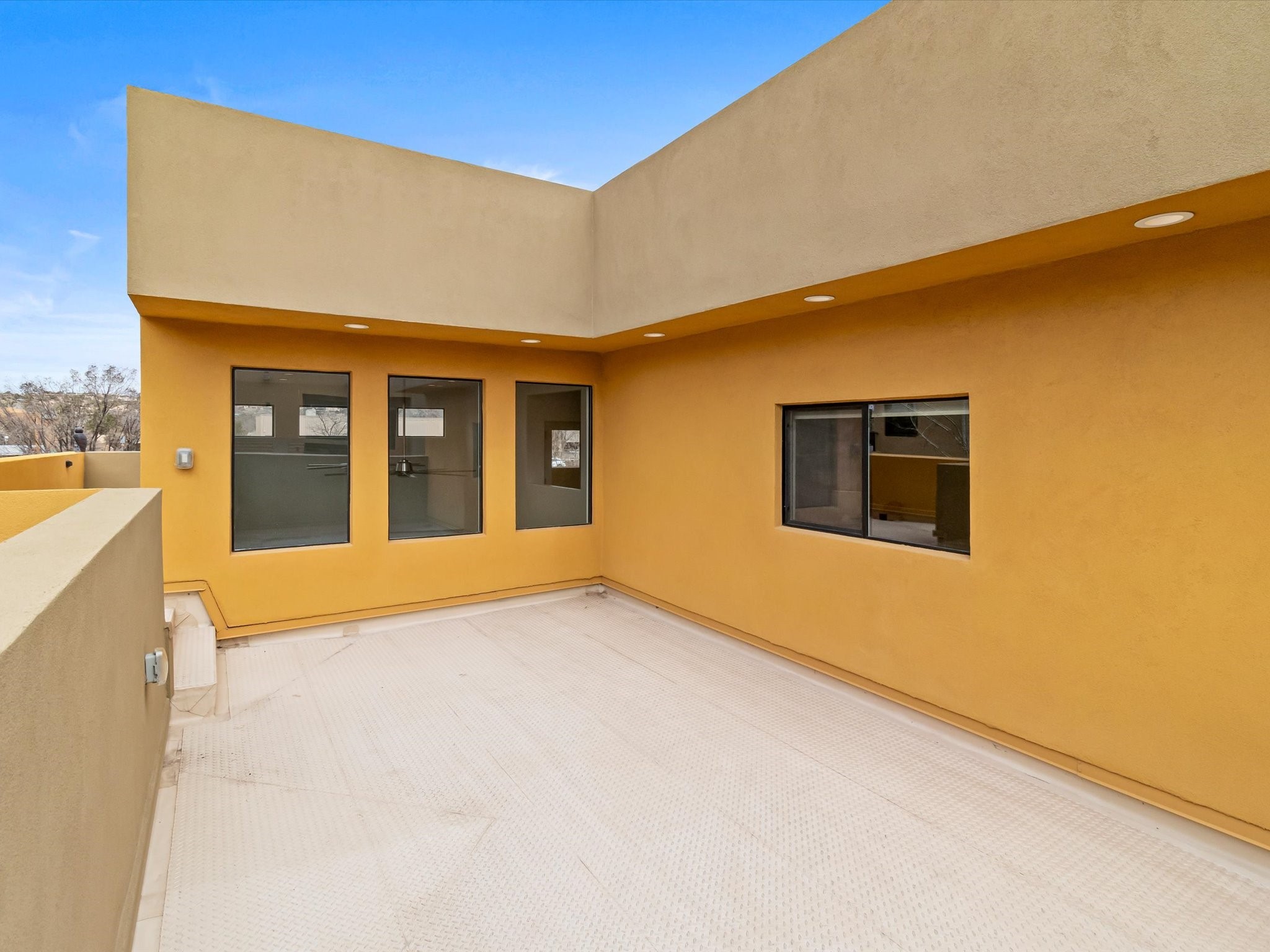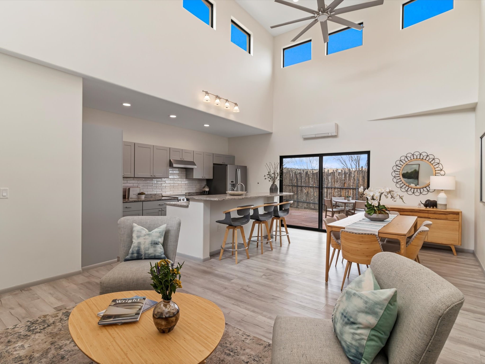 Experience exceptional Santa Fe living in this beautiful, Active Solar, contemporary condominium designed by the current owner. This all Electric, Energy Positive home boasts an Emerald Green NM Certification, Reverse Osmosis water system, new 50 AMP Electric car charger, Radiant Floor Heat (including the garage), Mitsubishi Mini splits and EnergyStar Bosch Kitchen appliances. Top of the line TPO roof with a traction layer covers the wrap-around outdoor deck where you can relax and enjoy views of the Sangre de Cristo mountains. Located in the no-outlet, highly desirable Rio Sendero Complex and nestled up against the Santa Fe River Walk Trail. The River Walk Trail accesses Downtown (1.2 miles); closely connected to two of Santa Fe's most valued areas: The Santa Fe Railyard Area with its restaurants and galleries, and the vibrant, ever-popular Santa Fe Farmers Market (1.1 miles) or go west to enjoy miles of open connected trails. For daily needs, across the street, are restaurants, groceries and a new gastro-pub. At home, the open-plan kitchen and living areas have beautiful soaring ceilings and access to a lovely ground floor rear patio. A downstairs bedroom could double as an office and the primary upstairs bedroom feels separate and cozy with its en suite bath. Low water landscape on drip irrigation. Less than five years old, this home is truly one of a kind and will garner much interest. Must see!The County Assessor shows Square footage at 1231 which differs from the builder's plans. Neither Listing Broker or Seller warrant the square footage of the lot or building. If the size of the home or lot is of material consideration to the Buyer, then the Buyer should have them measured.
