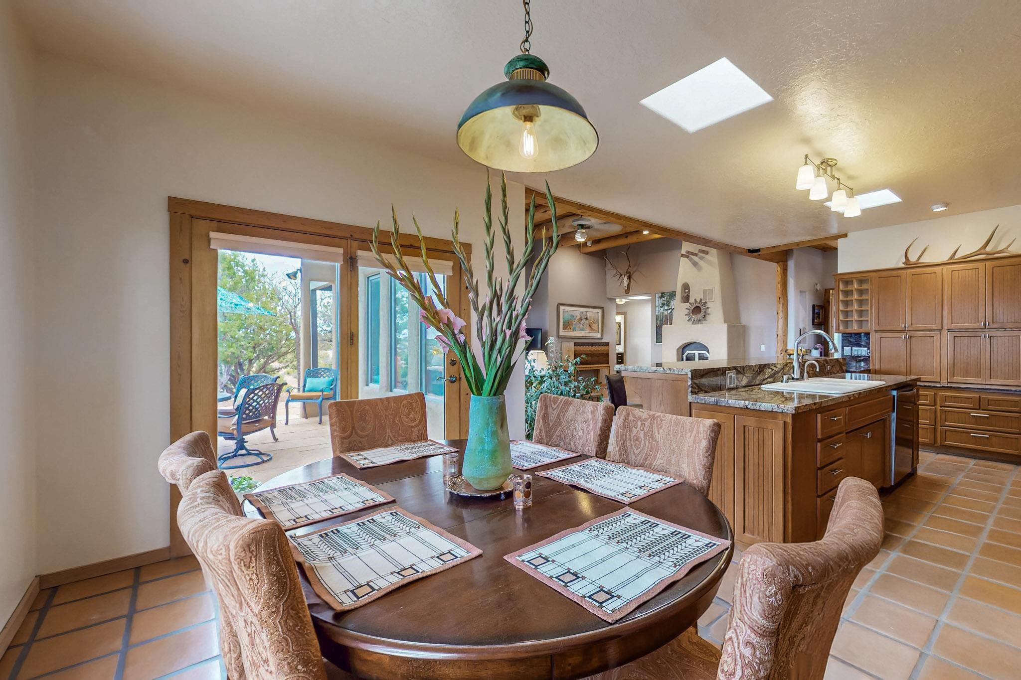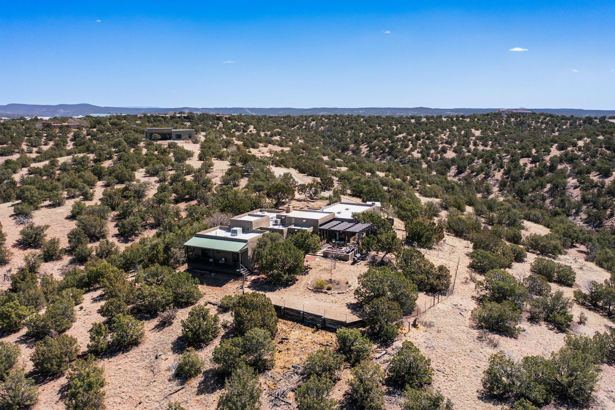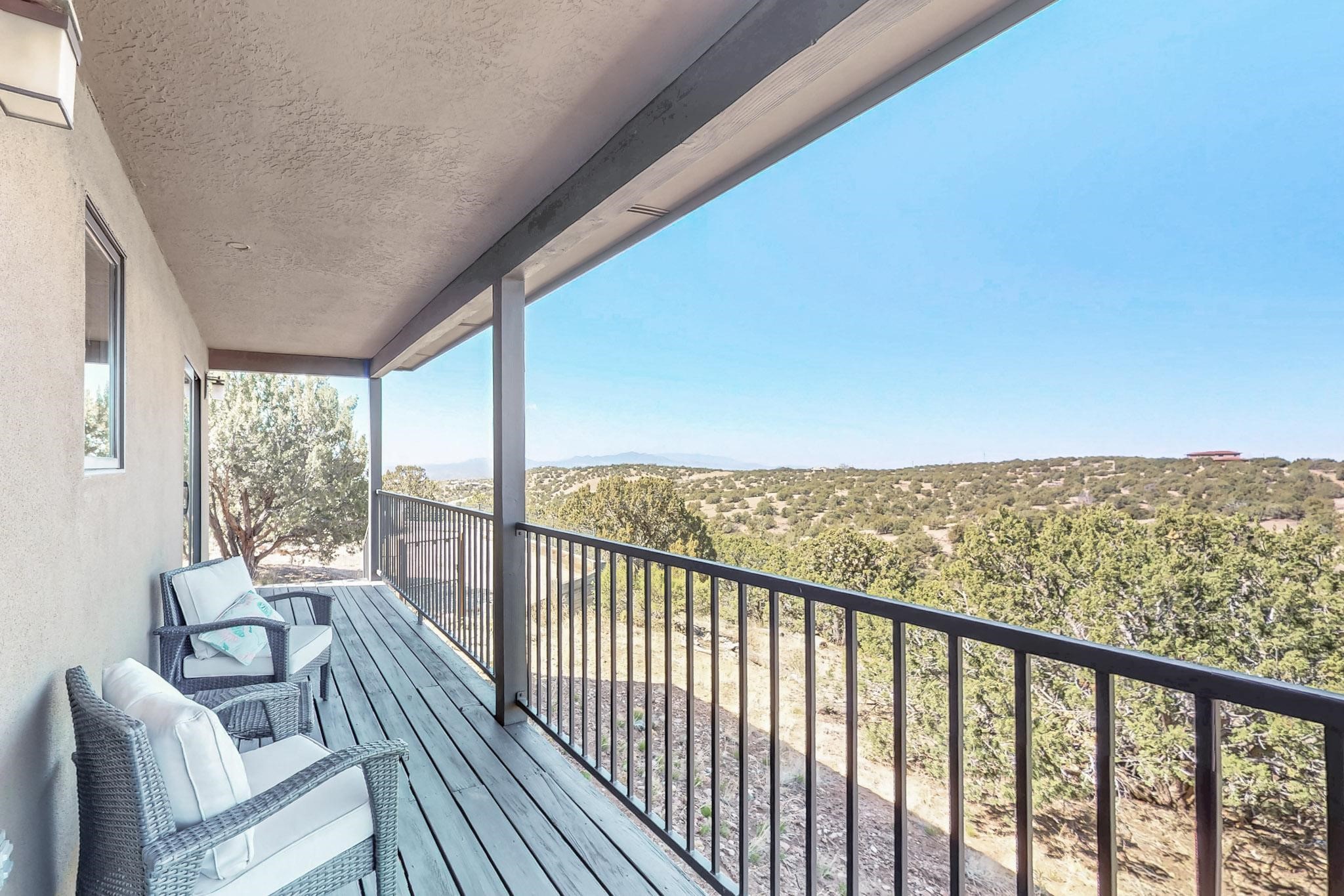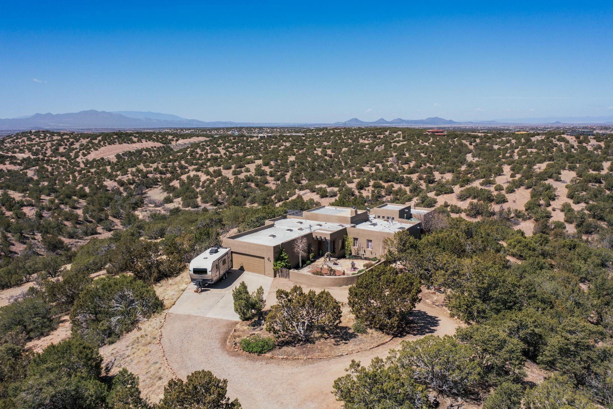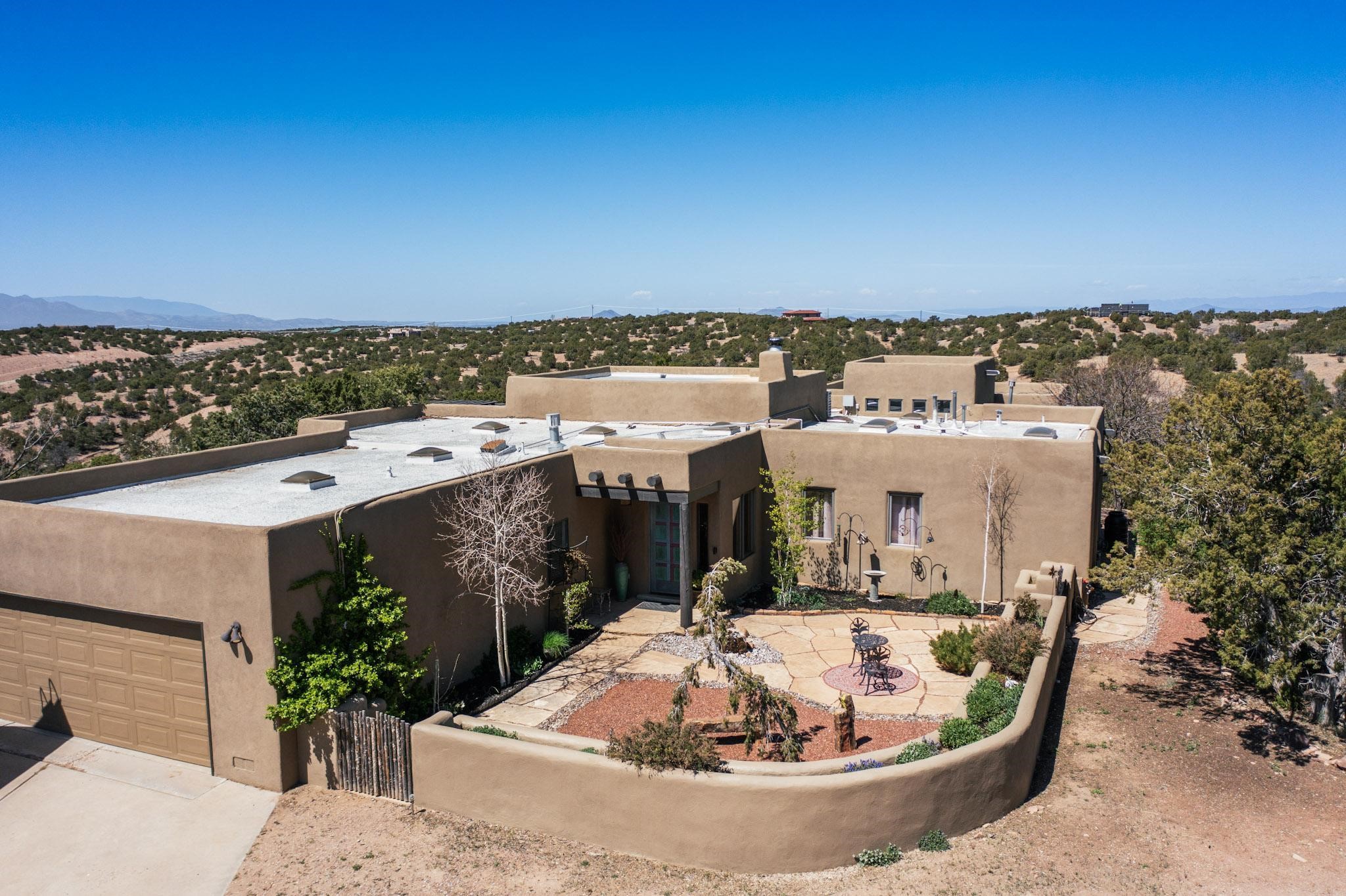 At the very end of a private road, where the world quiets and the landscape opens wide, you'll discover a hidden gem--an exceptional home perched above a sweeping arroyo, offering complete privacy and awe-inspiring panoramic views. This beautifully designed 4-bedroom, 3-bath home sits on 10 pristine acres in a small enclave that has been cherished by a single owner. From nearly every window and outdoor space, you'll be captivated by unobstructed vistas that stretch across the Galisteo Basin, Ortiz Mountains, Sandias, the majestic Sangre de Cristo range. Here, the sunsets paint the sky with color and the stars shine brighter than you've ever seen. Crafted by Jade Enterprises, the home features warm Southwest architectural touches, including hand-hewn vigas, high ceilings, and custom wood doors by local artisan Larry DeLeon. The open-concept kitchen with elegant serpentine stone countertops flows seamlessly into a generous living area, anchored by a beautiful fireplace and oriented toward some of the home's best views. The private primary suite occupies its own wing and includes a luxurious ensuite bath with a soaking tub, two-headed shower, walk-in closet, and a serene private patio. Two additional bedrooms at the rear of the home share a Jack-and-Jill bathroom and are joined by a flexible entertainment room with a wet bar and access to both the front and back outdoor living spaces. The oversized 2-car garage has cabinets, ample storage space, and a custom workbench. Outside, a fenced yard features a cozy flagstone fire-pit with seating, a spacious patio ideal for outdoor cooking, and a garden space ready for your vision. Every angle of this home was thoughtfully designed to celebrate the natural beauty that surrounds it. This is more than a home--it's a rare opportunity to own a piece of the New Mexico landscape, where peace, privacy, and panoramic beauty come together in perfect harmony. Covenants allow for additional casita/studio subject to HOA approval. Come see it.