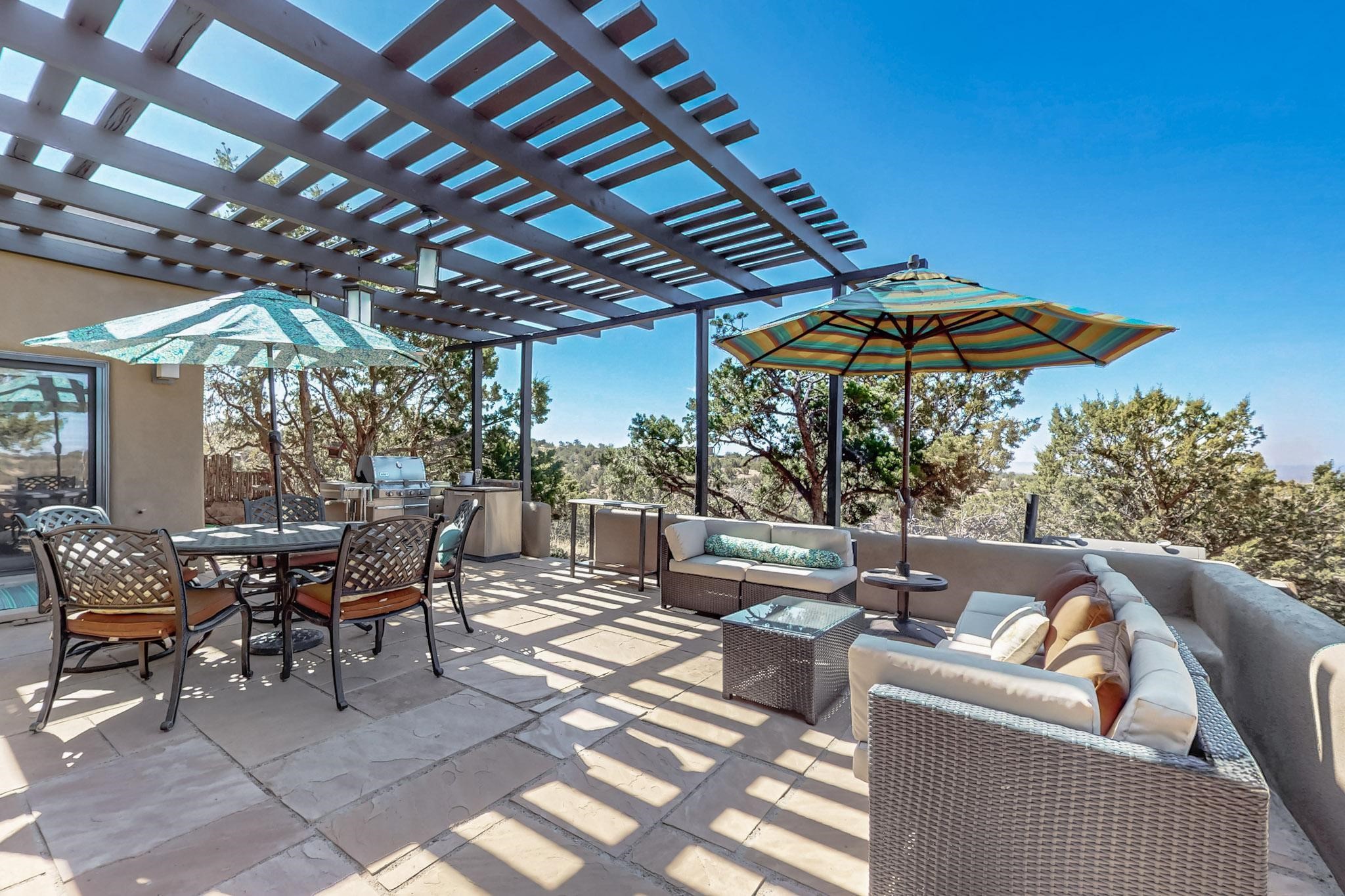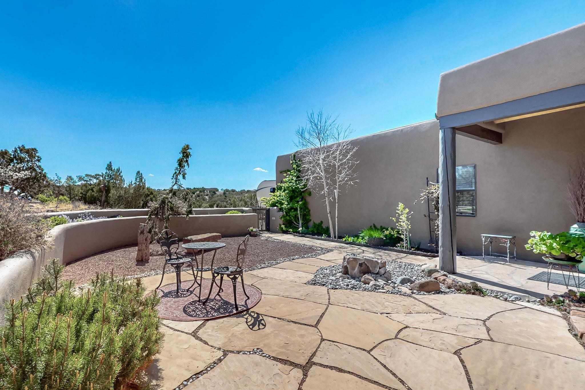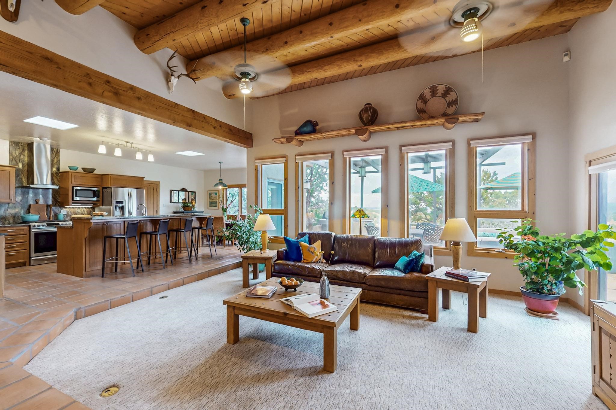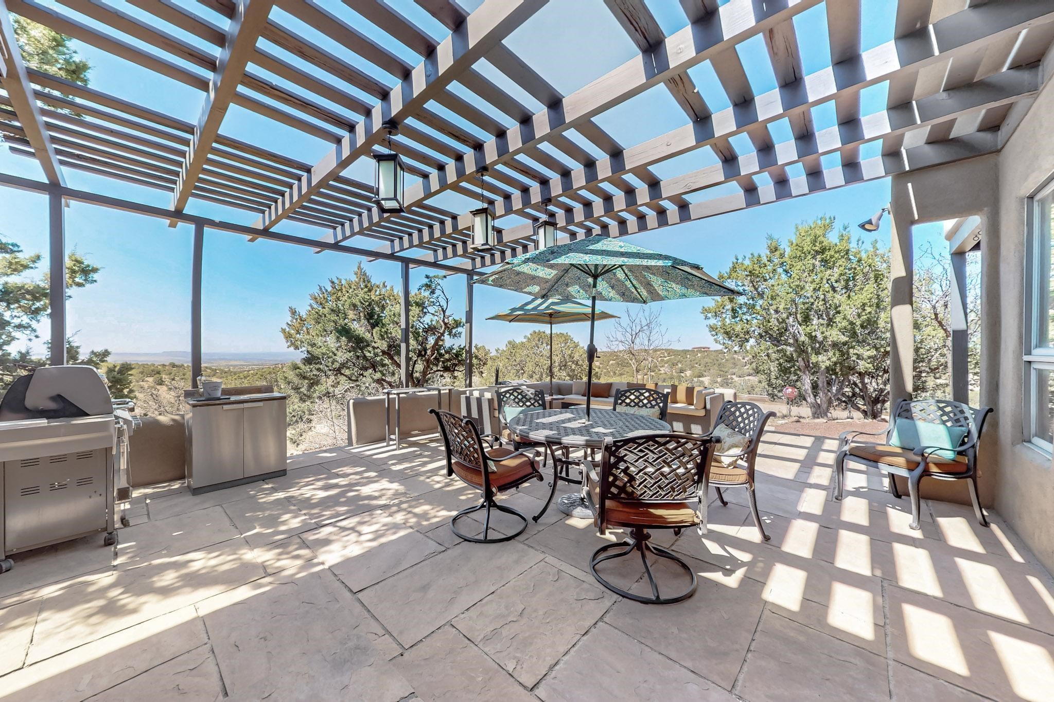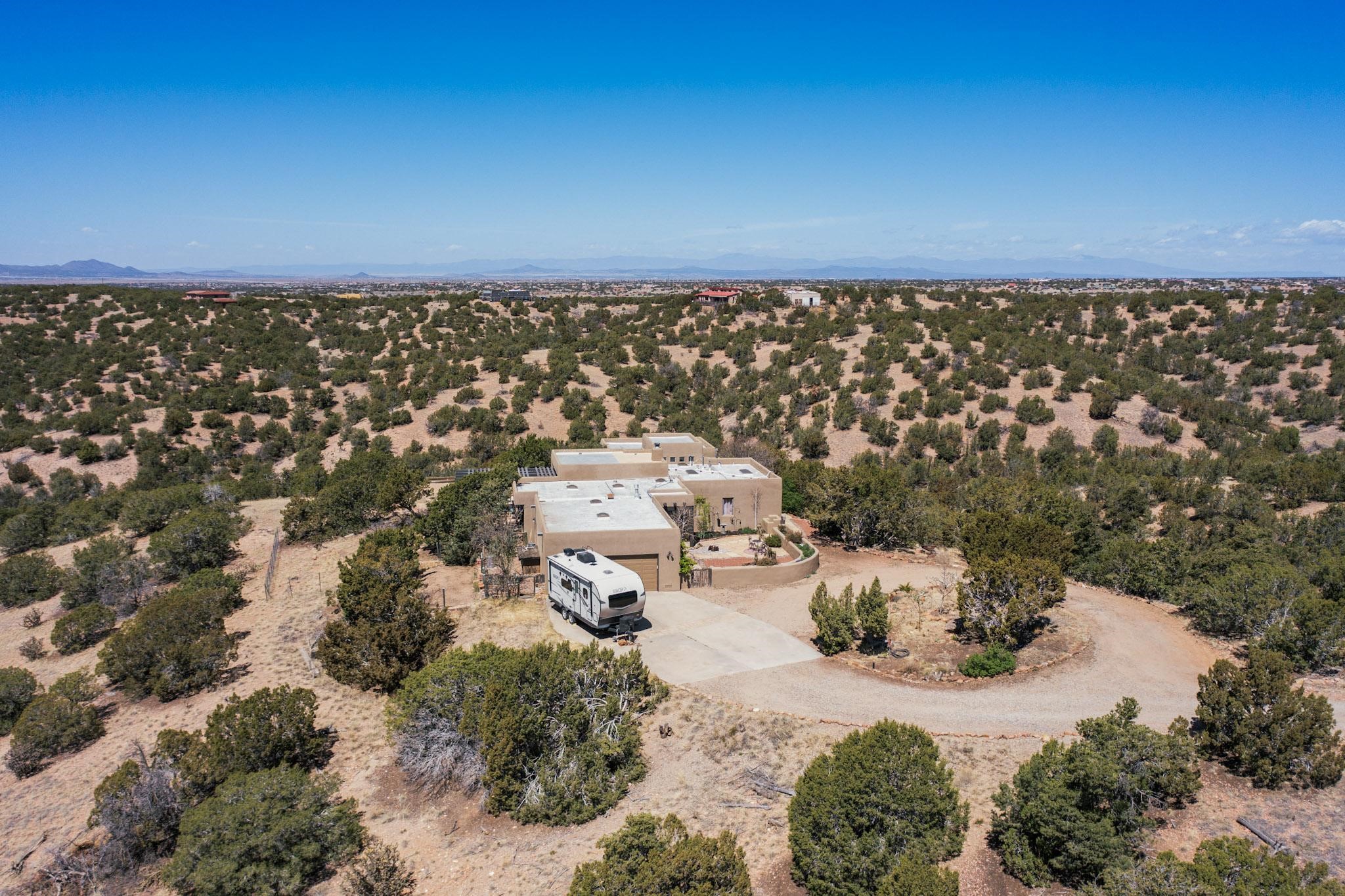 At the very end of a private road, where the world quiets and the landscape opens wide, you'll discover a hidden gem--an exceptional home perched above a sweeping arroyo, offering complete privacy and awe-inspiring panoramic views. This beautifully designed 4-bedroom, 3-bath home sits on 10 pristine acres in a small enclave that has been cherished by a single owner. From nearly every window and outdoor space, you'll be captivated by unobstructed vistas that stretch across the Galisteo Basin, Ortiz Mountains, Sandias, the majestic Sangre de Cristo range. Here, the sunsets paint the sky with color and the stars shine brighter than you've ever seen. Crafted by Jade Enterprises, the home features warm Southwest architectural touches, including hand-hewn vigas, high ceilings, and custom wood doors by local artisan Larry DeLeon. The open-concept kitchen with elegant serpentine stone countertops flows seamlessly into a generous living area, anchored by a beautiful fireplace and oriented toward some of the home's best views. The private primary suite occupies its own wing and includes a luxurious ensuite bath with a soaking tub, two-headed shower, walk-in closet, and a serene private patio. Two additional bedrooms at the rear of the home share a Jack-and-Jill bathroom and are joined by a flexible entertainment room with a wet bar and access to both the front and back outdoor living spaces. The oversized 2-car garage has cabinets, ample storage space, and a custom workbench. Outside, a fenced yard features a cozy flagstone fire-pit with seating, a spacious patio ideal for outdoor cooking, and a garden space ready for your vision. Every angle of this home was thoughtfully designed to celebrate the natural beauty that surrounds it. This is more than a home--it's a rare opportunity to own a piece of the New Mexico landscape, where peace, privacy, and panoramic beauty come together in perfect harmony. Covenants allow for additional casita/studio subject to HOA approval. Come see it.