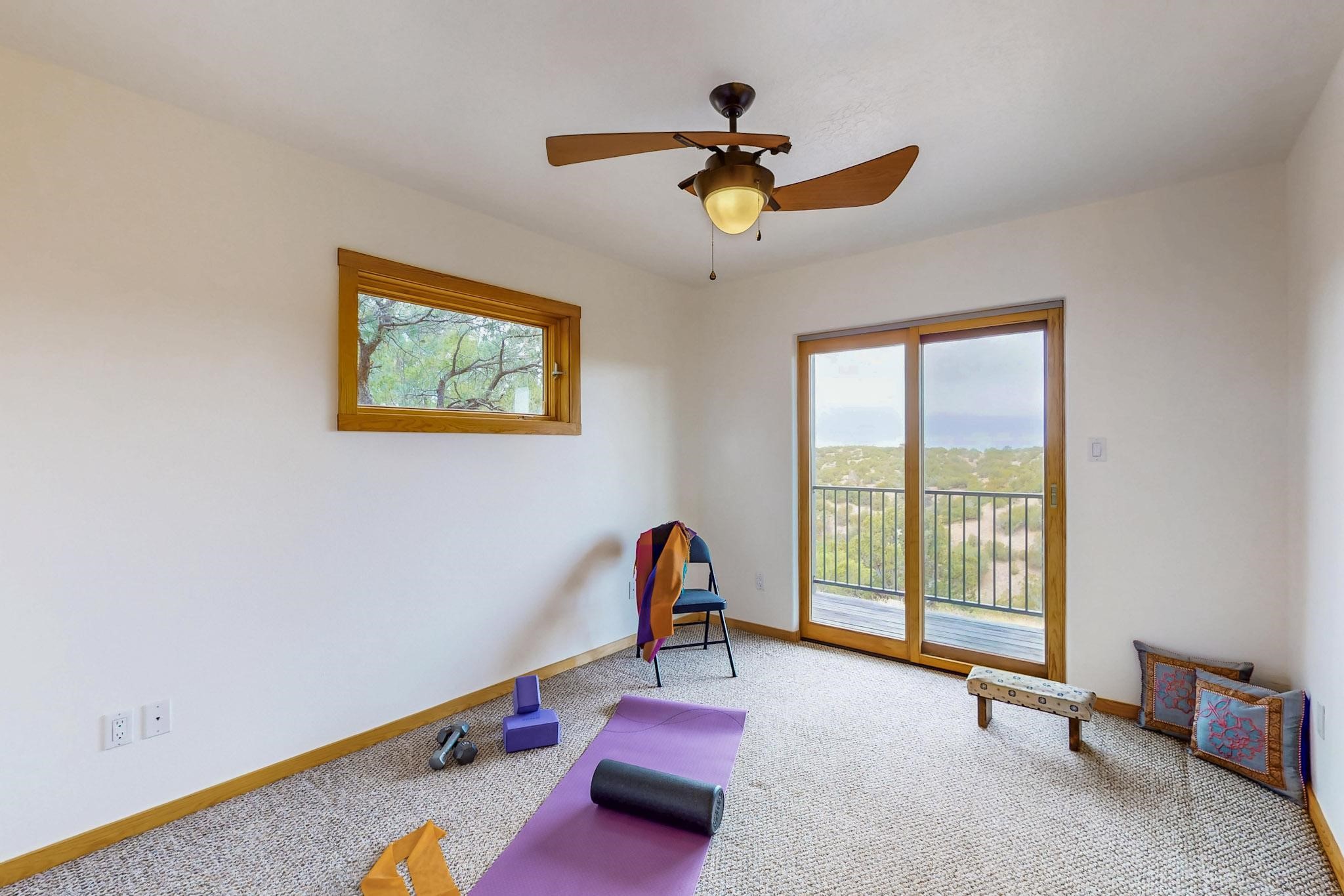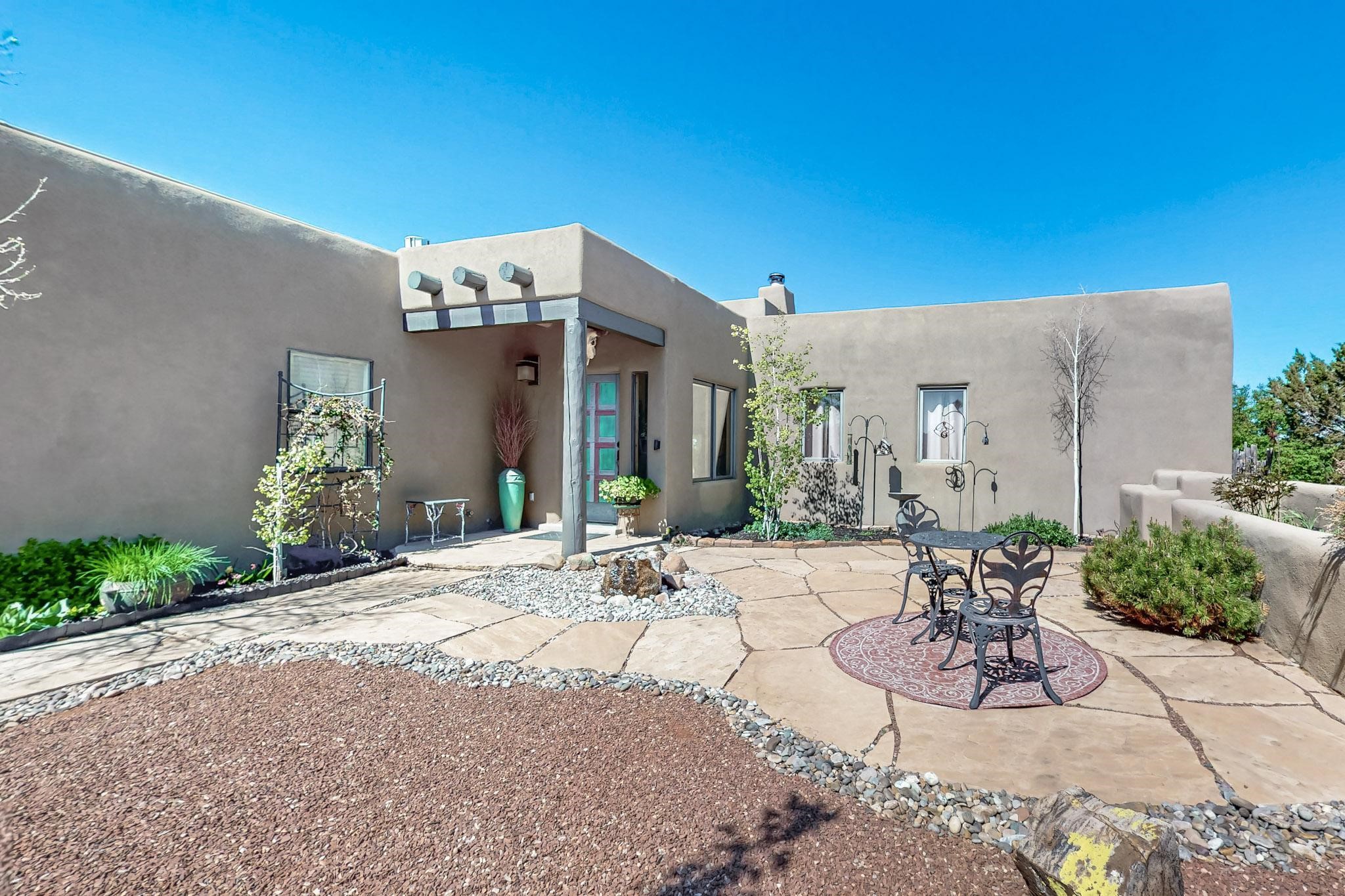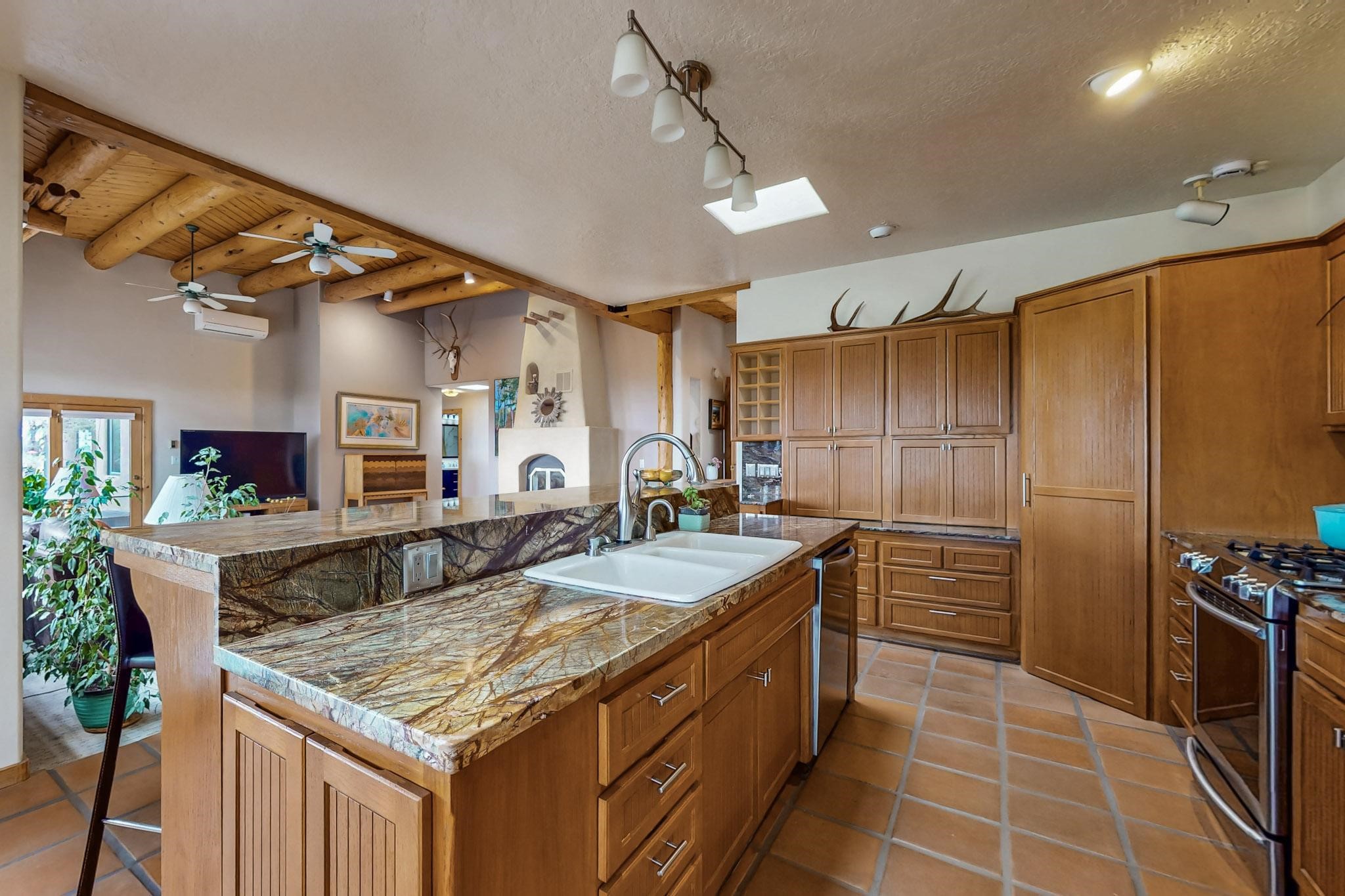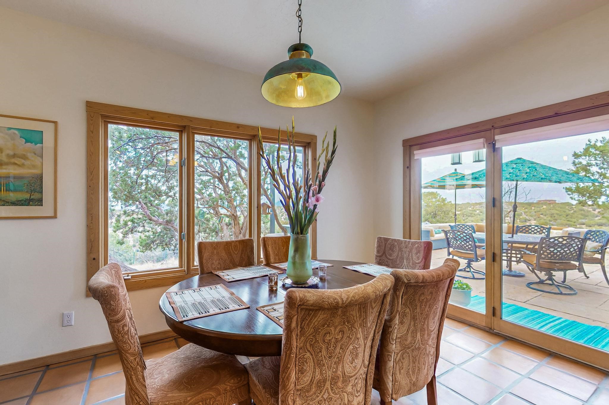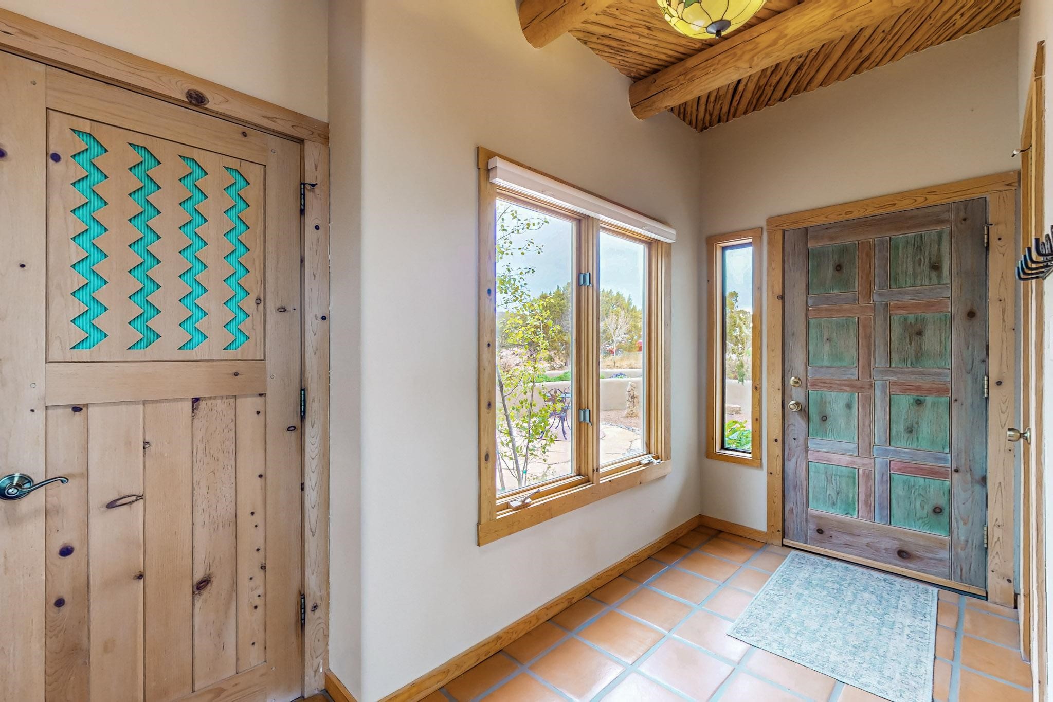 At the very end of a private road, where the world quiets and the landscape opens wide, you'll discover a hidden gem--an exceptional home perched above a sweeping arroyo, offering complete privacy and awe-inspiring panoramic views. This beautifully designed 4-bedroom, 3-bath home sits on 10 pristine acres in a small enclave that has been cherished by a single owner. From nearly every window and outdoor space, you'll be captivated by unobstructed vistas that stretch across the Galisteo Basin, Ortiz Mountains, Sandias, the majestic Sangre de Cristo range. Here, the sunsets paint the sky with color and the stars shine brighter than you've ever seen. Crafted by Jade Enterprises, the home features warm Southwest architectural touches, including hand-hewn vigas, high ceilings, and custom wood doors by local artisan Larry DeLeon. The open-concept kitchen with elegant serpentine stone countertops flows seamlessly into a generous living area, anchored by a beautiful fireplace and oriented toward some of the home's best views. The private primary suite occupies its own wing and includes a luxurious ensuite bath with a soaking tub, two-headed shower, walk-in closet, and a serene private patio. Two additional bedrooms at the rear of the home share a Jack-and-Jill bathroom and are joined by a flexible entertainment room with a wet bar and access to both the front and back outdoor living spaces. The oversized 2-car garage has cabinets, ample storage space, and a custom workbench. Outside, a fenced yard features a cozy flagstone fire-pit with seating, a spacious patio ideal for outdoor cooking, and a garden space ready for your vision. Every angle of this home was thoughtfully designed to celebrate the natural beauty that surrounds it. This is more than a home--it's a rare opportunity to own a piece of the New Mexico landscape, where peace, privacy, and panoramic beauty come together in perfect harmony. Covenants allow for additional casita/studio subject to HOA approval. Come see it.