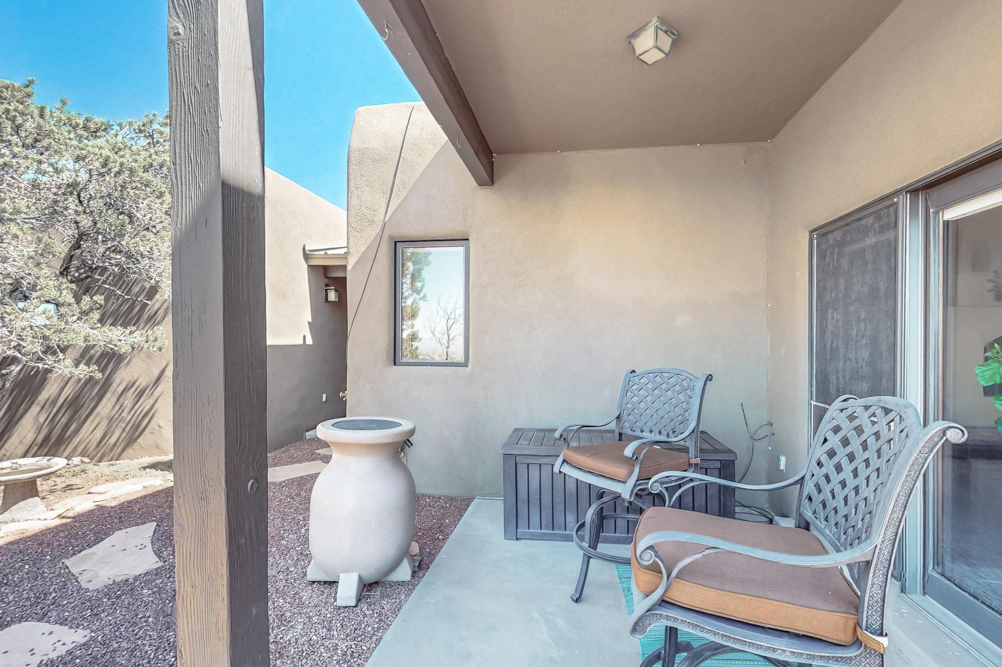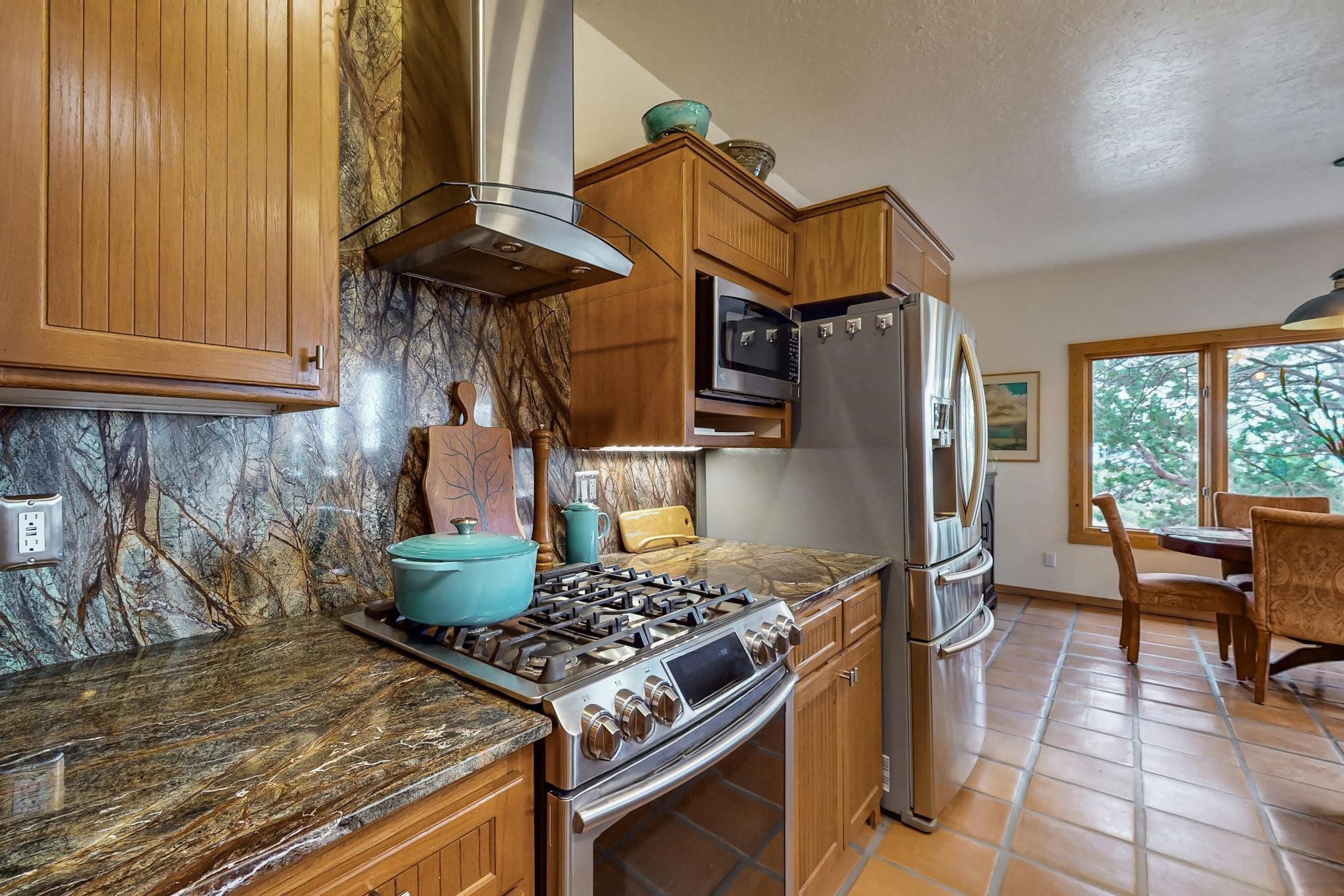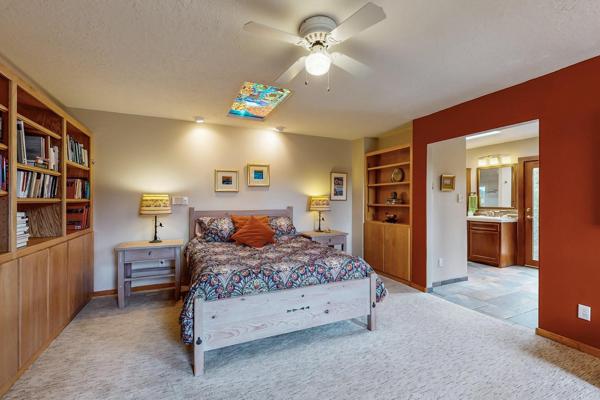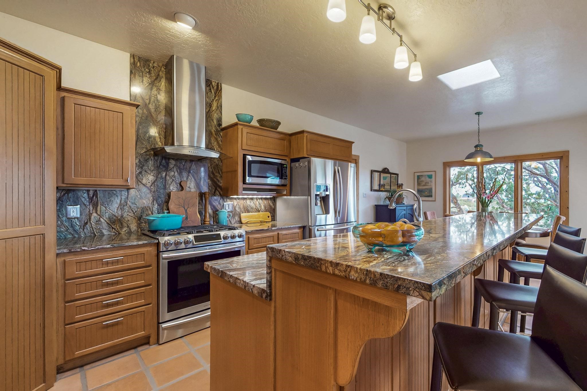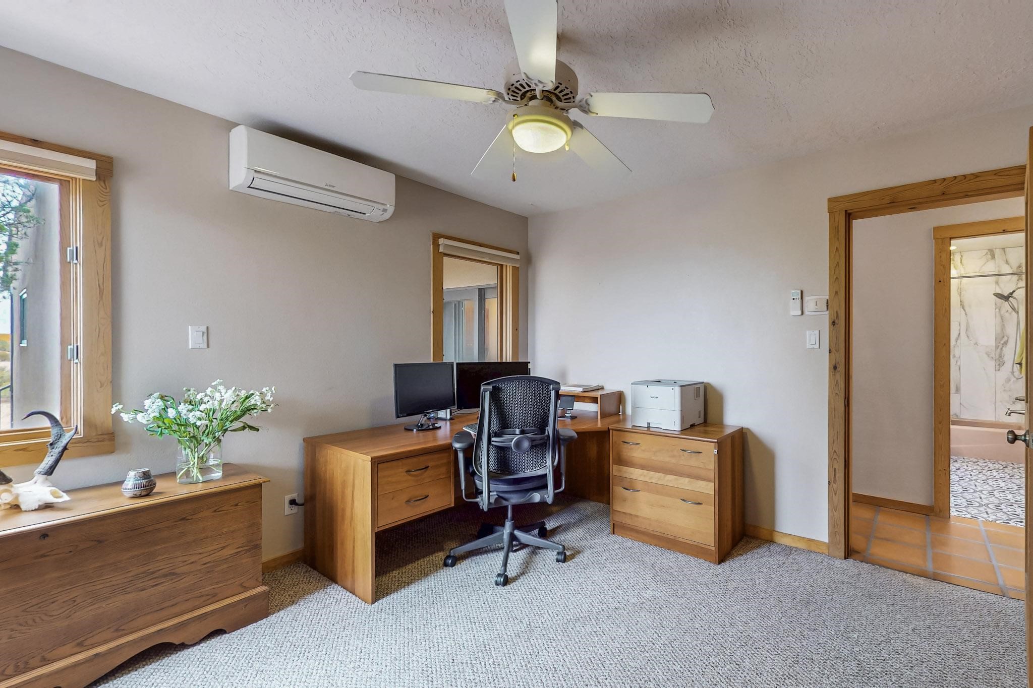 At the very end of a private road, where the world quiets and the landscape opens wide, you'll discover a hidden gem--an exceptional home perched above a sweeping arroyo, offering complete privacy and awe-inspiring panoramic views. This beautifully designed 4-bedroom, 3-bath home sits on 10 pristine acres in a small enclave that has been cherished by a single owner. From nearly every window and outdoor space, you'll be captivated by unobstructed vistas that stretch across the Galisteo Basin, Ortiz Mountains, Sandias, the majestic Sangre de Cristo range. Here, the sunsets paint the sky with color and the stars shine brighter than you've ever seen. Crafted by Jade Enterprises, the home features warm Southwest architectural touches, including hand-hewn vigas, high ceilings, and custom wood doors by local artisan Larry DeLeon. The open-concept kitchen with elegant serpentine stone countertops flows seamlessly into a generous living area, anchored by a beautiful fireplace and oriented toward some of the home's best views. The private primary suite occupies its own wing and includes a luxurious ensuite bath with a soaking tub, two-headed shower, walk-in closet, and a serene private patio. Two additional bedrooms at the rear of the home share a Jack-and-Jill bathroom and are joined by a flexible entertainment room with a wet bar and access to both the front and back outdoor living spaces. The oversized 2-car garage has cabinets, ample storage space, and a custom workbench. Outside, a fenced yard features a cozy flagstone fire-pit with seating, a spacious patio ideal for outdoor cooking, and a garden space ready for your vision. Every angle of this home was thoughtfully designed to celebrate the natural beauty that surrounds it. This is more than a home--it's a rare opportunity to own a piece of the New Mexico landscape, where peace, privacy, and panoramic beauty come together in perfect harmony. Covenants allow for additional casita/studio subject to HOA approval. Come see it.