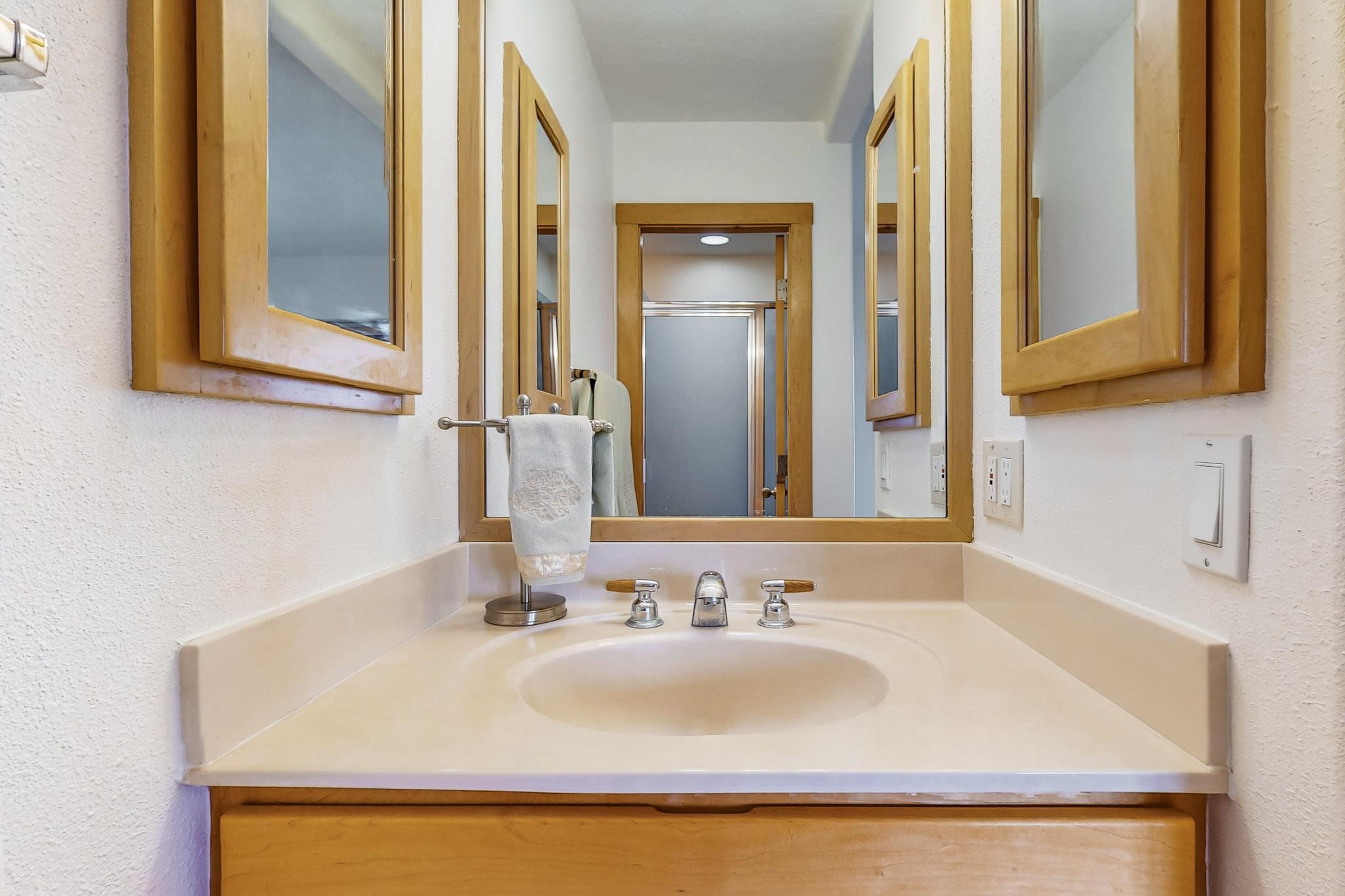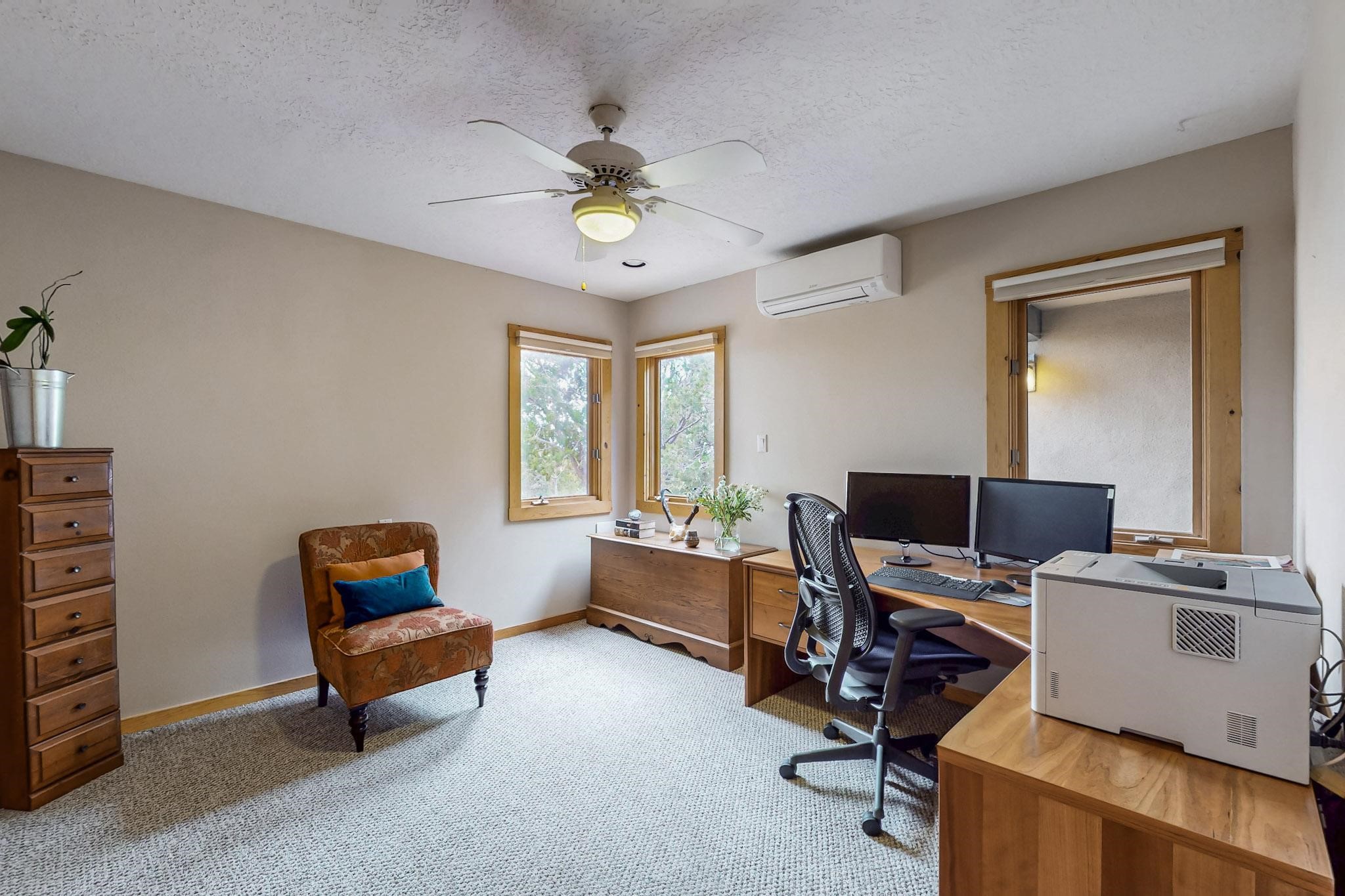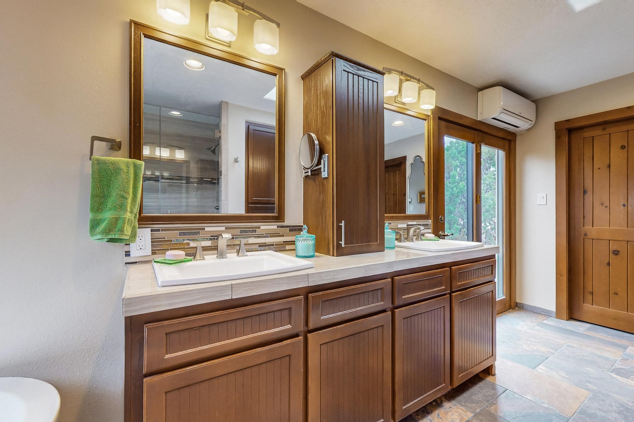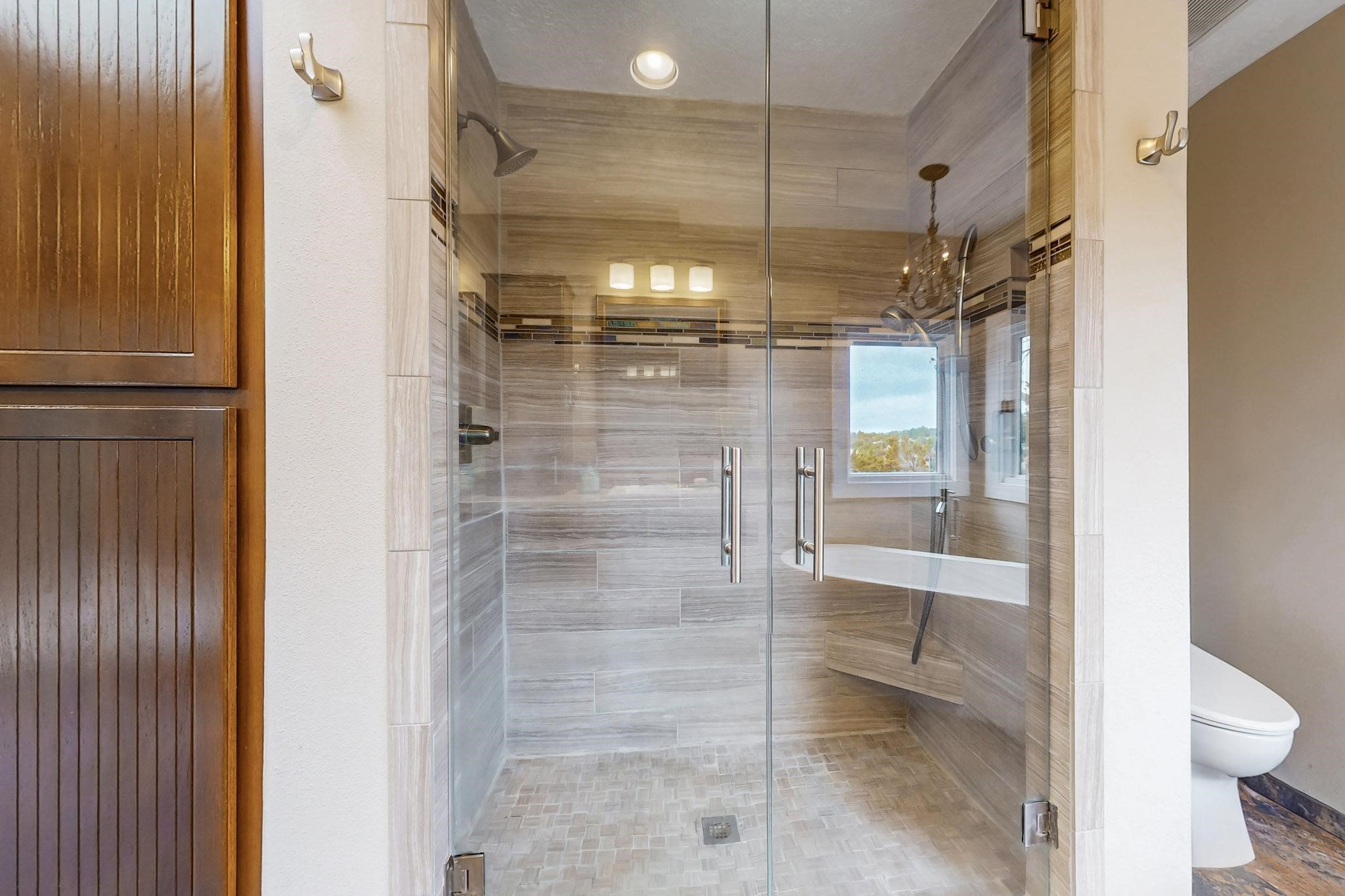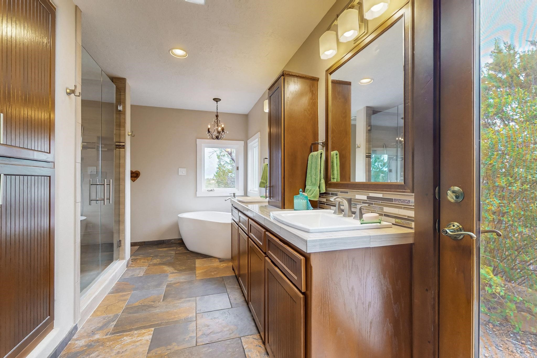 At the very end of a private road, where the world quiets and the landscape opens wide, you'll discover a hidden gem--an exceptional home perched above a sweeping arroyo, offering complete privacy and awe-inspiring panoramic views. This beautifully designed 4-bedroom, 3-bath home sits on 10 pristine acres in a small enclave that has been cherished by a single owner. From nearly every window and outdoor space, you'll be captivated by unobstructed vistas that stretch across the Galisteo Basin, Ortiz Mountains, Sandias, the majestic Sangre de Cristo range. Here, the sunsets paint the sky with color and the stars shine brighter than you've ever seen. Crafted by Jade Enterprises, the home features warm Southwest architectural touches, including hand-hewn vigas, high ceilings, and custom wood doors by local artisan Larry DeLeon. The open-concept kitchen with elegant serpentine stone countertops flows seamlessly into a generous living area, anchored by a beautiful fireplace and oriented toward some of the home's best views. The private primary suite occupies its own wing and includes a luxurious ensuite bath with a soaking tub, two-headed shower, walk-in closet, and a serene private patio. Two additional bedrooms at the rear of the home share a Jack-and-Jill bathroom and are joined by a flexible entertainment room with a wet bar and access to both the front and back outdoor living spaces. The oversized 2-car garage has cabinets, ample storage space, and a custom workbench. Outside, a fenced yard features a cozy flagstone fire-pit with seating, a spacious patio ideal for outdoor cooking, and a garden space ready for your vision. Every angle of this home was thoughtfully designed to celebrate the natural beauty that surrounds it. This is more than a home--it's a rare opportunity to own a piece of the New Mexico landscape, where peace, privacy, and panoramic beauty come together in perfect harmony. Covenants allow for additional casita/studio subject to HOA approval. Come see it.
