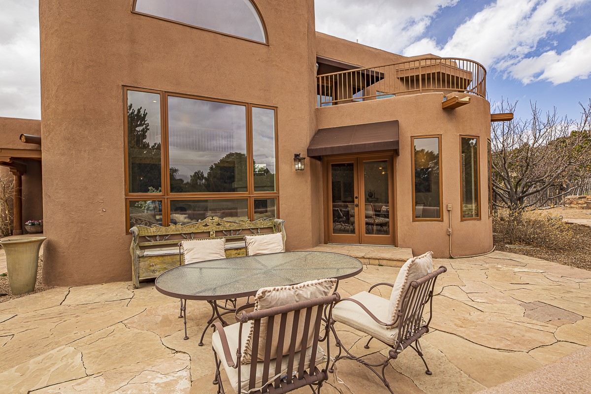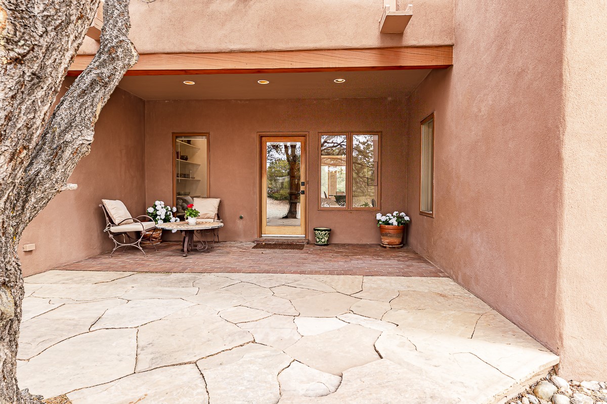 Welcome to the tranquil community of La Mariposa - at a great price! This light filled home has been extensively updated with beautiful, new hardwood floors, new lighting, a hot water on demand water heater, and hot water baseboard heat to the studio. The primary bedroom suite offers a private patio with stunning views of the Sangre de Cristo Mountains. With outdoor patios throughout, this home offers lots of privacy and serenity. The open concept kitchen is quite spacious for gatherings, with a large pantry and intimate seating areas. The back portal, located off of the dining room, is perfect for outdoor dining during the warm weather, with a water fountain nearby. The mature gardens surrounding the home are breathtaking in bloom and include mature apple, peach, cherry, and pear trees. There is also a greywater system for the landscaping. The heated studio is privately located off the garage with its own exterior entrances. There are no steps from the studio and throughout the first floor of the house. This home has lots to offer!