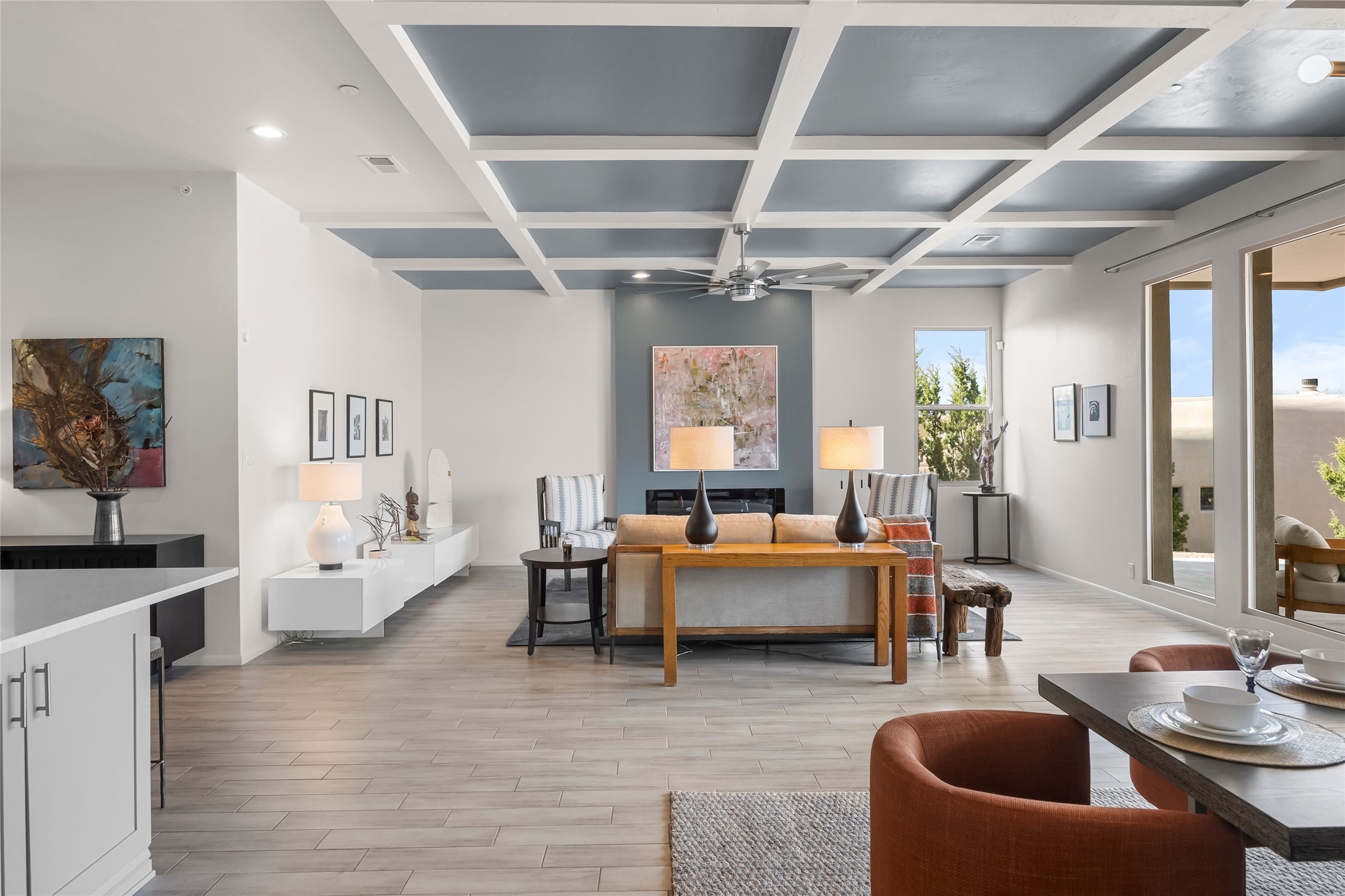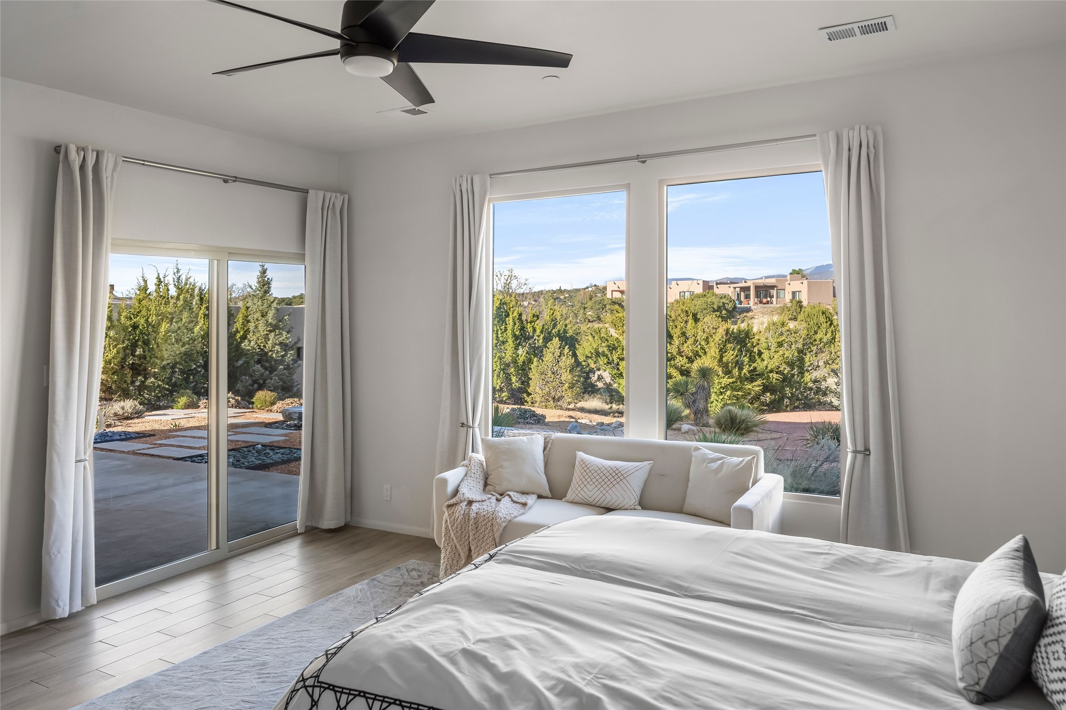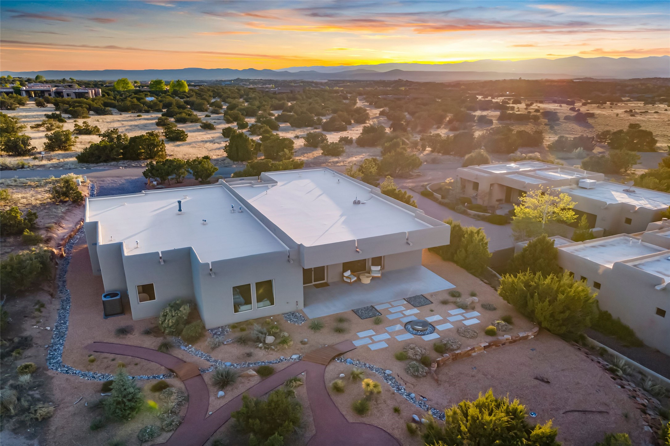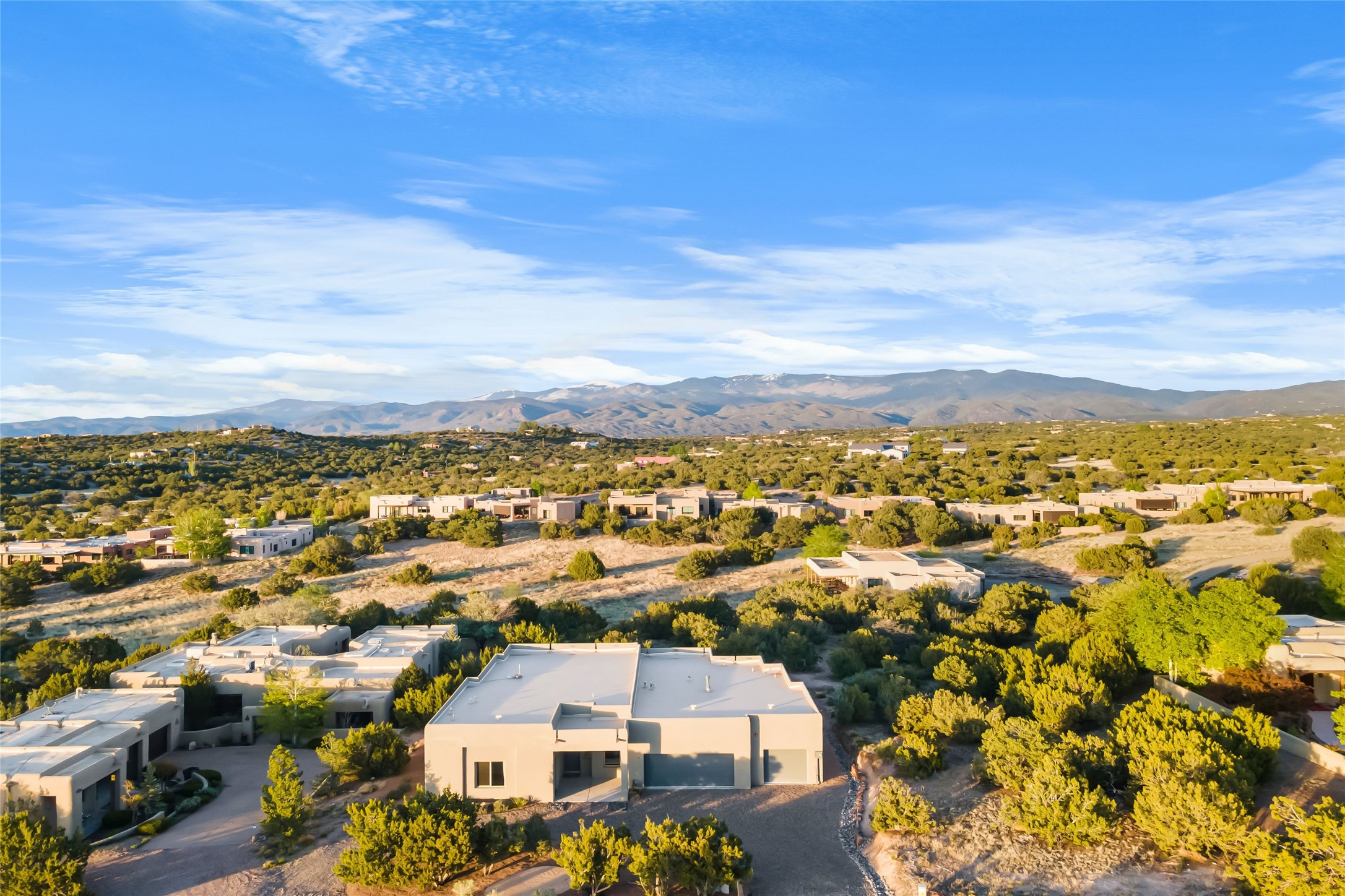Welcome to 14 Plano Arbolito--where sleek contemporary design meets the serene beauty of Santa Fe's natural landscape. Perched on a half acre in the desirable Tano West neighborhood, this recently built, single-level home offers the perfect balance of luxury, comfort, and breathtaking views. This three-bedroom, three-bathroom residence boasts an open-concept floorplan designed for effortless living and entertaining. The expansive great room features soaring ceilings, a modern electric ambiance fireplace, and floor-to-ceiling windows that frame spectacular views of the Sangre de Cristo Mountains. The adjacent chef's kitchen is equipped with premium stainless-steel appliances, a generous island with counter seating, a walk-in pantry, and elegant finishes that blend form and function. Retreat to a tranquil owner's suite complete with outdoor access, a spa-like bathroom with a soaking tub, dual vanities, a spacious shower, and two oversized walk-in closets--one currently used as an office or yoga space. A separate guest wing includes two private bedrooms, one with its own entrance and en suite bath, perfect for visitors or extended stays. Step outside to a deep-covered portal with gas fireplace hookups and a custom fountain, ideal for enjoying Santa Fe's vivid sunsets and star-filled nights. The fully landscaped, xeriscape backyard opens to panoramic vistas and unmatched privacy. Additional highlights include an oversized three-car garage, a flexible bonus room off the entry, and many thoughtful upgrades--from whole-house air purification to premium lighting and smart home features. Only 20 minutes from the Plaza and nestled within a community known for its protected open space, 14 Plano Arbolito offers peace, luxury, and a front-row seat to Santa Fe's majestic beauty.