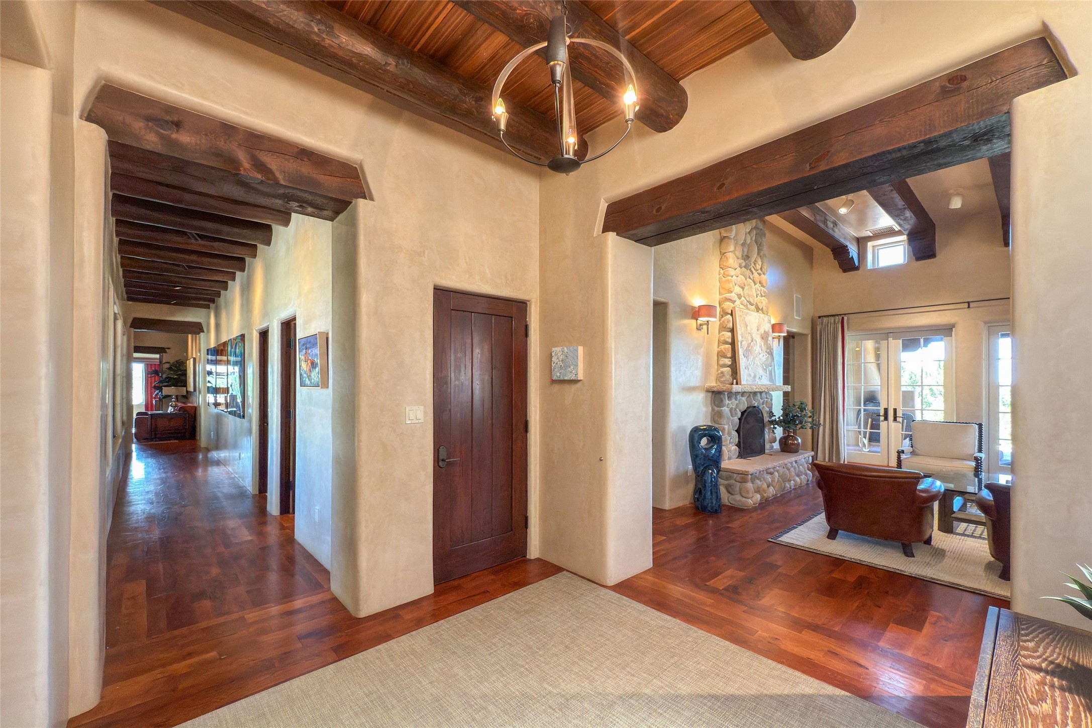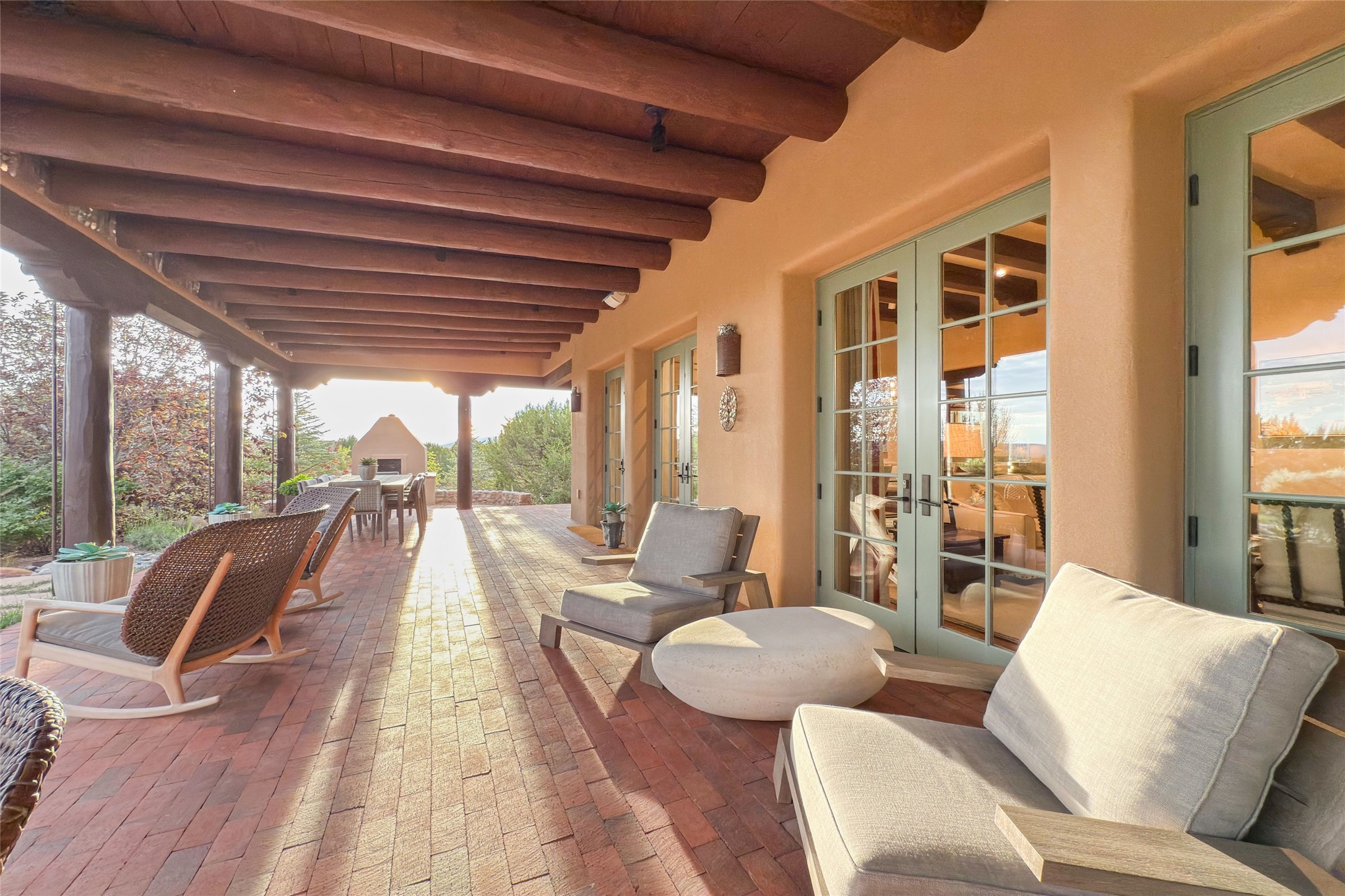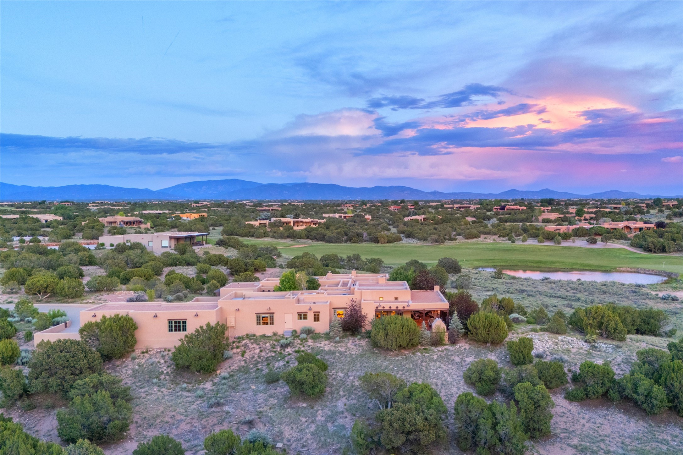 Welcome to 6 Silver Mesa Court, an exceptional property that blends high-end design, thoughtful amenities and layout, and stunning indoor-outdoor living. This elegant home showcases Jemez mountain views, golf course and pond views, and sound system throughout. Highly desirable location with close proximity to the Spa, Racquet & Fitness Center; Driving Range and the Club Hacienda. Step into the inviting front courtyard and enter into the foyer that greets you with a wall-washer skylight. Flow into the great room with 12-foot ceilings, clerestory windows, a stone fireplace, impressive beams, and 6 sets of French doors opening to the wrap around portal. Wind shades around the entire portal make outdoor dining lovely in any weather. Enjoy outdoor entertaining and relax by the fireplace while experiencing incredible views of the Jemez mountain sunsets.This expansive great room combines living and dining spaces and opens to the chef's kitchen complete with a large center island, built-in cutting board, and top-tier appliances including a Viking fridge and gas range. A small office is conveniently located adjacent to the kitchen, along with a laundry/pantry area housing a large wine storage. Tucked behind the kitchen lays a large media/flex room, bedroom with two sets of built-in bunk beds and 3/4 bath. The primary suite is a private sanctuary, complete with its own fireplace and opens to a portal and hot tub. This wing shares a library/study, an office and en-suite guest bedroom. The attached guest casita features a studio layout with a full bath, mini fridge, and private entrance from the interior courtyard. With many guest accommodation options, multiple family rooms, a 360 degree view from the rooftop deck, and a 4 car garage (with a paver driveway) this estate is perfect for large gatherings. Every detail has been curated for comfort, style, and function in this stunning Santa Fe home. A Las Campanas club membership is available for purchase and upon approval.