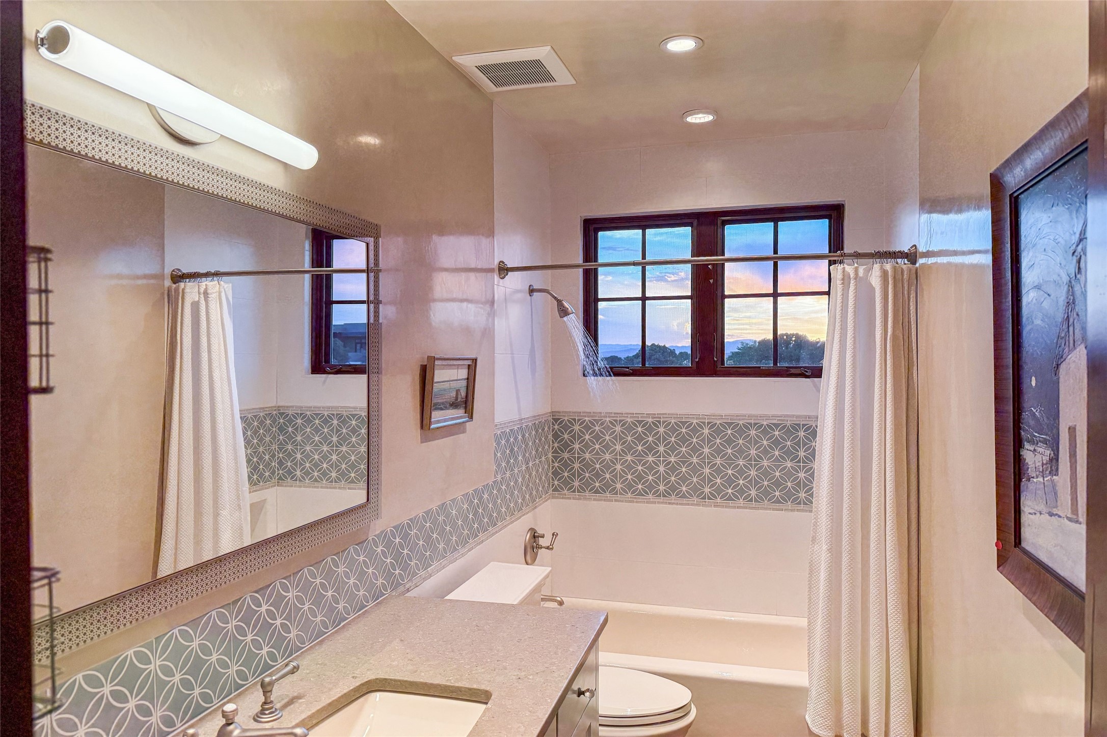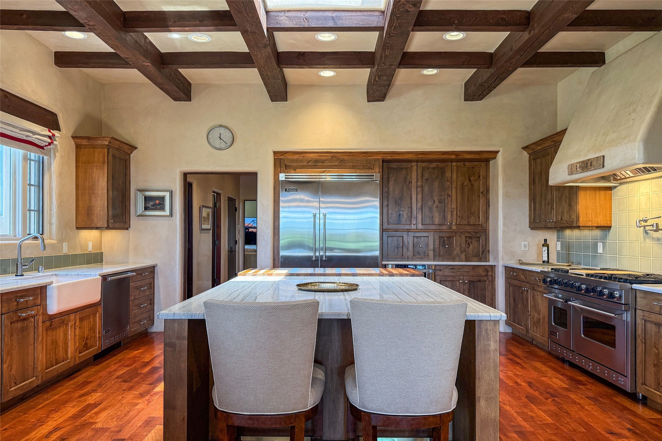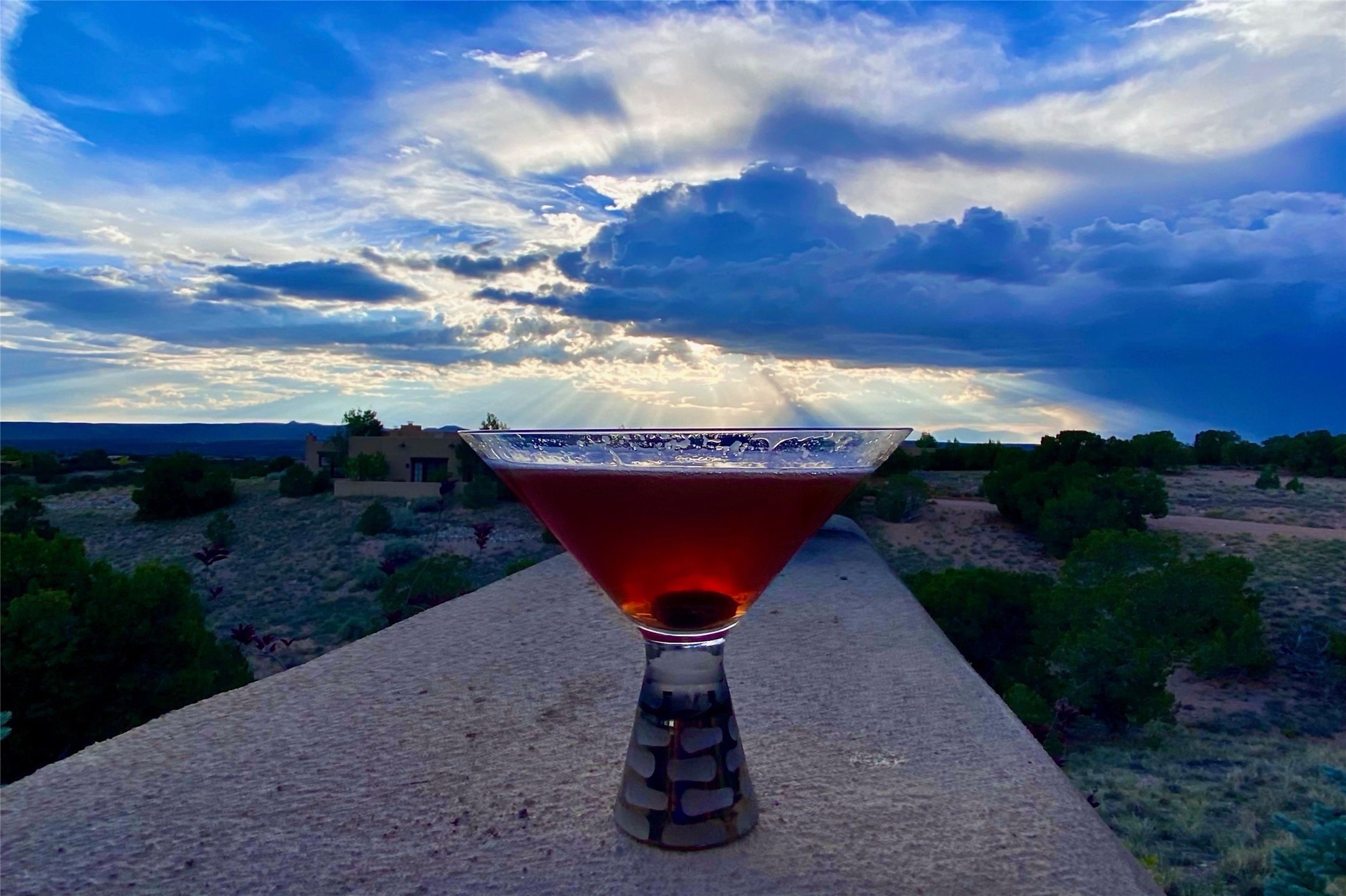 Welcome to 6 Silver Mesa Court, an exceptional property that blends high-end design, thoughtful amenities and layout, and stunning indoor-outdoor living. This elegant home showcases Jemez mountain views, golf course and pond views, and sound system throughout. Highly desirable location with close proximity to the Spa, Racquet & Fitness Center; Driving Range and the Club Hacienda. Step into the inviting front courtyard and enter into the foyer that greets you with a wall-washer skylight. Flow into the great room with 12-foot ceilings, clerestory windows, a stone fireplace, impressive beams, and 6 sets of French doors opening to the wrap around portal. Wind shades around the entire portal make outdoor dining lovely in any weather. Enjoy outdoor entertaining and relax by the fireplace while experiencing incredible views of the Jemez mountain sunsets.This expansive great room combines living and dining spaces and opens to the chef's kitchen complete with a large center island, built-in cutting board, and top-tier appliances including a Viking fridge and gas range. A small office is conveniently located adjacent to the kitchen, along with a laundry/pantry area housing a large wine storage. Tucked behind the kitchen lays a large media/flex room, bedroom with two sets of built-in bunk beds and 3/4 bath. The primary suite is a private sanctuary, complete with its own fireplace and opens to a portal and hot tub. This wing shares a library/study, an office and en-suite guest bedroom. The attached guest casita features a studio layout with a full bath, mini fridge, and private entrance from the interior courtyard. With many guest accommodation options, multiple family rooms, a 360 degree view from the rooftop deck, and a 4 car garage (with a paver driveway) this estate is perfect for large gatherings. Every detail has been curated for comfort, style, and function in this stunning Santa Fe home. A Las Campanas club membership is available for purchase and upon approval.