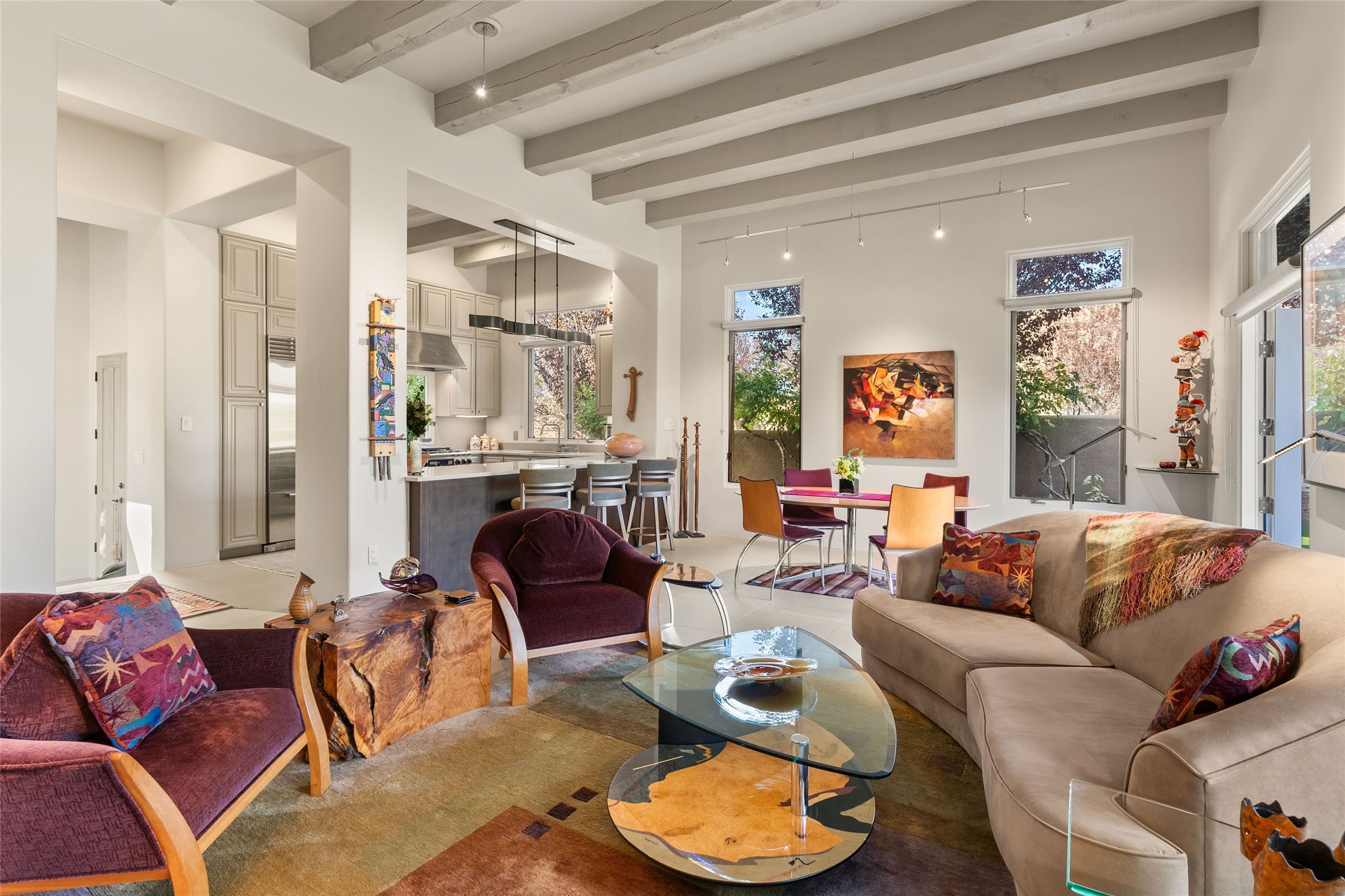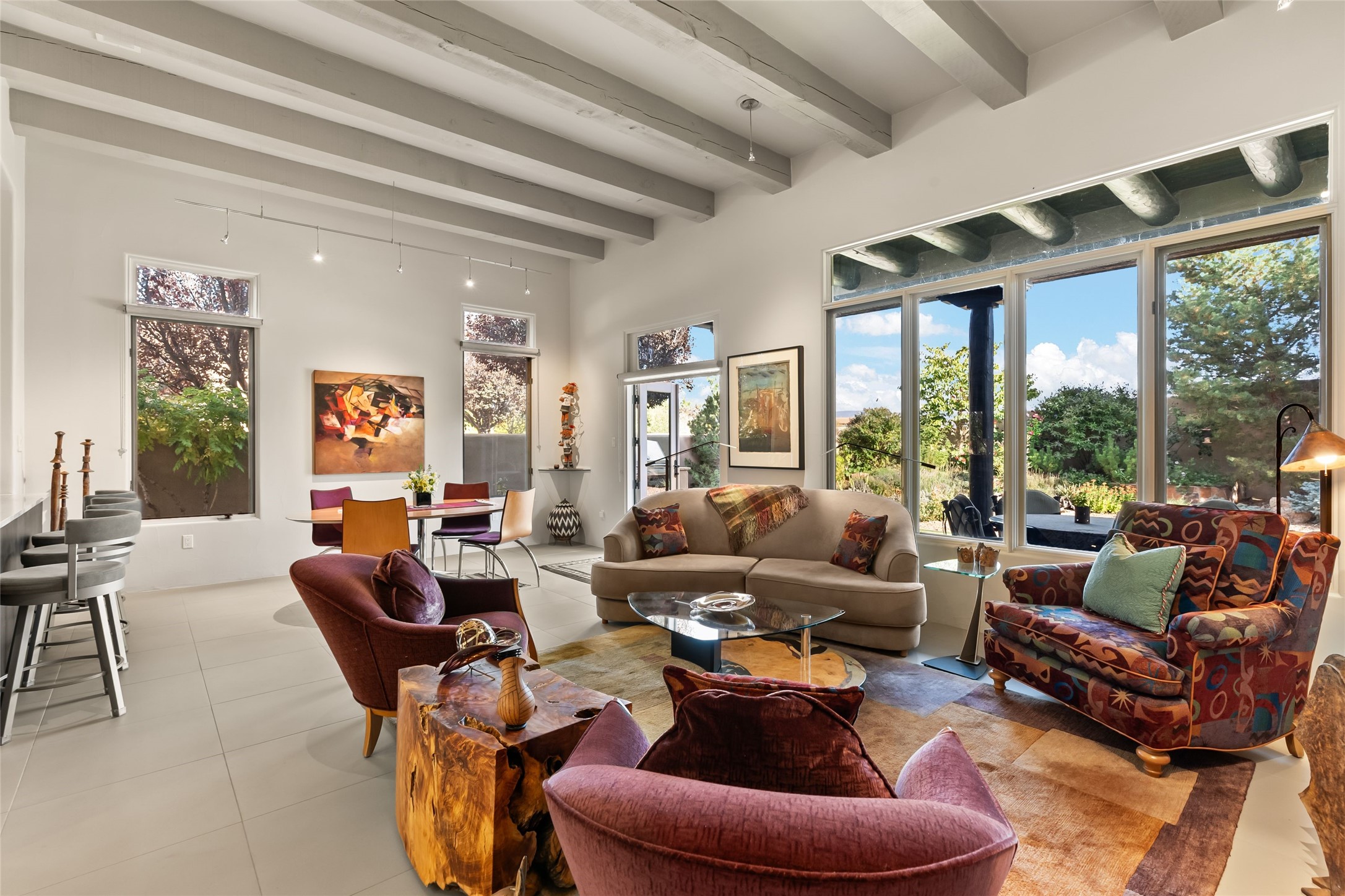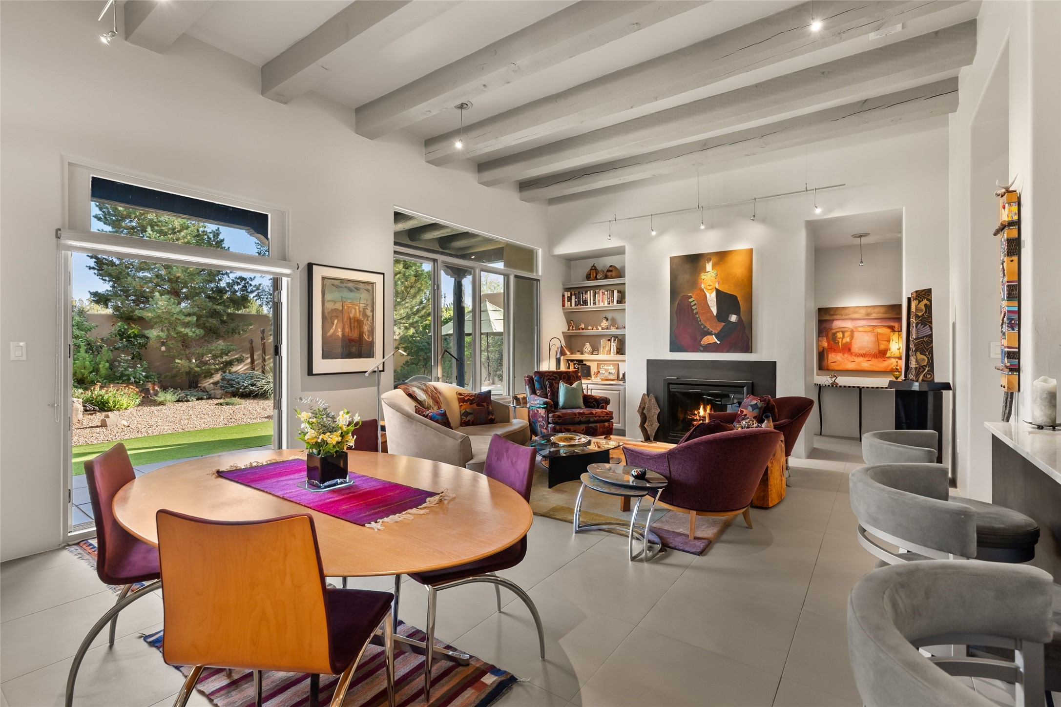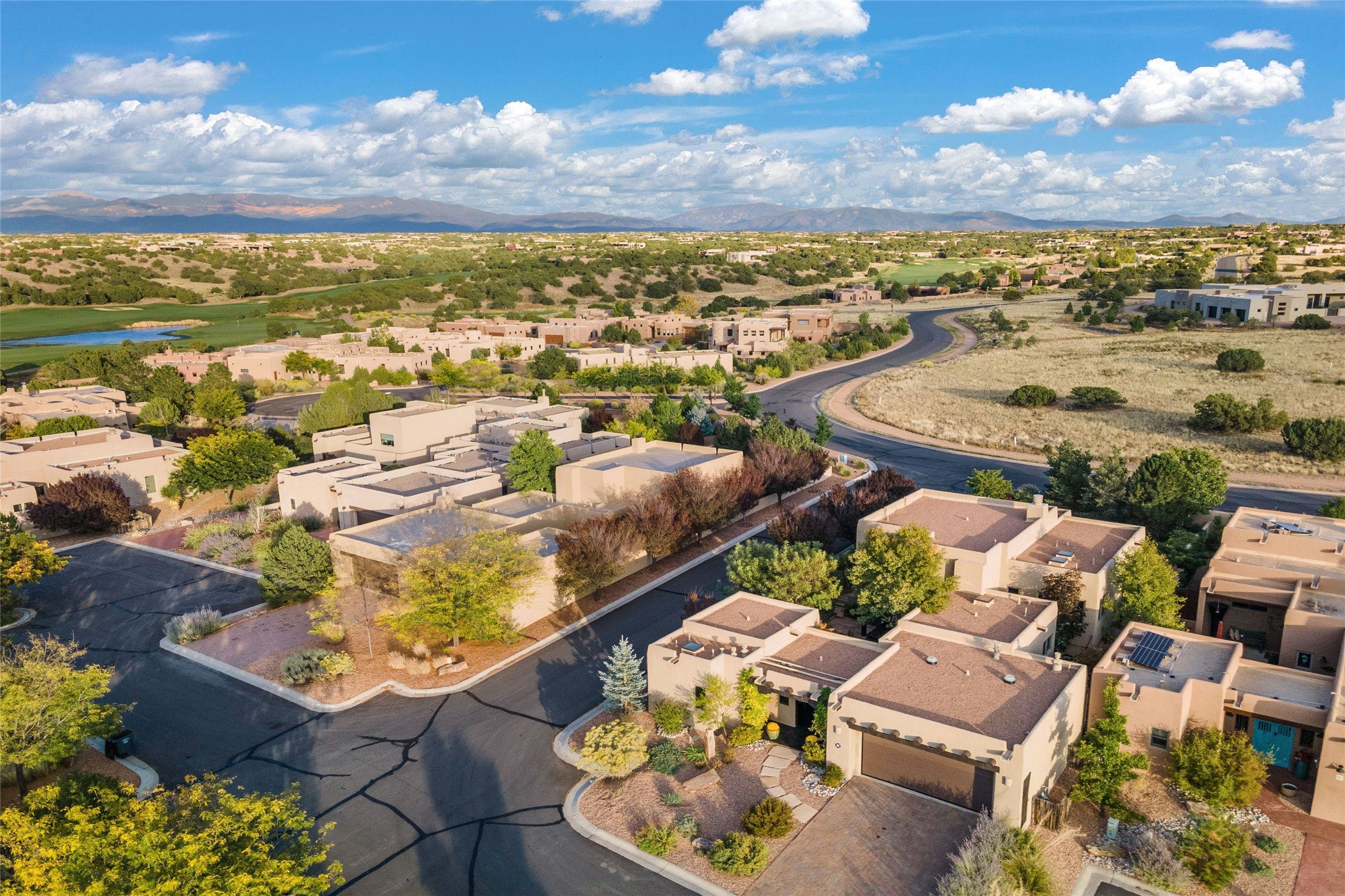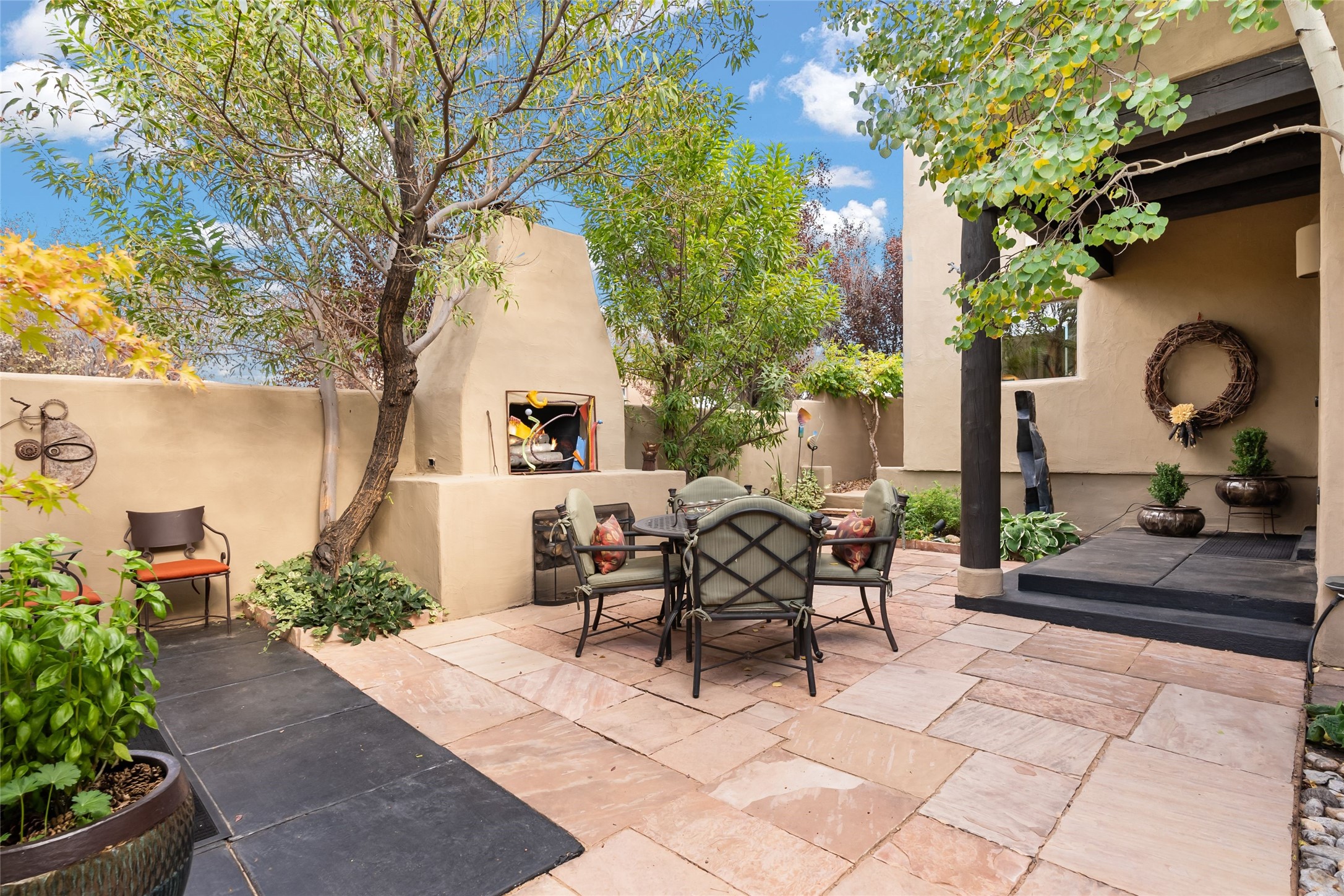 This inviting, Soft Contemporary 2-Bed + Den / 3-Bath home in Gated Las Campanas provides easy, "Lock & Leave" convenience with a gorgeous view of the Sangre de Cristo Mountains. Two rustic wood entry gates lead to the private, intimate entry courtyard, which is beautifully landscaped with a water feature & cozy wood-burning fireplace for entertaining guests. The Main house is an open floor plan with an easy flow from the Living & Dining areas to the Gourmet Kitchen with Taj Majal Quartzite countertop and stainless appliances - Sub Zero refrigerator, a 36-inch Frigidaire gas range/oven (installed in January 2025 & never used), Dacor hood, Bosch dishwasher, Sharp microwave drawer and wine cooler. The Elegant Master Bedroom & Bath offers two separate vanities, oval soaking tub, separate shower and a fabulous California Closet. The Media Room could easily be converted to a Bedroom and has an adjacent Bath. The Private, Detached 1-Bed / 1-Bath Guest Casita offers great privacy for visiting friends & family, with enough room for a King-size bed. The back yard is fully landscaped and walled-in for pets, with a water feature, built-in Viking grill and Sangre de Cristo Mountain view. This home has it all - Contemporary style, Detached Casita and a View of the Sangre de Cristo Mountains.