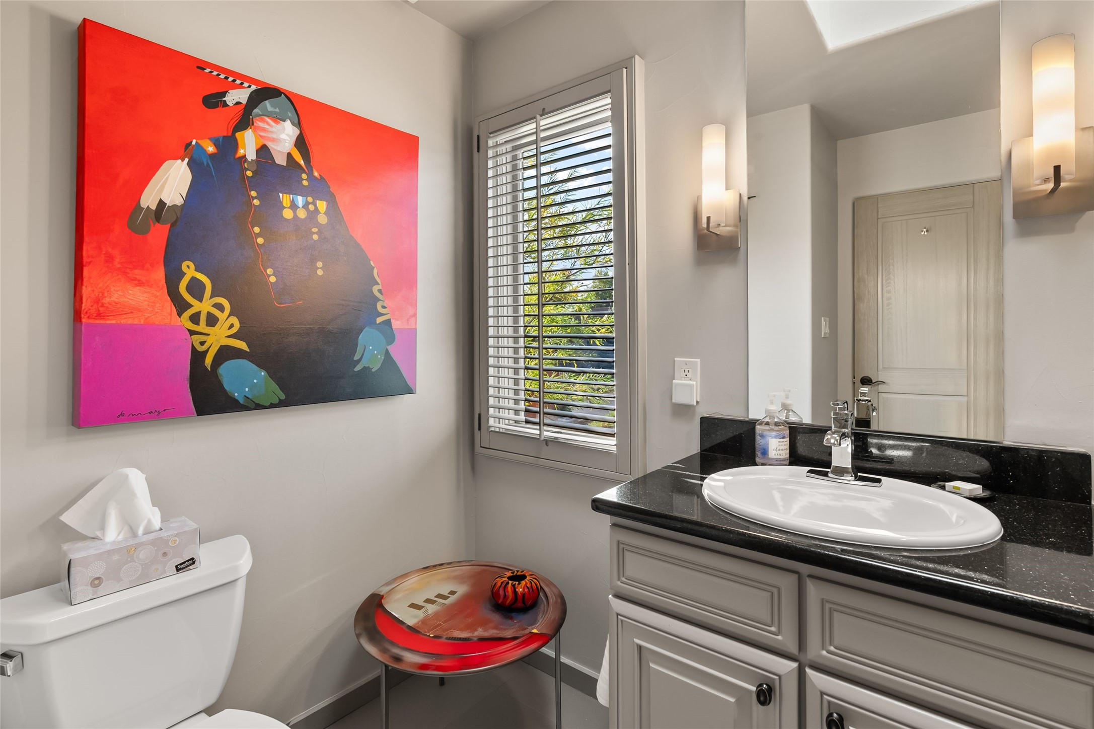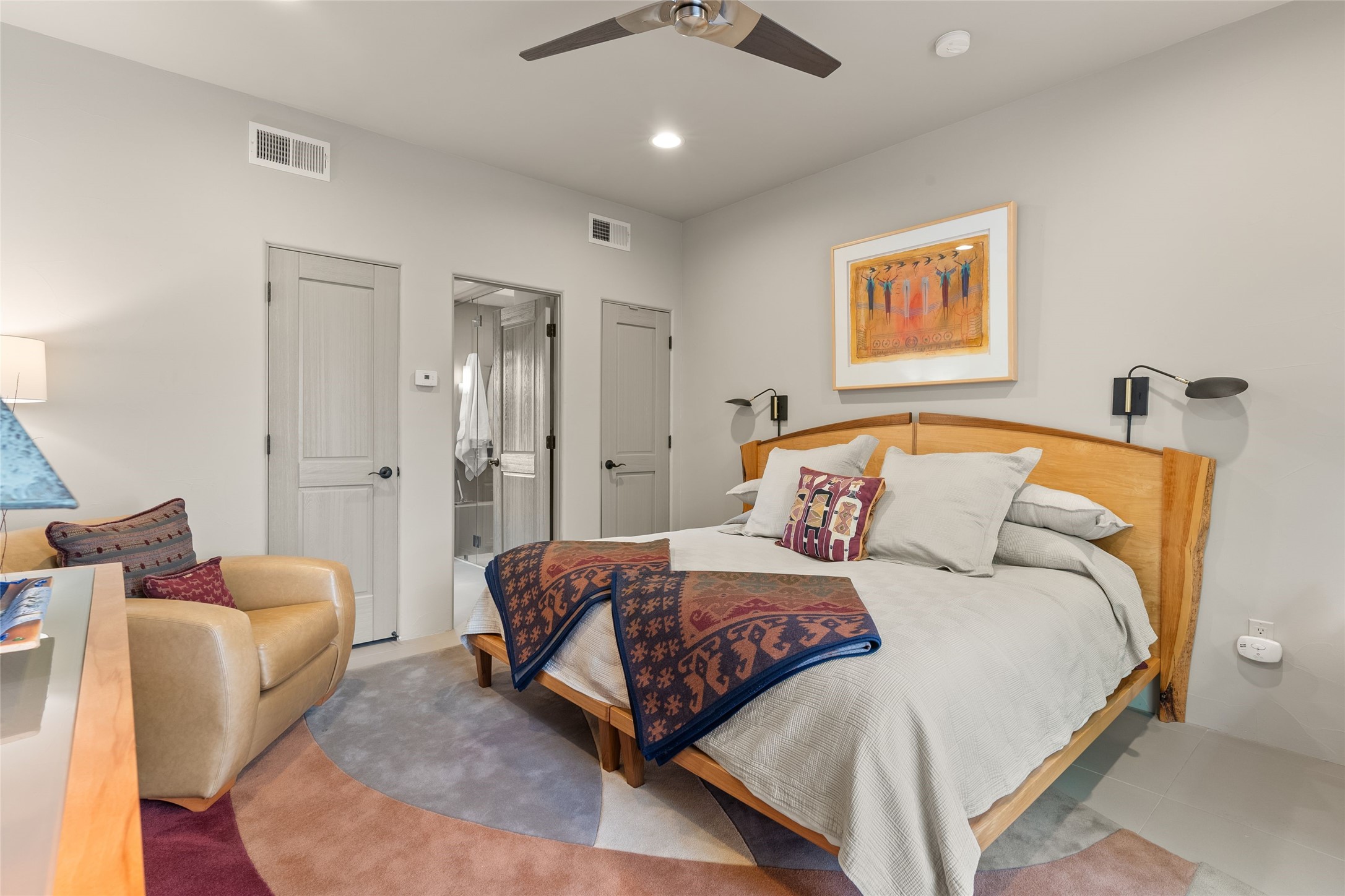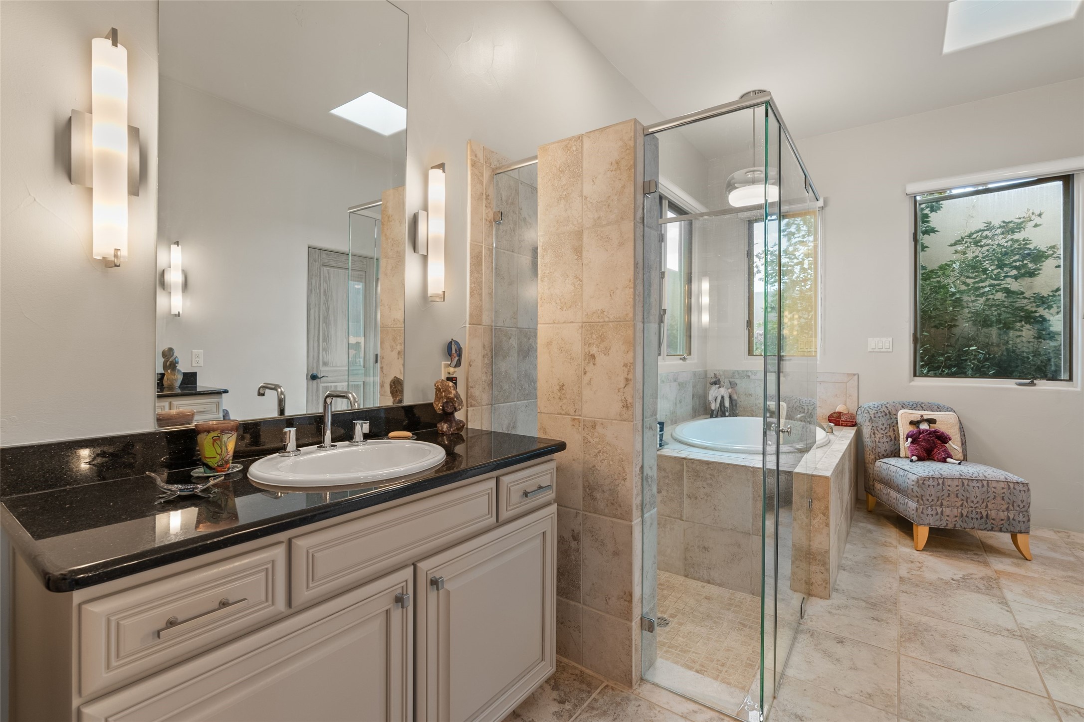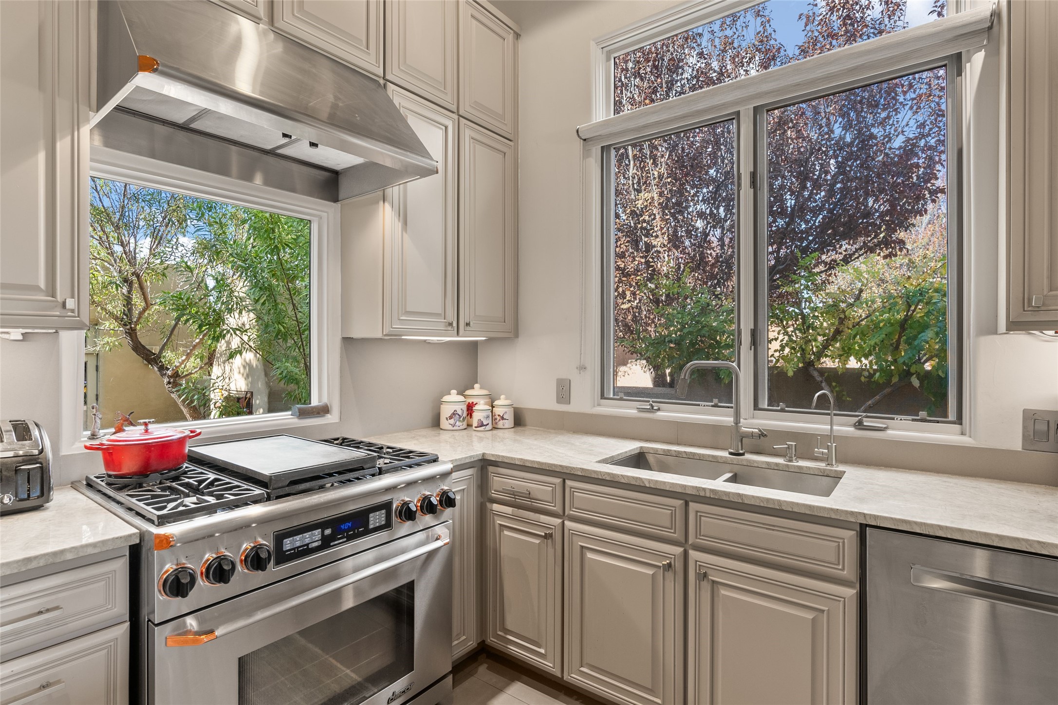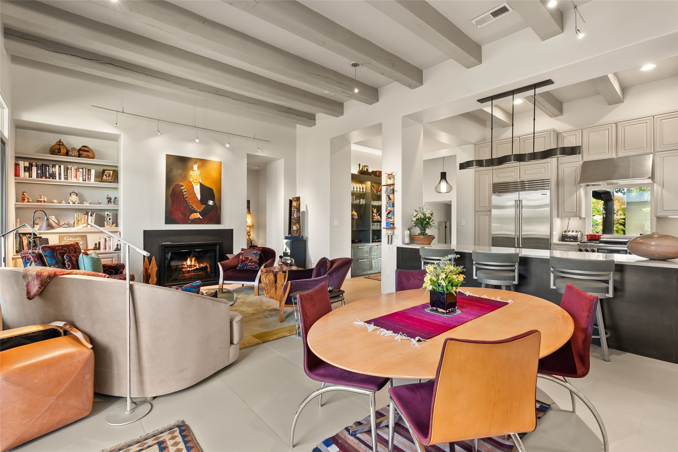 This inviting, Soft Contemporary 2-Bed + Den / 3-Bath home in Gated Las Campanas provides easy, "Lock & Leave" convenience with a gorgeous view of the Sangre de Cristo Mountains. Two rustic wood entry gates lead to the private, intimate entry courtyard, which is beautifully landscaped with a water feature & cozy wood-burning fireplace for entertaining guests. The Main house is an open floor plan with an easy flow from the Living & Dining areas to the Gourmet Kitchen with Taj Majal Quartzite countertop and stainless appliances - Sub Zero refrigerator, a 36-inch Frigidaire gas range/oven (installed in January 2025 & never used), Dacor hood, Bosch dishwasher, Sharp microwave drawer and wine cooler. The Elegant Master Bedroom & Bath offers two separate vanities, oval soaking tub, separate shower and a fabulous California Closet. The Media Room could easily be converted to a Bedroom and has an adjacent Bath. The Private, Detached 1-Bed / 1-Bath Guest Casita offers great privacy for visiting friends & family, with enough room for a King-size bed. The back yard is fully landscaped and walled-in for pets, with a water feature, built-in Viking grill and Sangre de Cristo Mountain view. This home has it all - Contemporary style, Detached Casita and a View of the Sangre de Cristo Mountains.
