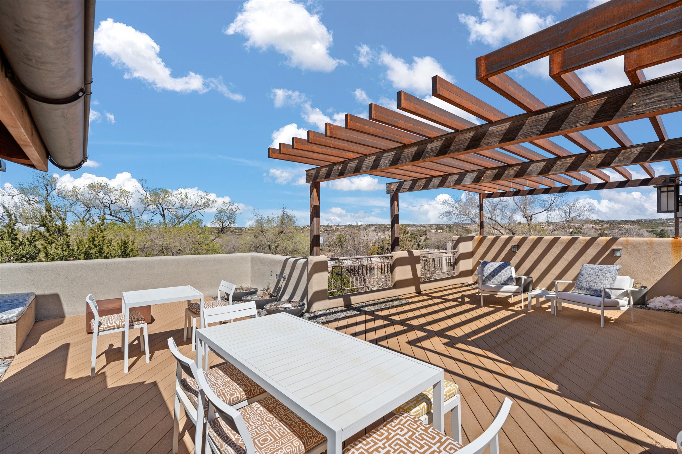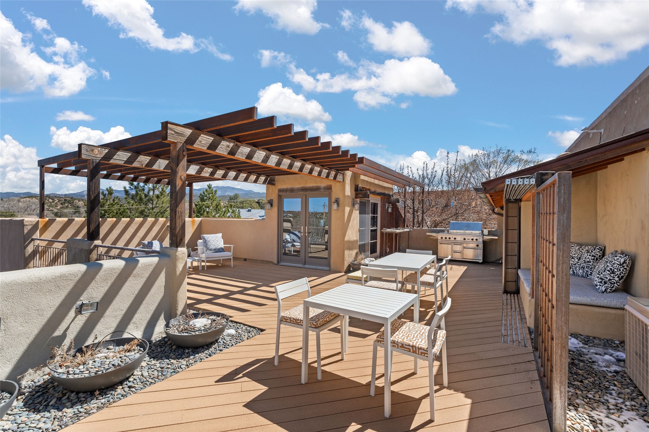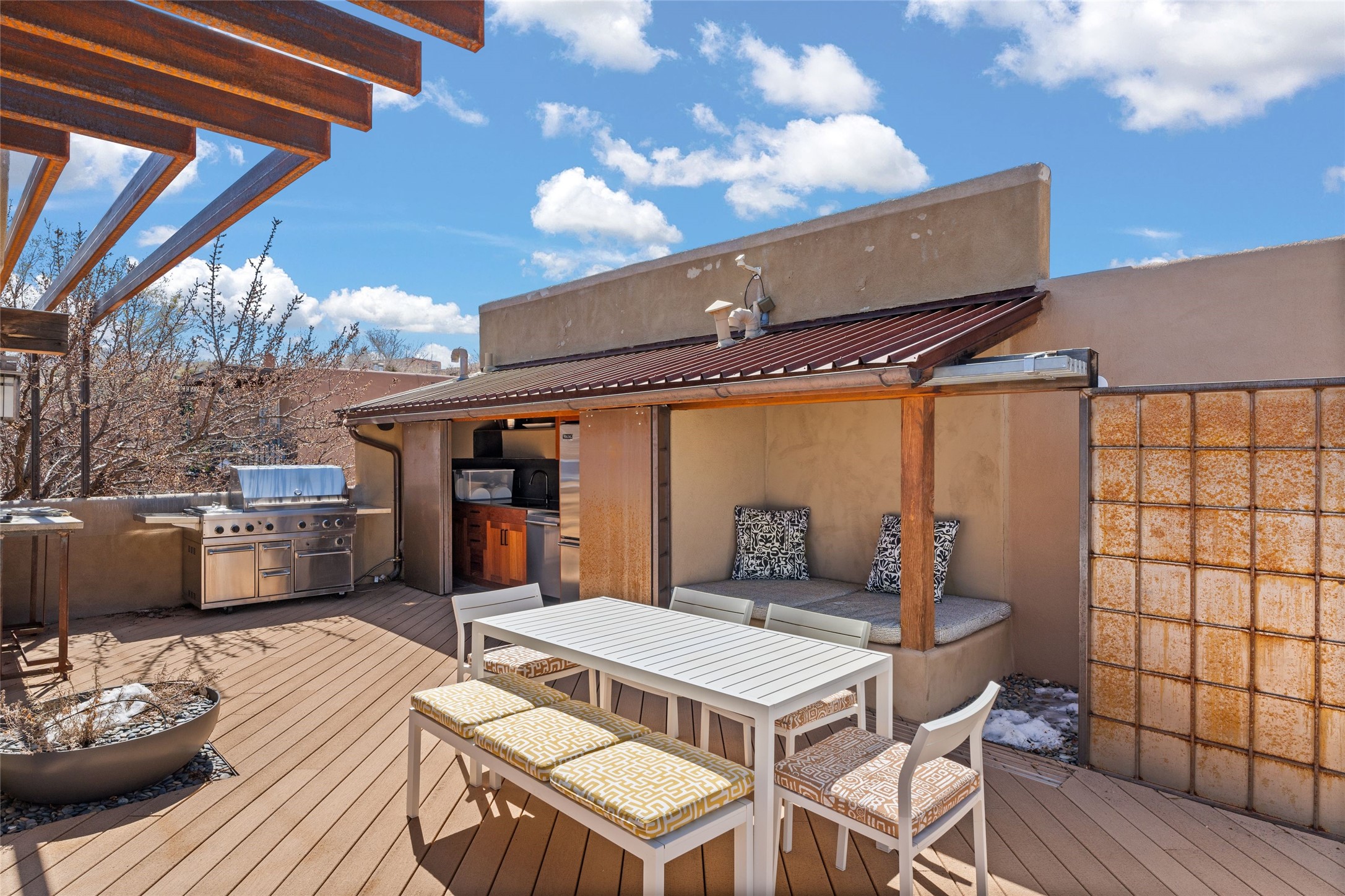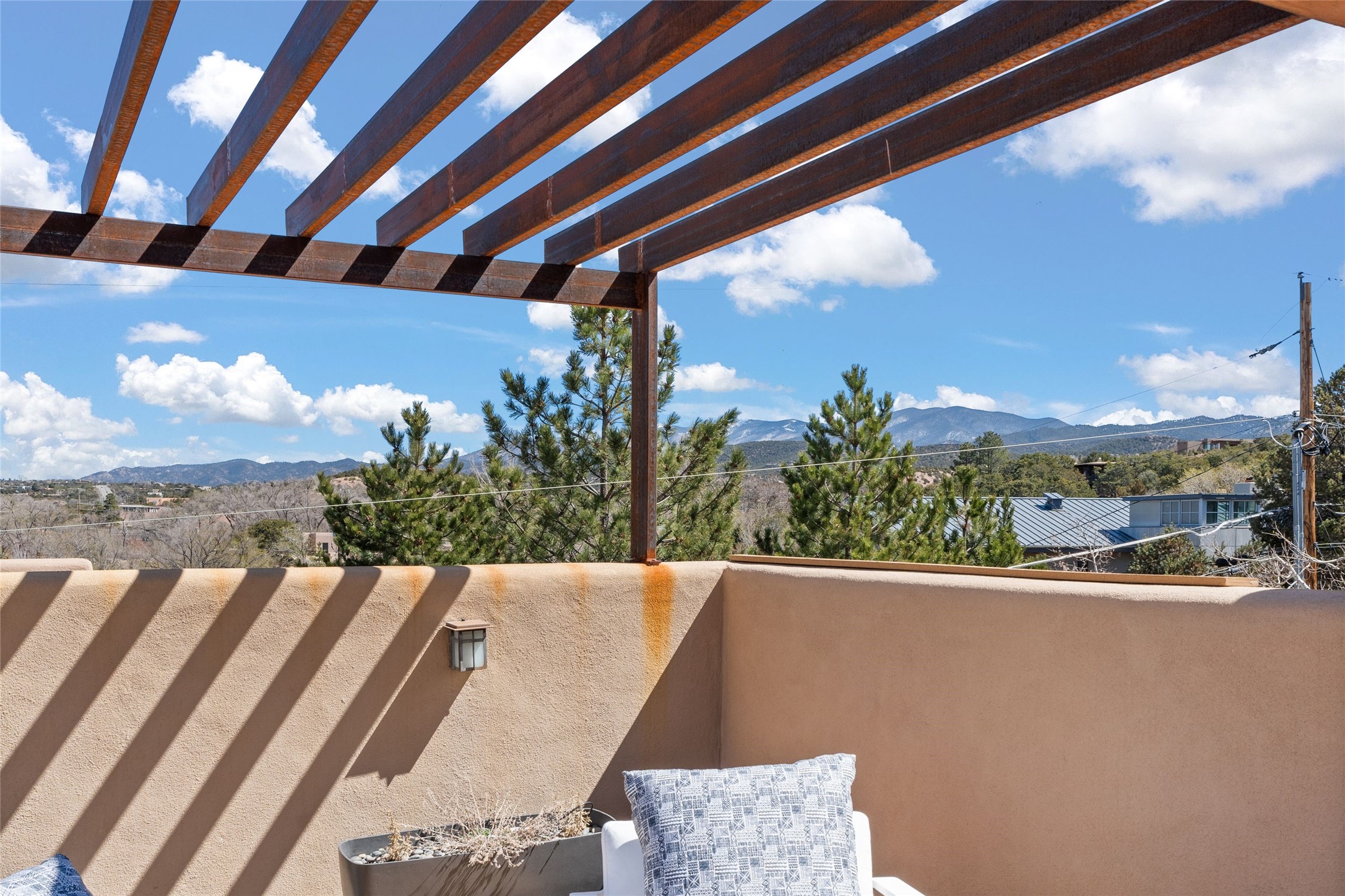 Have you been dreaming of a roof top garden deck where you can live alfresco with full kitchen (including dishwasher!), cozy gas fire pit and a sleeping spot under the stars? With views of sunrise over the Sangres, and sunsets behind the Jemez, and just three blocks from the Plaza, this is the icing on the cake of this cool soft contemporary 2 bedroom, 2,023 square foot condo. With two bedroom suites (one with a steam shower), bamboo floors and Ikea closet systems, this multi-level condo has nice bedroom separation and a very private walled patio off one, shaded by an ancient apricot tree. The living room enjoys a soaring 20 foot ceiling with beams, a fireplace, polished concrete floors, and has a wonderful open feel with the kitchen and dining areas. The kitchen has Cambria quartz counters, stainless appliances and great storage. All this, while being a handy run up to the ski basin and hiking trails, or a short walk to Ft. Marcy or downtown.