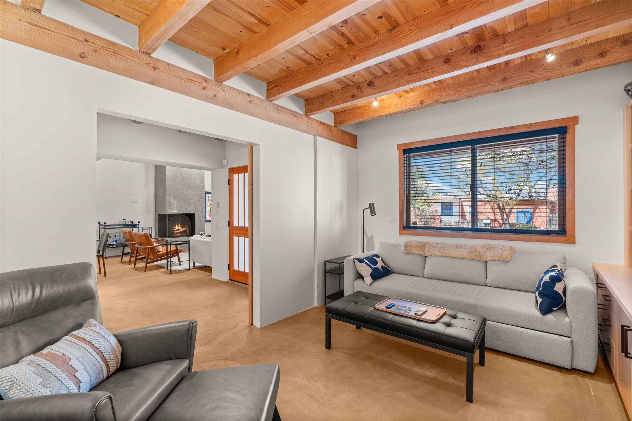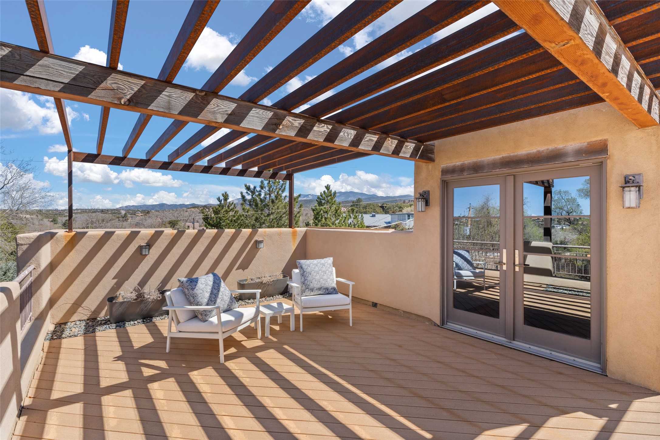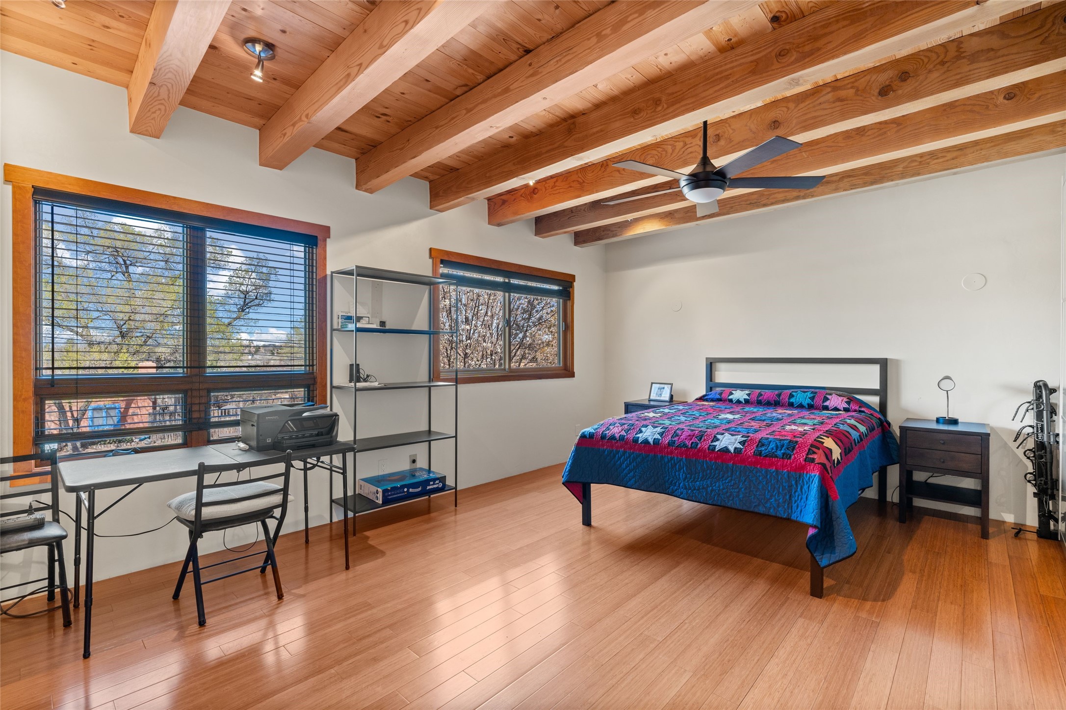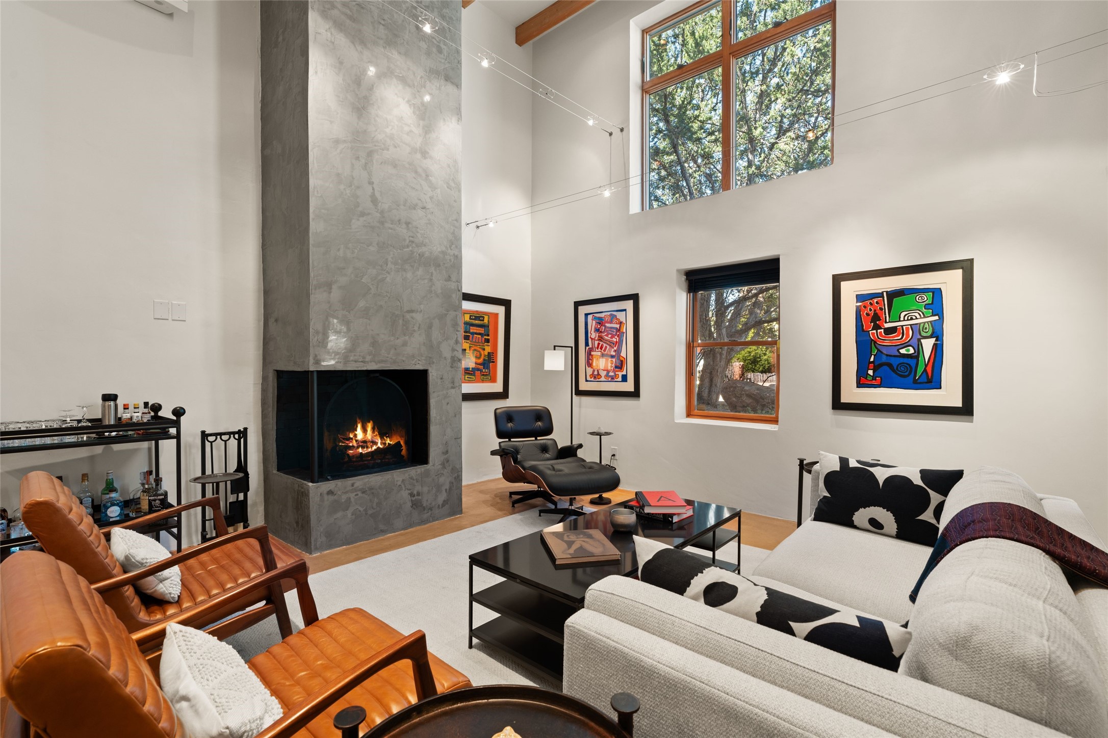 Have you been dreaming of a roof top garden deck where you can live alfresco with full kitchen (including dishwasher!), cozy gas fire pit and a sleeping spot under the stars? With views of sunrise over the Sangres, and sunsets behind the Jemez, and just three blocks from the Plaza, this is the icing on the cake of this cool soft contemporary 2 bedroom, 2,023 square foot condo. With two bedroom suites (one with a steam shower), bamboo floors and Ikea closet systems, this multi-level condo has nice bedroom separation and a very private walled patio off one, shaded by an ancient apricot tree. The living room enjoys a soaring 20 foot ceiling with beams, a fireplace, polished concrete floors, and has a wonderful open feel with the kitchen and dining areas. The kitchen has Cambria quartz counters, stainless appliances and great storage. All this, while being a handy run up to the ski basin and hiking trails, or a short walk to Ft. Marcy or downtown.