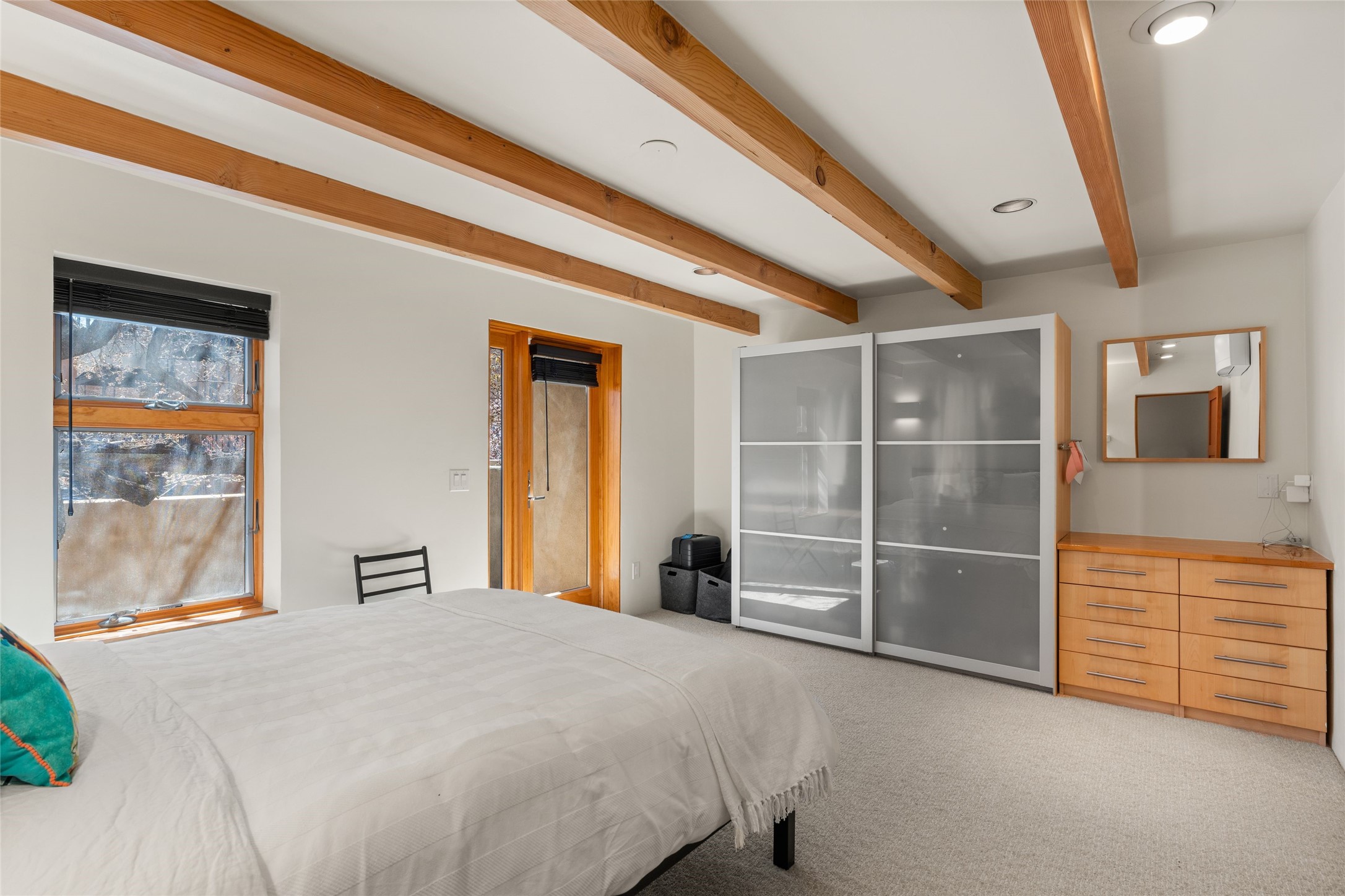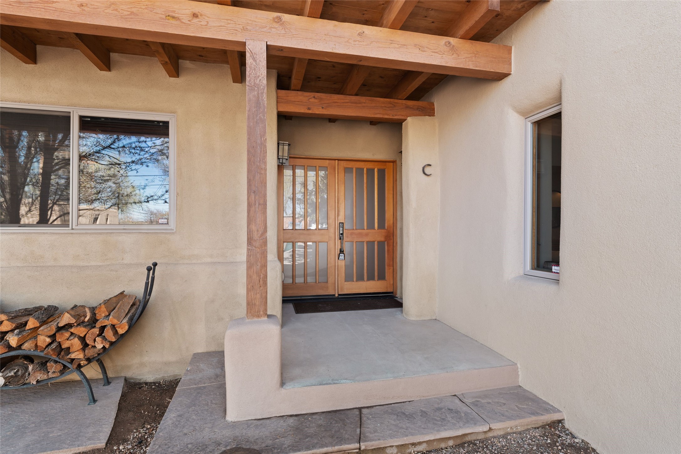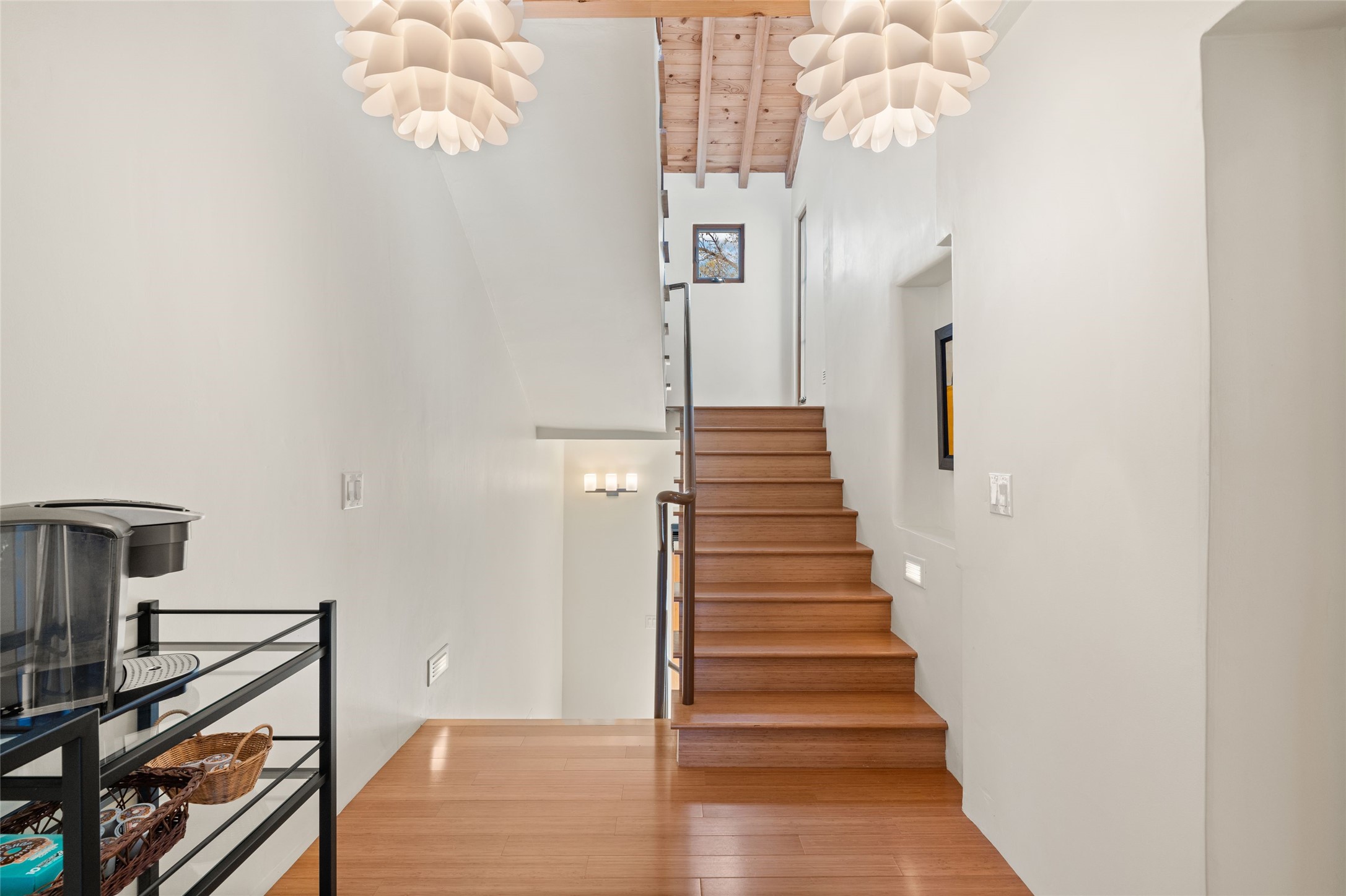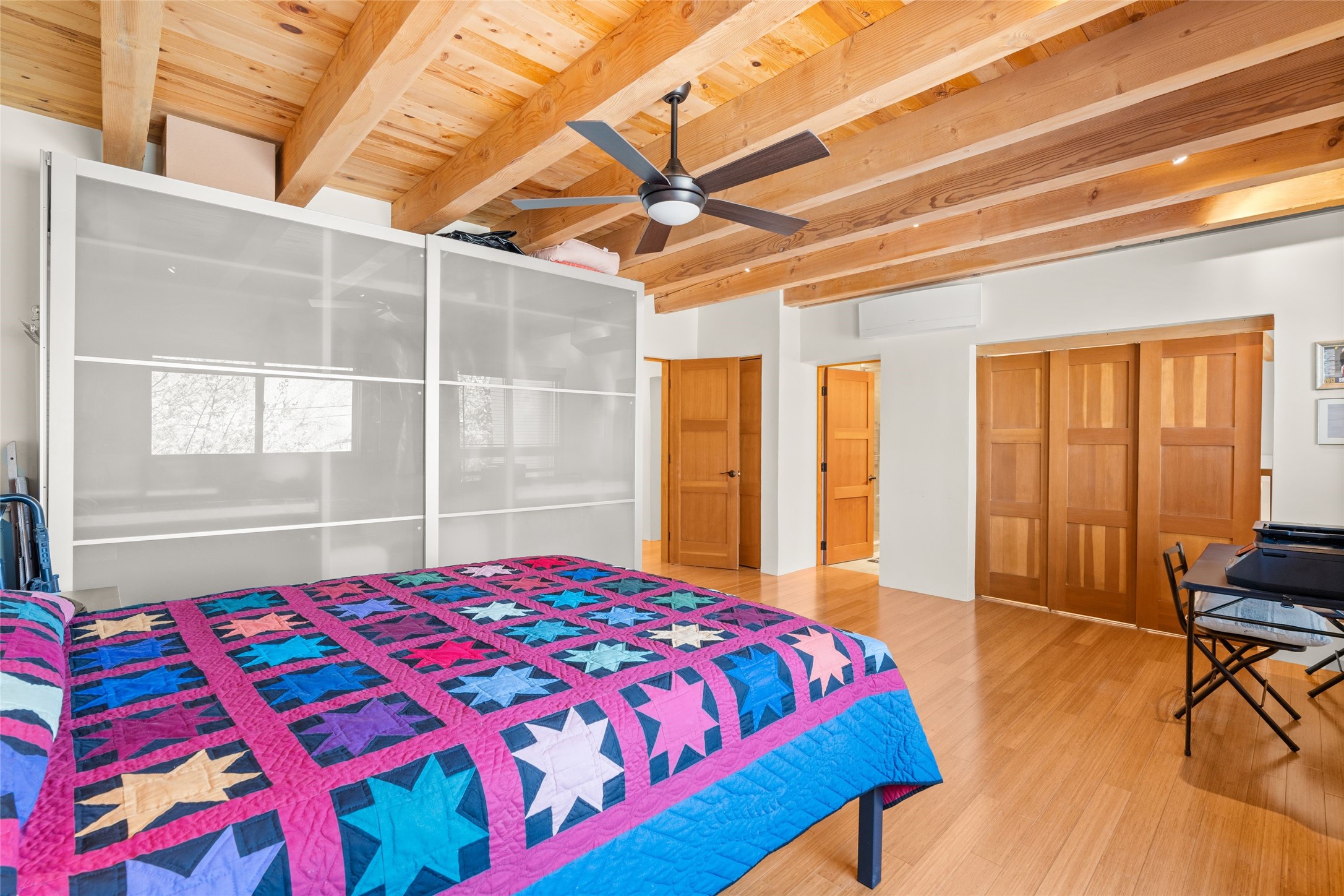 Have you been dreaming of a roof top garden deck where you can live alfresco with full kitchen (including dishwasher!), cozy gas fire pit and a sleeping spot under the stars? With views of sunrise over the Sangres, and sunsets behind the Jemez, and just three blocks from the Plaza, this is the icing on the cake of this cool soft contemporary 2 bedroom, 2,023 square foot condo. With two bedroom suites (one with a steam shower), bamboo floors and Ikea closet systems, this multi-level condo has nice bedroom separation and a very private walled patio off one, shaded by an ancient apricot tree. The living room enjoys a soaring 20 foot ceiling with beams, a fireplace, polished concrete floors, and has a wonderful open feel with the kitchen and dining areas. The kitchen has Cambria quartz counters, stainless appliances and great storage. All this, while being a handy run up to the ski basin and hiking trails, or a short walk to Ft. Marcy or downtown.