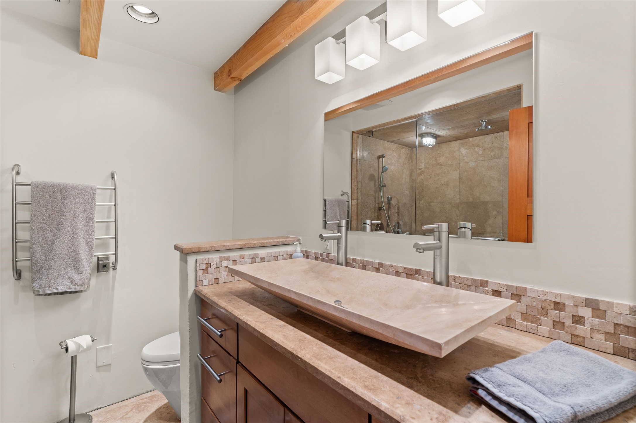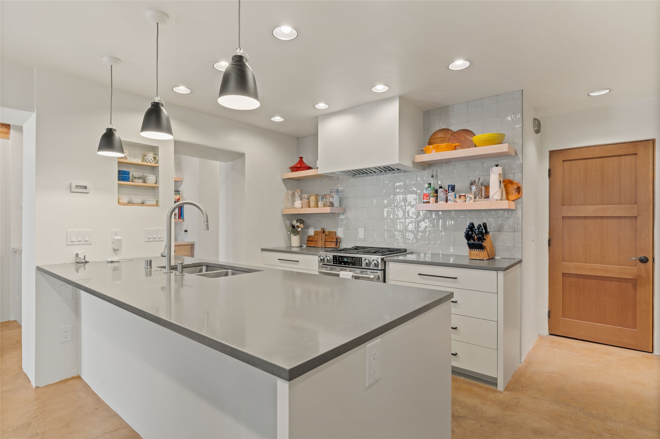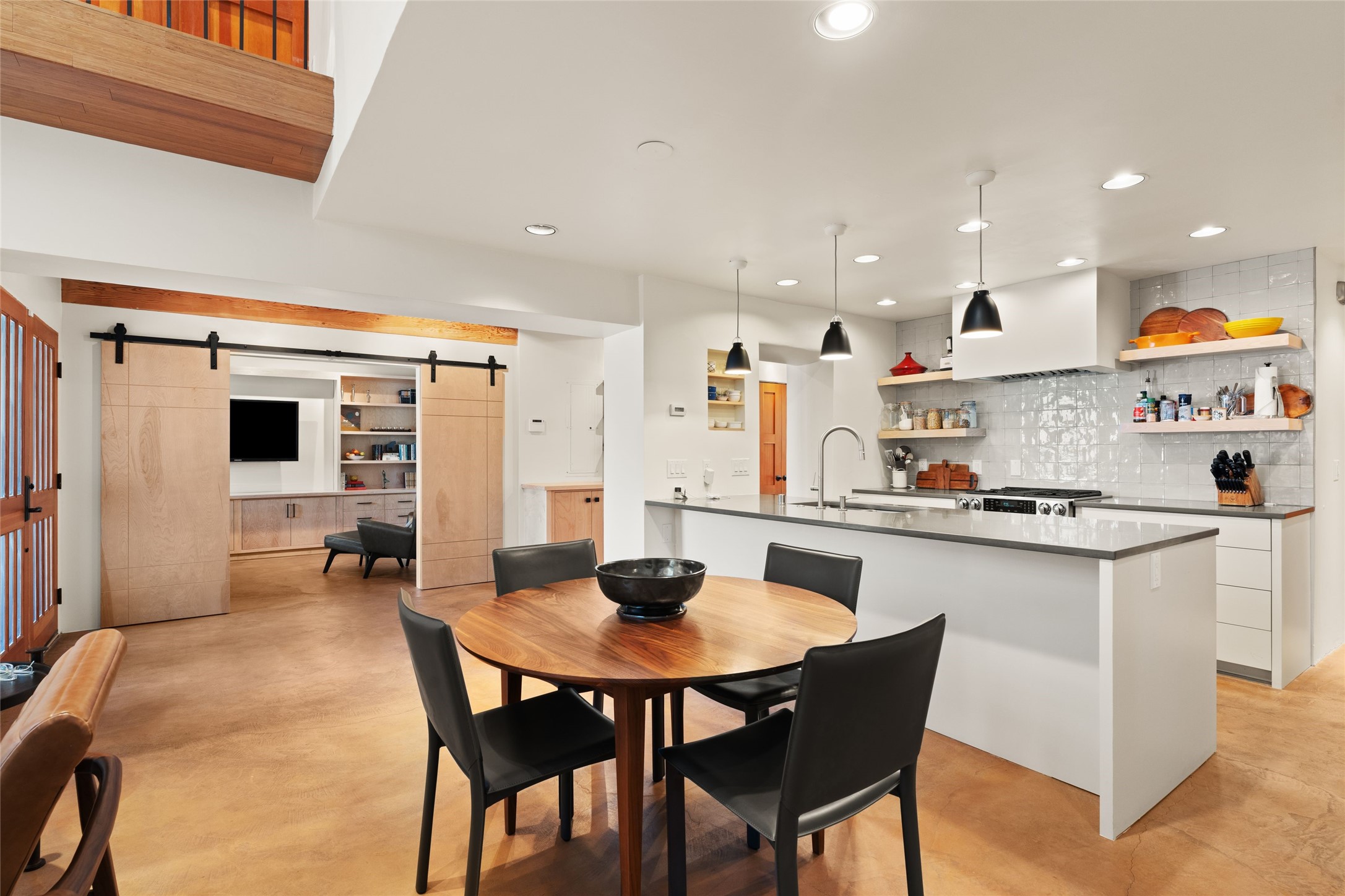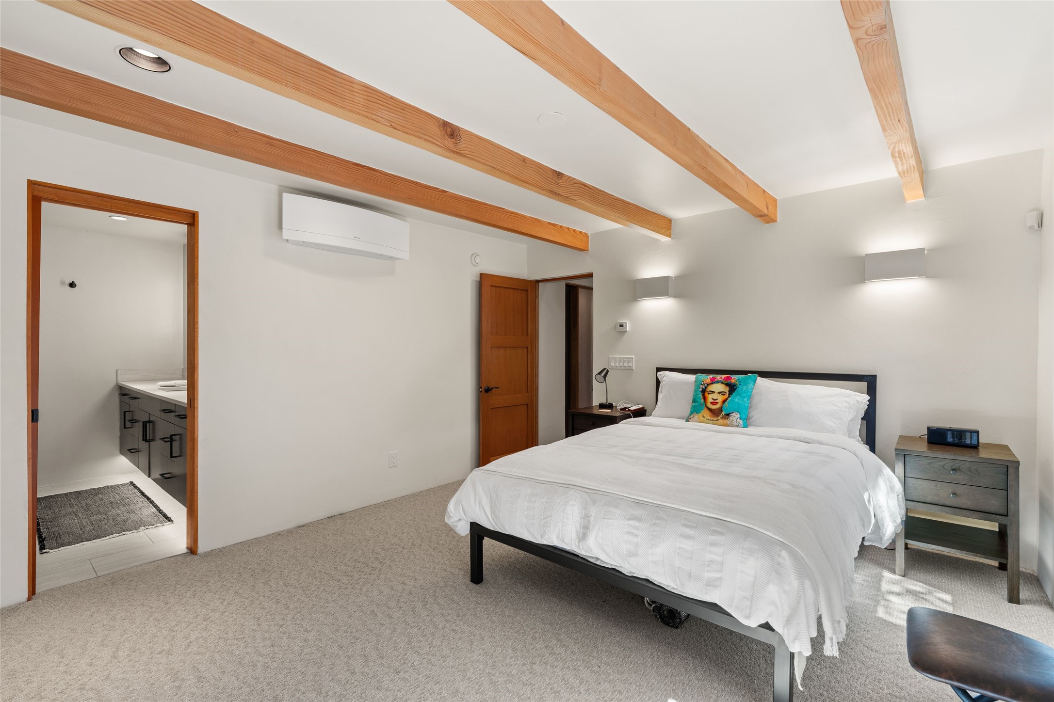 Have you been dreaming of a roof top garden deck where you can live alfresco with full kitchen (including dishwasher!), cozy gas fire pit and a sleeping spot under the stars? With views of sunrise over the Sangres, and sunsets behind the Jemez, and just three blocks from the Plaza, this is the icing on the cake of this cool soft contemporary 2 bedroom, 2,023 square foot condo. With two bedroom suites (one with a steam shower), bamboo floors and Ikea closet systems, this multi-level condo has nice bedroom separation and a very private walled patio off one, shaded by an ancient apricot tree. The living room enjoys a soaring 20 foot ceiling with beams, a fireplace, polished concrete floors, and has a wonderful open feel with the kitchen and dining areas. The kitchen has Cambria quartz counters, stainless appliances and great storage. All this, while being a handy run up to the ski basin and hiking trails, or a short walk to Ft. Marcy or downtown.