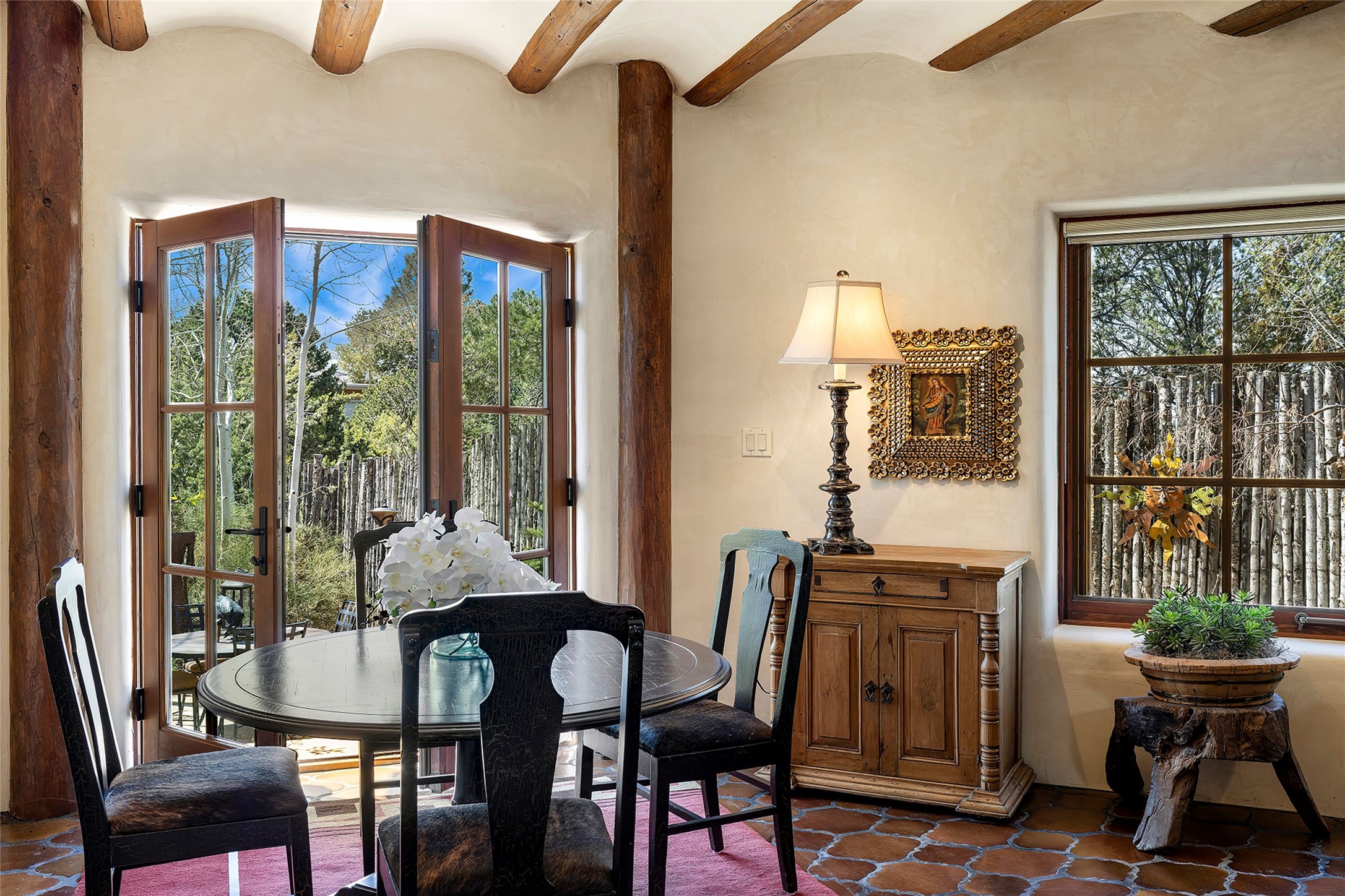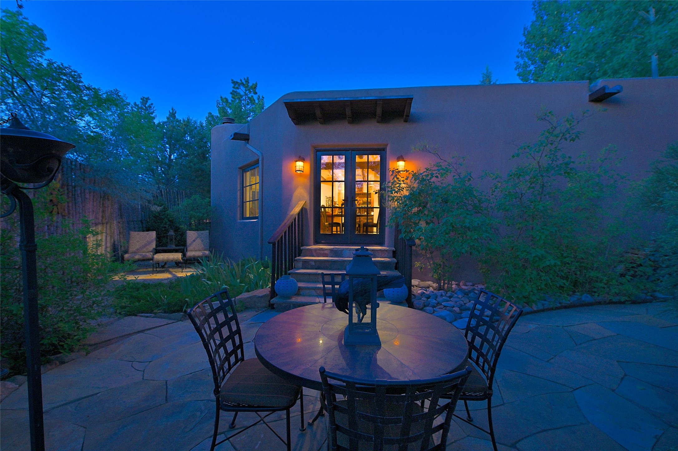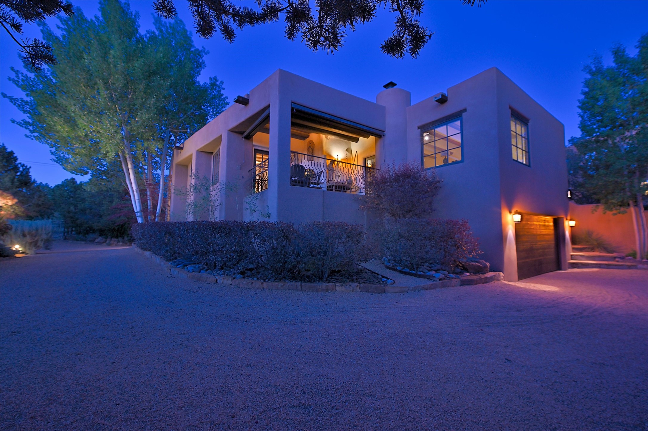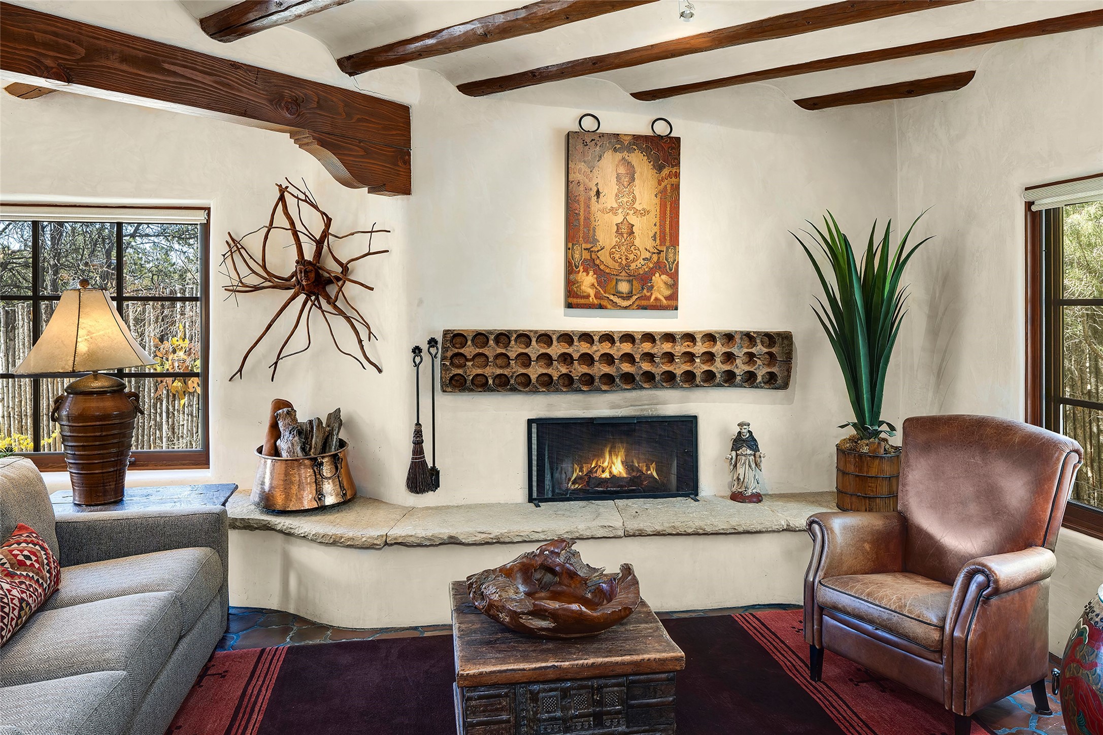 Experience the Santa Fe Dream on Camino del Monte Sol. This exceptional Eastside compound offers the quintessential Santa Fe lifestyle on a desirable, elevated half-acre lot, blocks from the famed Canyon Road. Enter through the electric gate with latillas, meander through the tree grove down the gravel drive and ascend the stone steps, leaving the world behind. Aspens whisper in the breeze above, leading you to a beautifully appointed home boasting a great room with vigas, plaster walls, coved ceilings, abundant natural light, a center piece fireplace and ample room for your art. Culinary enthusiasts will appreciate the island kitchen with custom wood-carved cabinets, Wolf range and Sub-Zero refrigerator, while the open dining room features its own romantic fireplace. Each living space and bedroom in the main house is anchored by a fireplace, creating a warm and inviting ambiance during the cooler months. The great room and primary suite with large awning windows both open to a treetop level covered portal with kiva fireplace. All of these spaces overlook the landscaped grounds with aspens, Japanese red maples, blue spruces, roses, peonies, pinions and junipers. From the house, enjoy breathtaking city lights, Jemez Mountain and sunset views. Beyond the main residence, a charming and private two-bedroom, two-bath casita with the same fine appointments of the main home and private stone patio offers ease of entertaining. Indulge in relaxation and recreation with a freestanding lap pool featuring resistance jets and hot tub. A stacked stone outdoor fireplace and multiple patios are designed for both grand entertaining and intimate moments. Practical features include generous parking for both the main house and casita, a convenient attached two car garage and a fully fenced yard. The property seamlessly blends seclusion with convenience, offering easy access to Santa Fe's renowned shopping, dining, entertainment and hiking trails, within the heart of the Historic Eastside.