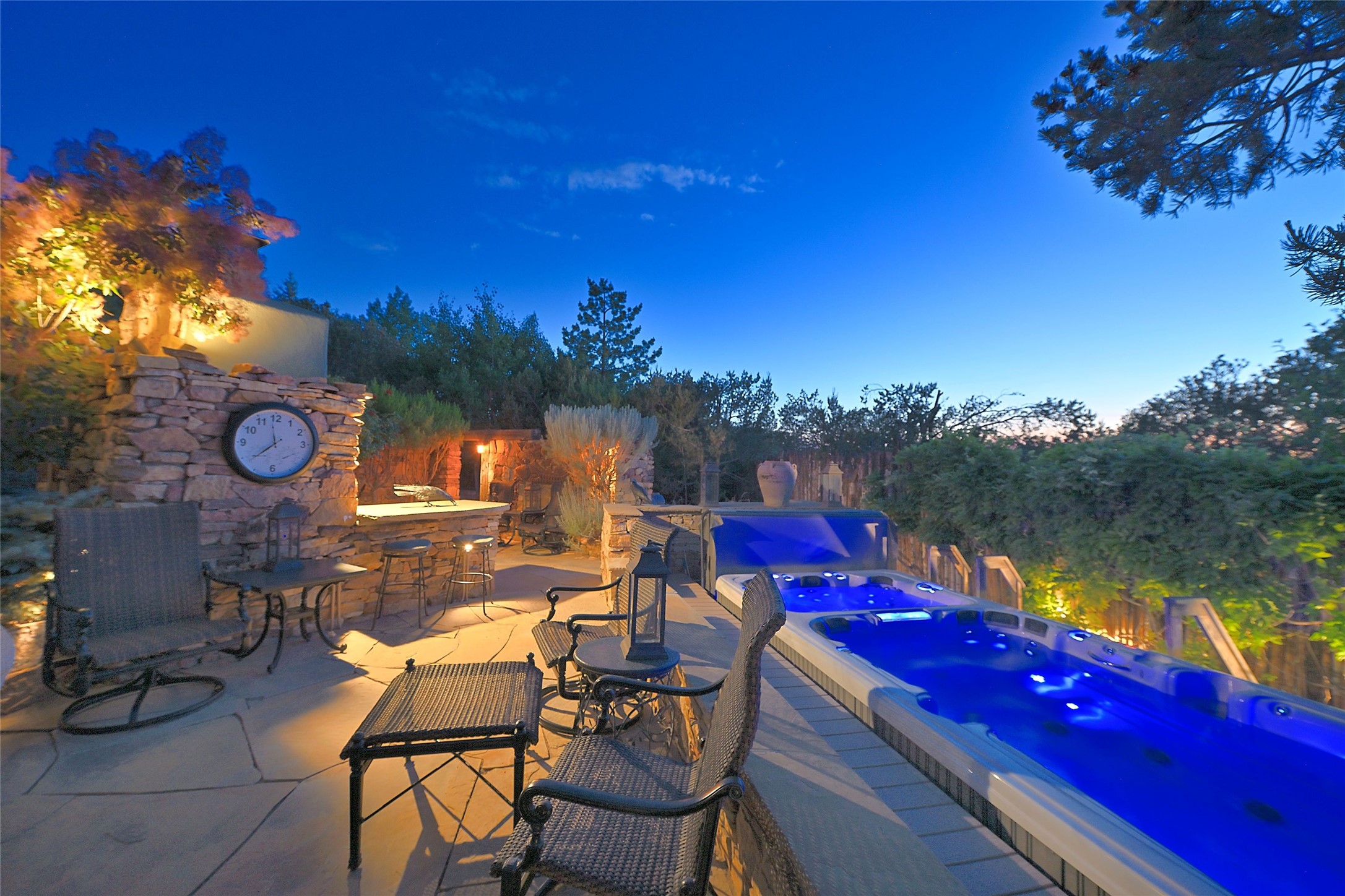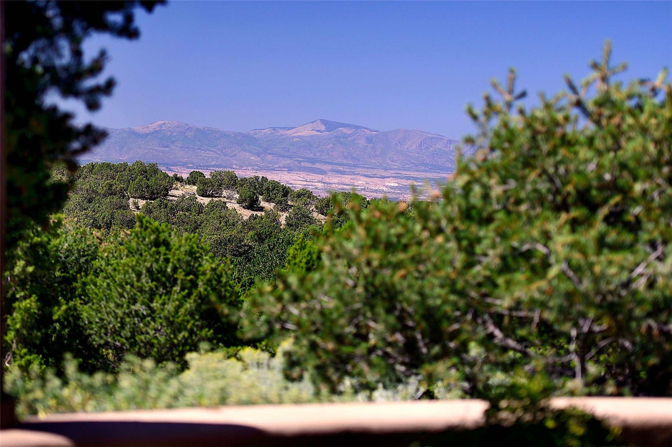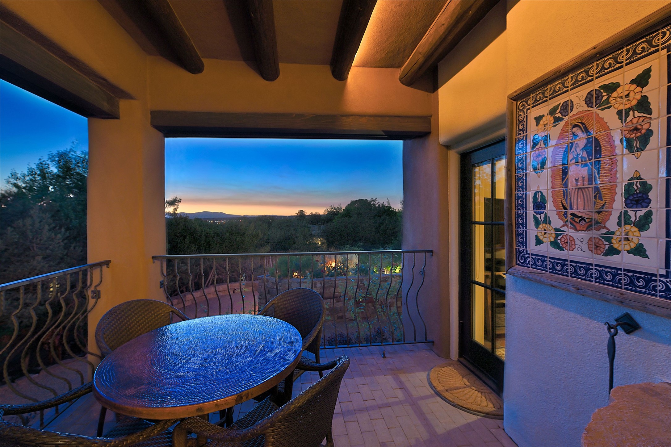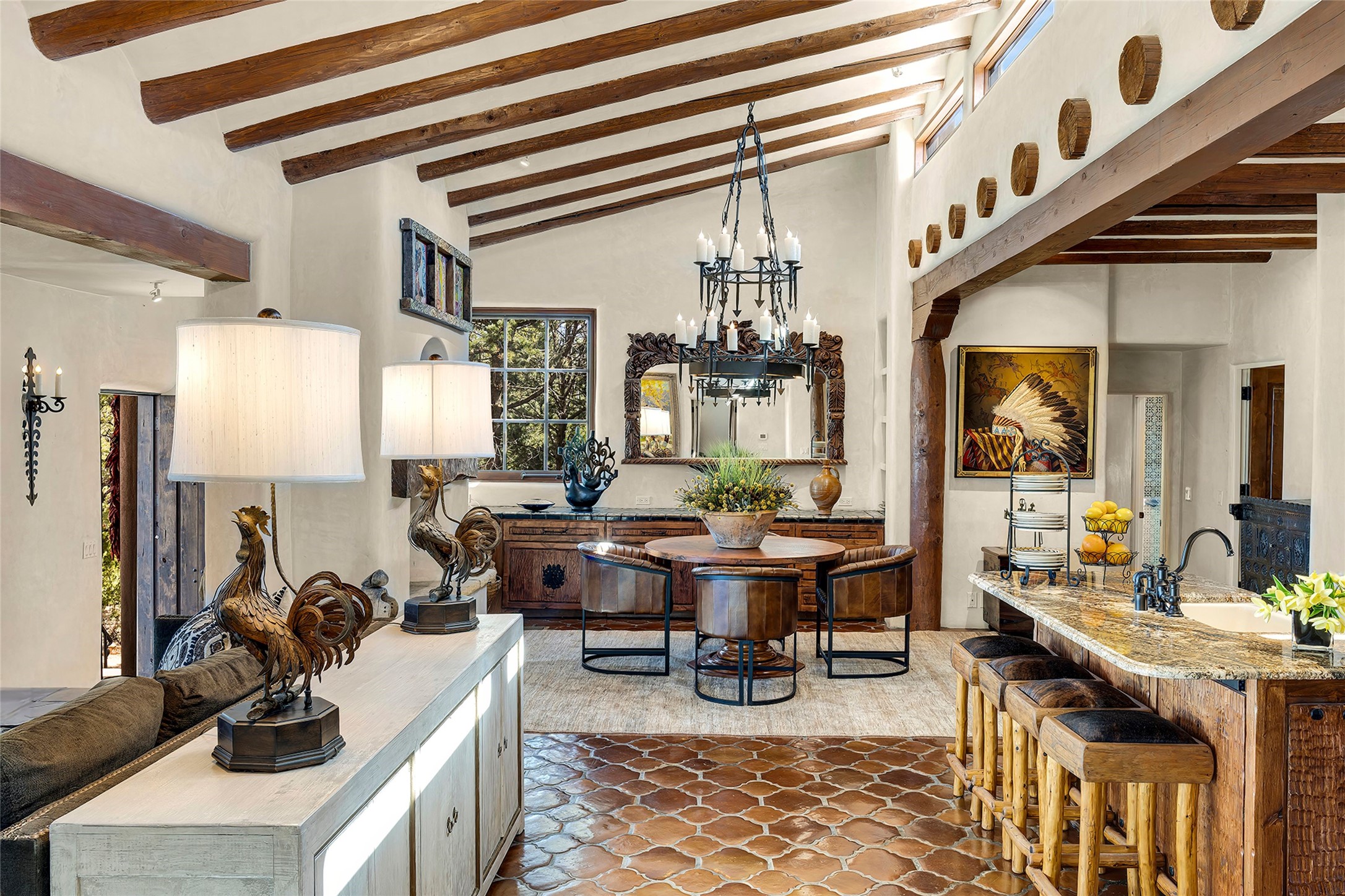 Experience the Santa Fe Dream on Camino del Monte Sol. This exceptional Eastside compound offers the quintessential Santa Fe lifestyle on a desirable, elevated half-acre lot, blocks from the famed Canyon Road. Enter through the electric gate with latillas, meander through the tree grove down the gravel drive and ascend the stone steps, leaving the world behind. Aspens whisper in the breeze above, leading you to a beautifully appointed home boasting a great room with vigas, plaster walls, coved ceilings, abundant natural light, a center piece fireplace and ample room for your art. Culinary enthusiasts will appreciate the island kitchen with custom wood-carved cabinets, Wolf range and Sub-Zero refrigerator, while the open dining room features its own romantic fireplace. Each living space and bedroom in the main house is anchored by a fireplace, creating a warm and inviting ambiance during the cooler months. The great room and primary suite with large awning windows both open to a treetop level covered portal with kiva fireplace. All of these spaces overlook the landscaped grounds with aspens, Japanese red maples, blue spruces, roses, peonies, pinions and junipers. From the house, enjoy breathtaking city lights, Jemez Mountain and sunset views. Beyond the main residence, a charming and private two-bedroom, two-bath casita with the same fine appointments of the main home and private stone patio offers ease of entertaining. Indulge in relaxation and recreation with a freestanding lap pool featuring resistance jets and hot tub. A stacked stone outdoor fireplace and multiple patios are designed for both grand entertaining and intimate moments. Practical features include generous parking for both the main house and casita, a convenient attached two car garage and a fully fenced yard. The property seamlessly blends seclusion with convenience, offering easy access to Santa Fe's renowned shopping, dining, entertainment and hiking trails, within the heart of the Historic Eastside.