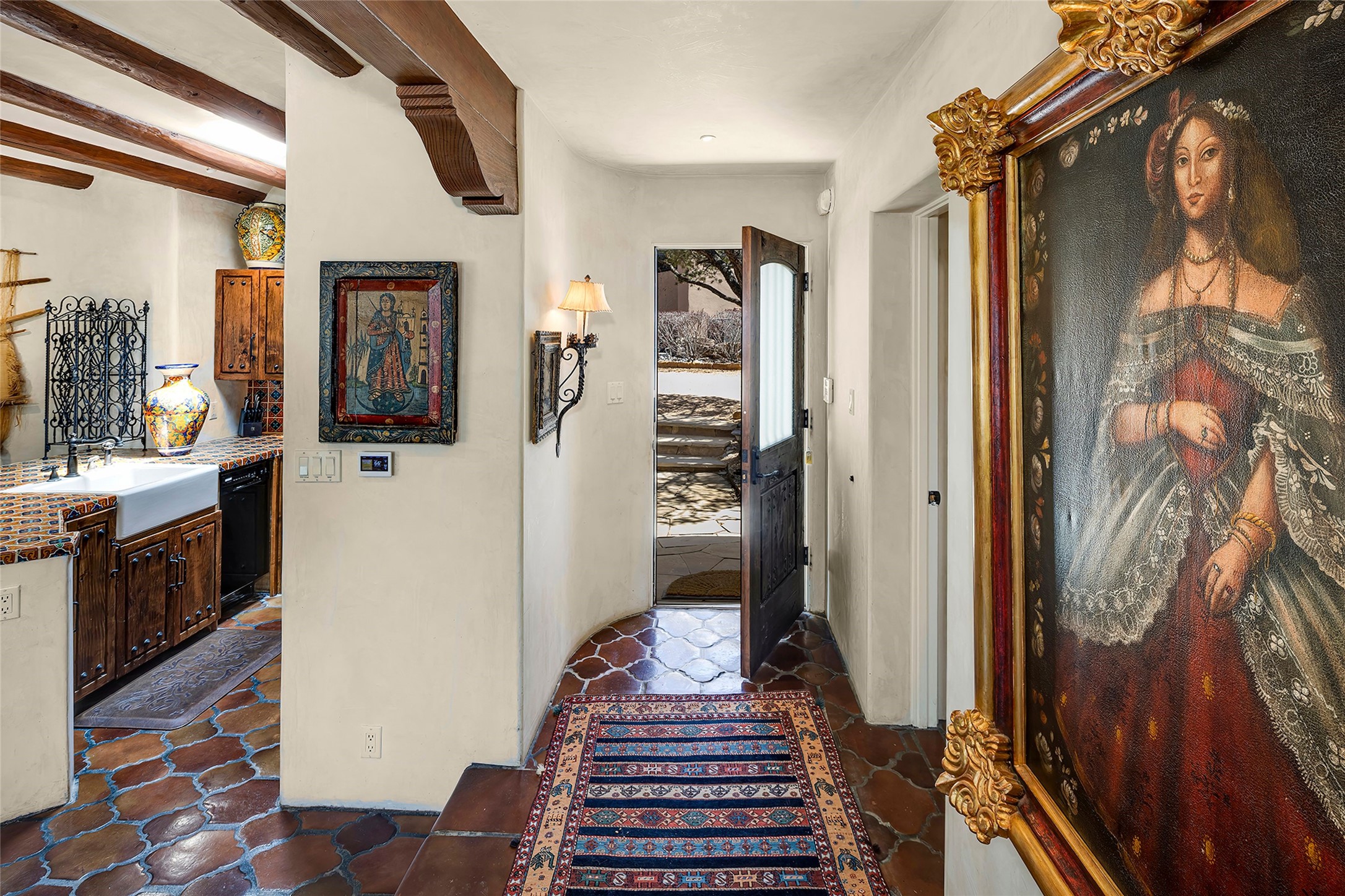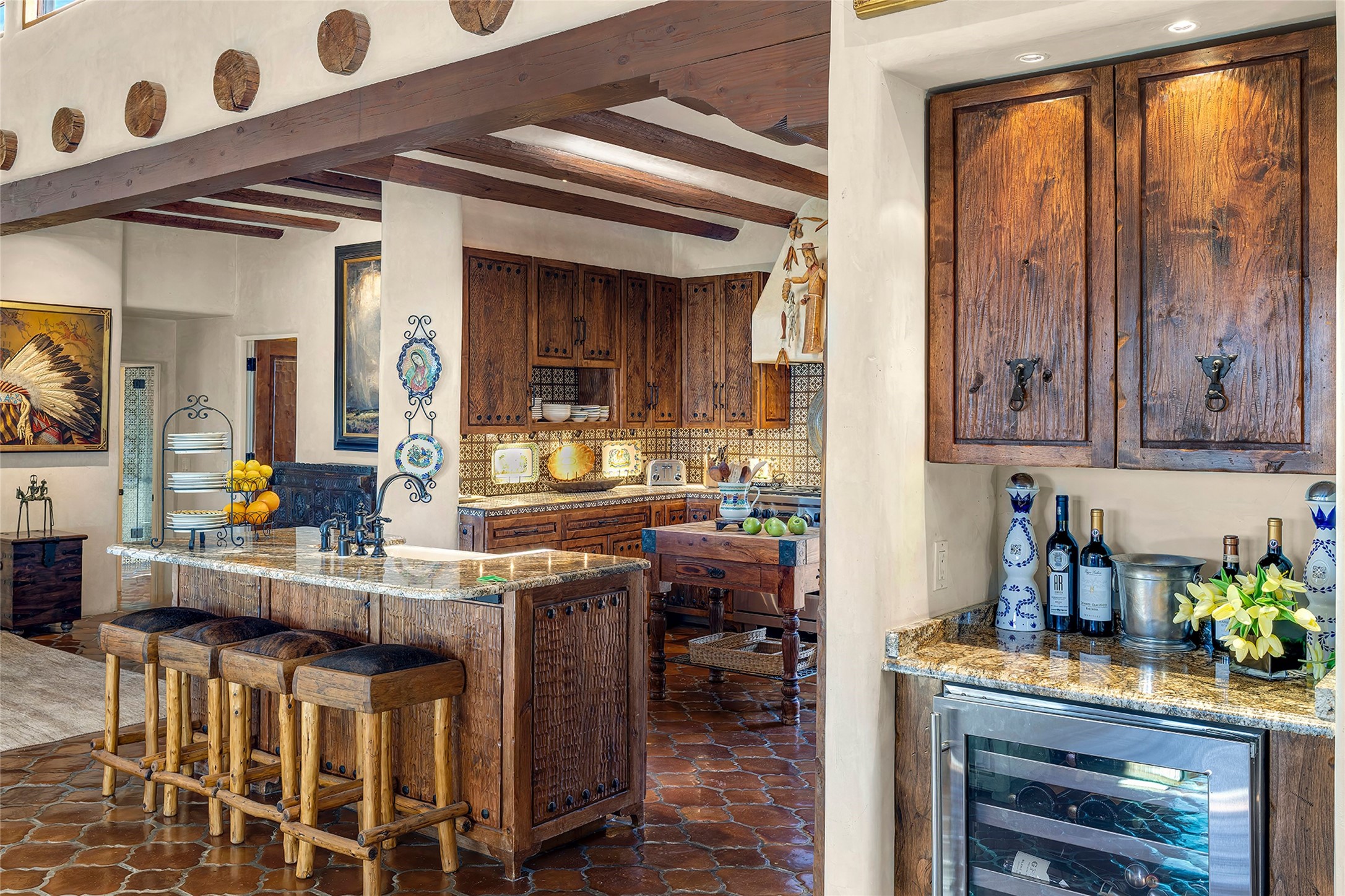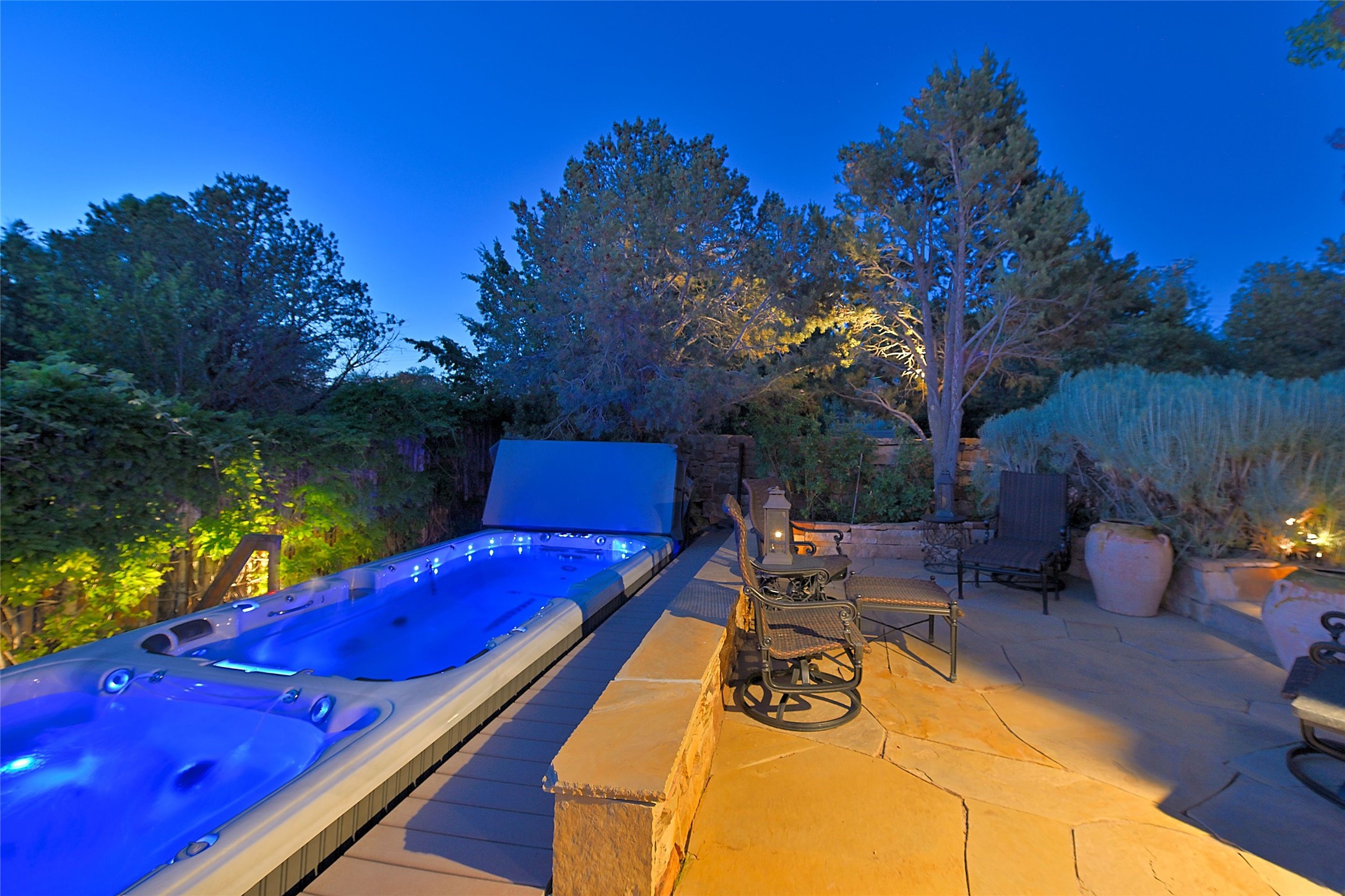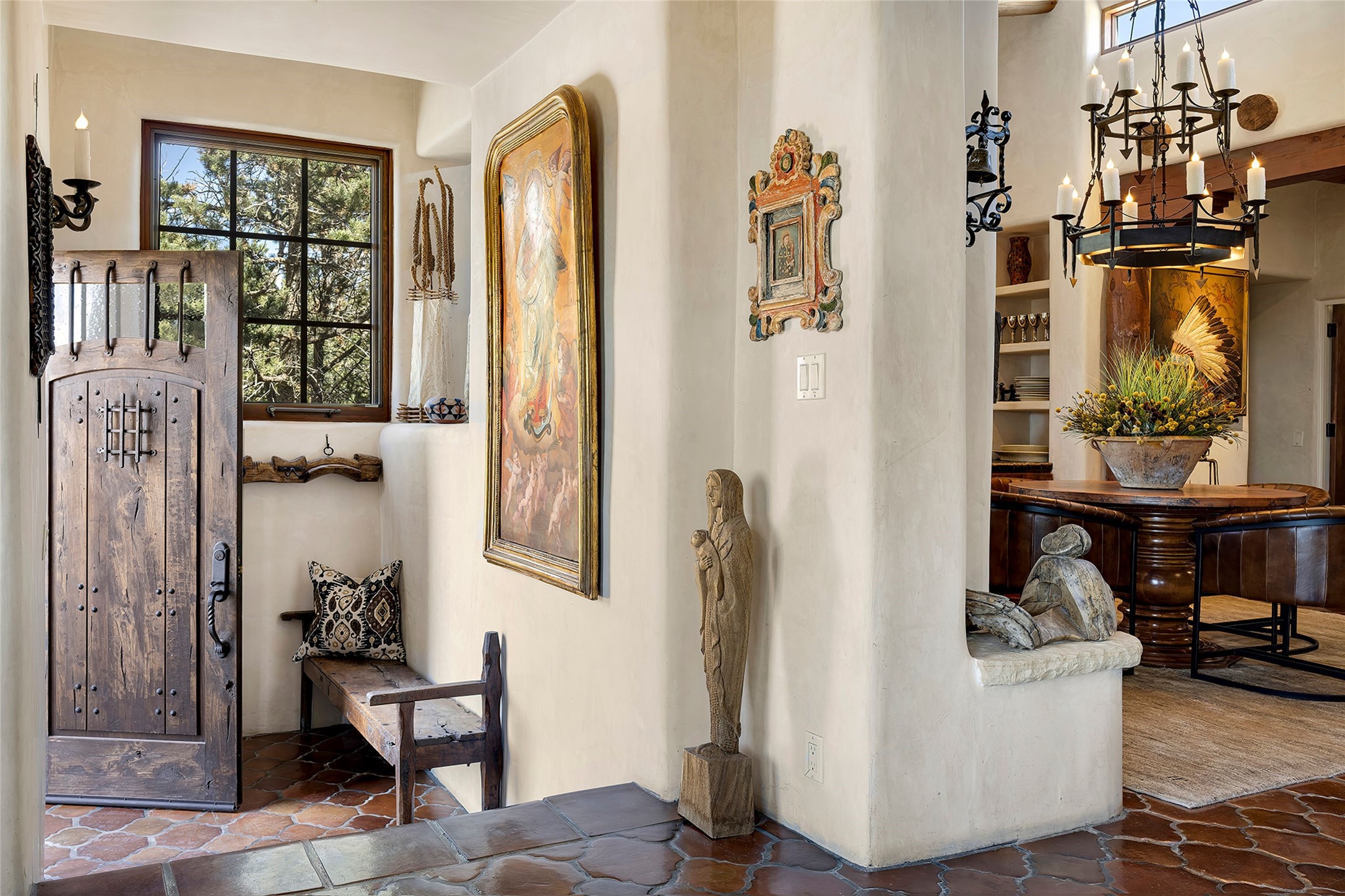 Experience the Santa Fe Dream on Camino del Monte Sol. This exceptional Eastside compound offers the quintessential Santa Fe lifestyle on a desirable, elevated half-acre lot, blocks from the famed Canyon Road. Enter through the electric gate with latillas, meander through the tree grove down the gravel drive and ascend the stone steps, leaving the world behind. Aspens whisper in the breeze above, leading you to a beautifully appointed home boasting a great room with vigas, plaster walls, coved ceilings, abundant natural light, a center piece fireplace and ample room for your art. Culinary enthusiasts will appreciate the island kitchen with custom wood-carved cabinets, Wolf range and Sub-Zero refrigerator, while the open dining room features its own romantic fireplace. Each living space and bedroom in the main house is anchored by a fireplace, creating a warm and inviting ambiance during the cooler months. The great room and primary suite with large awning windows both open to a treetop level covered portal with kiva fireplace. All of these spaces overlook the landscaped grounds with aspens, Japanese red maples, blue spruces, roses, peonies, pinions and junipers. From the house, enjoy breathtaking city lights, Jemez Mountain and sunset views. Beyond the main residence, a charming and private two-bedroom, two-bath casita with the same fine appointments of the main home and private stone patio offers ease of entertaining. Indulge in relaxation and recreation with a freestanding lap pool featuring resistance jets and hot tub. A stacked stone outdoor fireplace and multiple patios are designed for both grand entertaining and intimate moments. Practical features include generous parking for both the main house and casita, a convenient attached two car garage and a fully fenced yard. The property seamlessly blends seclusion with convenience, offering easy access to Santa Fe's renowned shopping, dining, entertainment and hiking trails, within the heart of the Historic Eastside.
