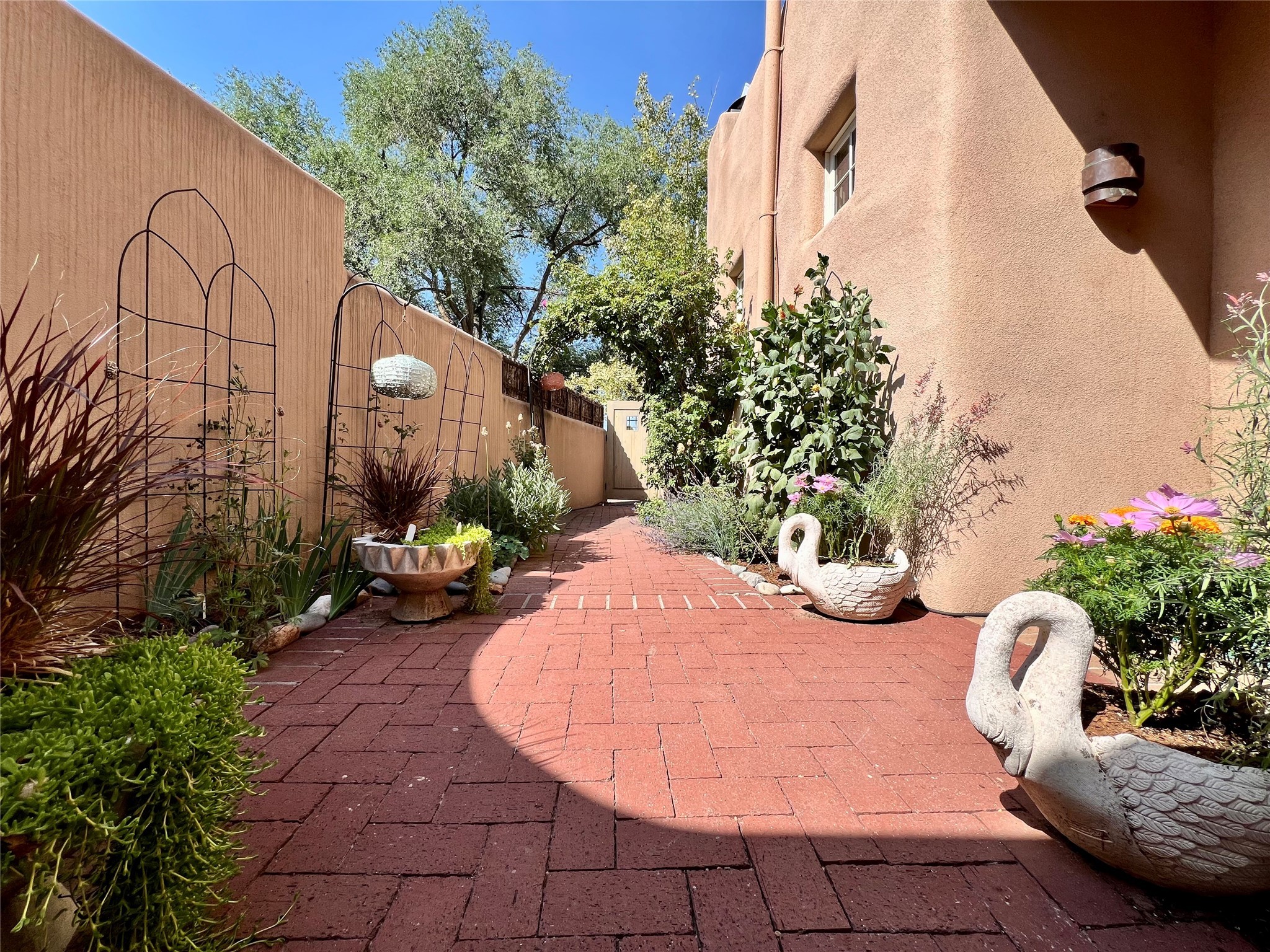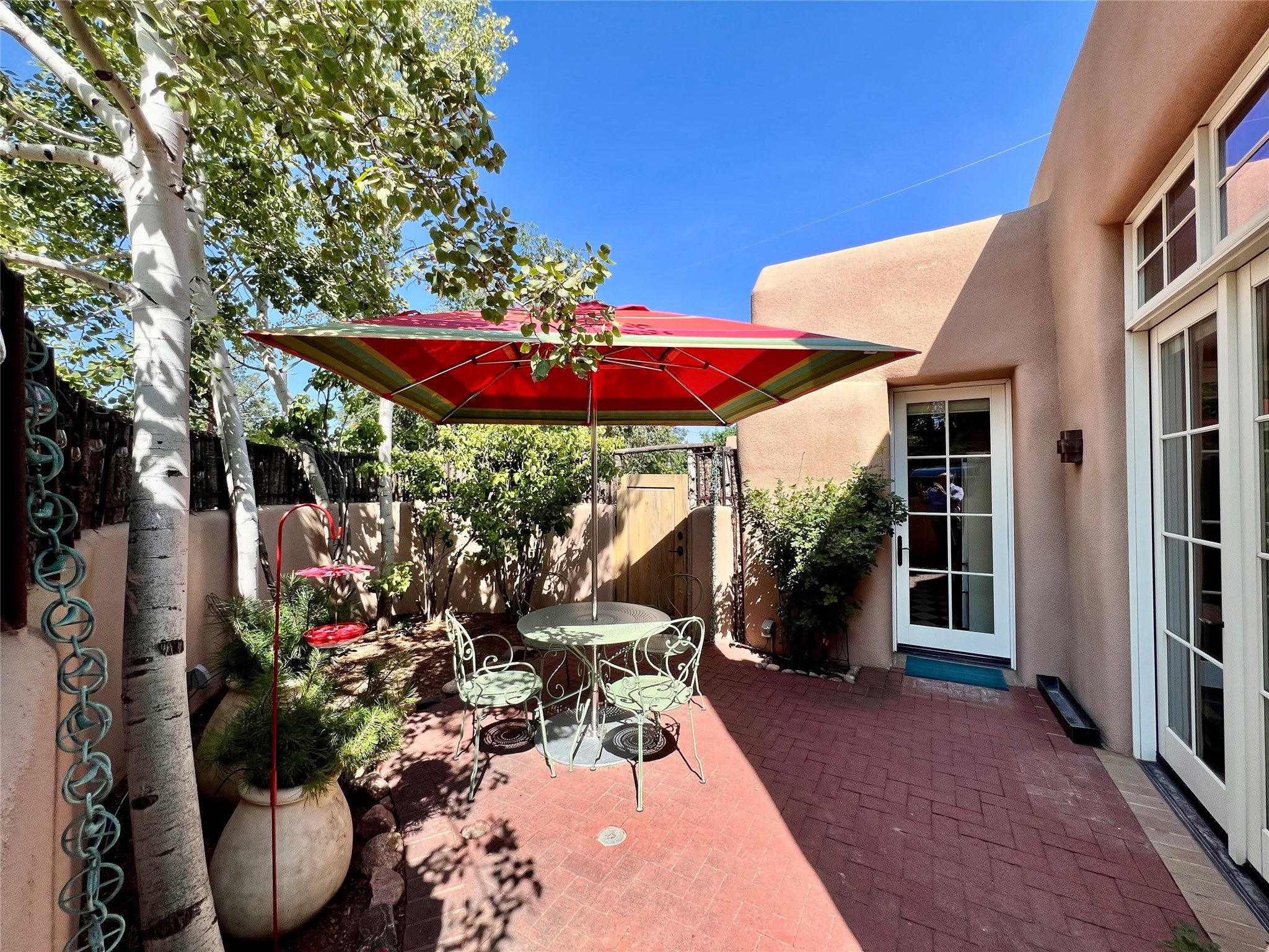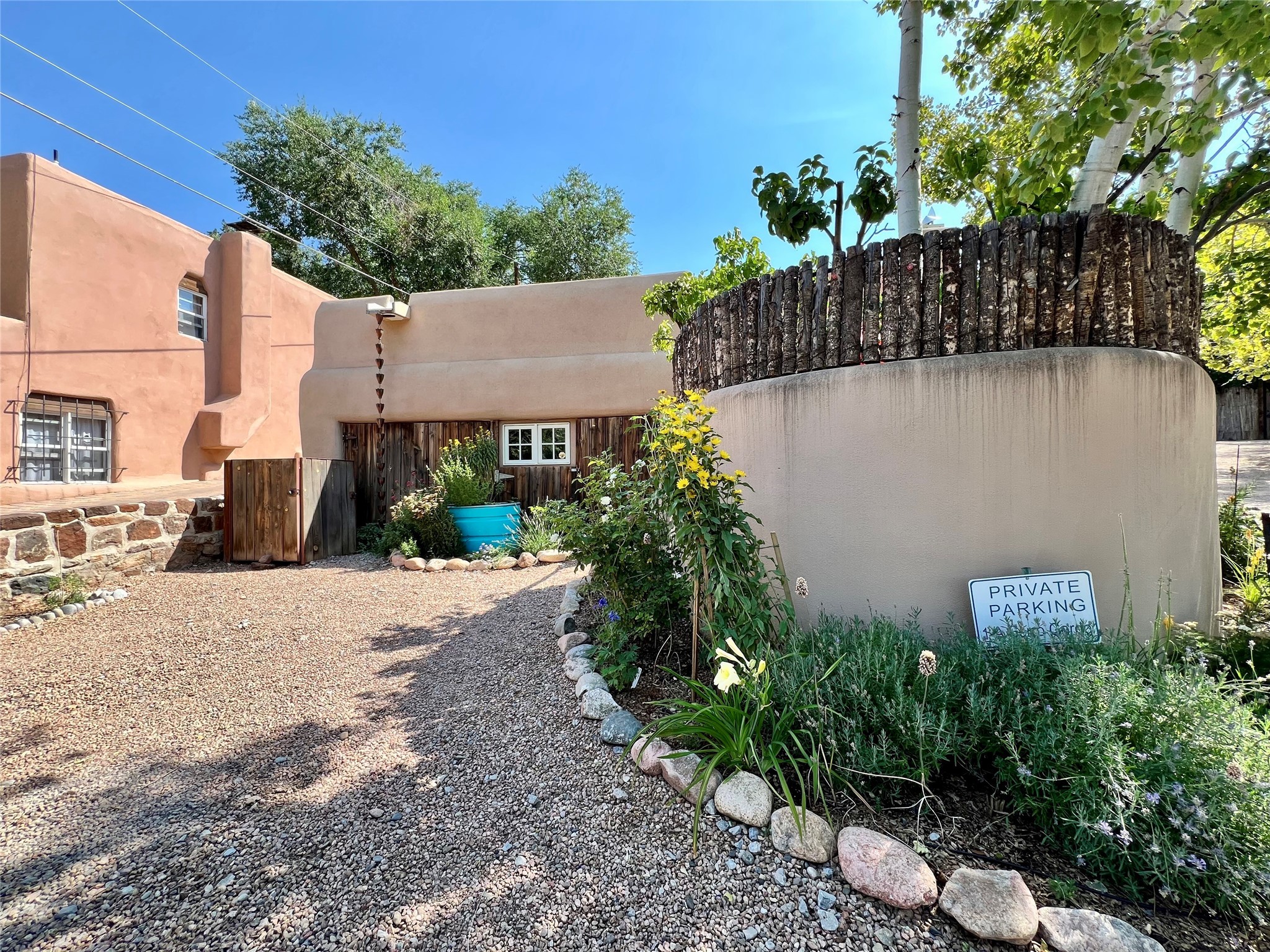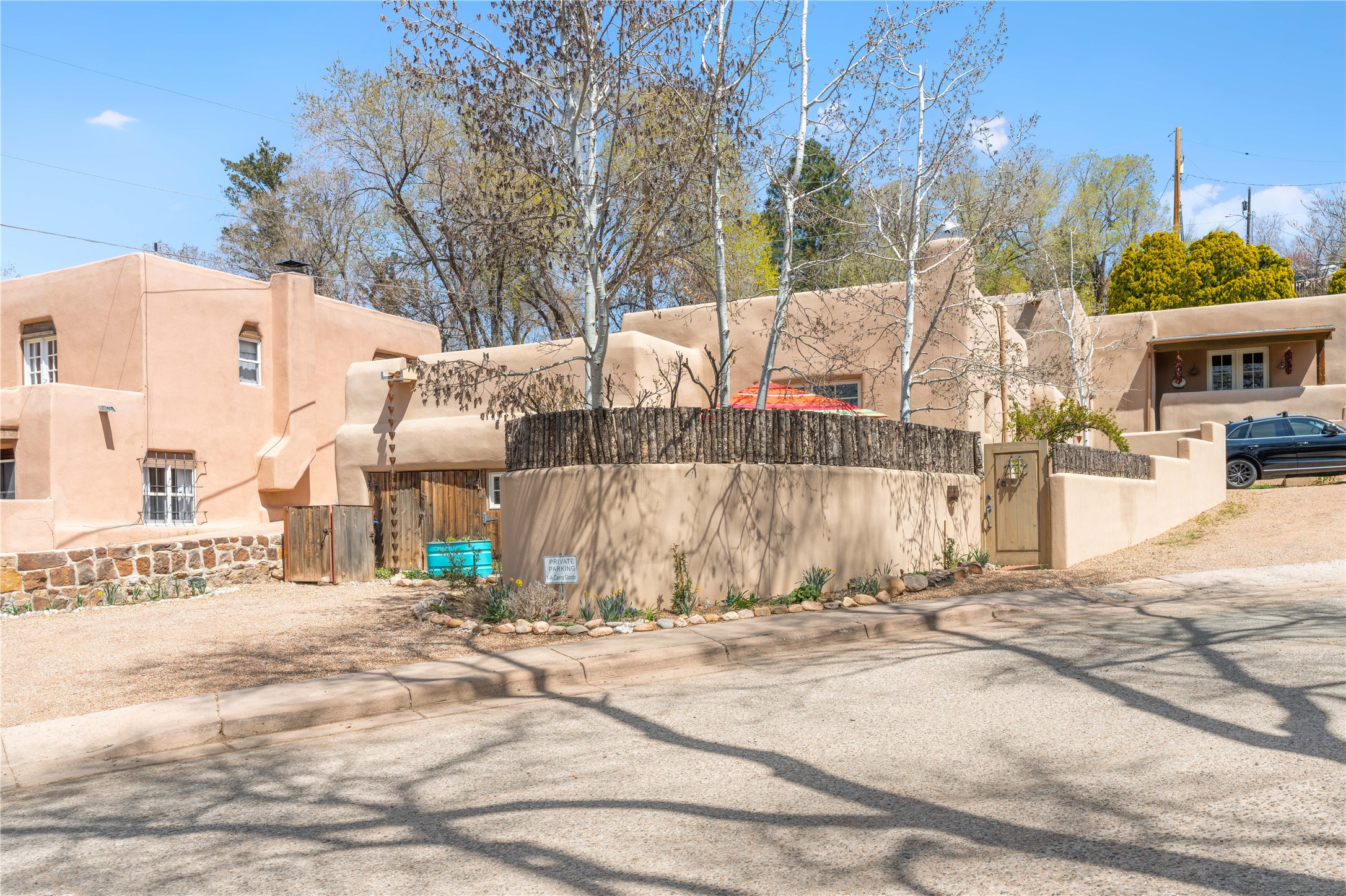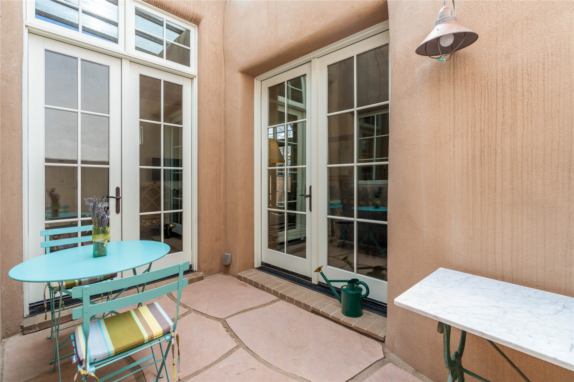 This historic Eastside home offers 1,322+/- Sq. Ft. of elegant living space, blending timeless Santa Fe charm with modern comfort. Designed by architect Michael Mahaffey and built in 2006 on the grounds of the 1926 Sheldon Parsons artist compound, it features a brand new roof, taupe-stone brick floors, tall alder wood doors, 2 wood-burning kiva fireplaces, skylights, and several glass French doors including one opening to a beautifully landscaped front patio. The interior walls are hand-plastered, adding warmth and texture to the space. Both the living area and bedroom boast high ceilings with wood beams, enhancing the open feel. The spacious bedroom suite offers a luxurious full bath and generous closet space. The kitchen flows into an open-concept living and dining area, perfect for relaxed living and entertaining. The front patio, framed by aspen, lilacs, and flower beds, offers privacy with wood gates and a walled perimeter, ideal for morning coffee or an evening meal. The low-maintenance landscaping has a drip irrigation system fed by a shared well. The back patio has an indoor-outdoor ambiance, reminiscent of a European pied--terre, offering serene architectural details and dappled light. This home is perfect for full-time living or as a "lock and leave" retreat. With its newly installed roof providing years of worry-free protection, and priced $302,000 below a recent appraisal (3/25), this property presents an exceptional value and an amazing opportunity to own a beautiful home in a highly sought-after location, just steps from the Santa Fe River Trail, Canyon Road, and a short stroll to the Plaza.