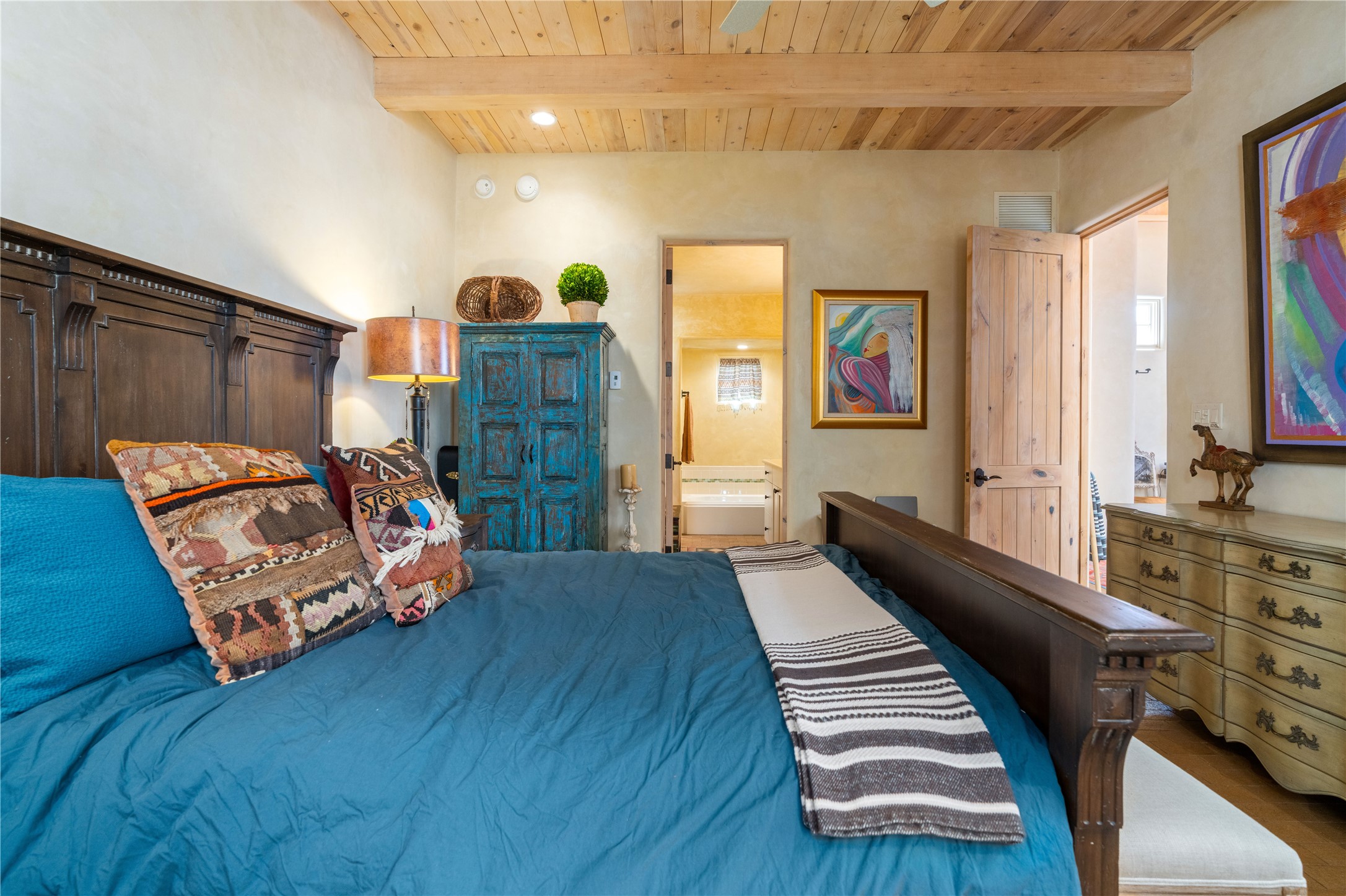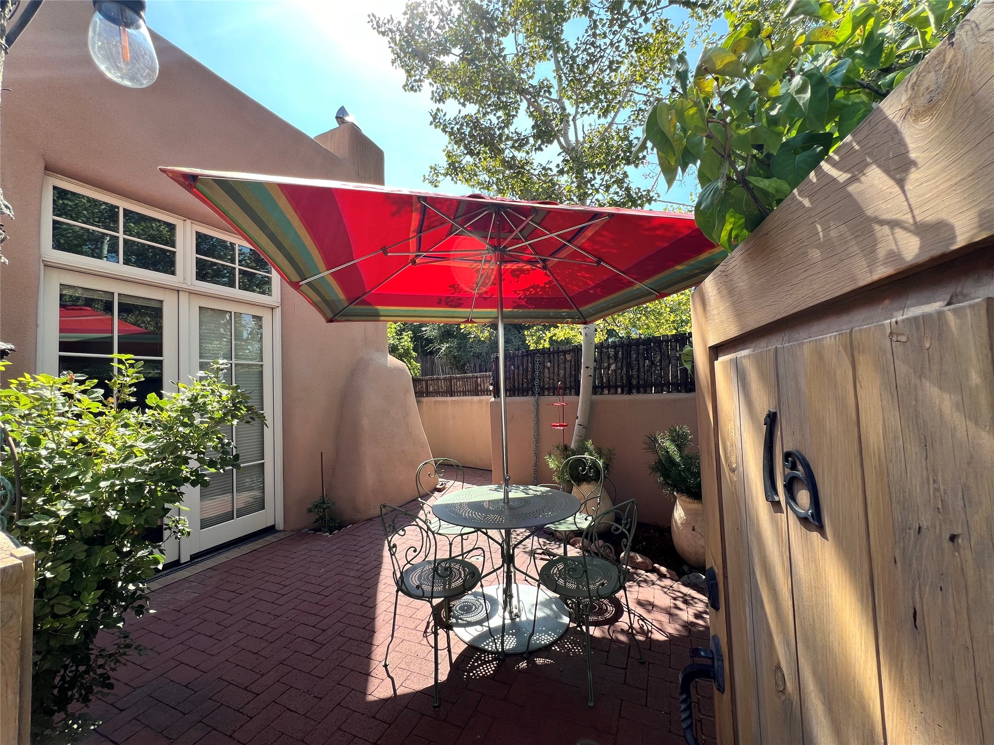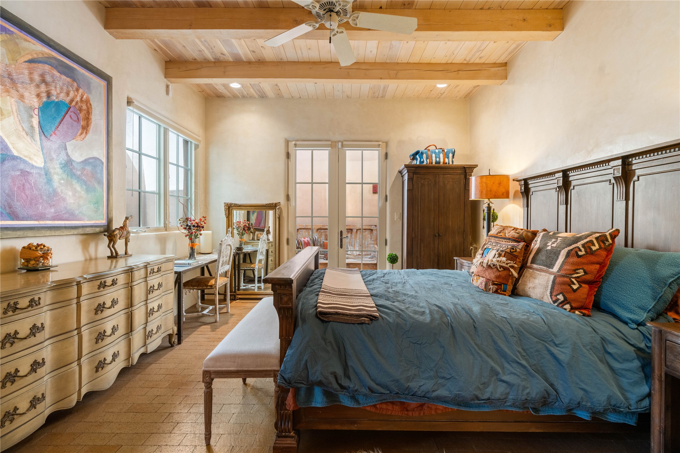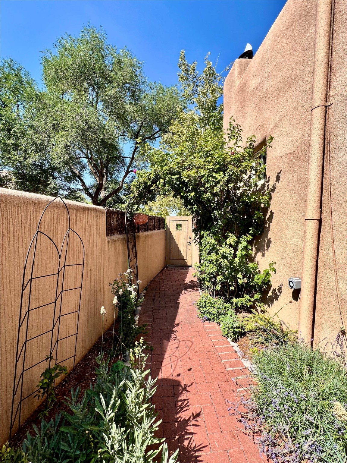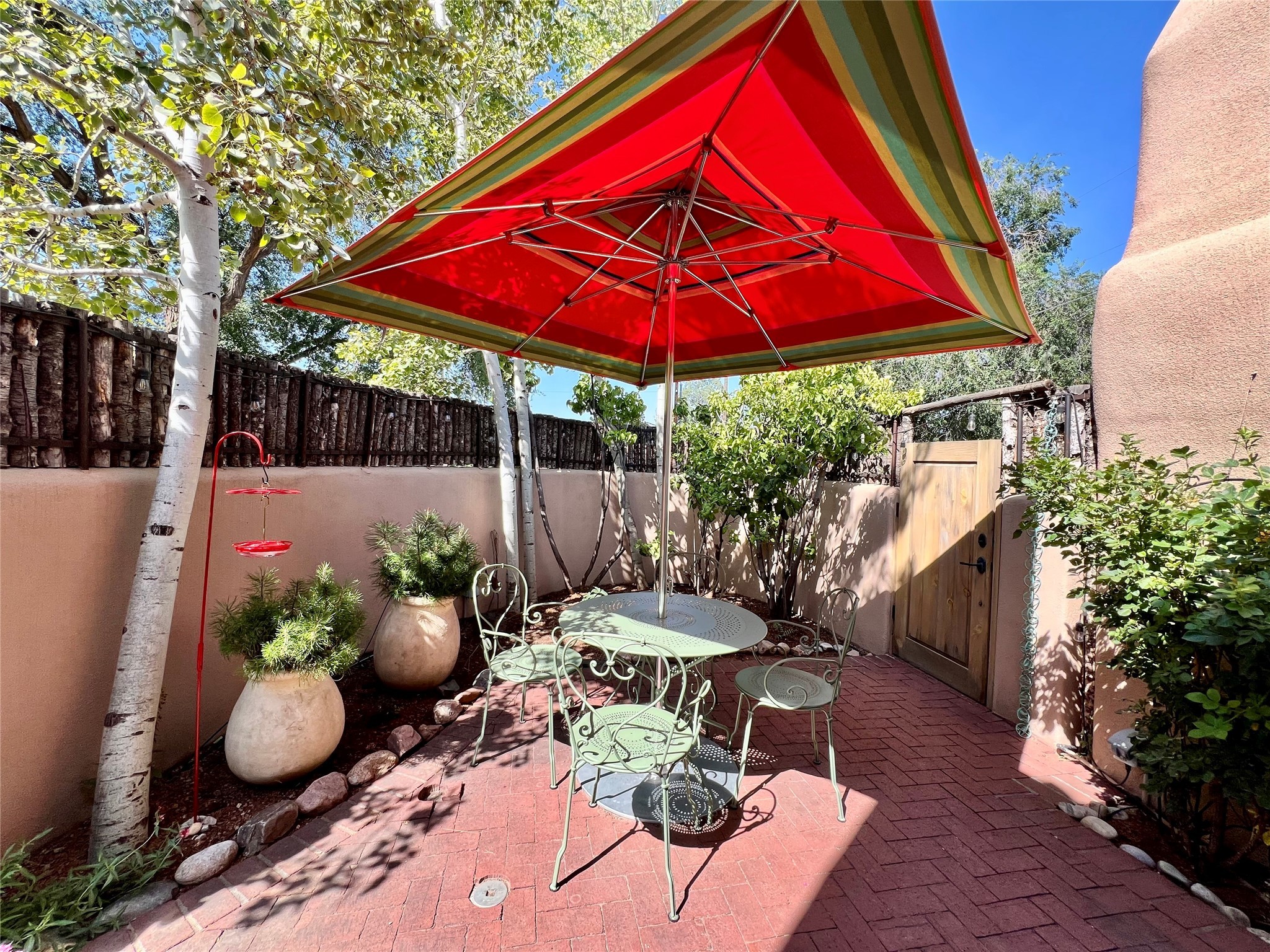 This historic Eastside home offers 1,322+/- Sq. Ft. of elegant living space, blending timeless Santa Fe charm with modern comfort. Designed by architect Michael Mahaffey and built in 2006 on the grounds of the 1926 Sheldon Parsons artist compound, it features a brand new roof, taupe-stone brick floors, tall alder wood doors, 2 wood-burning kiva fireplaces, skylights, and several glass French doors including one opening to a beautifully landscaped front patio. The interior walls are hand-plastered, adding warmth and texture to the space. Both the living area and bedroom boast high ceilings with wood beams, enhancing the open feel. The spacious bedroom suite offers a luxurious full bath and generous closet space. The kitchen flows into an open-concept living and dining area, perfect for relaxed living and entertaining. The front patio, framed by aspen, lilacs, and flower beds, offers privacy with wood gates and a walled perimeter, ideal for morning coffee or an evening meal. The low-maintenance landscaping has a drip irrigation system fed by a shared well. The back patio has an indoor-outdoor ambiance, reminiscent of a European pied--terre, offering serene architectural details and dappled light. This home is perfect for full-time living or as a "lock and leave" retreat. With its newly installed roof providing years of worry-free protection, and priced $302,000 below a recent appraisal (3/25), this property presents an exceptional value and an amazing opportunity to own a beautiful home in a highly sought-after location, just steps from the Santa Fe River Trail, Canyon Road, and a short stroll to the Plaza.