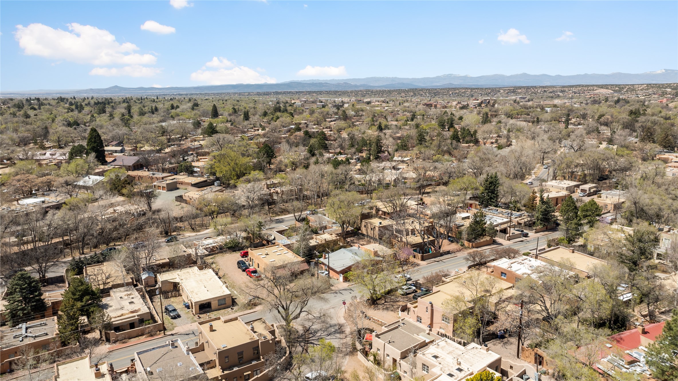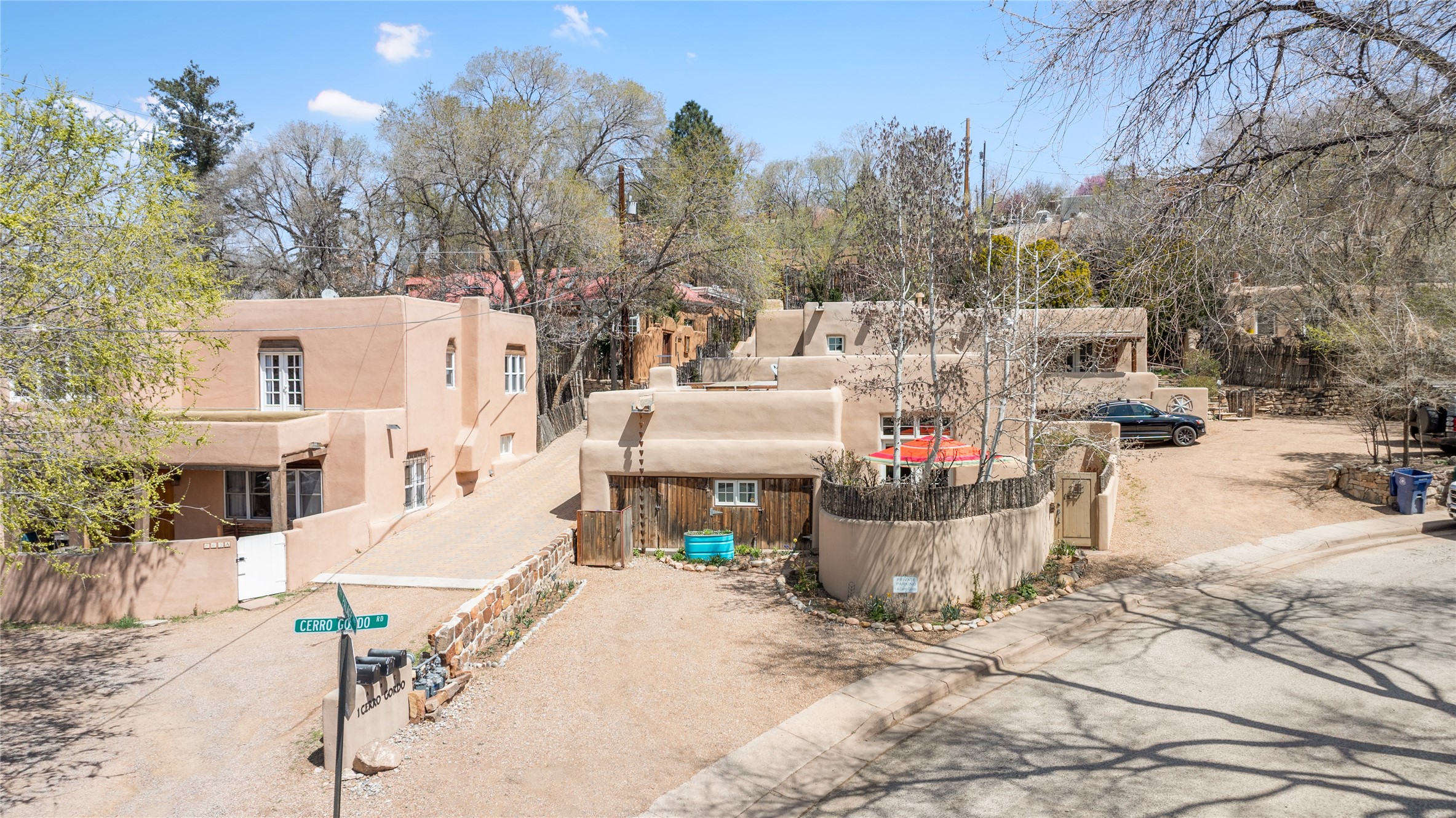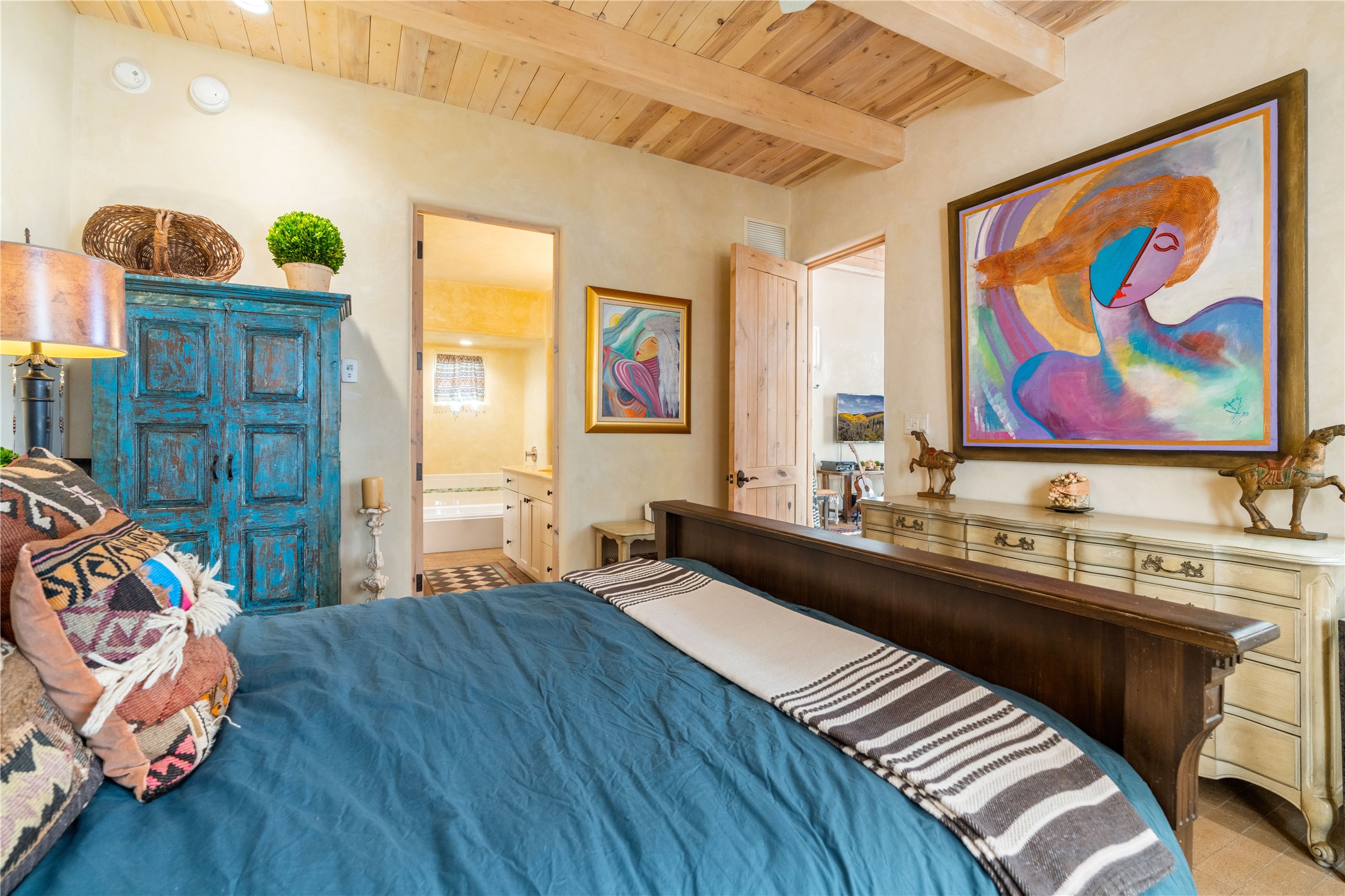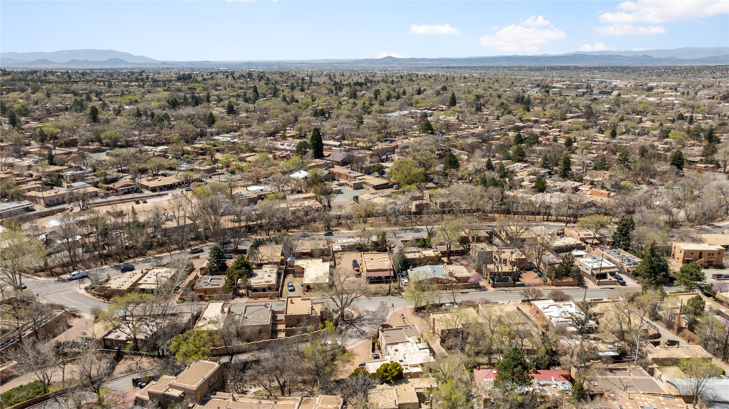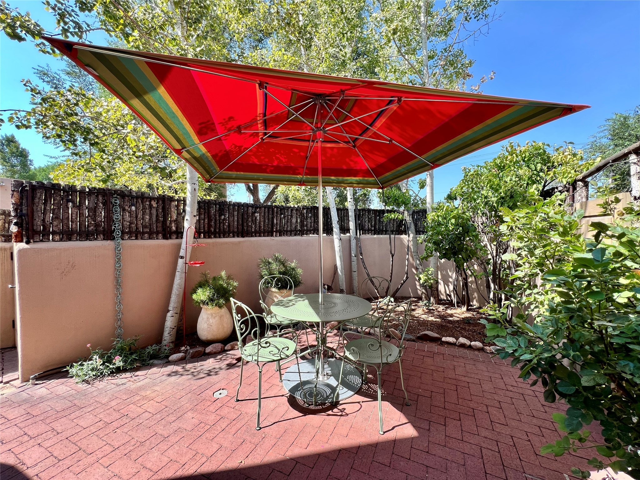 This historic Eastside home offers 1,322+/- Sq. Ft. of elegant living space, blending timeless Santa Fe charm with modern comfort. Designed by architect Michael Mahaffey and built in 2006 on the grounds of the 1926 Sheldon Parsons artist compound, it features a brand new roof, taupe-stone brick floors, tall alder wood doors, 2 wood-burning kiva fireplaces, skylights, and several glass French doors including one opening to a beautifully landscaped front patio. The interior walls are hand-plastered, adding warmth and texture to the space. Both the living area and bedroom boast high ceilings with wood beams, enhancing the open feel. The spacious bedroom suite offers a luxurious full bath and generous closet space. The kitchen flows into an open-concept living and dining area, perfect for relaxed living and entertaining. The front patio, framed by aspen, lilacs, and flower beds, offers privacy with wood gates and a walled perimeter, ideal for morning coffee or an evening meal. The low-maintenance landscaping has a drip irrigation system fed by a shared well. The back patio has an indoor-outdoor ambiance, reminiscent of a European pied--terre, offering serene architectural details and dappled light. This home is perfect for full-time living or as a "lock and leave" retreat. With its newly installed roof providing years of worry-free protection, and priced $302,000 below a recent appraisal (3/25), this property presents an exceptional value and an amazing opportunity to own a beautiful home in a highly sought-after location, just steps from the Santa Fe River Trail, Canyon Road, and a short stroll to the Plaza.