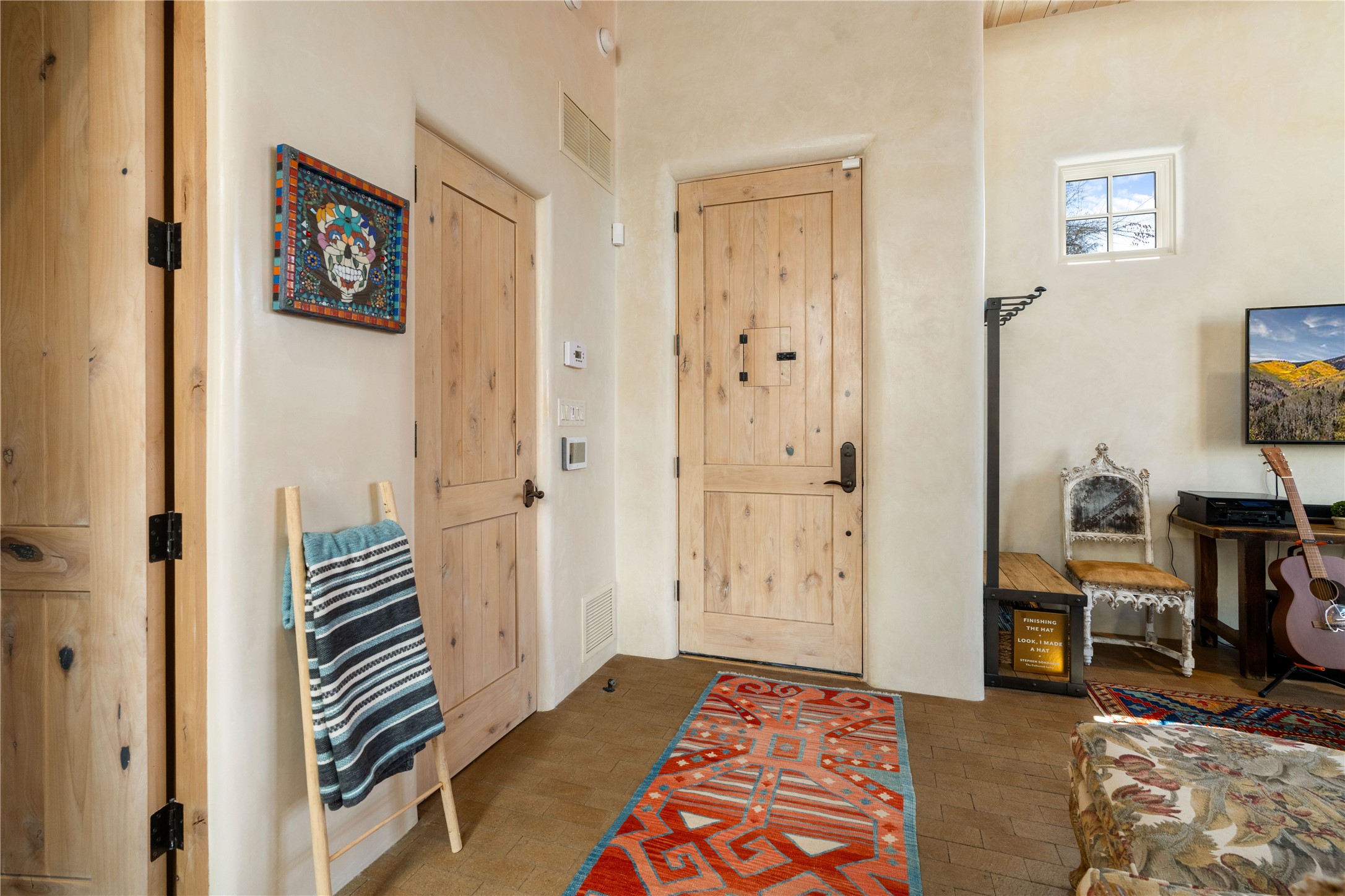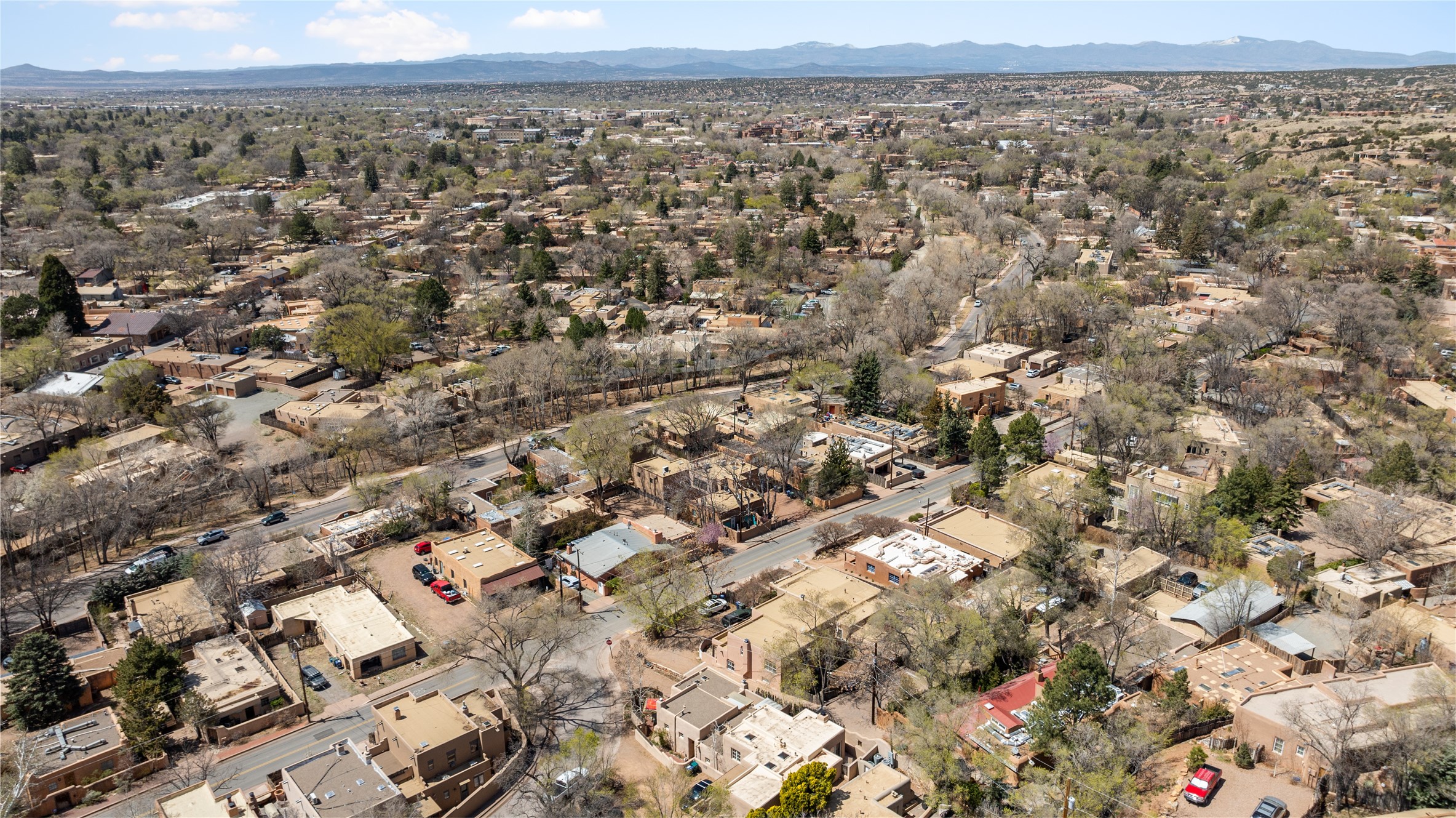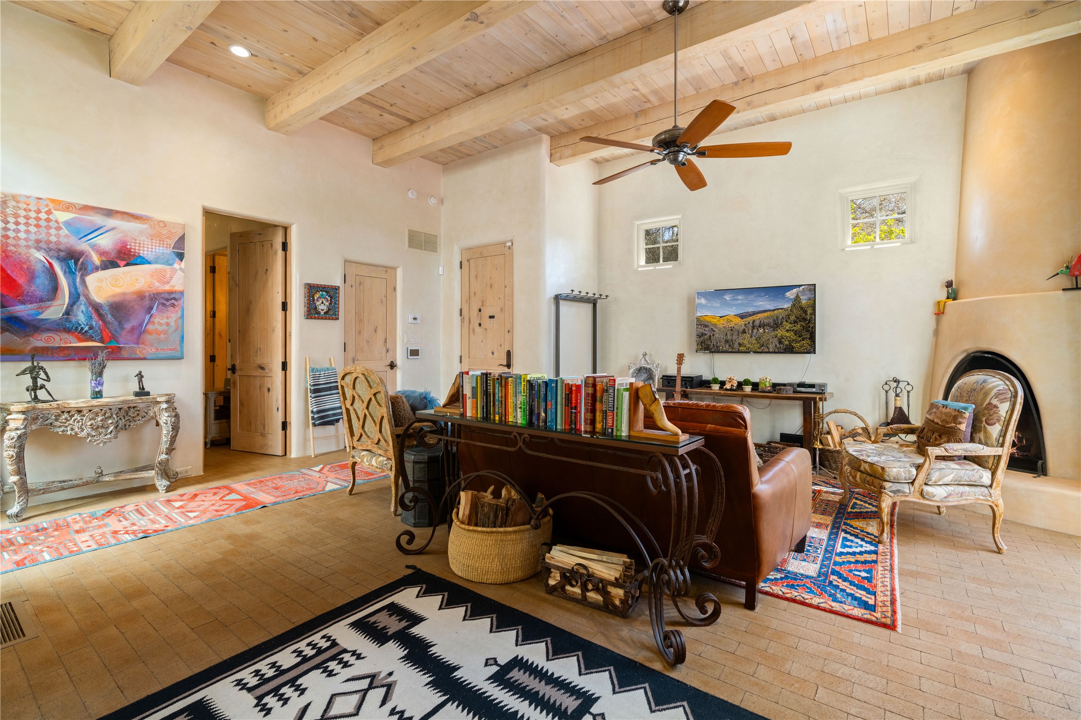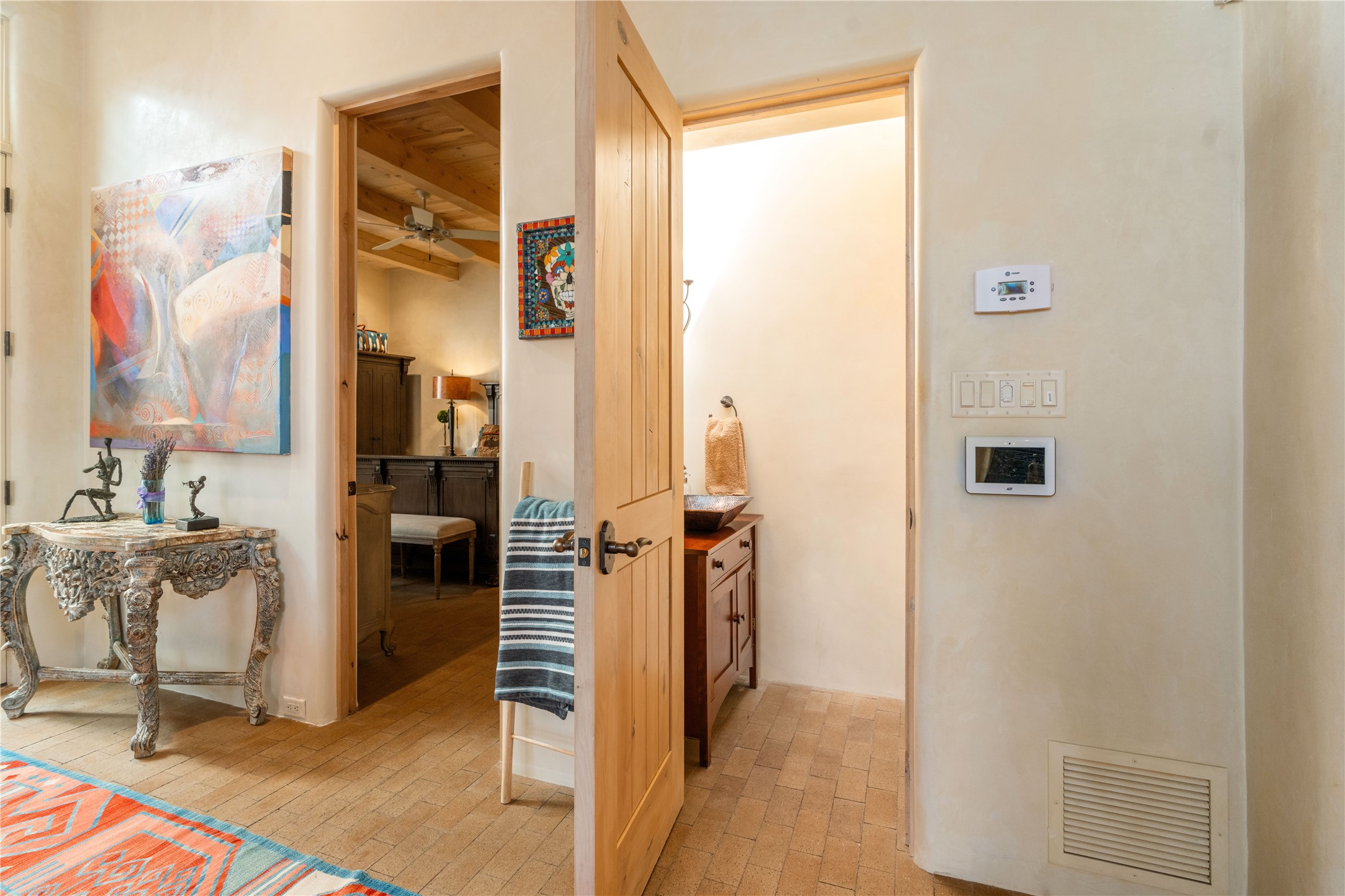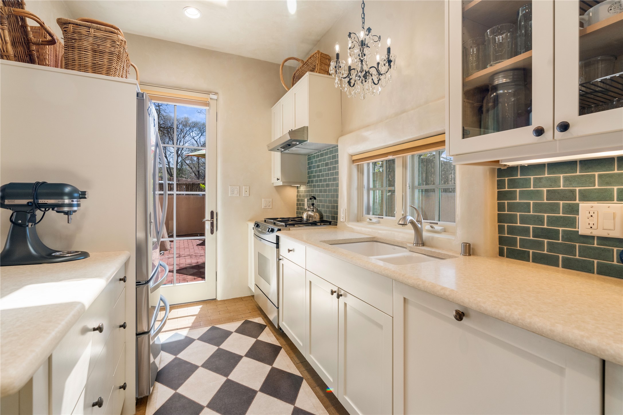 This historic Eastside home offers 1,322+/- Sq. Ft. of elegant living space, blending timeless Santa Fe charm with modern comfort. Designed by architect Michael Mahaffey and built in 2006 on the grounds of the 1926 Sheldon Parsons artist compound, it features a brand new roof, taupe-stone brick floors, tall alder wood doors, 2 wood-burning kiva fireplaces, skylights, and several glass French doors including one opening to a beautifully landscaped front patio. The interior walls are hand-plastered, adding warmth and texture to the space. Both the living area and bedroom boast high ceilings with wood beams, enhancing the open feel. The spacious bedroom suite offers a luxurious full bath and generous closet space. The kitchen flows into an open-concept living and dining area, perfect for relaxed living and entertaining. The front patio, framed by aspen, lilacs, and flower beds, offers privacy with wood gates and a walled perimeter, ideal for morning coffee or an evening meal. The low-maintenance landscaping has a drip irrigation system fed by a shared well. The back patio has an indoor-outdoor ambiance, reminiscent of a European pied--terre, offering serene architectural details and dappled light. This home is perfect for full-time living or as a "lock and leave" retreat. With its newly installed roof providing years of worry-free protection, and priced $302,000 below a recent appraisal (3/25), this property presents an exceptional value and an amazing opportunity to own a beautiful home in a highly sought-after location, just steps from the Santa Fe River Trail, Canyon Road, and a short stroll to the Plaza.
