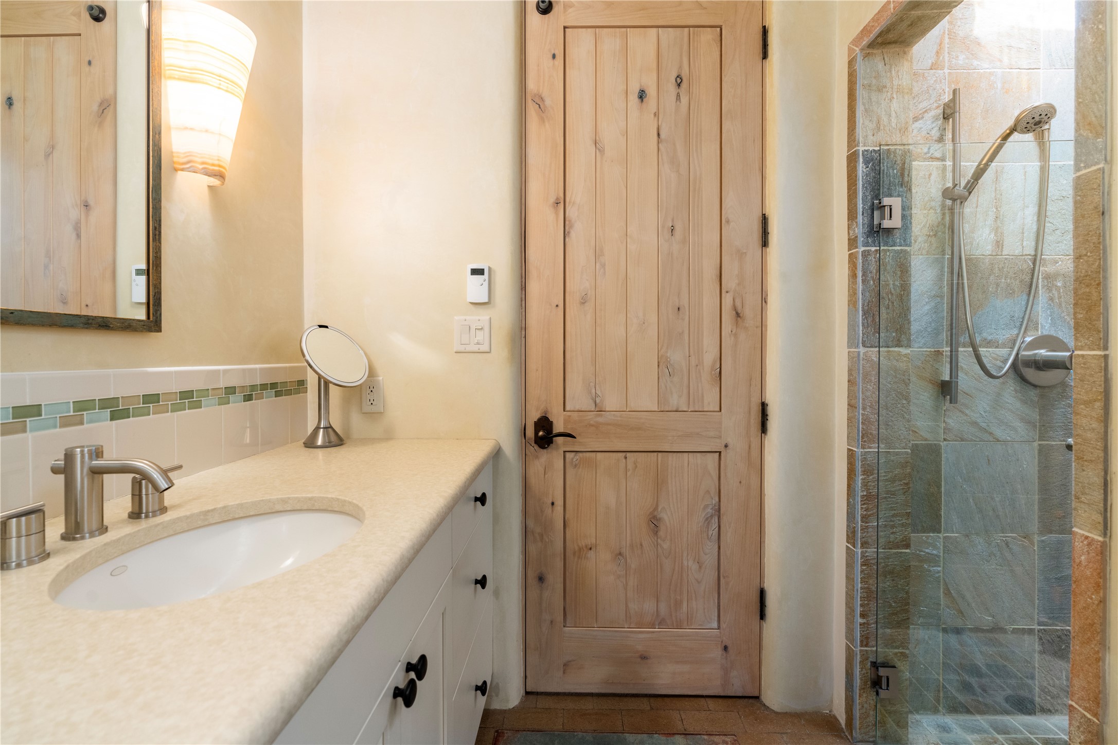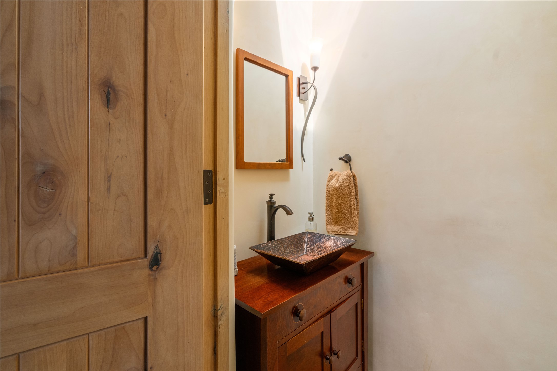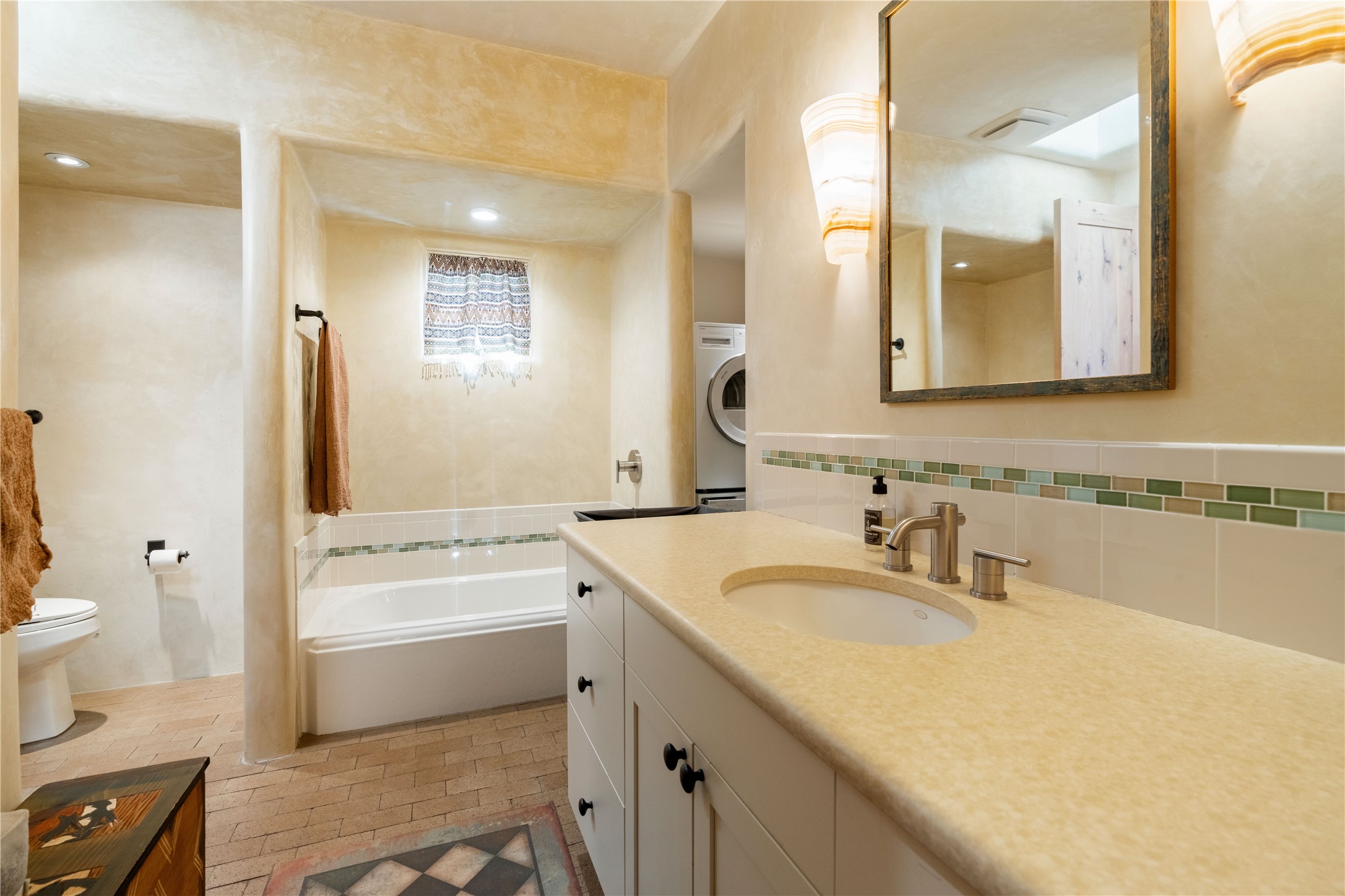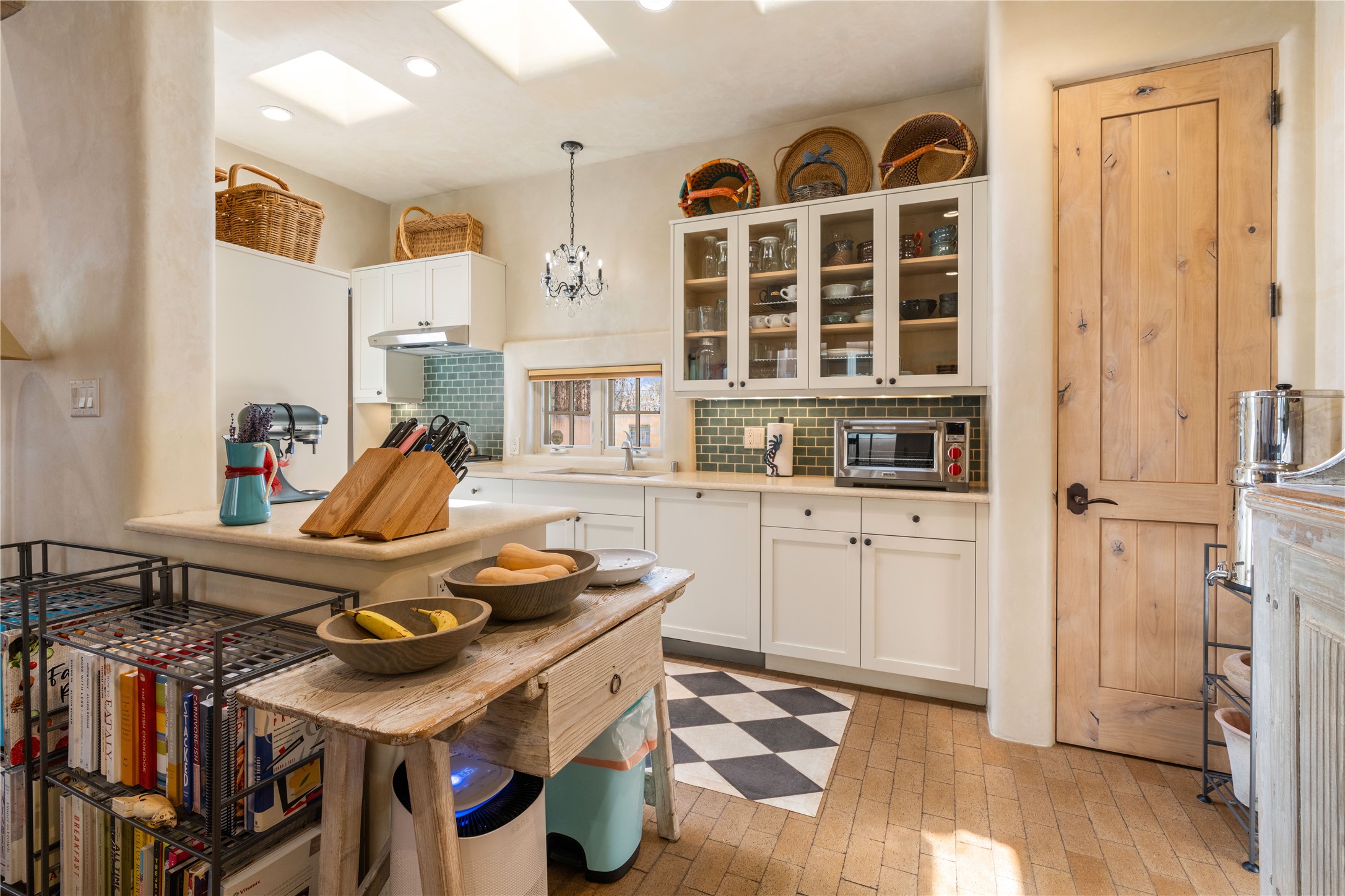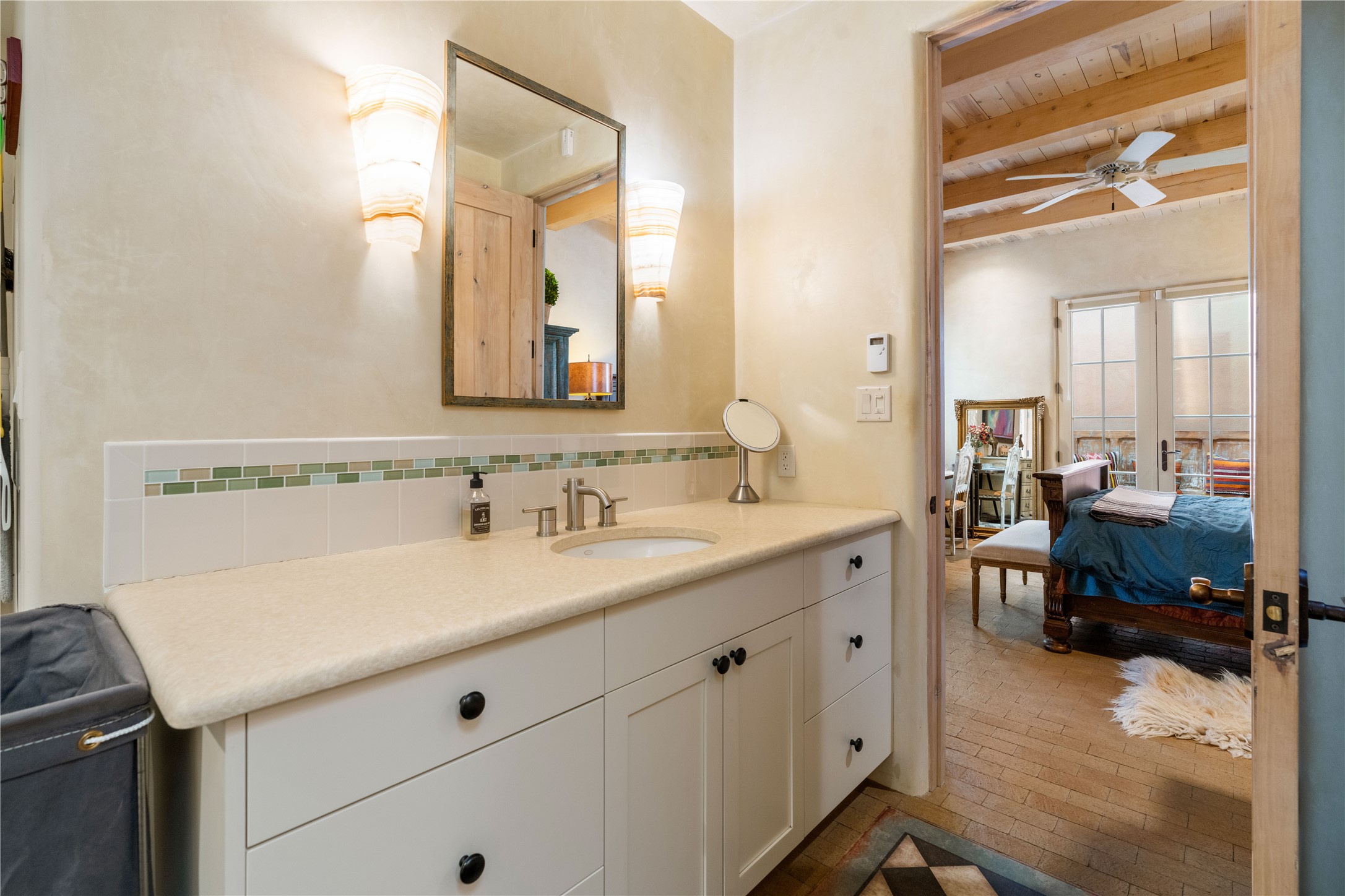 This historic Eastside home offers 1,322+/- Sq. Ft. of elegant living space, blending timeless Santa Fe charm with modern comfort. Designed by architect Michael Mahaffey and built in 2006 on the grounds of the 1926 Sheldon Parsons artist compound, it features a brand new roof, taupe-stone brick floors, tall alder wood doors, 2 wood-burning kiva fireplaces, skylights, and several glass French doors including one opening to a beautifully landscaped front patio. The interior walls are hand-plastered, adding warmth and texture to the space. Both the living area and bedroom boast high ceilings with wood beams, enhancing the open feel. The spacious bedroom suite offers a luxurious full bath and generous closet space. The kitchen flows into an open-concept living and dining area, perfect for relaxed living and entertaining. The front patio, framed by aspen, lilacs, and flower beds, offers privacy with wood gates and a walled perimeter, ideal for morning coffee or an evening meal. The low-maintenance landscaping has a drip irrigation system fed by a shared well. The back patio has an indoor-outdoor ambiance, reminiscent of a European pied--terre, offering serene architectural details and dappled light. This home is perfect for full-time living or as a "lock and leave" retreat. With its newly installed roof providing years of worry-free protection, and priced $302,000 below a recent appraisal (3/25), this property presents an exceptional value and an amazing opportunity to own a beautiful home in a highly sought-after location, just steps from the Santa Fe River Trail, Canyon Road, and a short stroll to the Plaza.