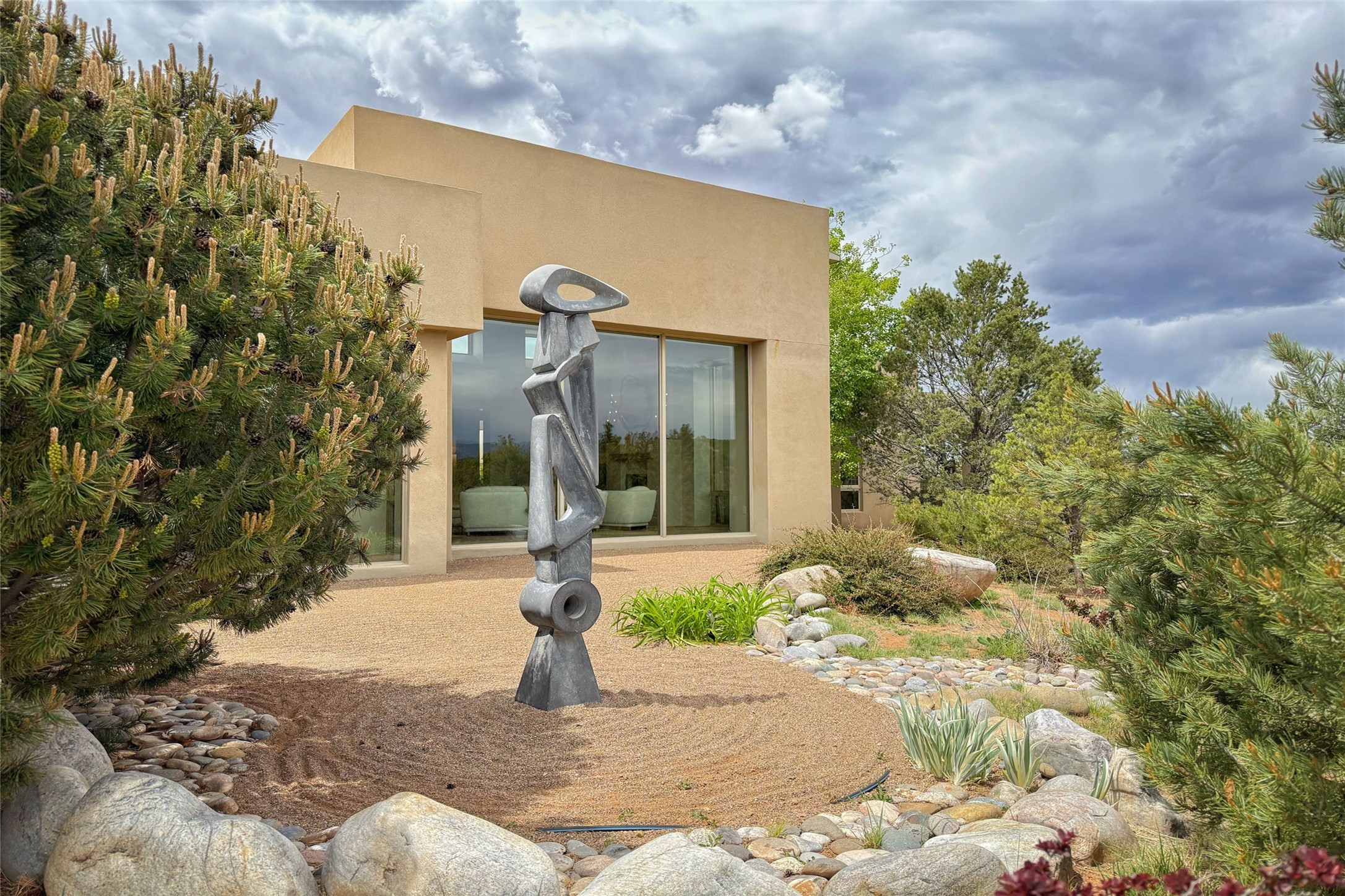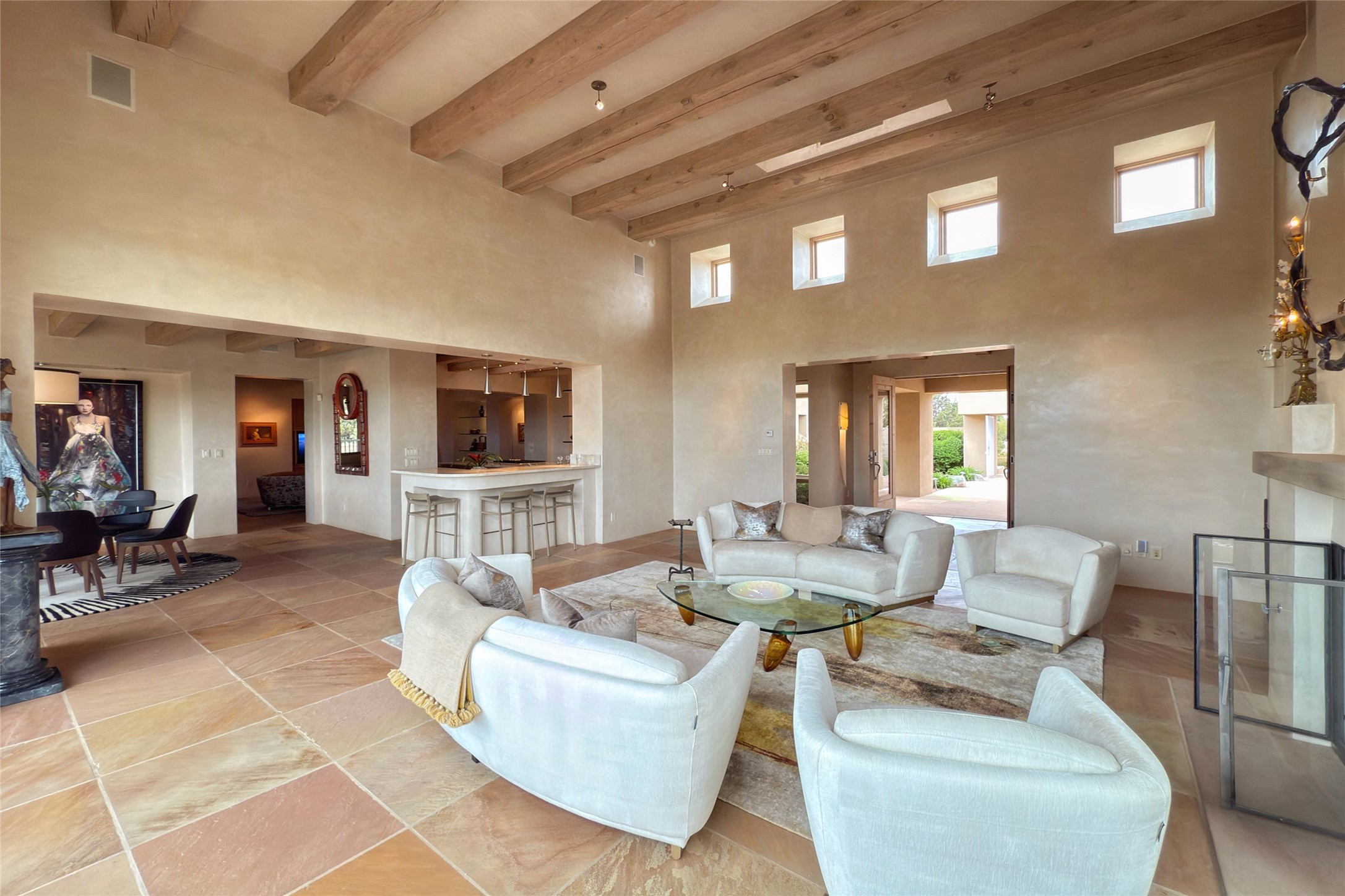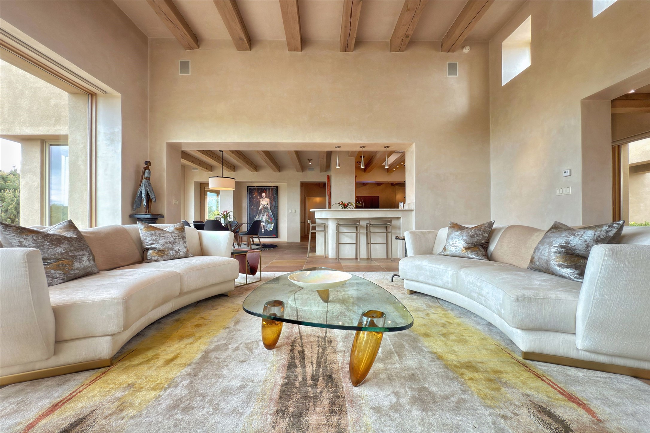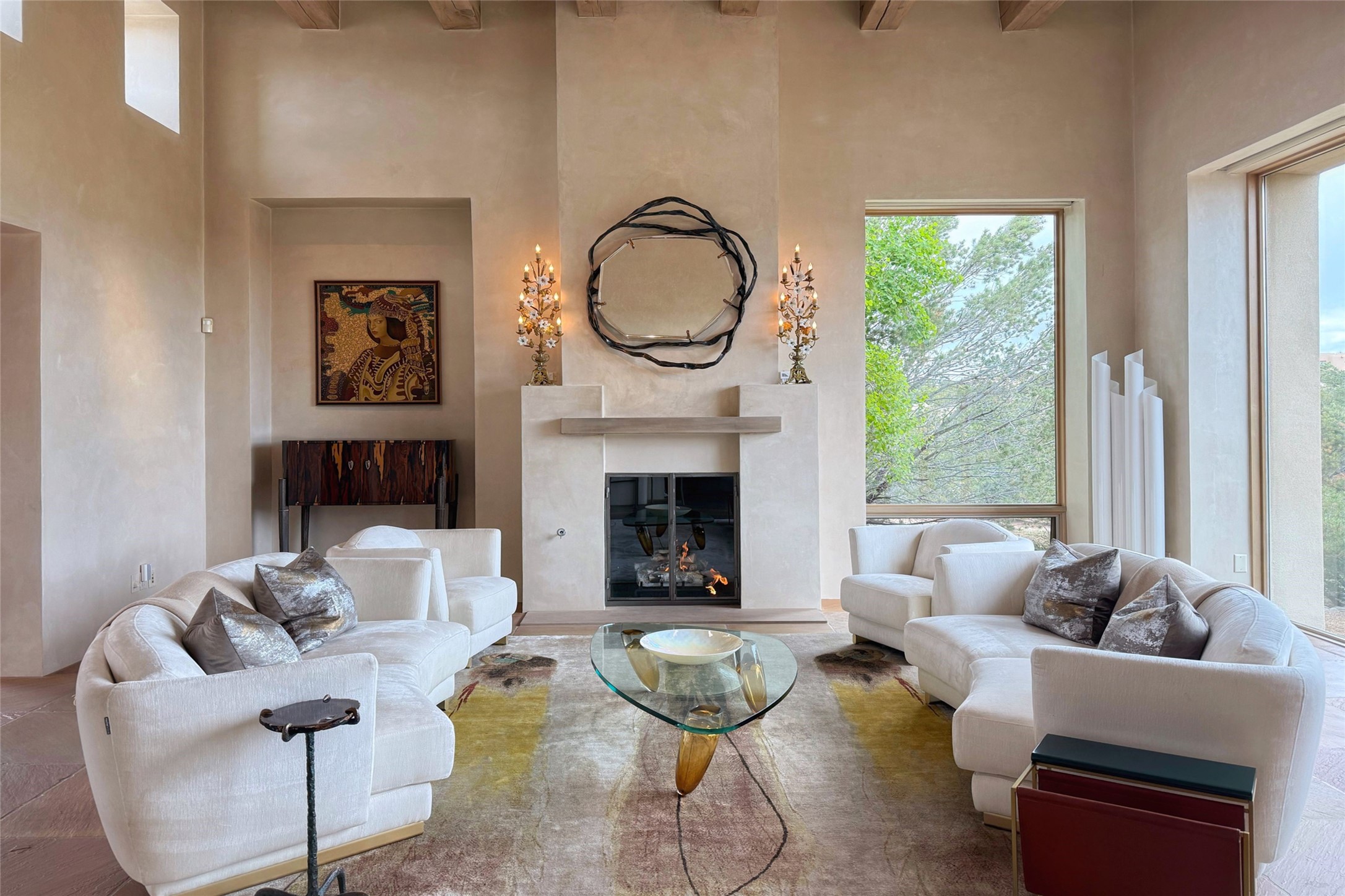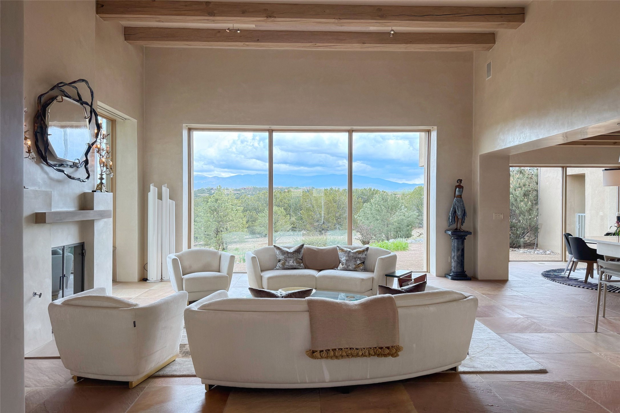 Prestigious Las Campanas Estate. Sophisticated Soft Contemporary on a Double Lot- over 3 acres for privacy.Welcome to an extraordinary estate built by Kim Dressel. Featuring a circular front drive, enclosed zen-like courtyard, and large separate motor court. With sweeping Sangre de Cristo views, this masterpiece blends elegance with tranquility and superb attention to detail. The entire residence is filled with natural light and augmented with custom lighting to showcase the art lover's collection.Interiors are graced with vigas and Desert Indian Sandstone floors. A total of 9 fireplaces (indoor and outdoor) provide warmth and charm. A generous entry hall, framed with alabaster sculptural lighting opens to the Great Room, anchored with a center fireplace and inspired by a bank of floor to ceiling windows that showcase the Sangre de Cristos. This space flaunts soaring ceilings and clerestory windows that flood the space with light. A gourmet kitchen features a large center island with Taj Mahal countertops, Sub-Zero/Wolf appliances, and opens to adjoining formal dining area and a cozy family room. A lavish primary suite offers a fireplace and an east facingportal complete with hot tub, fireplace and mountain views. Primary bath includes dual vanities, steam shower, soaking tub, dry sauna and custom closet. Adjacent home gym for convenience. Transition to the second wing through an impressive Gallery Hall designed for private art collections, exhibits and concert entertaining. A dedicated wine tasting space and sculpture garden complete the gallery.The secondary residence area includes large media room,office, two ensuite bedrooms with fireplaces and patios.Multiple outdoor spaces for indoor/outdoor living and entertaining including a deep covered portal with skylights, water feature, built-in grill and banco seating.Sparing no expense, this architectural gem delivers high-end fit and finishes throughout. The ultimate in style and serene luxury.