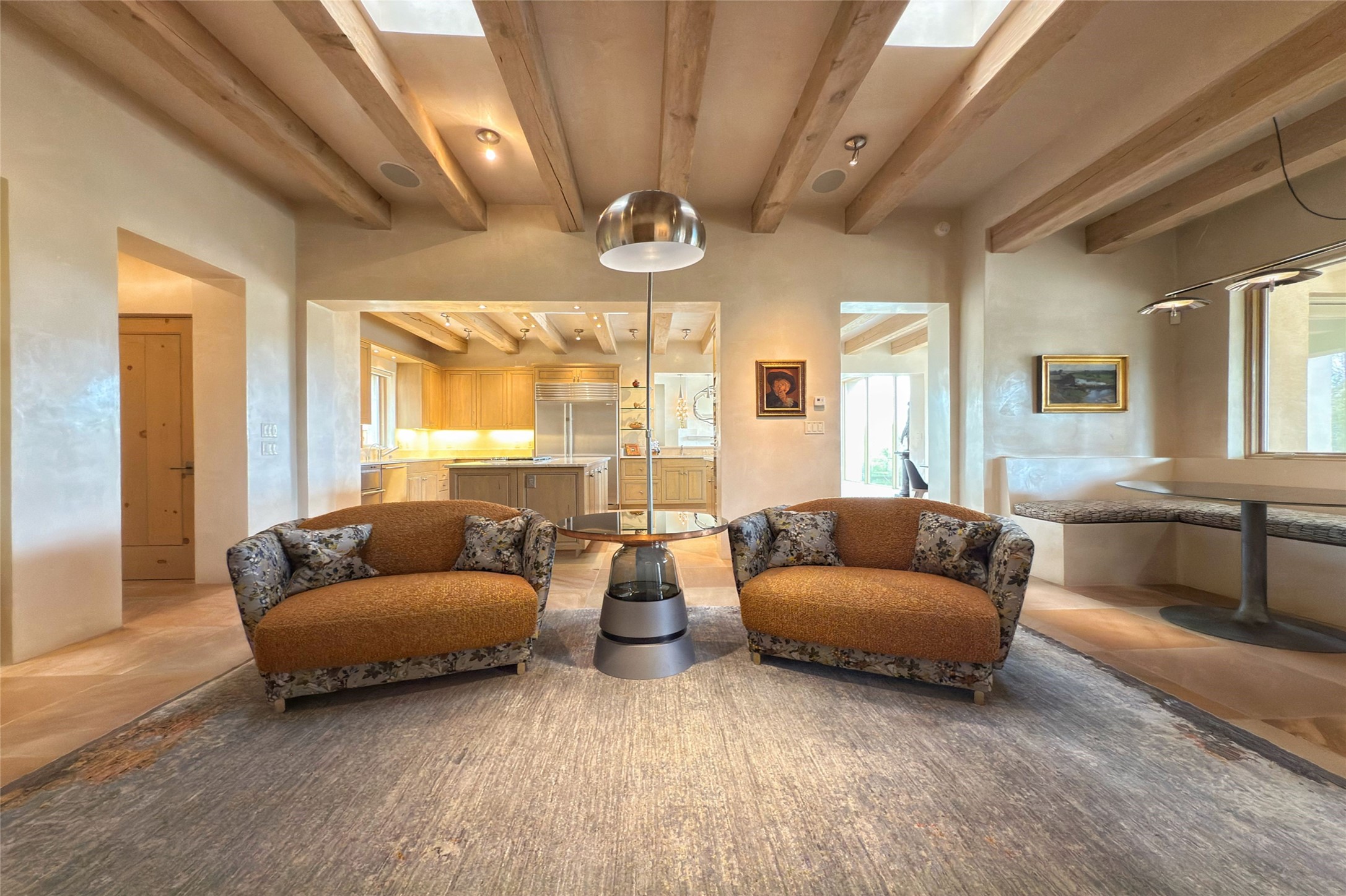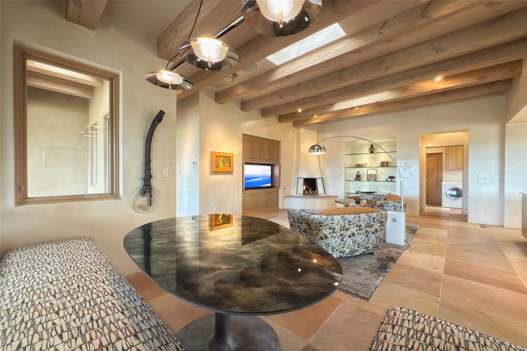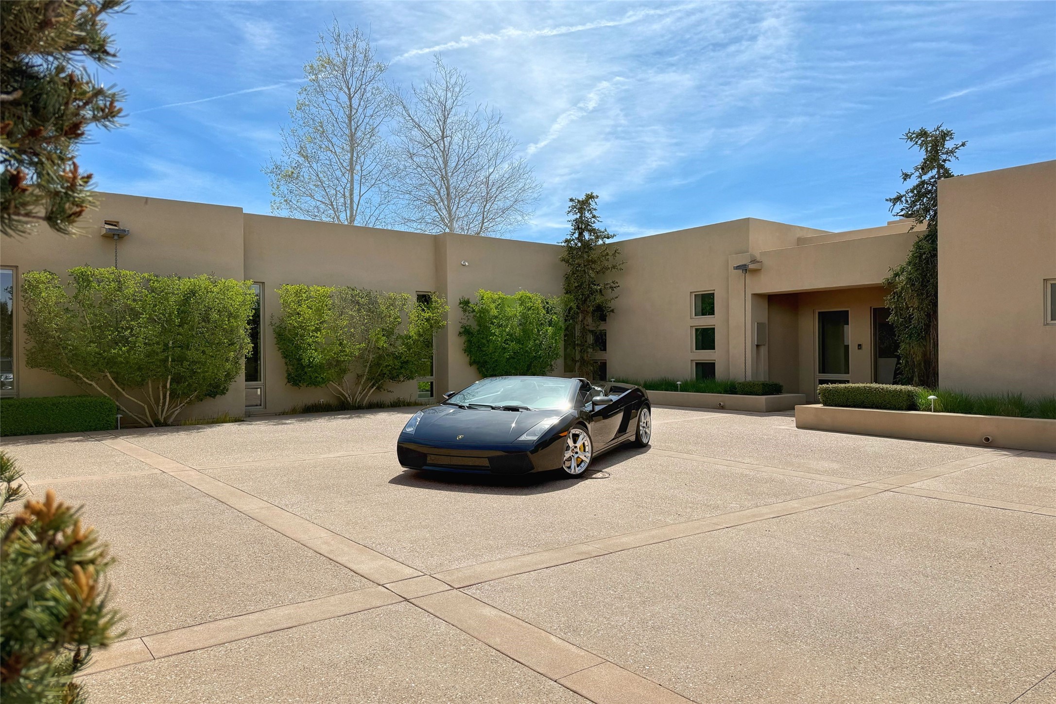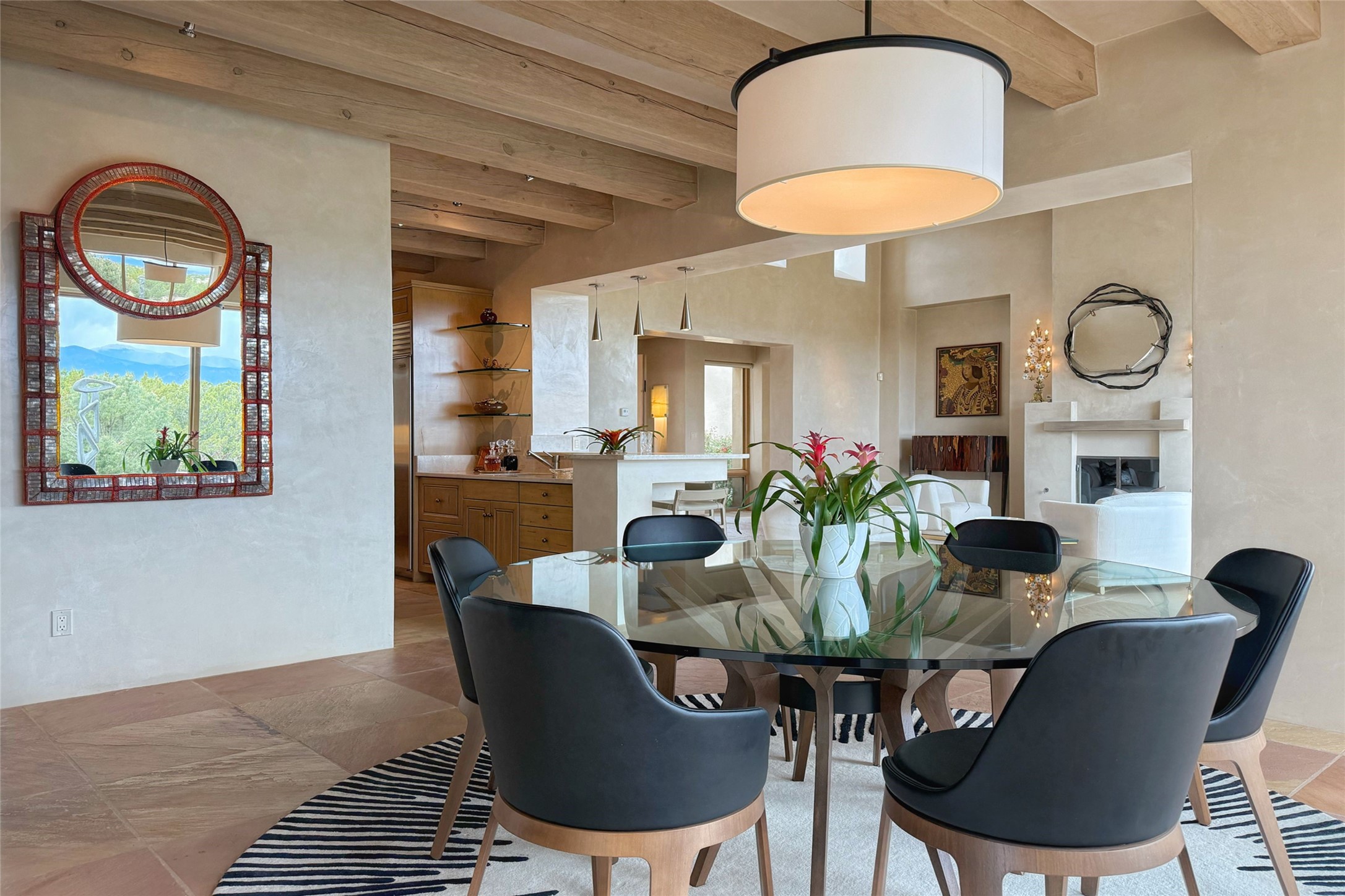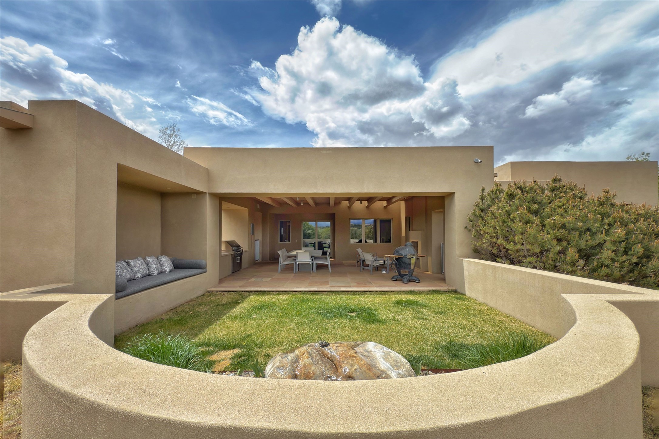 Prestigious Las Campanas Estate. Sophisticated Soft Contemporary on a Double Lot- over 3 acres for privacy.Welcome to an extraordinary estate built by Kim Dressel. Featuring a circular front drive, enclosed zen-like courtyard, and large separate motor court. With sweeping Sangre de Cristo views, this masterpiece blends elegance with tranquility and superb attention to detail. The entire residence is filled with natural light and augmented with custom lighting to showcase the art lover's collection.Interiors are graced with vigas and Desert Indian Sandstone floors. A total of 9 fireplaces (indoor and outdoor) provide warmth and charm. A generous entry hall, framed with alabaster sculptural lighting opens to the Great Room, anchored with a center fireplace and inspired by a bank of floor to ceiling windows that showcase the Sangre de Cristos. This space flaunts soaring ceilings and clerestory windows that flood the space with light. A gourmet kitchen features a large center island with Taj Mahal countertops, Sub-Zero/Wolf appliances, and opens to adjoining formal dining area and a cozy family room. A lavish primary suite offers a fireplace and an east facingportal complete with hot tub, fireplace and mountain views. Primary bath includes dual vanities, steam shower, soaking tub, dry sauna and custom closet. Adjacent home gym for convenience. Transition to the second wing through an impressive Gallery Hall designed for private art collections, exhibits and concert entertaining. A dedicated wine tasting space and sculpture garden complete the gallery.The secondary residence area includes large media room,office, two ensuite bedrooms with fireplaces and patios.Multiple outdoor spaces for indoor/outdoor living and entertaining including a deep covered portal with skylights, water feature, built-in grill and banco seating.Sparing no expense, this architectural gem delivers high-end fit and finishes throughout. The ultimate in style and serene luxury.