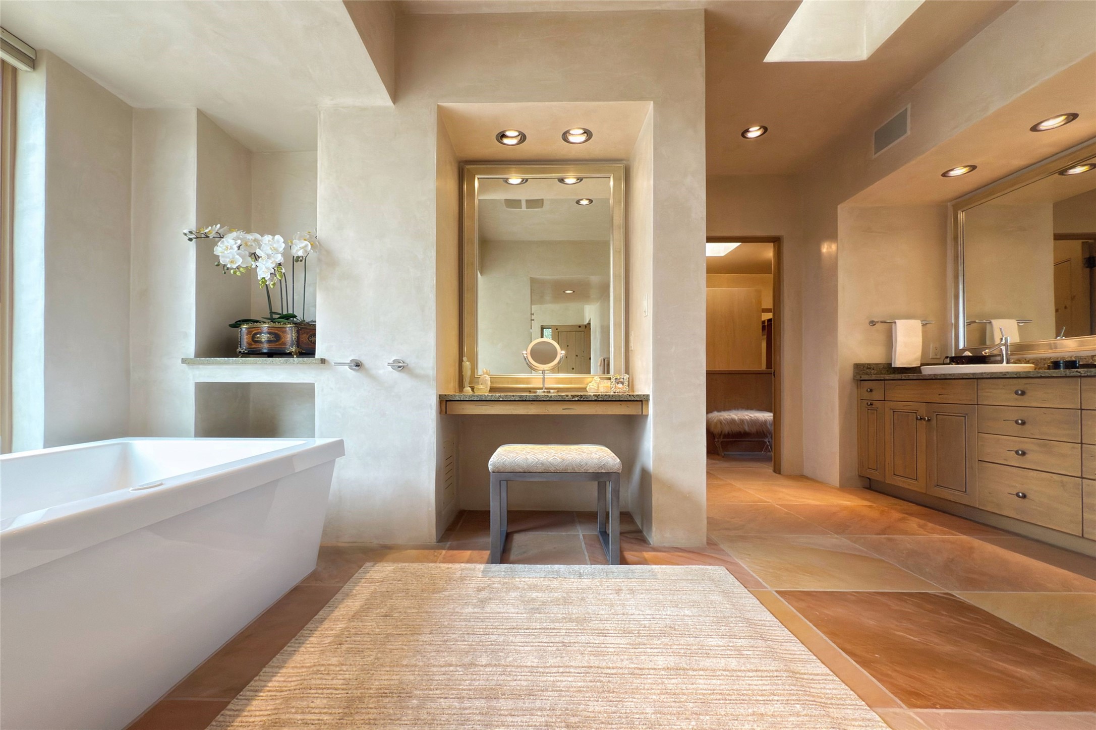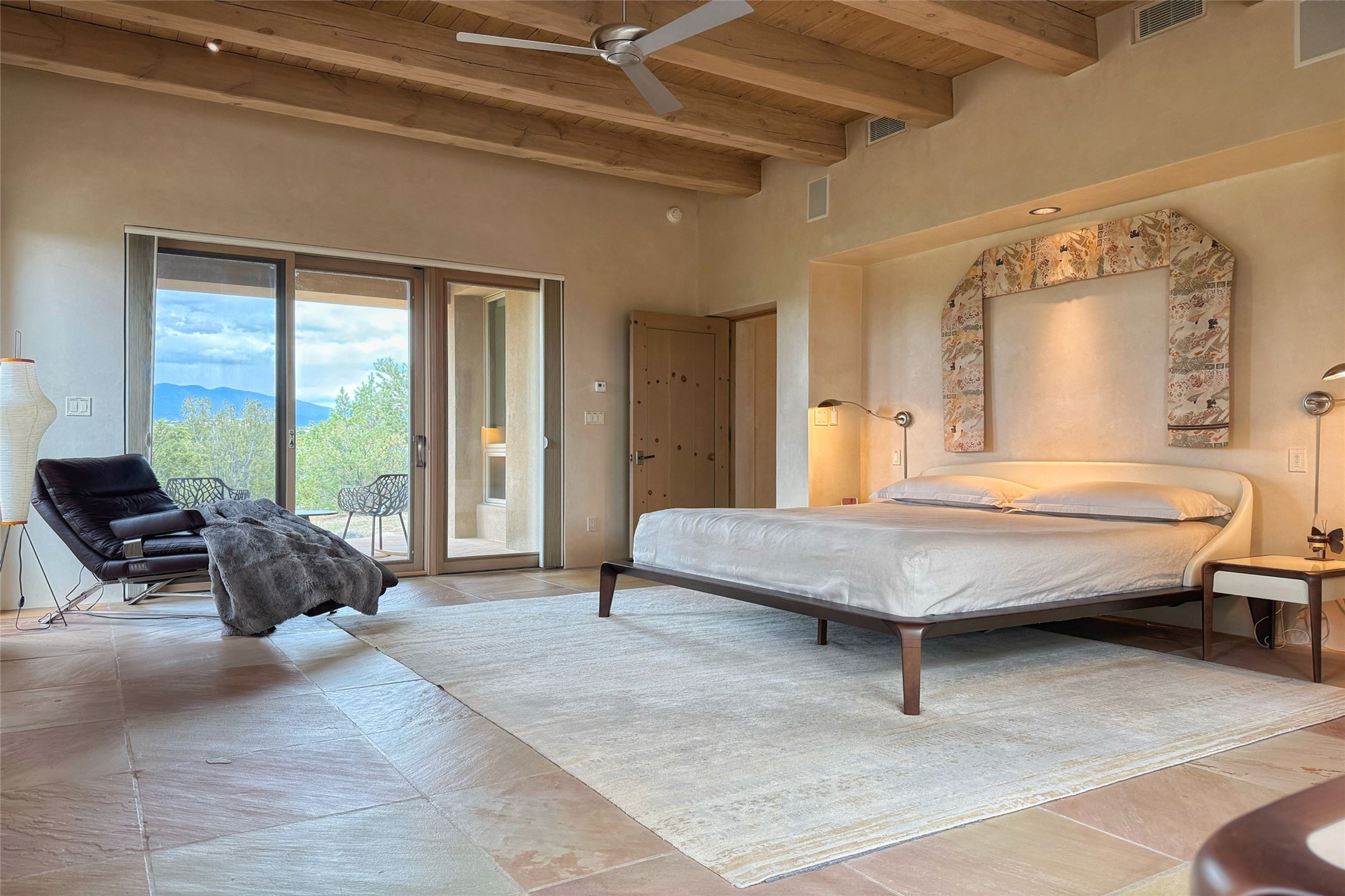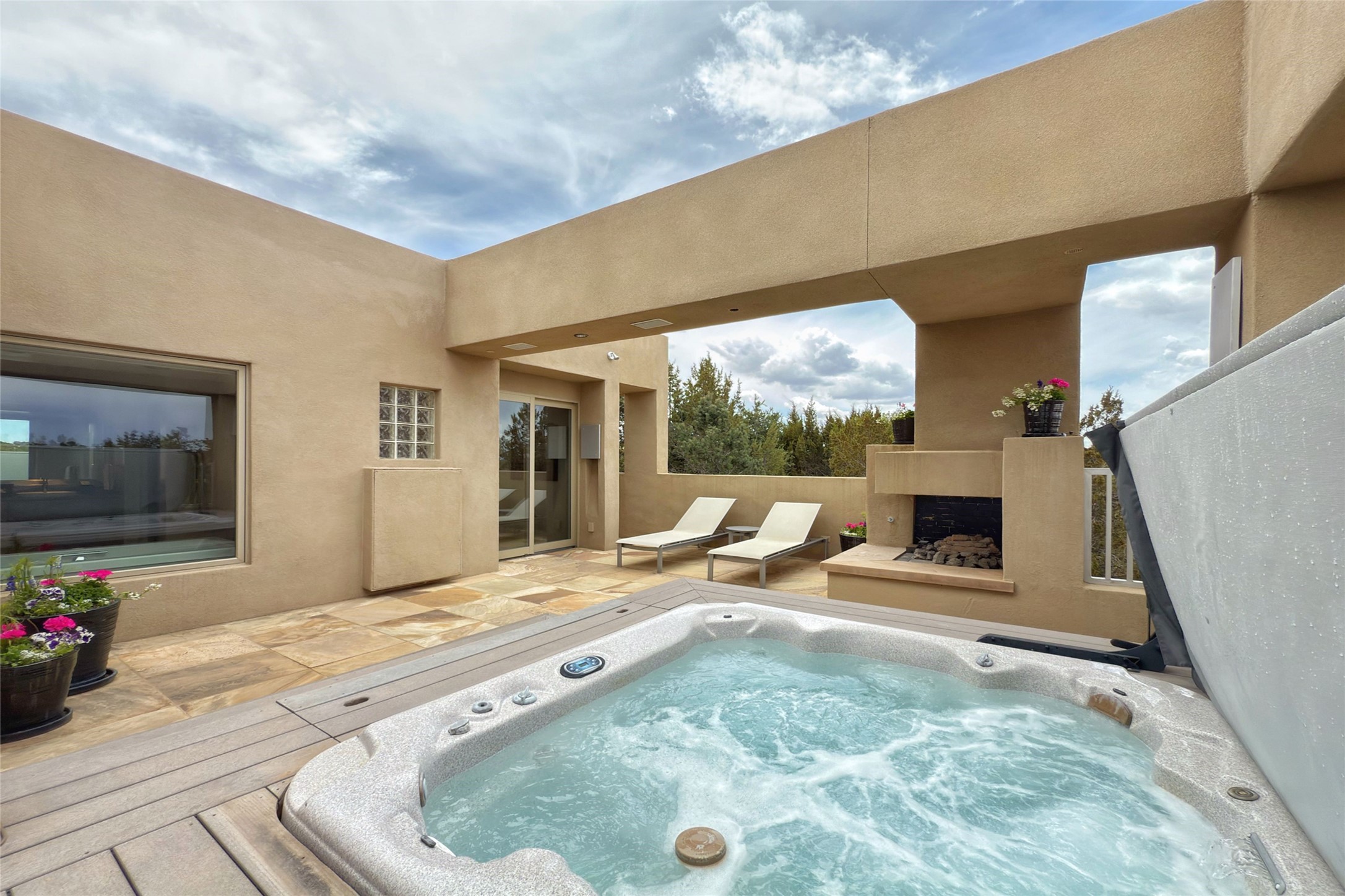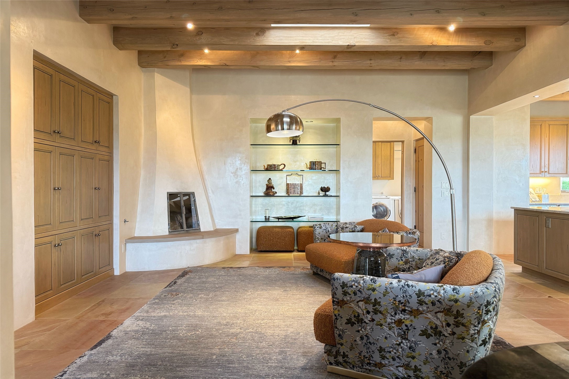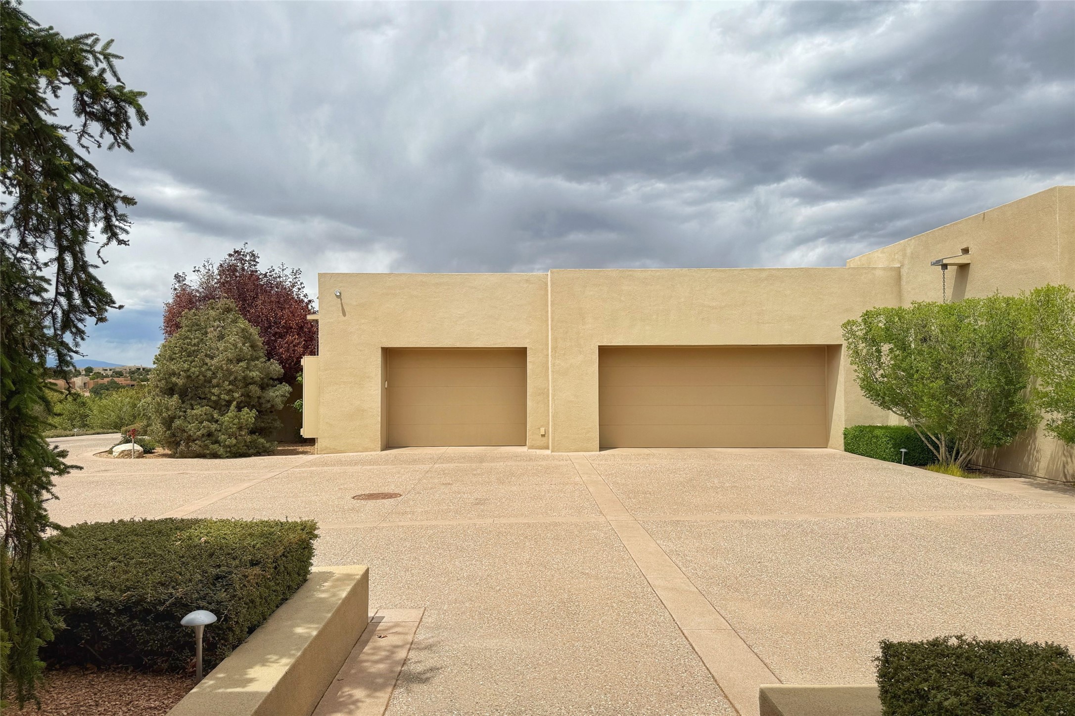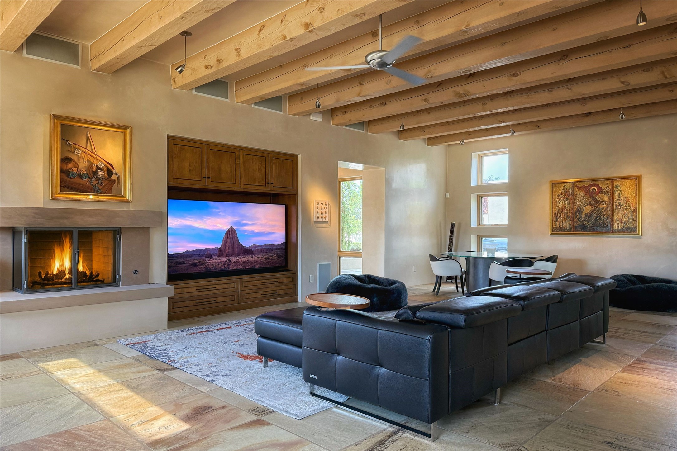 Prestigious Las Campanas Estate. Sophisticated Soft Contemporary on a Double Lot- over 3 acres for privacy.Welcome to an extraordinary estate built by Kim Dressel. Featuring a circular front drive, enclosed zen-like courtyard, and large separate motor court. With sweeping Sangre de Cristo views, this masterpiece blends elegance with tranquility and superb attention to detail. The entire residence is filled with natural light and augmented with custom lighting to showcase the art lover's collection.Interiors are graced with vigas and Desert Indian Sandstone floors. A total of 9 fireplaces (indoor and outdoor) provide warmth and charm. A generous entry hall, framed with alabaster sculptural lighting opens to the Great Room, anchored with a center fireplace and inspired by a bank of floor to ceiling windows that showcase the Sangre de Cristos. This space flaunts soaring ceilings and clerestory windows that flood the space with light. A gourmet kitchen features a large center island with Taj Mahal countertops, Sub-Zero/Wolf appliances, and opens to adjoining formal dining area and a cozy family room. A lavish primary suite offers a fireplace and an east facingportal complete with hot tub, fireplace and mountain views. Primary bath includes dual vanities, steam shower, soaking tub, dry sauna and custom closet. Adjacent home gym for convenience. Transition to the second wing through an impressive Gallery Hall designed for private art collections, exhibits and concert entertaining. A dedicated wine tasting space and sculpture garden complete the gallery.The secondary residence area includes large media room,office, two ensuite bedrooms with fireplaces and patios.Multiple outdoor spaces for indoor/outdoor living and entertaining including a deep covered portal with skylights, water feature, built-in grill and banco seating.Sparing no expense, this architectural gem delivers high-end fit and finishes throughout. The ultimate in style and serene luxury.