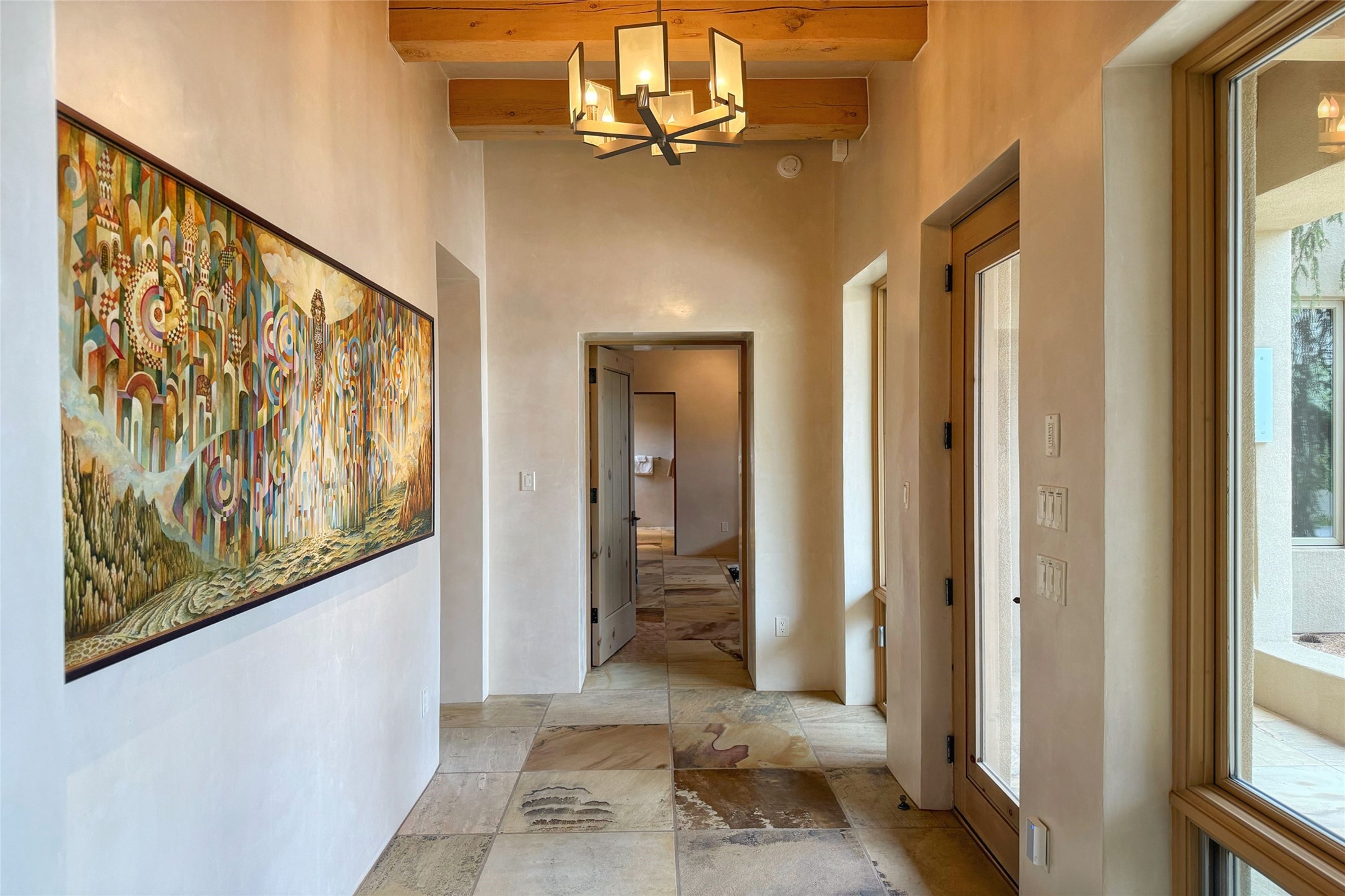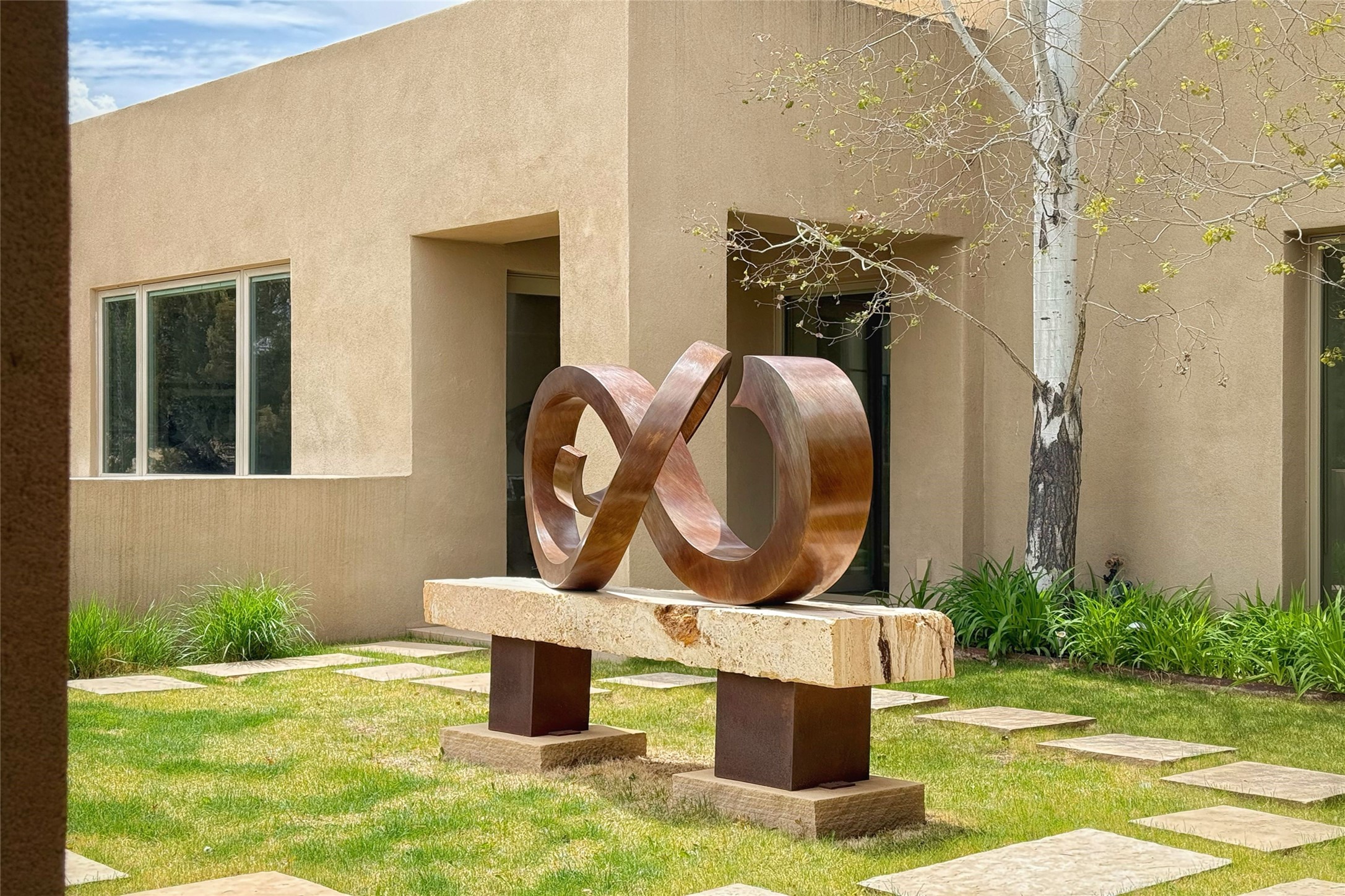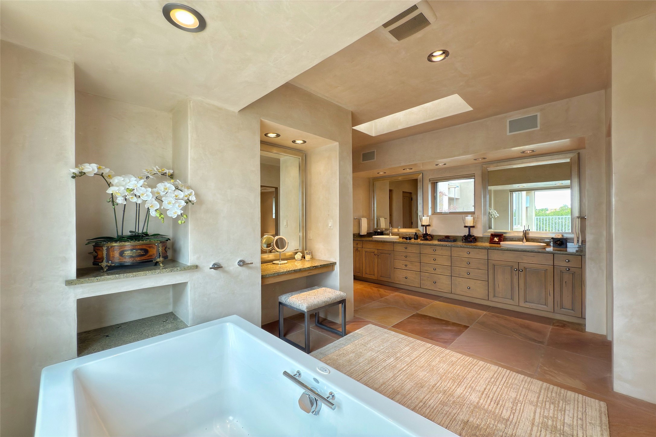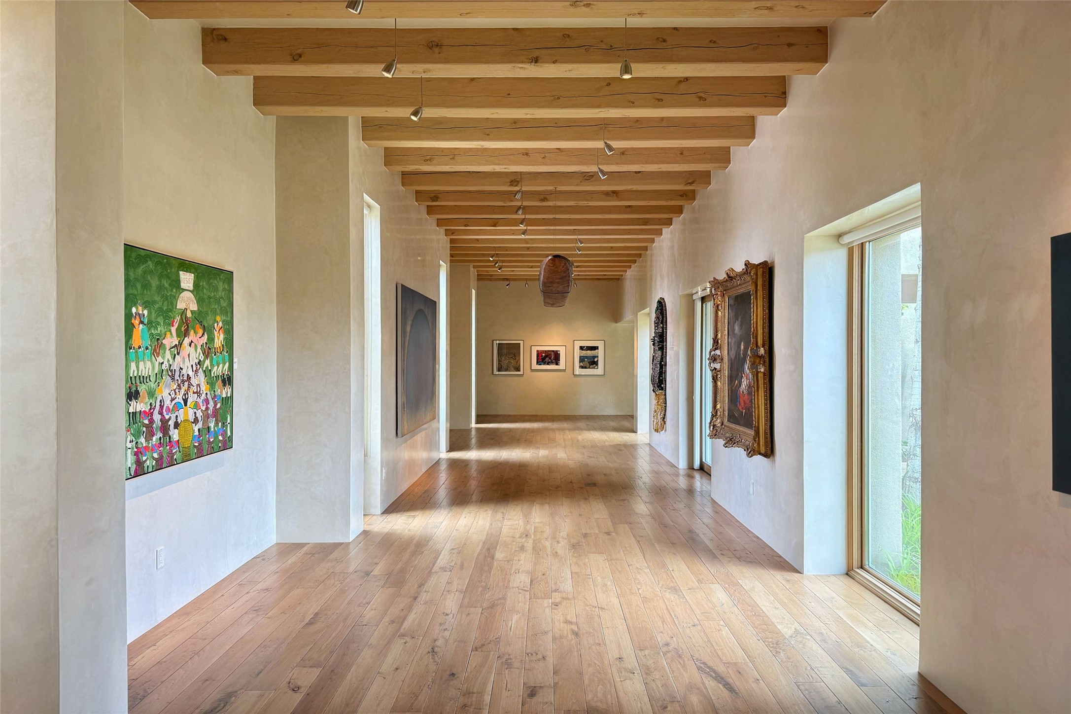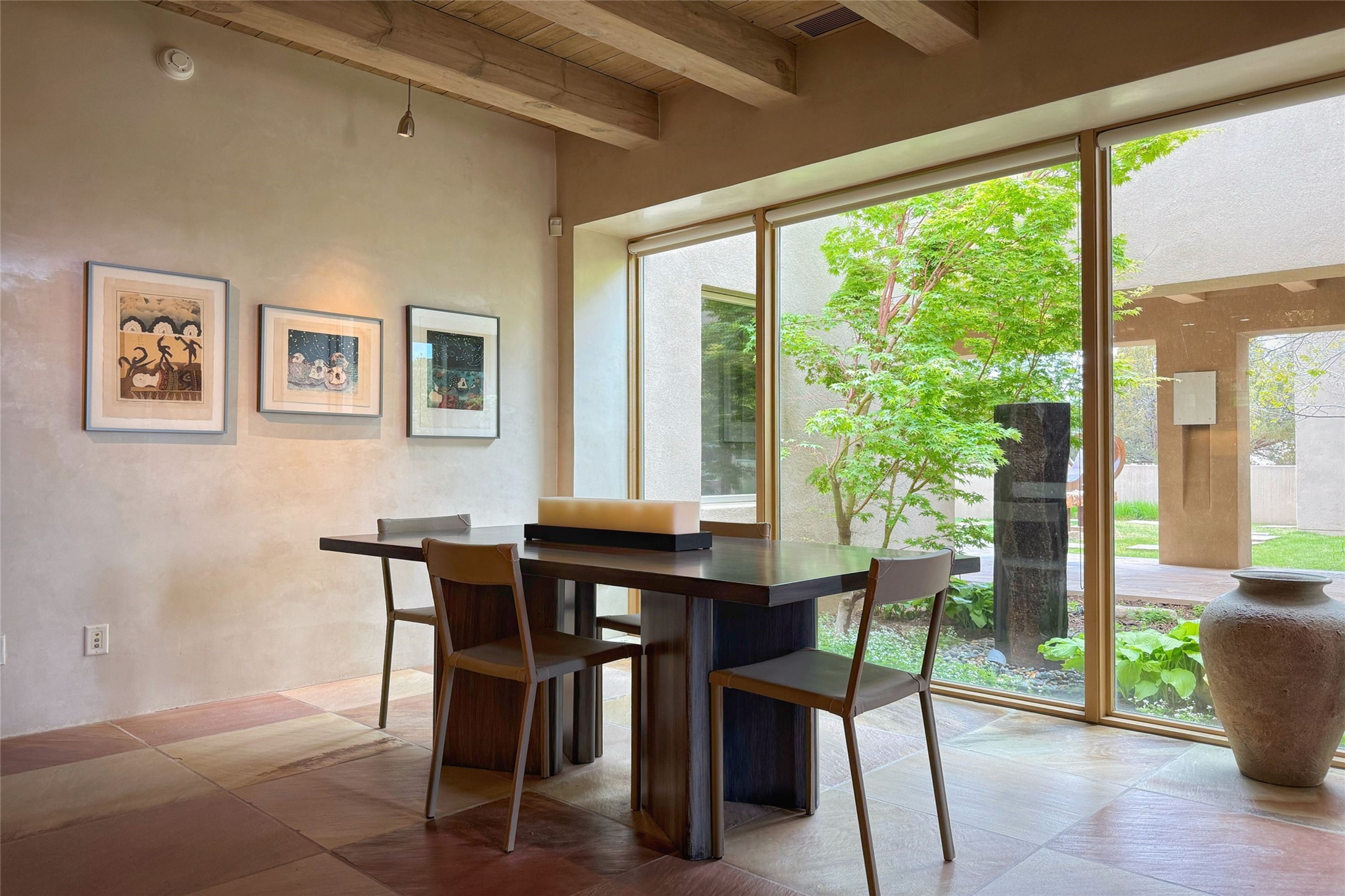Prestigious Las Campanas Estate. Sophisticated Soft Contemporary on a Double Lot- over 3 acres for privacy.Welcome to an extraordinary estate built by Kim Dressel. Featuring a circular front drive, enclosed zen-like courtyard, and large separate motor court. With sweeping Sangre de Cristo views, this masterpiece blends elegance with tranquility and superb attention to detail. The entire residence is filled with natural light and augmented with custom lighting to showcase the art lover's collection.Interiors are graced with vigas and Desert Indian Sandstone floors. A total of 9 fireplaces (indoor and outdoor) provide warmth and charm. A generous entry hall, framed with alabaster sculptural lighting opens to the Great Room, anchored with a center fireplace and inspired by a bank of floor to ceiling windows that showcase the Sangre de Cristos. This space flaunts soaring ceilings and clerestory windows that flood the space with light. A gourmet kitchen features a large center island with Taj Mahal countertops, Sub-Zero/Wolf appliances, and opens to adjoining formal dining area and a cozy family room. A lavish primary suite offers a fireplace and an east facingportal complete with hot tub, fireplace and mountain views. Primary bath includes dual vanities, steam shower, soaking tub, dry sauna and custom closet. Adjacent home gym for convenience. Transition to the second wing through an impressive Gallery Hall designed for private art collections, exhibits and concert entertaining. A dedicated wine tasting space and sculpture garden complete the gallery.The secondary residence area includes large media room,office, two ensuite bedrooms with fireplaces and patios.Multiple outdoor spaces for indoor/outdoor living and entertaining including a deep covered portal with skylights, water feature, built-in grill and banco seating.Sparing no expense, this architectural gem delivers high-end fit and finishes throughout. The ultimate in style and serene luxury.