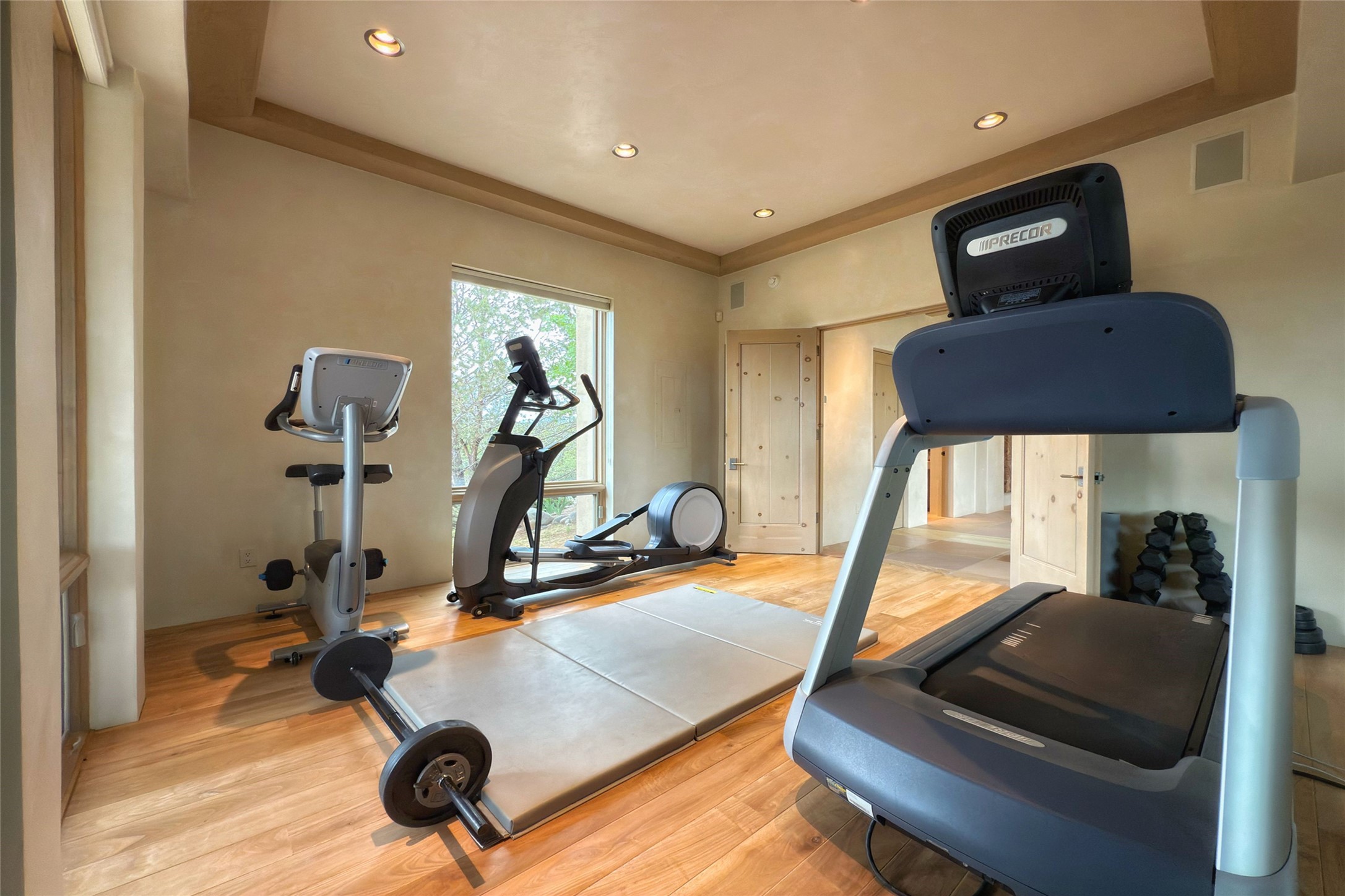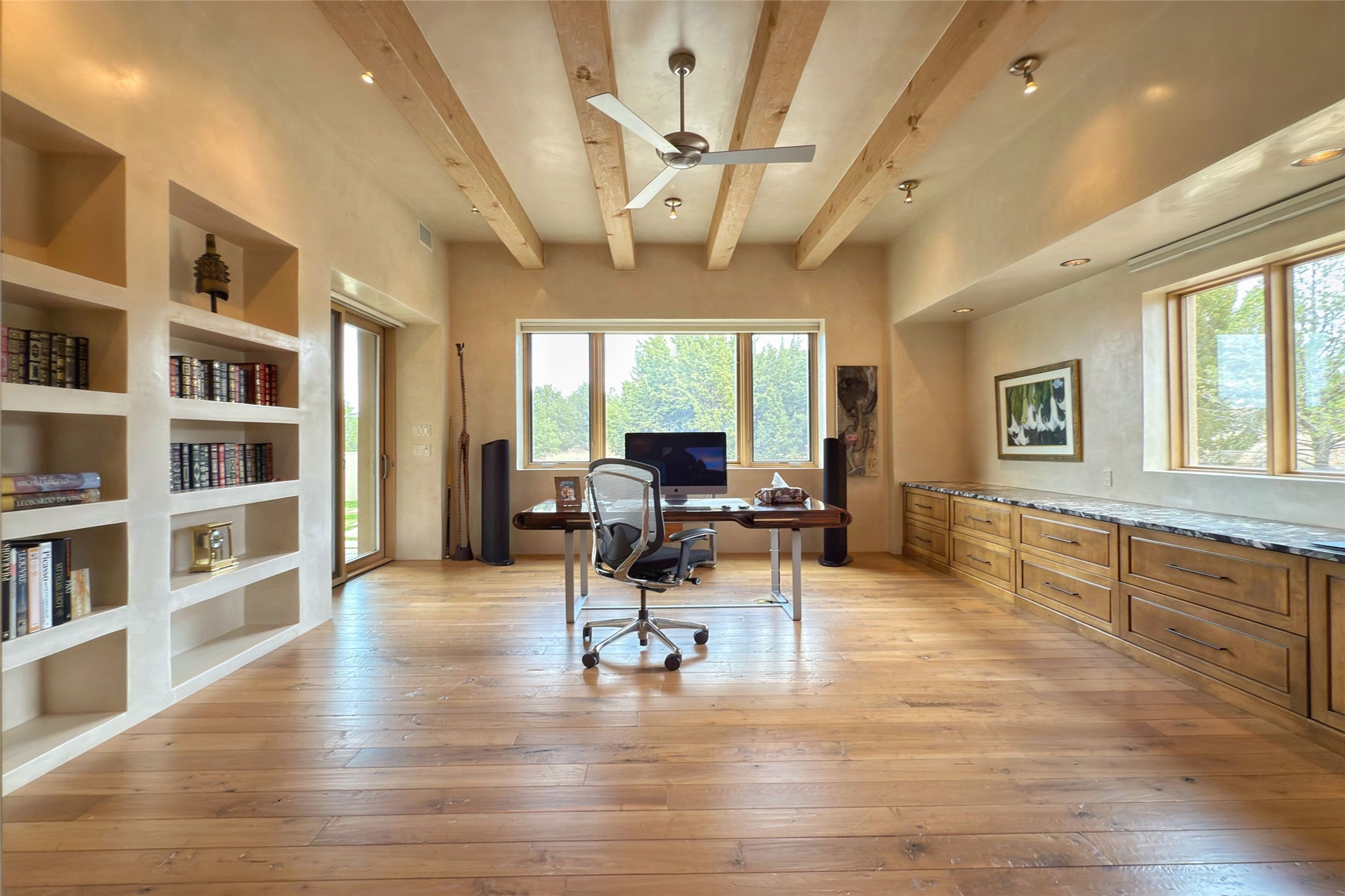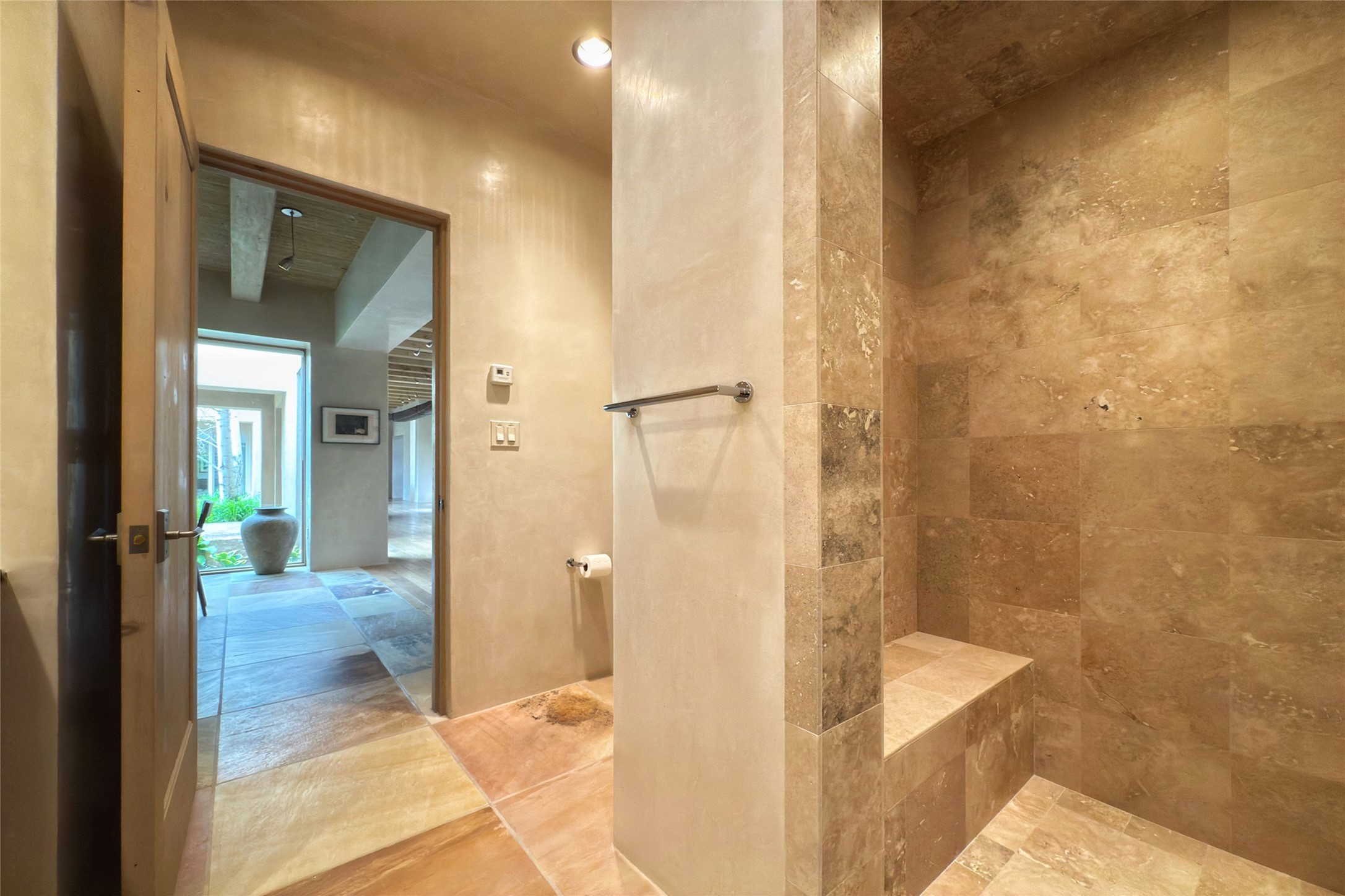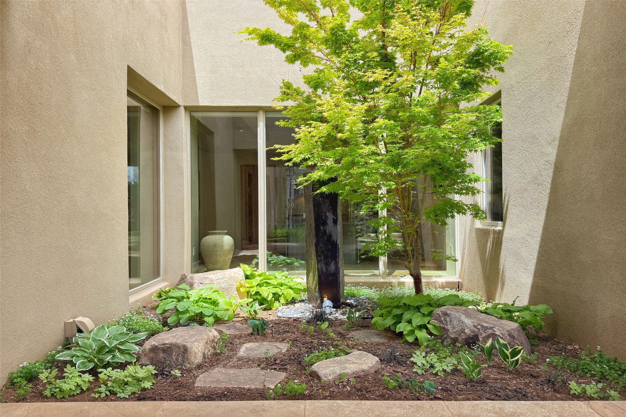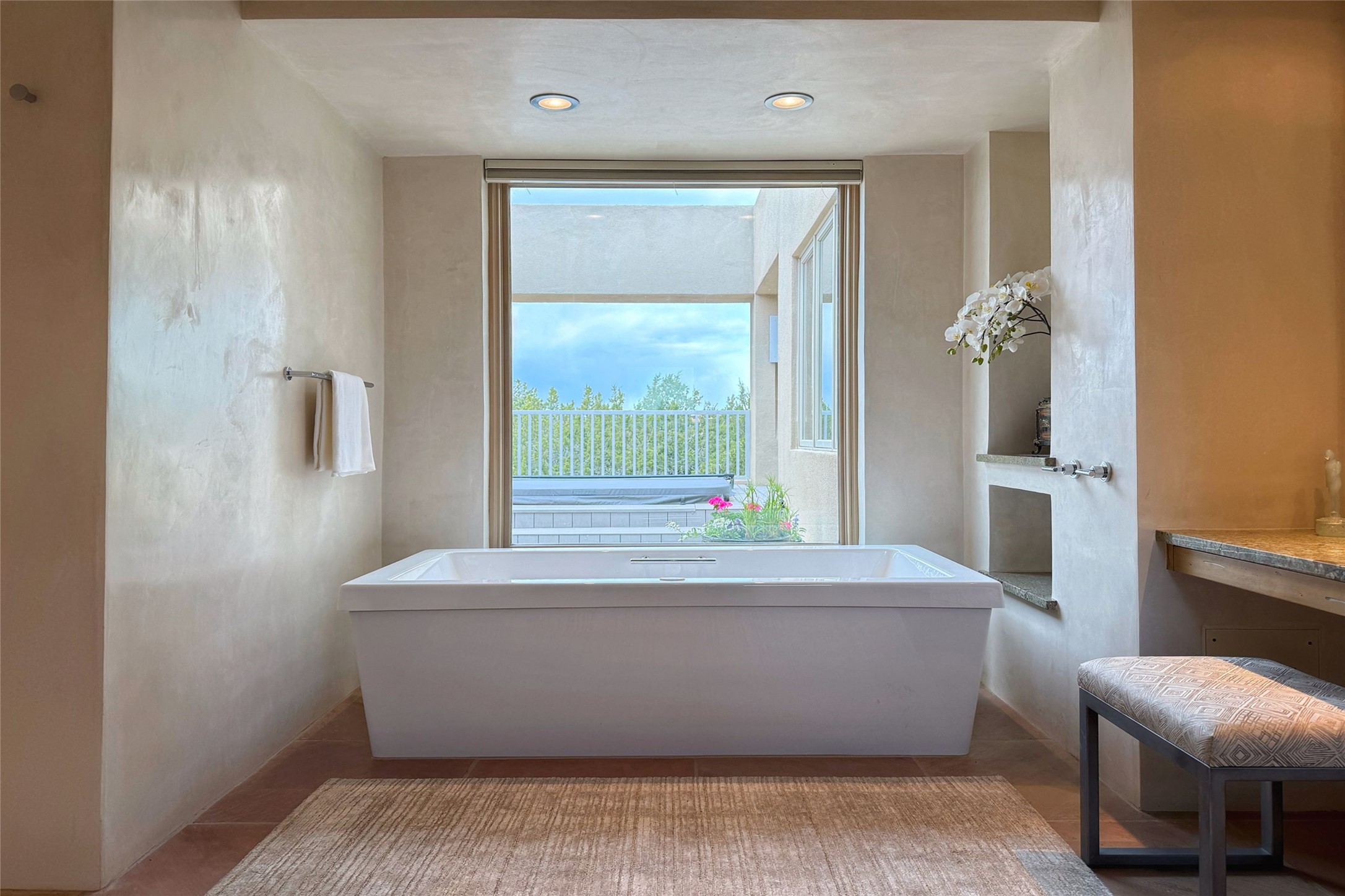Prestigious Las Campanas Estate. Sophisticated Soft Contemporary on a Double Lot- over 3 acres for privacy.Welcome to an extraordinary estate built by Kim Dressel. Featuring a circular front drive, enclosed zen-like courtyard, and large separate motor court. With sweeping Sangre de Cristo views, this masterpiece blends elegance with tranquility and superb attention to detail. The entire residence is filled with natural light and augmented with custom lighting to showcase the art lover's collection.Interiors are graced with vigas and Desert Indian Sandstone floors. A total of 9 fireplaces (indoor and outdoor) provide warmth and charm. A generous entry hall, framed with alabaster sculptural lighting opens to the Great Room, anchored with a center fireplace and inspired by a bank of floor to ceiling windows that showcase the Sangre de Cristos. This space flaunts soaring ceilings and clerestory windows that flood the space with light. A gourmet kitchen features a large center island with Taj Mahal countertops, Sub-Zero/Wolf appliances, and opens to adjoining formal dining area and a cozy family room. A lavish primary suite offers a fireplace and an east facingportal complete with hot tub, fireplace and mountain views. Primary bath includes dual vanities, steam shower, soaking tub, dry sauna and custom closet. Adjacent home gym for convenience. Transition to the second wing through an impressive Gallery Hall designed for private art collections, exhibits and concert entertaining. A dedicated wine tasting space and sculpture garden complete the gallery.The secondary residence area includes large media room,office, two ensuite bedrooms with fireplaces and patios.Multiple outdoor spaces for indoor/outdoor living and entertaining including a deep covered portal with skylights, water feature, built-in grill and banco seating.Sparing no expense, this architectural gem delivers high-end fit and finishes throughout. The ultimate in style and serene luxury.
