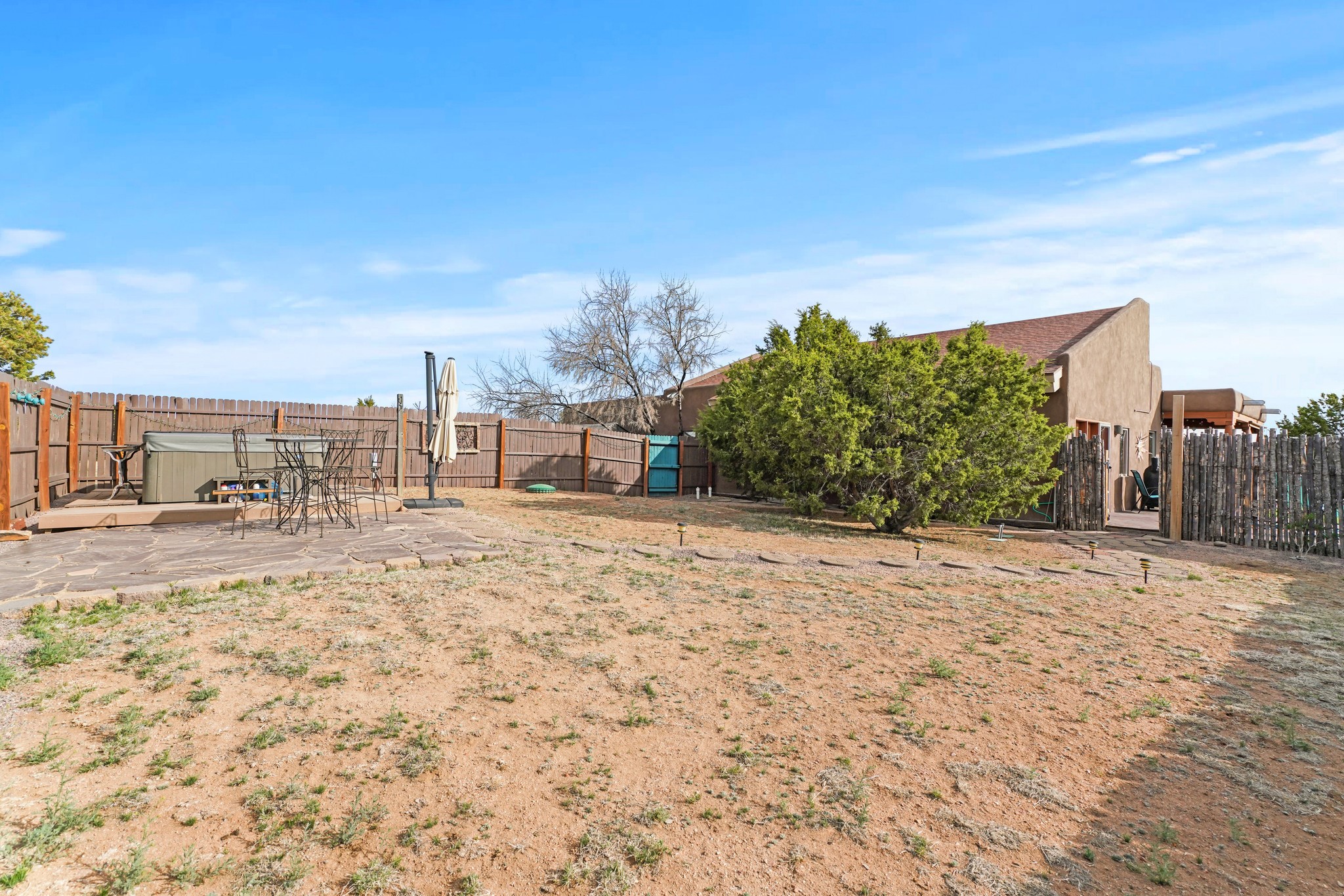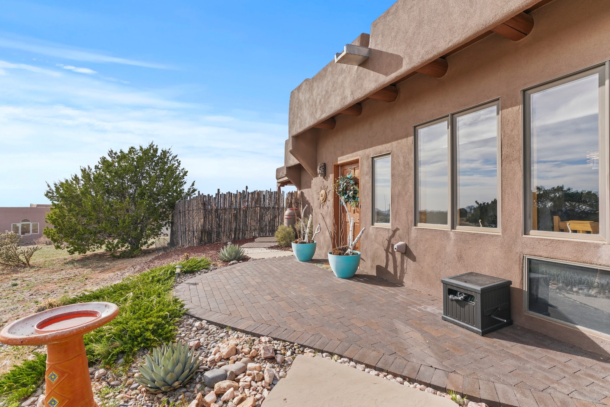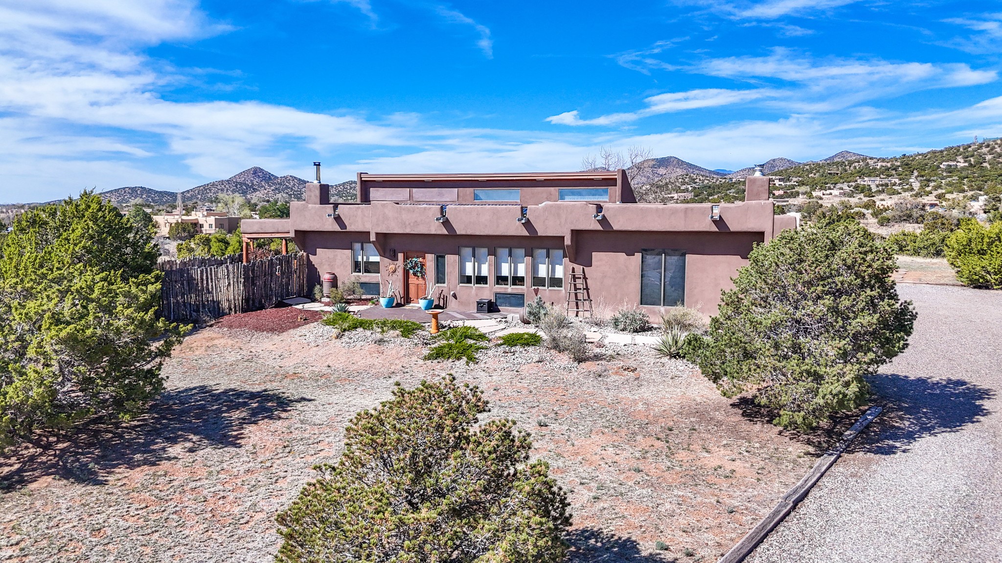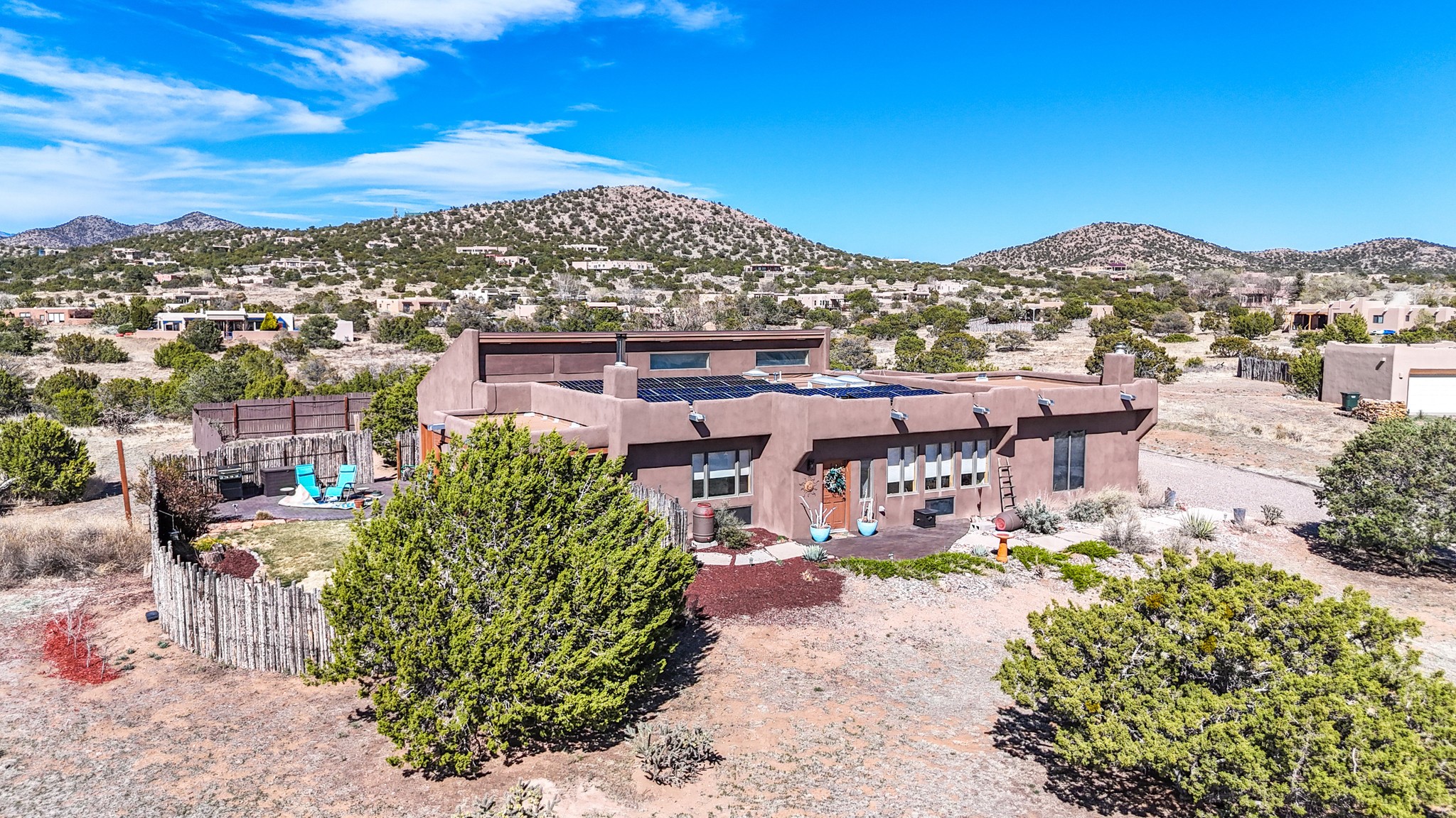 Welcome to this attractive passive solar home at 5 Puerto Road in the popular community of Eldorado, which is just a 15-minute drive south of the Santa Fe city limits. Located off of a quiet cul-de-sac and bordered by a spacious greenbelt, this gorgeous light-filled home on 2 acres is the one you've been waiting for.Upon entry you will notice the distinctive and appealing open floor plan design as the spacious kitchen opens to the living and dining rooms. You'll also enjoy the high ceilings with vigas in this single level home with beautifully-tiled flooring and no interior steps. The primary suite features clerestory windows, a walk-in closet, a separate, designated work or exercise area and direct access to the private outdoor hot tub! Additional and beneficial features are the newer photovoltaic solar panel system that significantly reduces the electric bill, trombe walls, a kiva fireplace and the oversized 2-car garage. The southwestern views of the Jemez, Ortiz and Sandia Mountains are magnificent. For the outdoor enthusiasts, Eldorado contains the best walking/biking paths and boasts one of the best outdoor swimming pools in Santa Fe County.