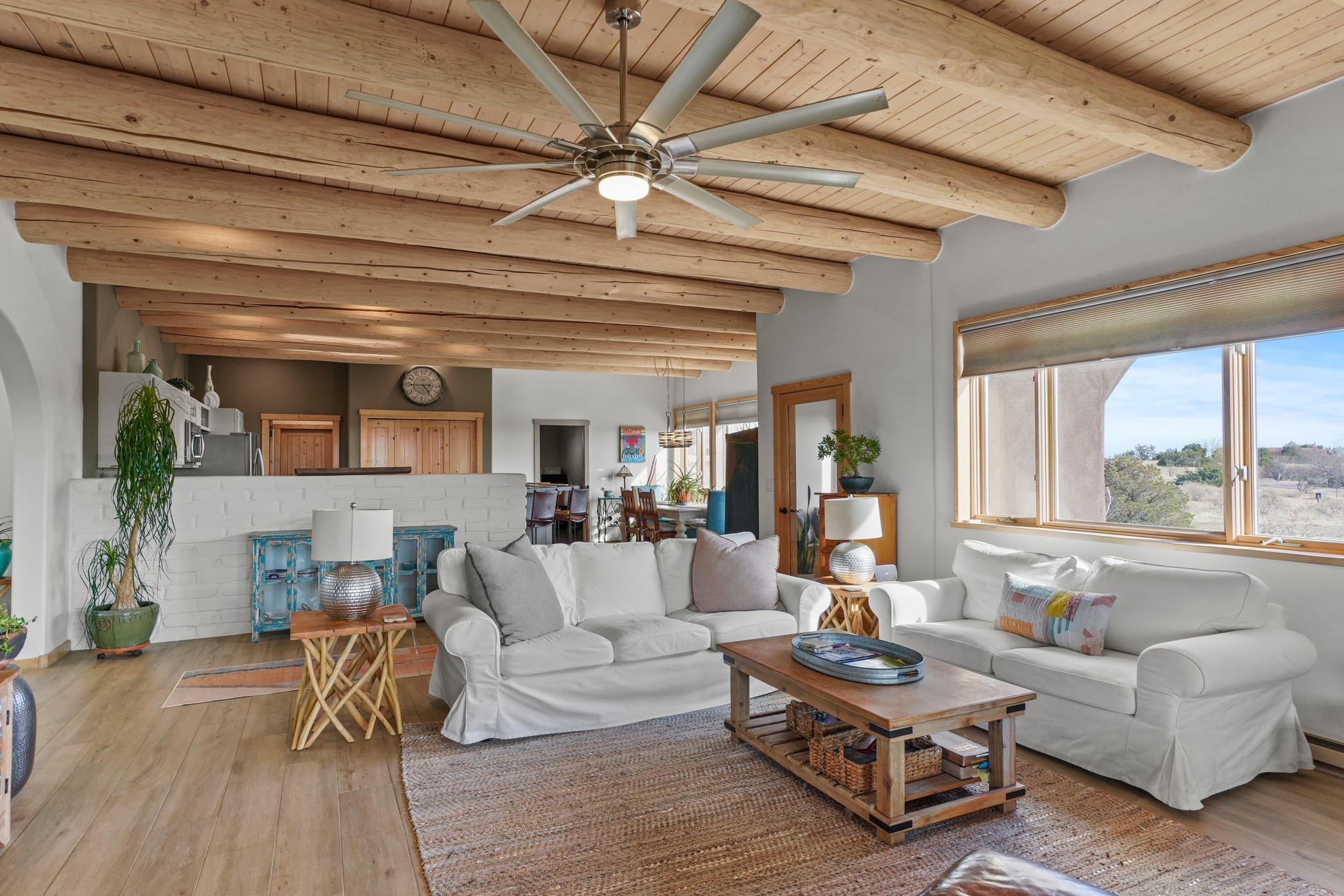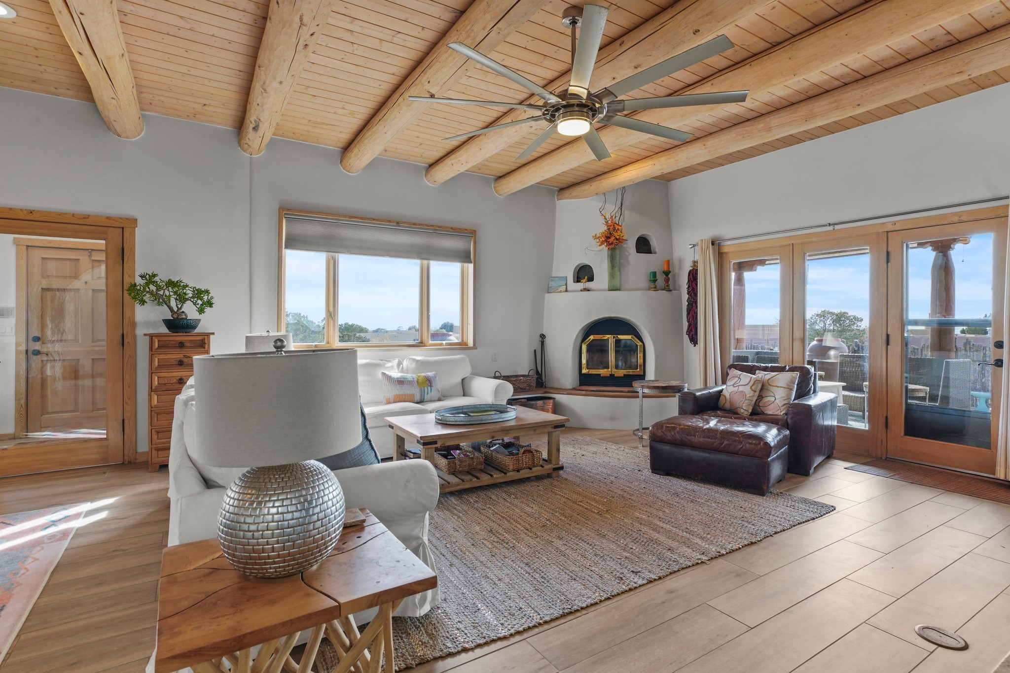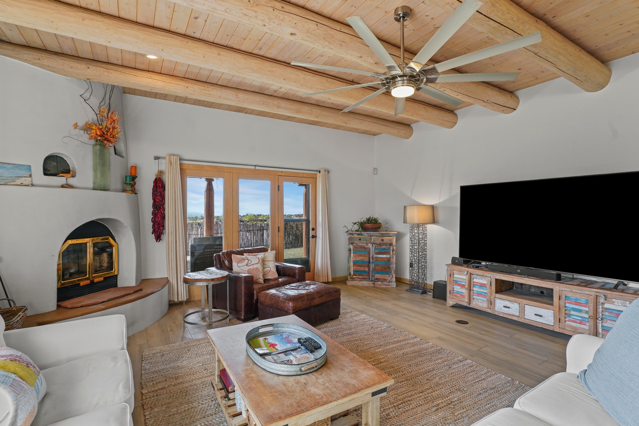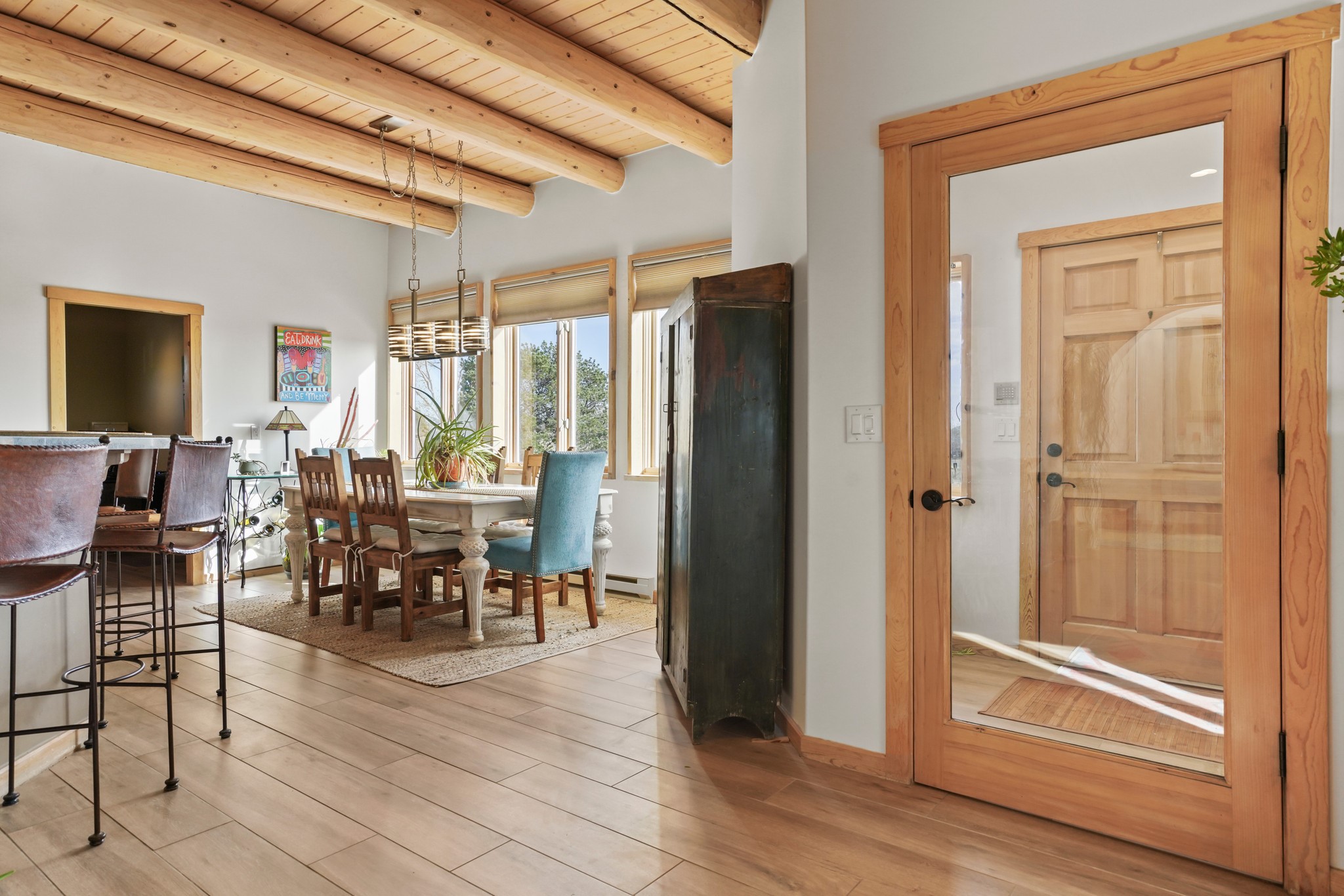 Welcome to this attractive passive solar home at 5 Puerto Road in the popular community of Eldorado, which is just a 15-minute drive south of the Santa Fe city limits. Located off of a quiet cul-de-sac and bordered by a spacious greenbelt, this gorgeous light-filled home on 2 acres is the one you've been waiting for.Upon entry you will notice the distinctive and appealing open floor plan design as the spacious kitchen opens to the living and dining rooms. You'll also enjoy the high ceilings with vigas in this single level home with beautifully-tiled flooring and no interior steps. The primary suite features clerestory windows, a walk-in closet, a separate, designated work or exercise area and direct access to the private outdoor hot tub! Additional and beneficial features are the newer photovoltaic solar panel system that significantly reduces the electric bill, trombe walls, a kiva fireplace and the oversized 2-car garage. The southwestern views of the Jemez, Ortiz and Sandia Mountains are magnificent. For the outdoor enthusiasts, Eldorado contains the best walking/biking paths and boasts one of the best outdoor swimming pools in Santa Fe County.