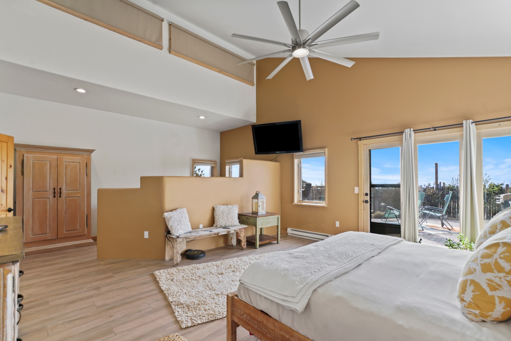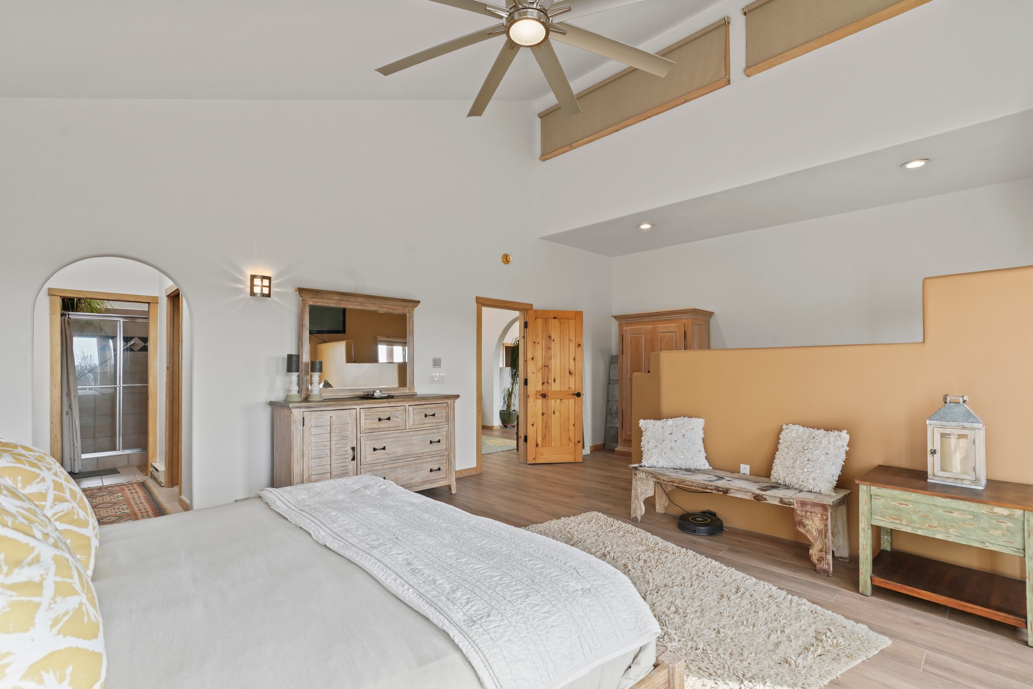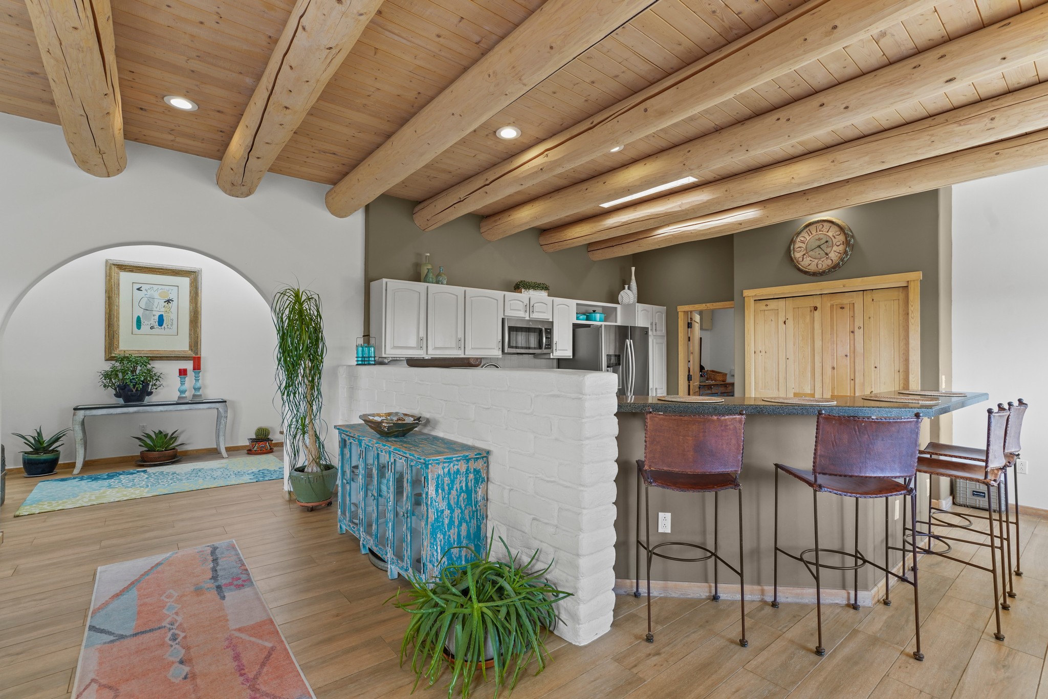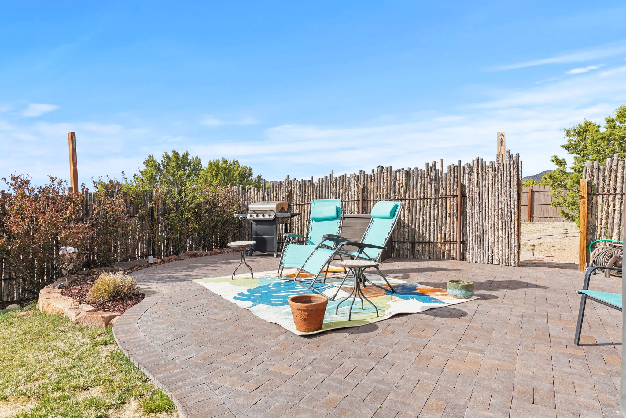Welcome to this attractive passive solar home at 5 Puerto Road in the popular community of Eldorado, which is just a 15-minute drive south of the Santa Fe city limits. Located off of a quiet cul-de-sac and bordered by a spacious greenbelt, this gorgeous light-filled home on 2 acres is the one you've been waiting for.Upon entry you will notice the distinctive and appealing open floor plan design as the spacious kitchen opens to the living and dining rooms. You'll also enjoy the high ceilings with vigas in this single level home with beautifully-tiled flooring and no interior steps. The primary suite features clerestory windows, a walk-in closet, a separate, designated work or exercise area and direct access to the private outdoor hot tub! Additional and beneficial features are the newer photovoltaic solar panel system that significantly reduces the electric bill, trombe walls, a kiva fireplace and the oversized 2-car garage. The southwestern views of the Jemez, Ortiz and Sandia Mountains are magnificent. For the outdoor enthusiasts, Eldorado contains the best walking/biking paths and boasts one of the best outdoor swimming pools in Santa Fe County.