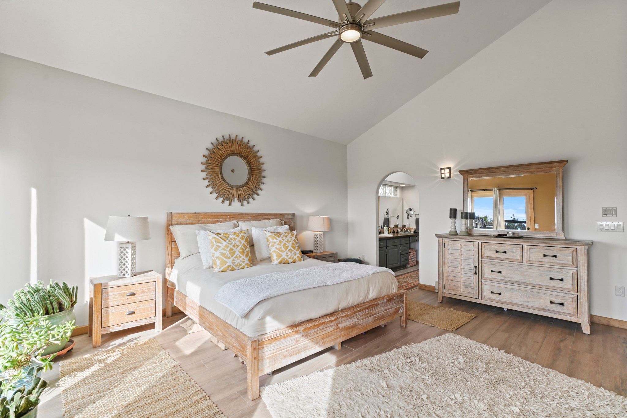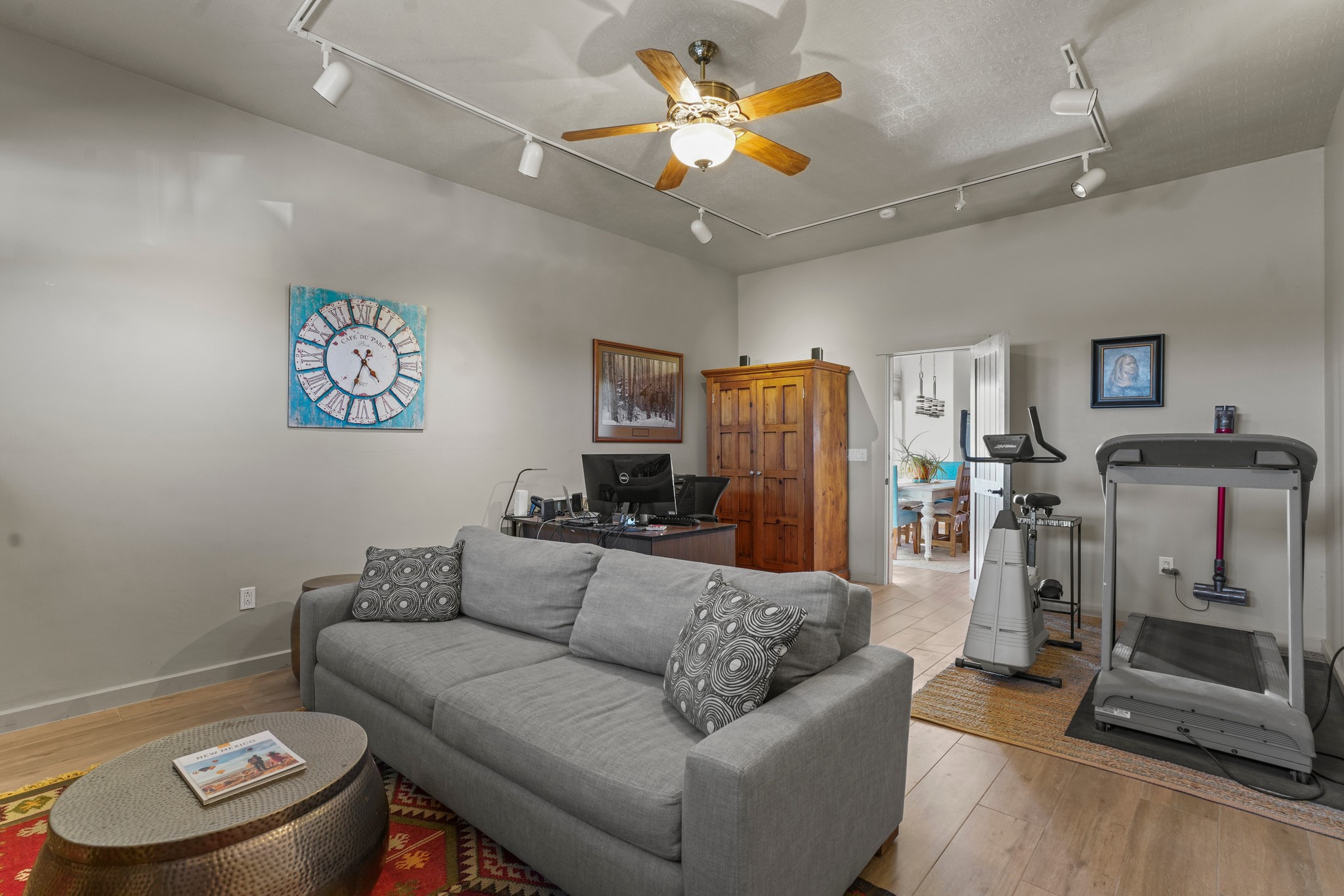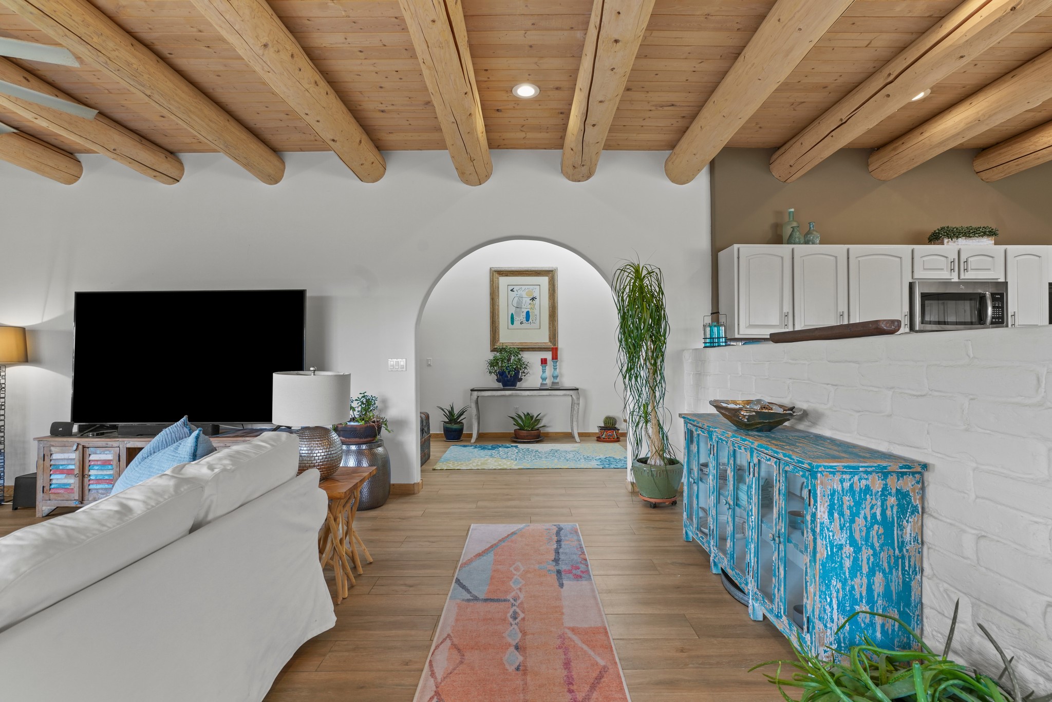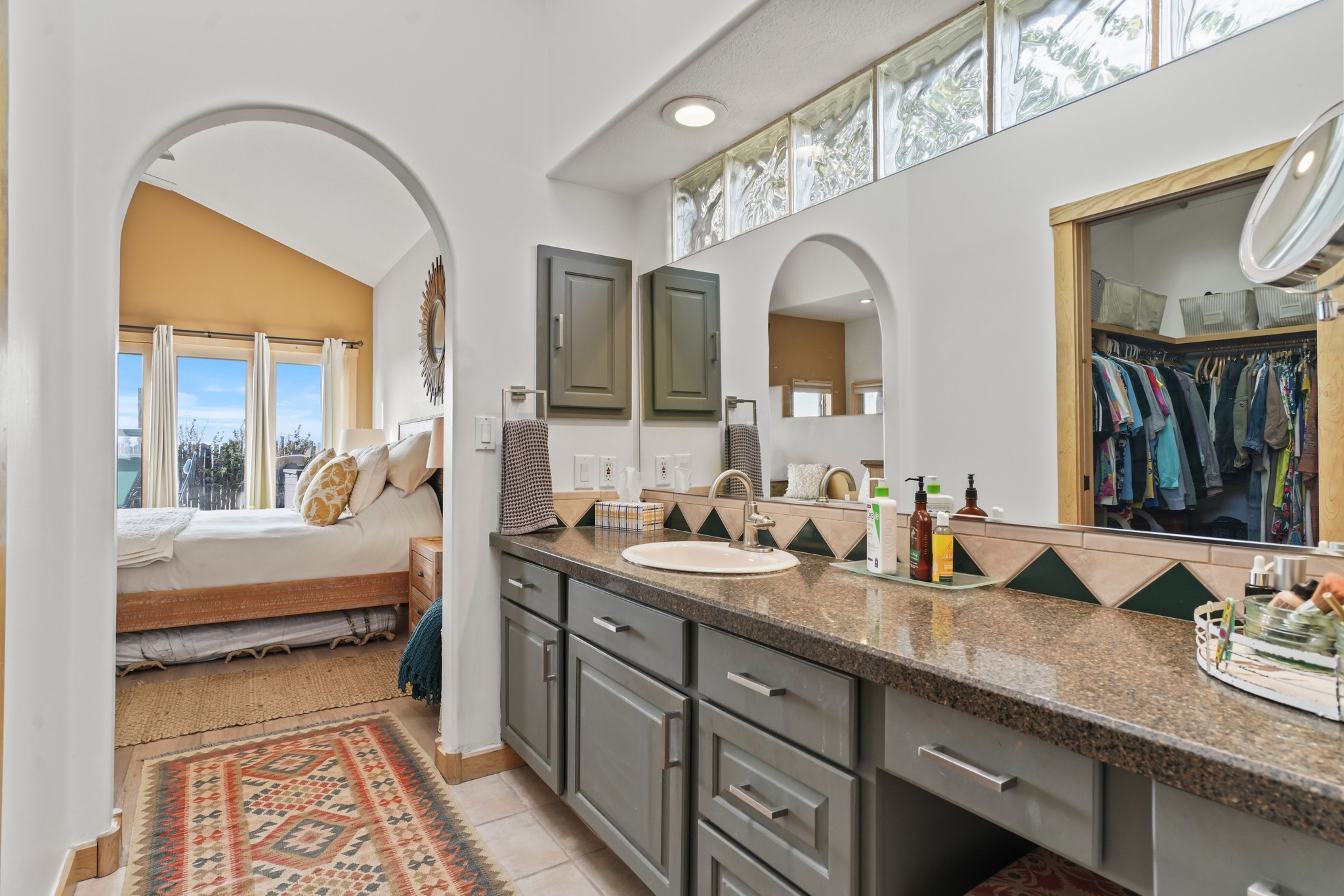 Welcome to this attractive passive solar home at 5 Puerto Road in the popular community of Eldorado, which is just a 15-minute drive south of the Santa Fe city limits. Located off of a quiet cul-de-sac and bordered by a spacious greenbelt, this gorgeous light-filled home on 2 acres is the one you've been waiting for.Upon entry you will notice the distinctive and appealing open floor plan design as the spacious kitchen opens to the living and dining rooms. You'll also enjoy the high ceilings with vigas in this single level home with beautifully-tiled flooring and no interior steps. The primary suite features clerestory windows, a walk-in closet, a separate, designated work or exercise area and direct access to the private outdoor hot tub! Additional and beneficial features are the newer photovoltaic solar panel system that significantly reduces the electric bill, trombe walls, a kiva fireplace and the oversized 2-car garage. The southwestern views of the Jemez, Ortiz and Sandia Mountains are magnificent. For the outdoor enthusiasts, Eldorado contains the best walking/biking paths and boasts one of the best outdoor swimming pools in Santa Fe County.