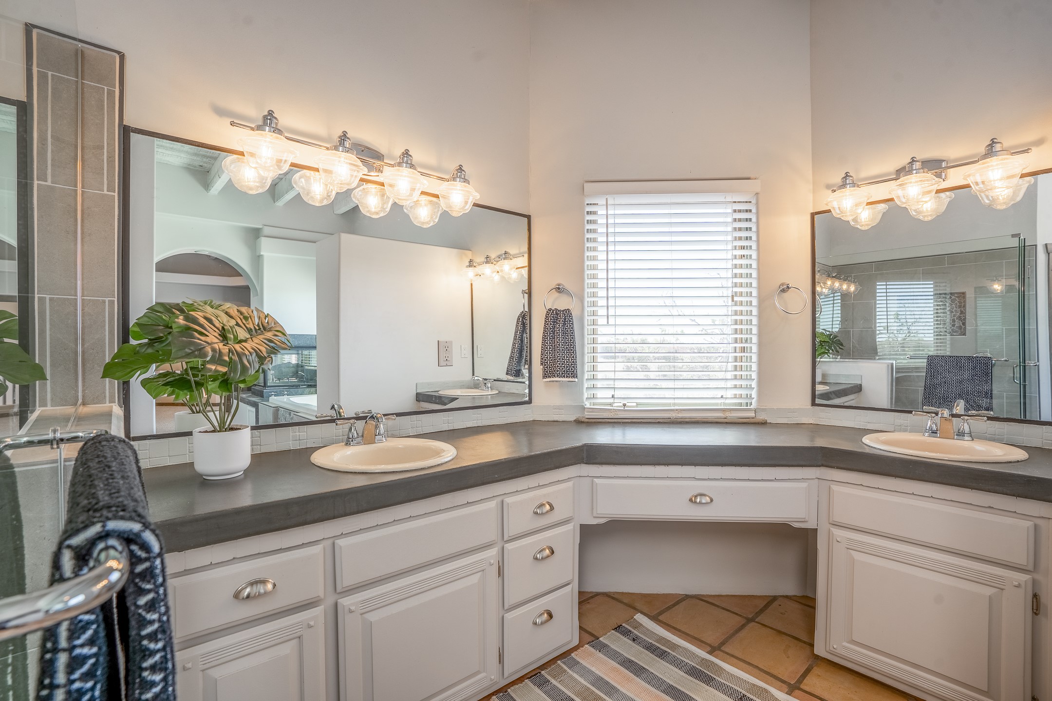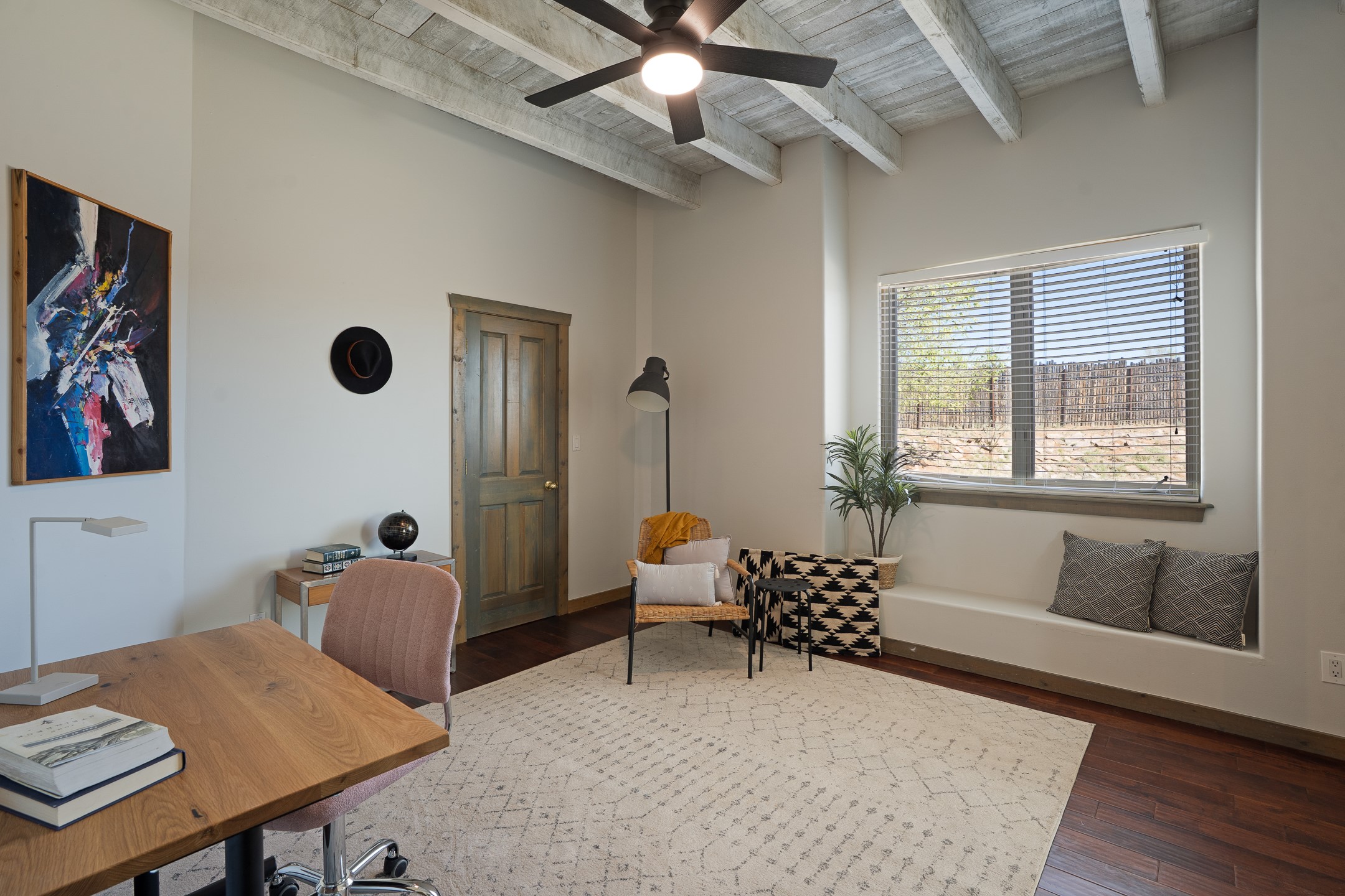 Located at the end of a quiet cul-de-sac in Eldorado, just a short walk from Eldorado Elementary and minutes from The Agora shopping center, this wonderful 4-bedroom, 3-bath home offers 3,294 square feet of comfortable living space on 2.3 acres. Nestled alongside a greenbelt, the property offers both privacy and versatility. The main level features two distinct living areas--one open to the newly renovated kitchen--along with a formal dining space and a guest bedroom currently serving as an office. The kitchen is a standout, showcasing concrete countertops with bar seating, custom tin-inlaid cabinetry, etched glass and tin lighting fixtures, and stainless steel appliances. From here, step outside to a fully fenced backyard complete with an outdoor kiva fireplace and generous space for entertaining or relaxing under the New Mexico sky.Upstairs, the expansive primary suite offers both East- and West-facing balconies, a cozy double-sided gas fireplace, deep soaking tub, glass-enclosed walk-in shower, and dual walk-in closets. Two additional guest bedrooms--each with their own private balcony--and a full guest bath complete the upper level. Recent upgrades include an 18-panel solar array, a new TPO roof with a transferable warranty, a tankless water heater, and a dedicated 30-amp service for RV power. Seamlessly blending modern updates with Southwestern charm, this home offers spacious, serene living in one of Santa Fe's most desirable communities.