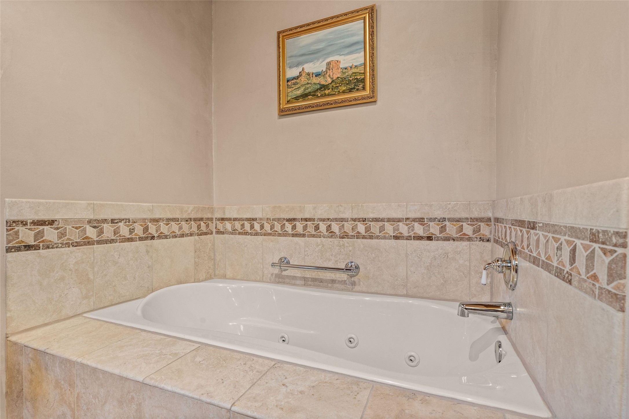 This stunning single-level home features four spacious bedrooms and two and a half baths, all designed without any interior steps for seamless accessibility. The home showcases elegant plastered walls and traditional vigas throughout, creating a warm and inviting atmosphere perfect for entertaining. A gated entry leads you to a welcoming courtyard, while the enclosed sunroom, complete with a wood-burning fireplace, offers a perfect space for relaxation. The gourmet kitchen is a chef's dream, featuring a center island, breakfast bar, Wolf range, and Miele dishwasher, all set on luxurious travertine floors that flow effortlessly throughout the home. The primary suite not only includes a deep jacuzzi tub and fireplace but also grants access to the sunroom, enhancing the living experience. Guests will appreciate the custom Murphy bed in one of the bedrooms, which can easily transform into an office or studio space as needed. Custom Santa Fe awning covers for the skylights modulate climate control during summer months. Enjoy breathtaking sunsets and picturesque views of the Jemez Mountains right from your backyard. Outdoor enthusiasts will appreciate the proximity to La Tierra's extensive walking and hiking trail systems, making it easy to explore the natural beauty of the area. Additionally, this prime location is just a quick drive away from the vibrant downtown plaza, the renowned Canyon Road, and the Santa Fe Opera.