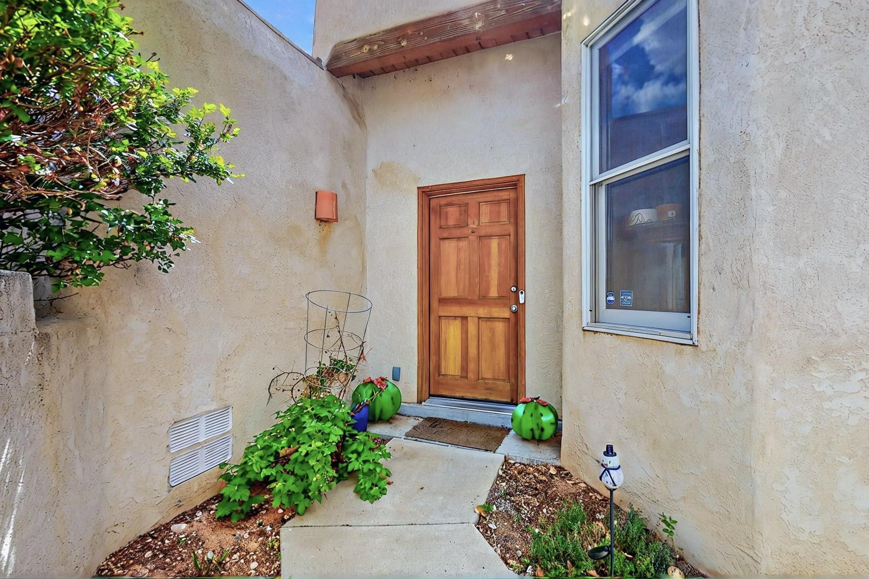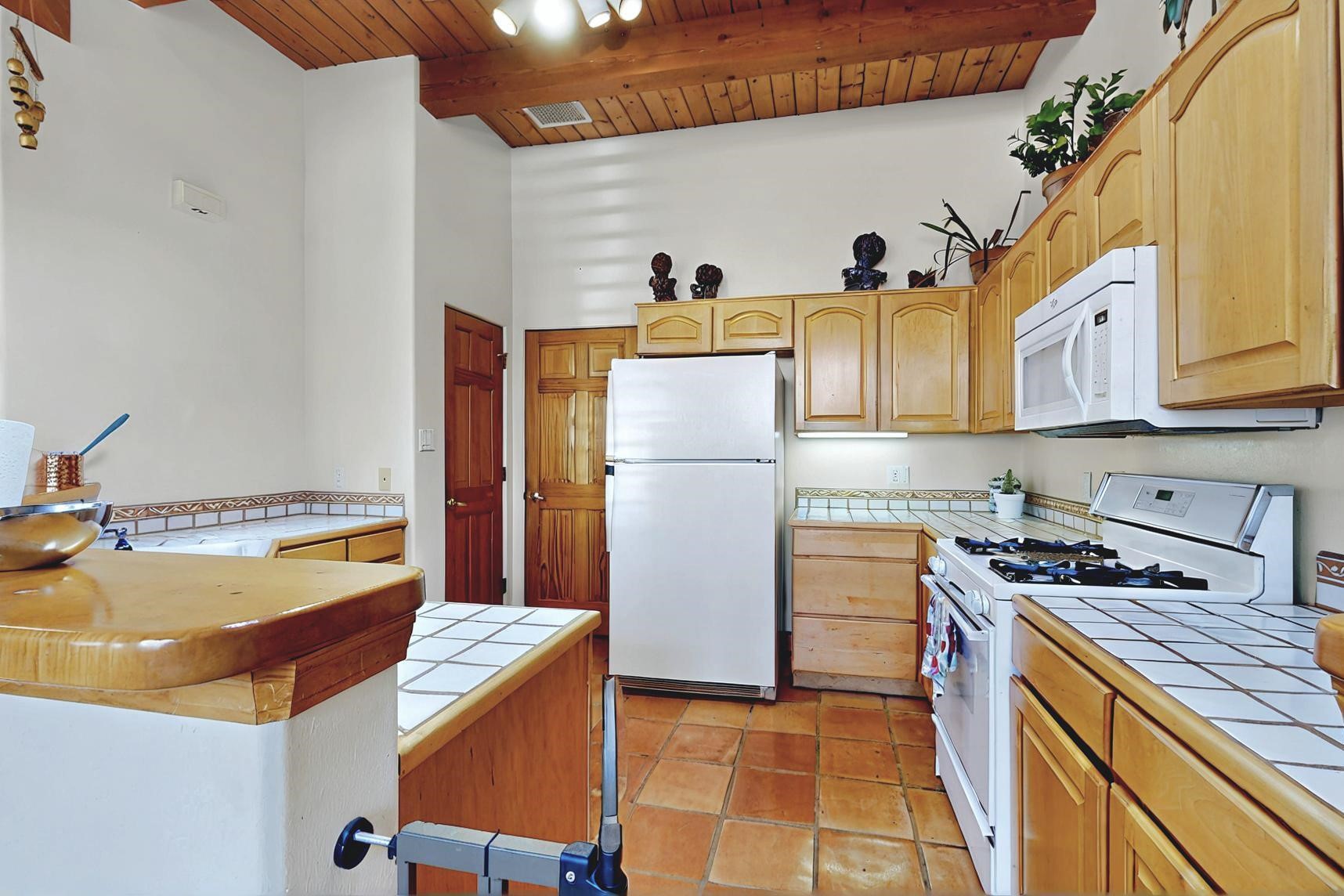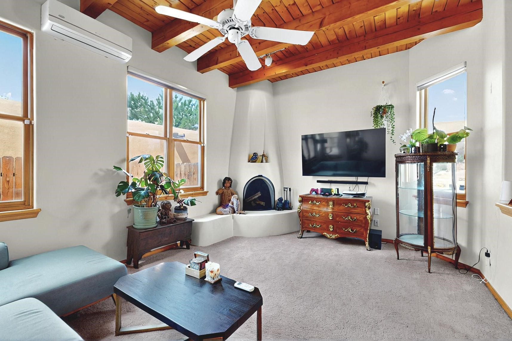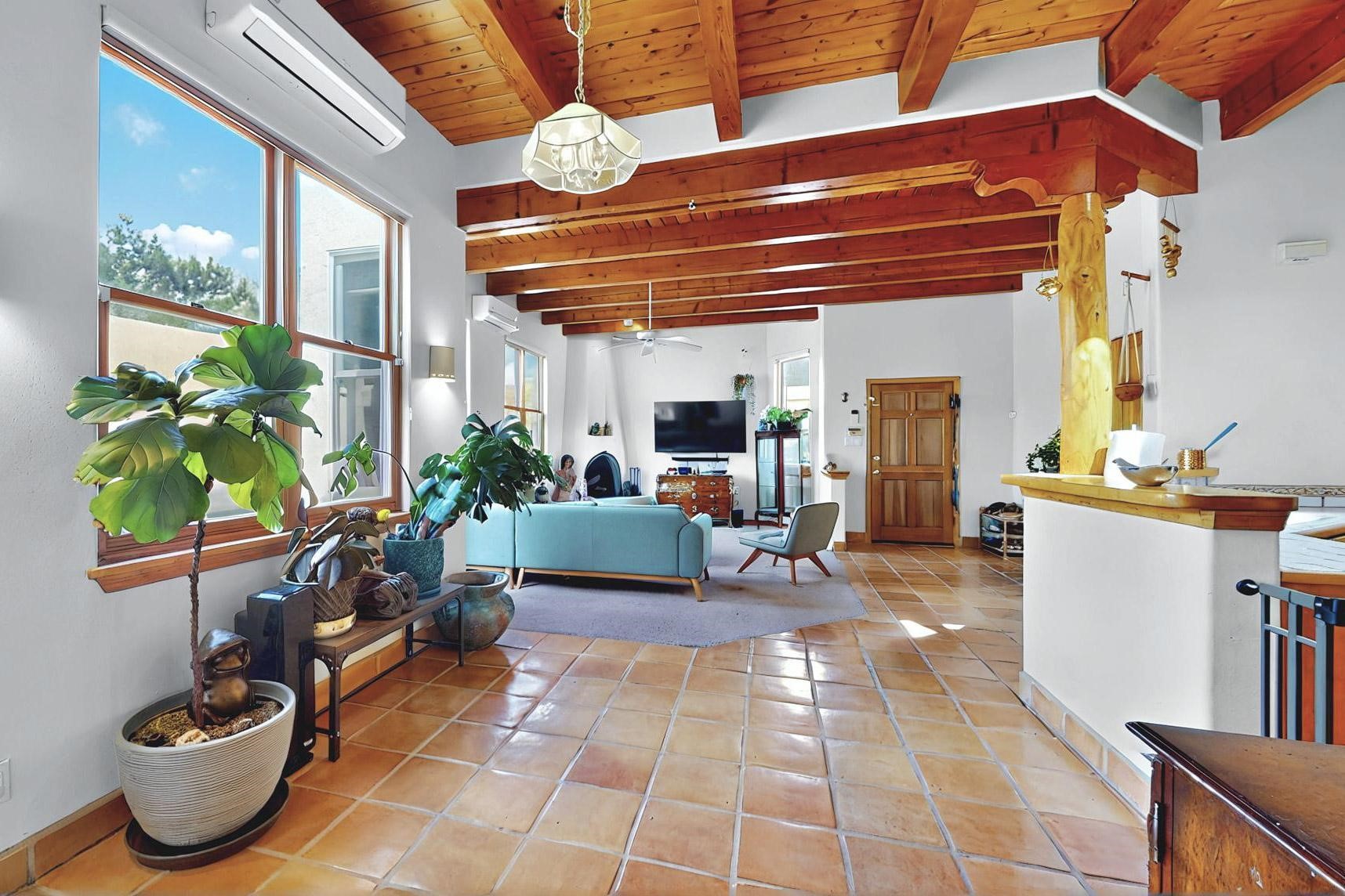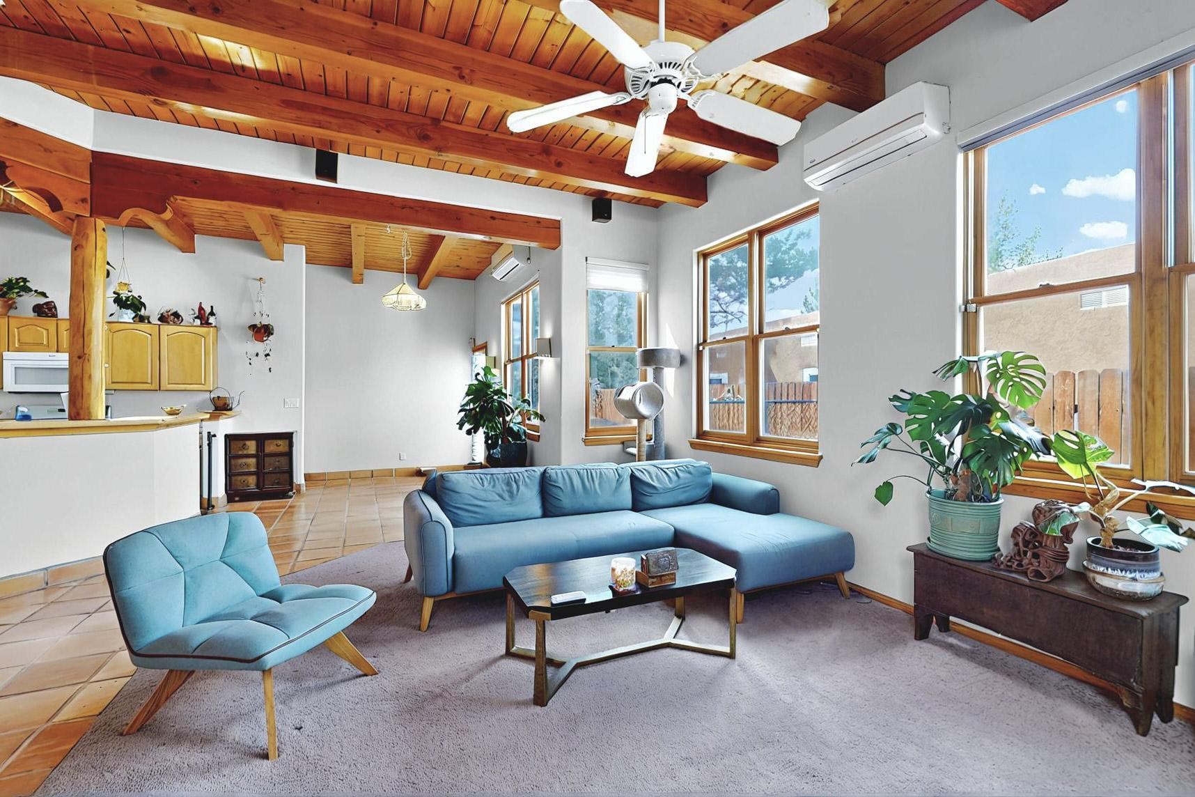 Great 2-bedroom + office/studio, 2-bath home tucked in a charming, secluded Plaza de Castillo that backs up to the Arroyo Chamisos Trail for walking/biking! This 1533-sq.ft, single-story home features an open floor plan, tall beamed ceiling with tongue/groove in living, kitchen, and dining areas, 2-kiva fireplaces, saltillo tile floors in entry, kitchen, dining areas, and both bathrooms, skylights in kitchen and bathrooms, and double-hung windows. The kitchen has maple cabinets, a gas range/oven, and a microwave. The primary bedroom has a large walk-in closet, and you can go out the back door to a covered back patio with a new 50 amp outlet at 220 volts for a hot tub! Five-year heating/cooling system, water heater, and roof. Nicely landscaped with mature trees and bushes. Get ready with your ideas! Easy access to shopping, schools, and the Genoveva Chavez Community Center.