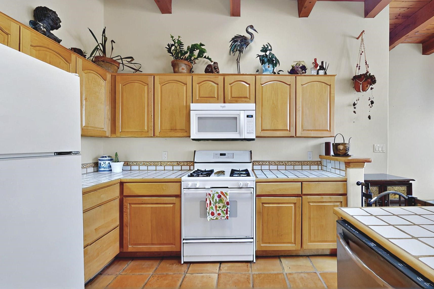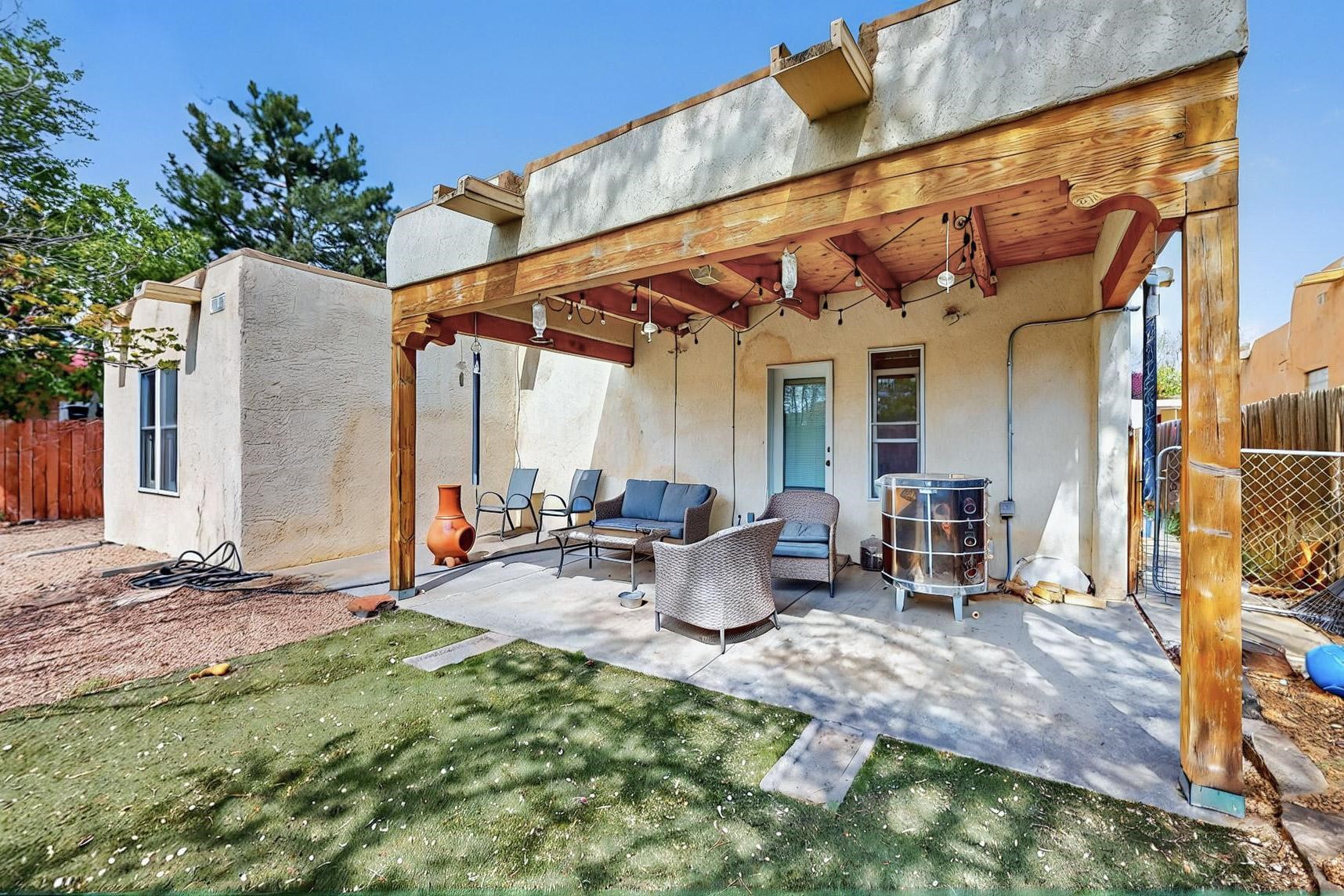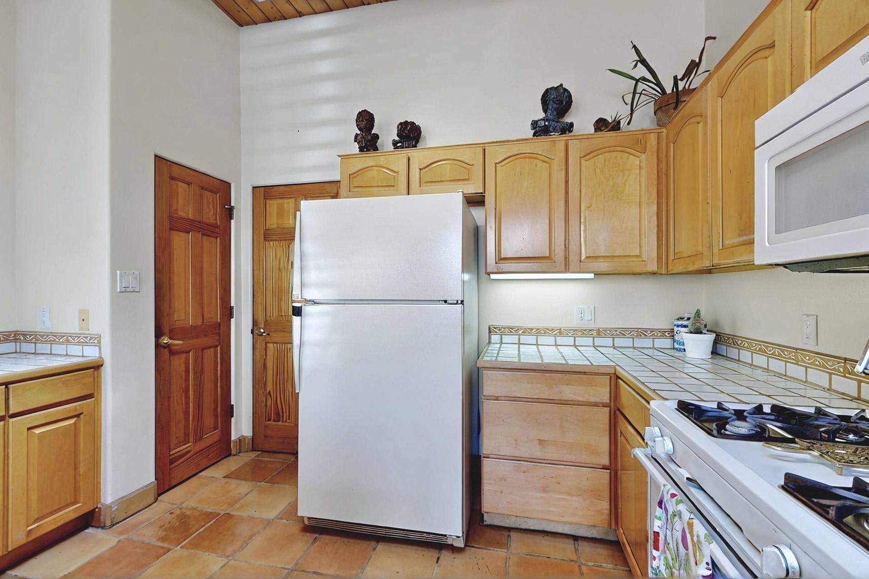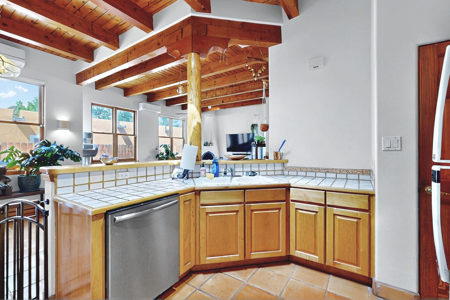 Great 2-bedroom + office/studio, 2-bath home tucked in a charming, secluded Plaza de Castillo that backs up to the Arroyo Chamisos Trail for walking/biking! This 1533-sq.ft, single-story home features an open floor plan, tall beamed ceiling with tongue/groove in living, kitchen, and dining areas, 2-kiva fireplaces, saltillo tile floors in entry, kitchen, dining areas, and both bathrooms, skylights in kitchen and bathrooms, and double-hung windows. The kitchen has maple cabinets, a gas range/oven, and a microwave. The primary bedroom has a large walk-in closet, and you can go out the back door to a covered back patio with a new 50 amp outlet at 220 volts for a hot tub! Five-year heating/cooling system, water heater, and roof. Nicely landscaped with mature trees and bushes. Get ready with your ideas! Easy access to shopping, schools, and the Genoveva Chavez Community Center.