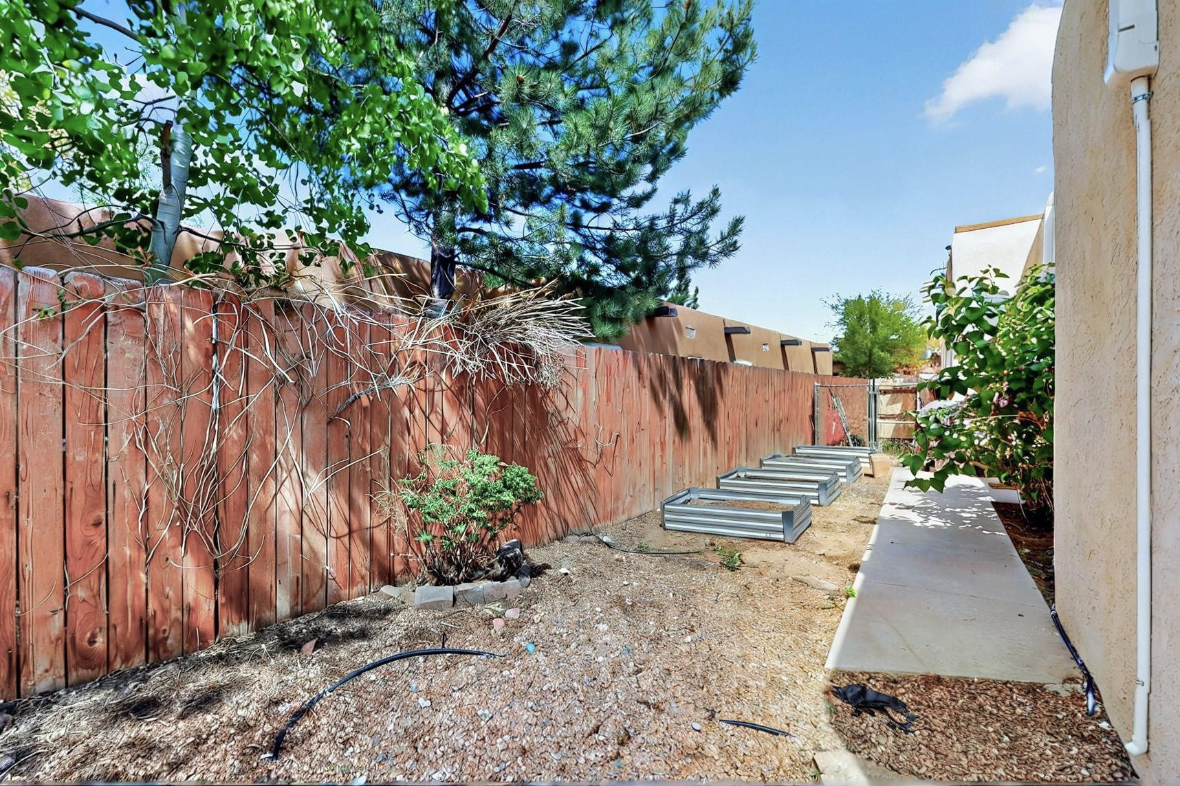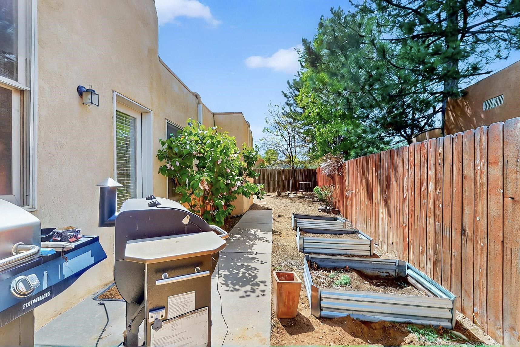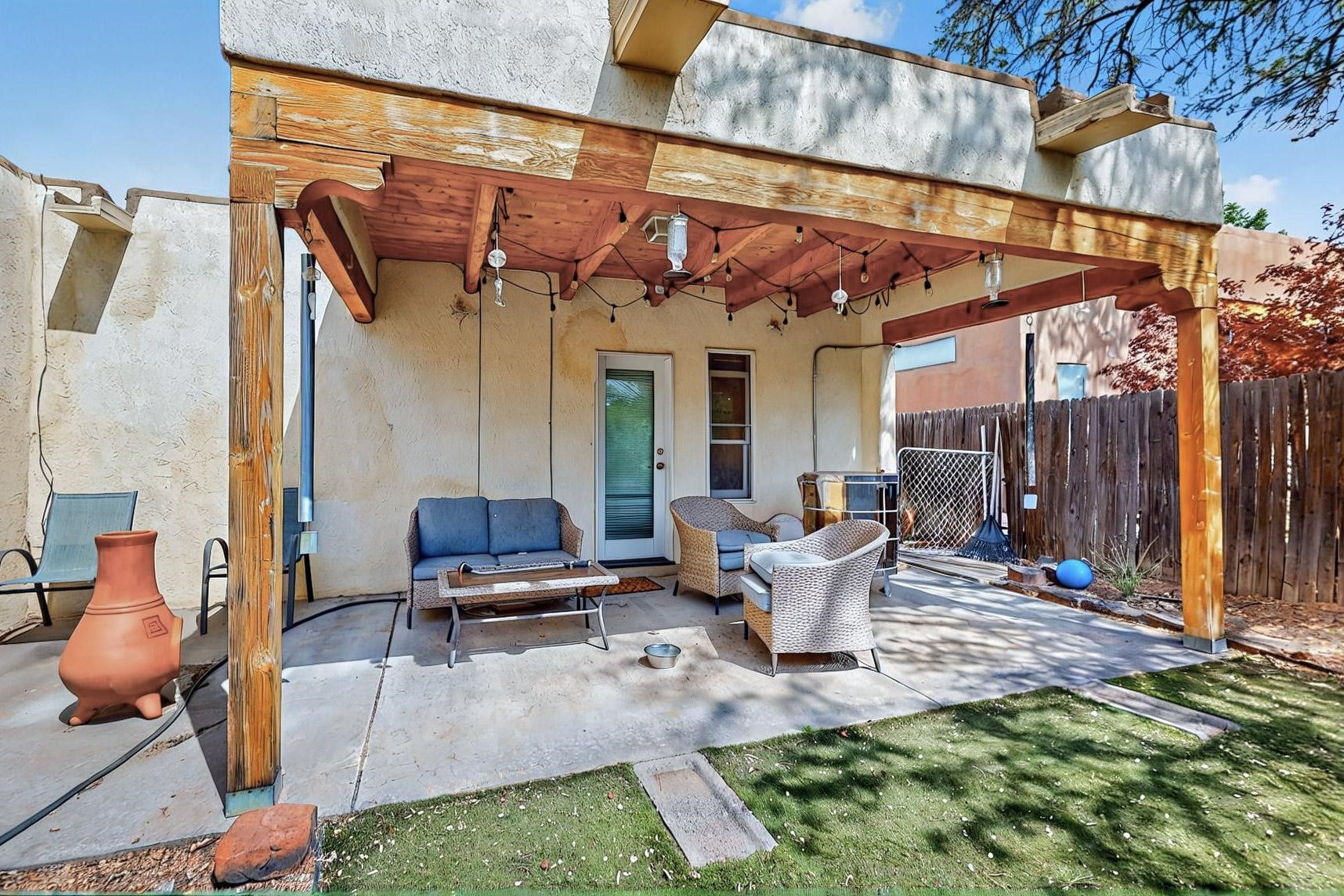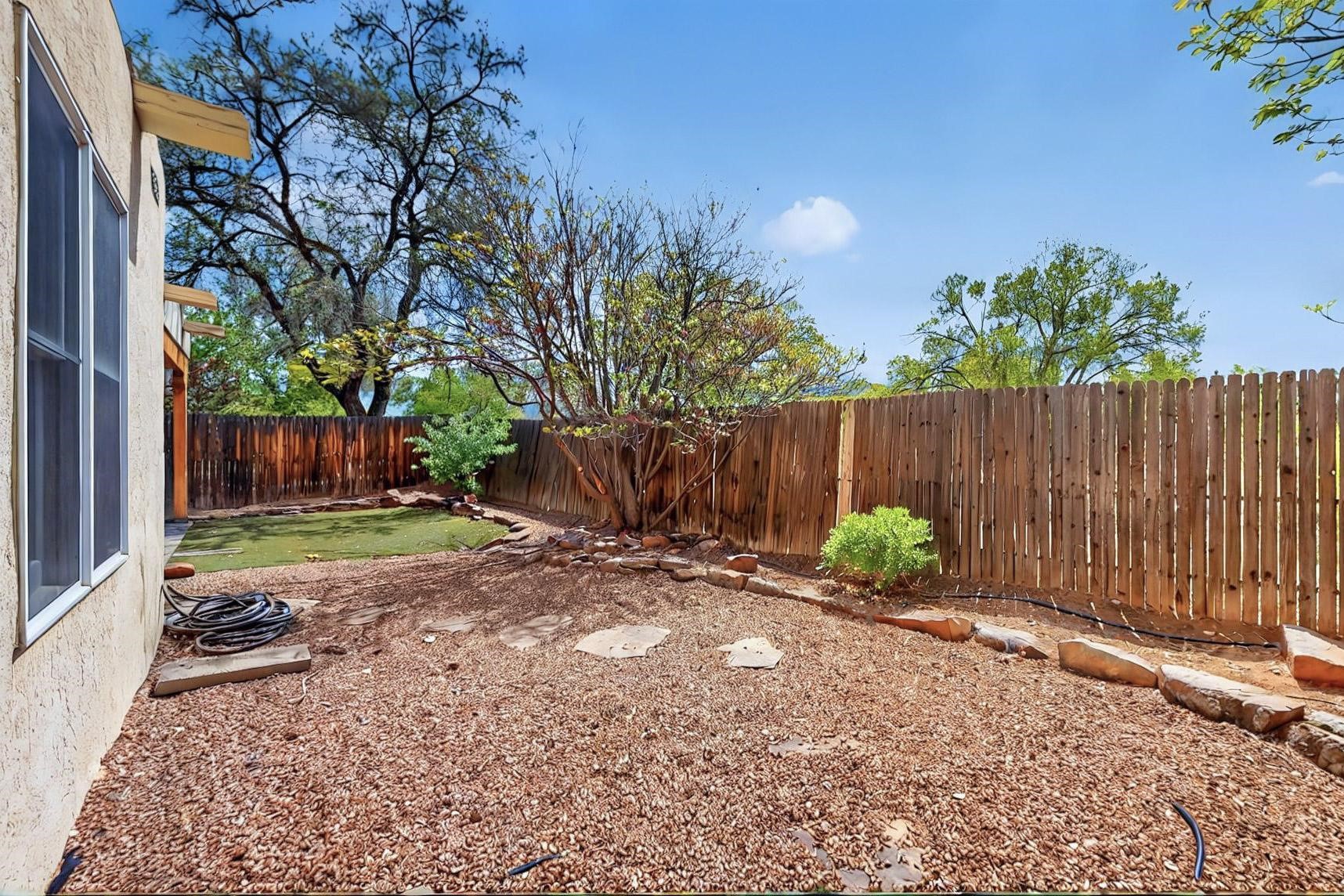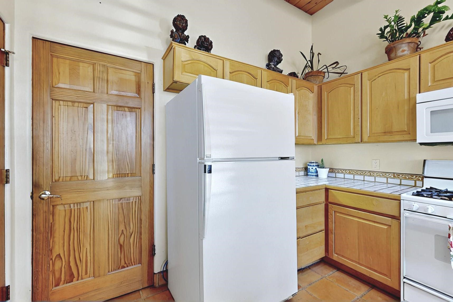 Great 2-bedroom + office/studio, 2-bath home tucked in a charming, secluded Plaza de Castillo that backs up to the Arroyo Chamisos Trail for walking/biking! This 1533-sq.ft, single-story home features an open floor plan, tall beamed ceiling with tongue/groove in living, kitchen, and dining areas, 2-kiva fireplaces, saltillo tile floors in entry, kitchen, dining areas, and both bathrooms, skylights in kitchen and bathrooms, and double-hung windows. The kitchen has maple cabinets, a gas range/oven, and a microwave. The primary bedroom has a large walk-in closet, and you can go out the back door to a covered back patio with a new 50 amp outlet at 220 volts for a hot tub! Five-year heating/cooling system, water heater, and roof. Nicely landscaped with mature trees and bushes. Get ready with your ideas! Easy access to shopping, schools, and the Genoveva Chavez Community Center.