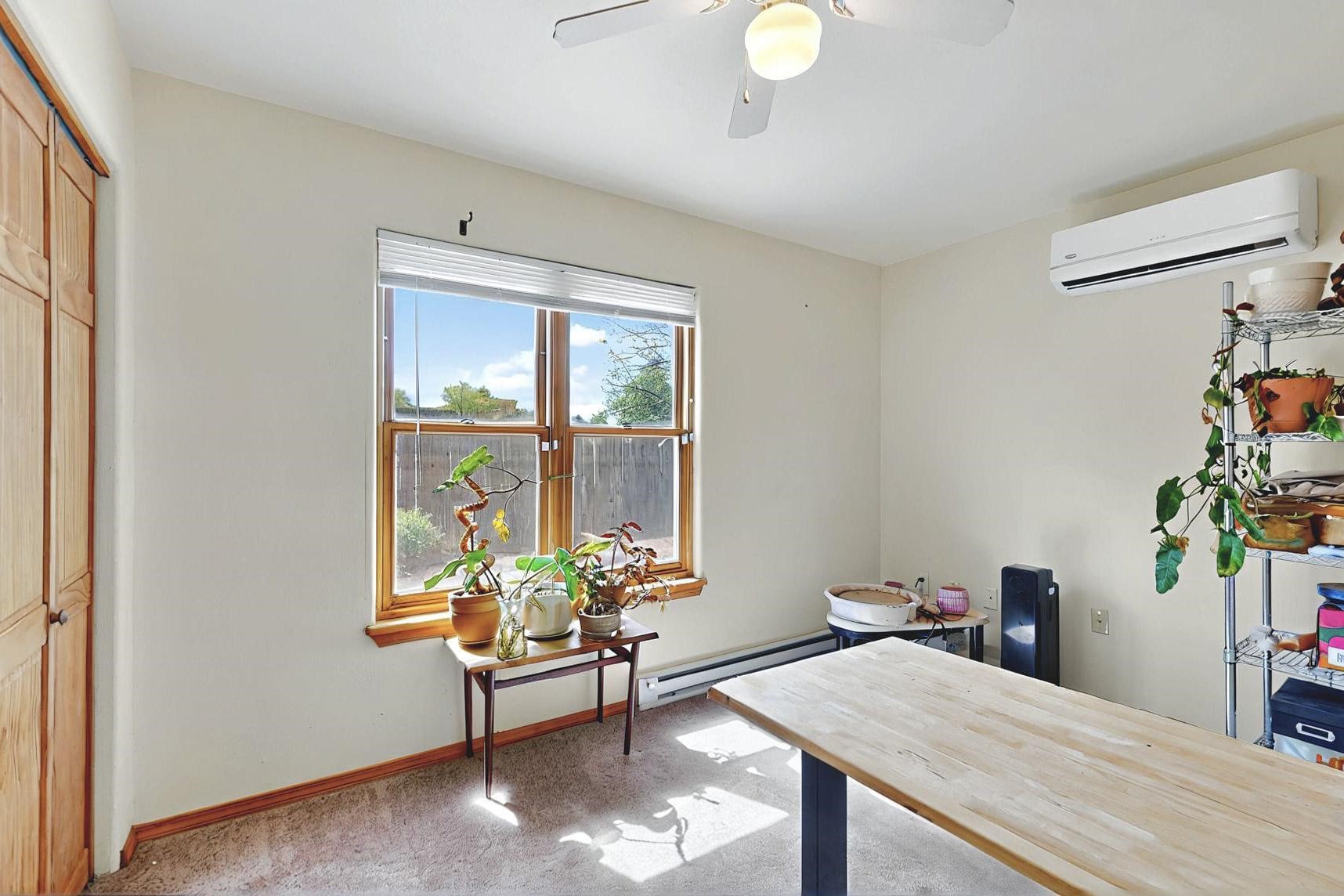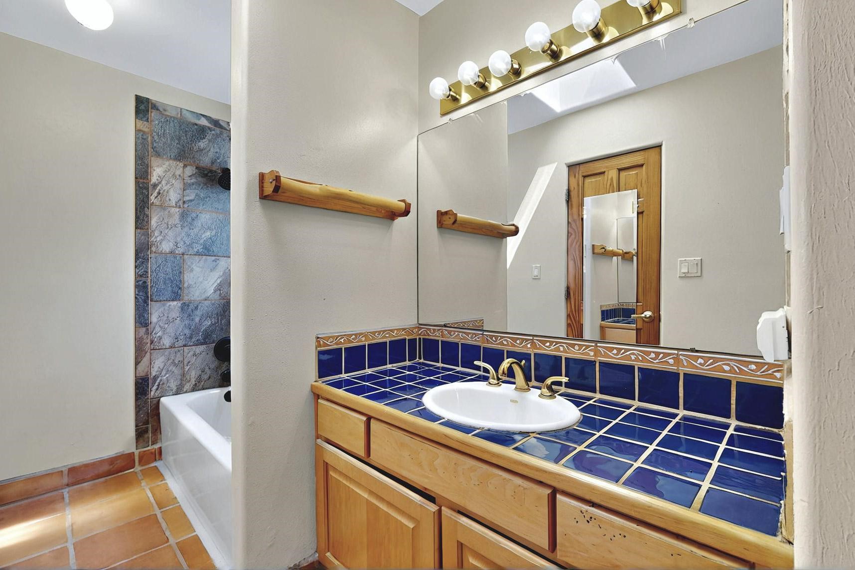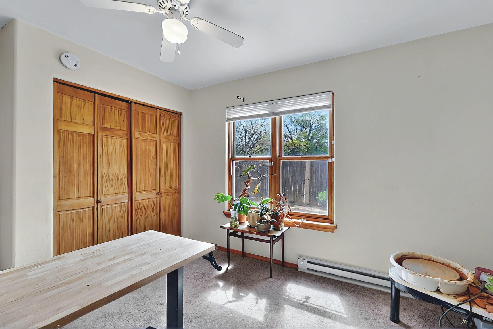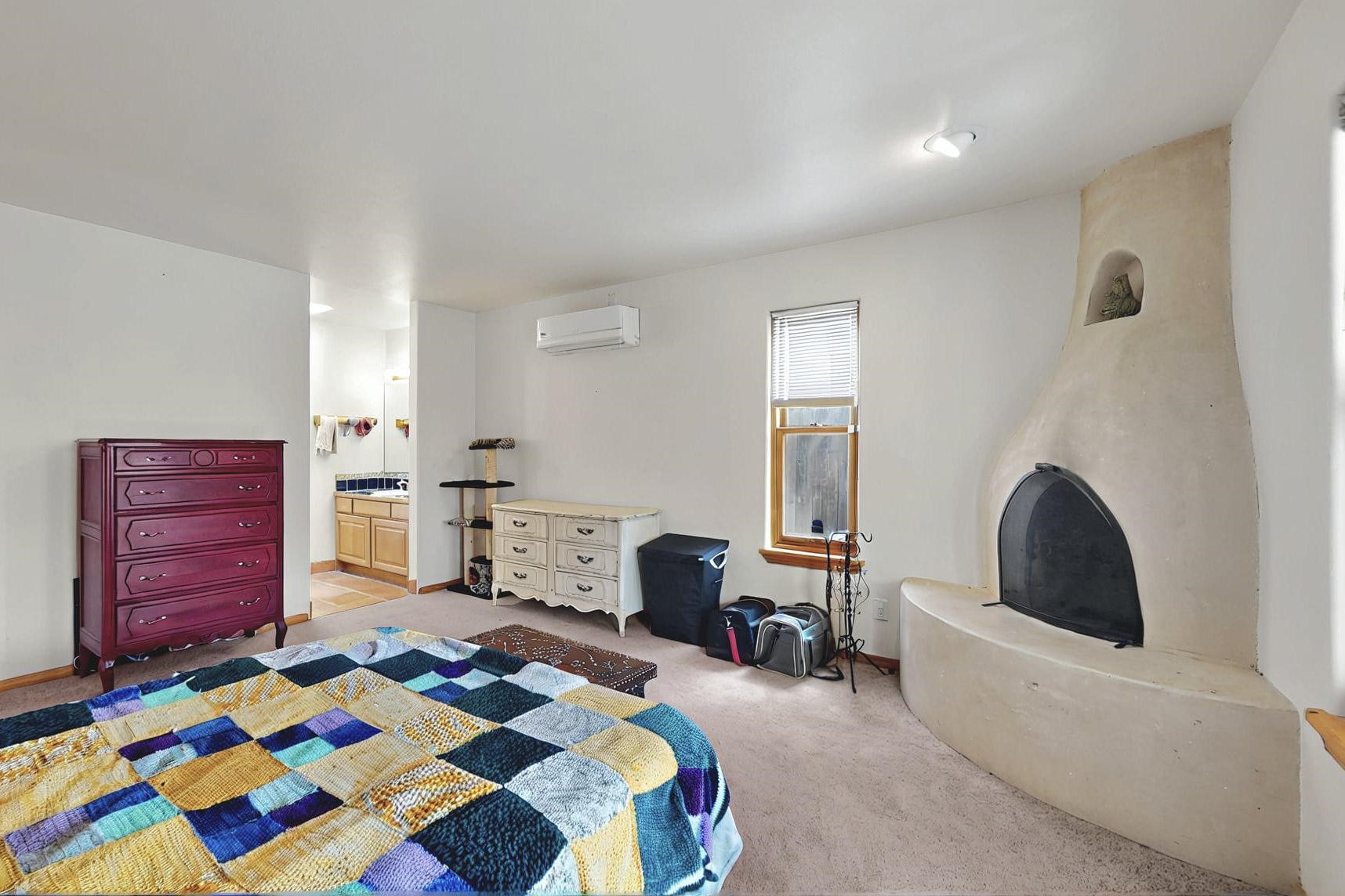 Great 2-bedroom + office/studio, 2-bath home tucked in a charming, secluded Plaza de Castillo that backs up to the Arroyo Chamisos Trail for walking/biking! This 1533-sq.ft, single-story home features an open floor plan, tall beamed ceiling with tongue/groove in living, kitchen, and dining areas, 2-kiva fireplaces, saltillo tile floors in entry, kitchen, dining areas, and both bathrooms, skylights in kitchen and bathrooms, and double-hung windows. The kitchen has maple cabinets, a gas range/oven, and a microwave. The primary bedroom has a large walk-in closet, and you can go out the back door to a covered back patio with a new 50 amp outlet at 220 volts for a hot tub! Five-year heating/cooling system, water heater, and roof. Nicely landscaped with mature trees and bushes. Get ready with your ideas! Easy access to shopping, schools, and the Genoveva Chavez Community Center.