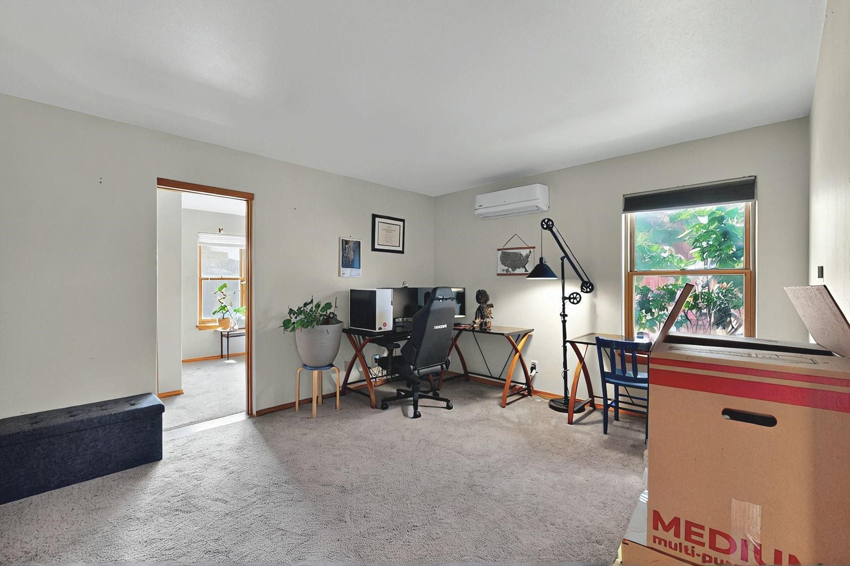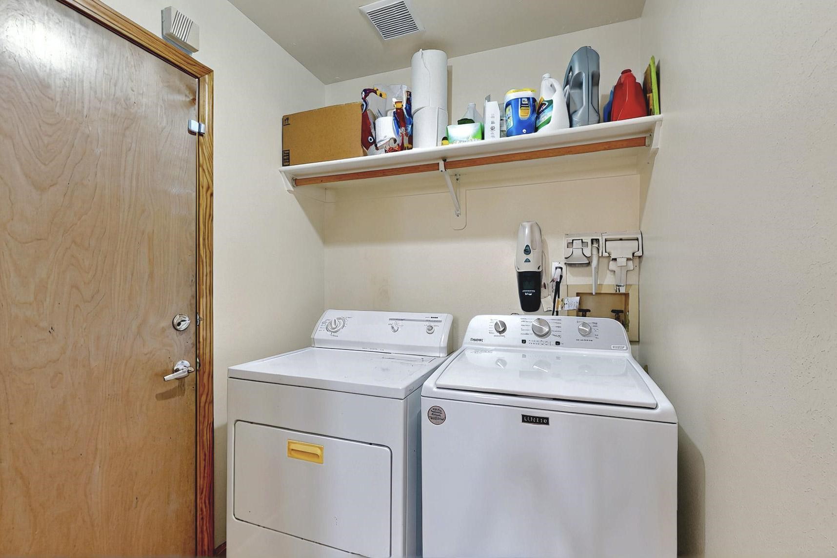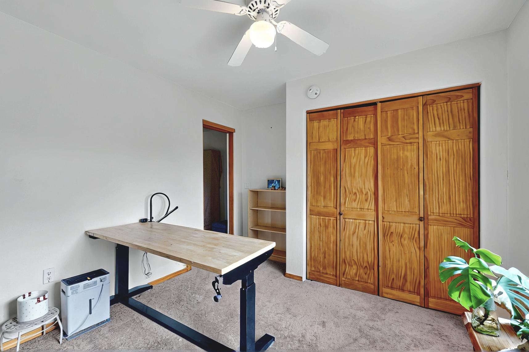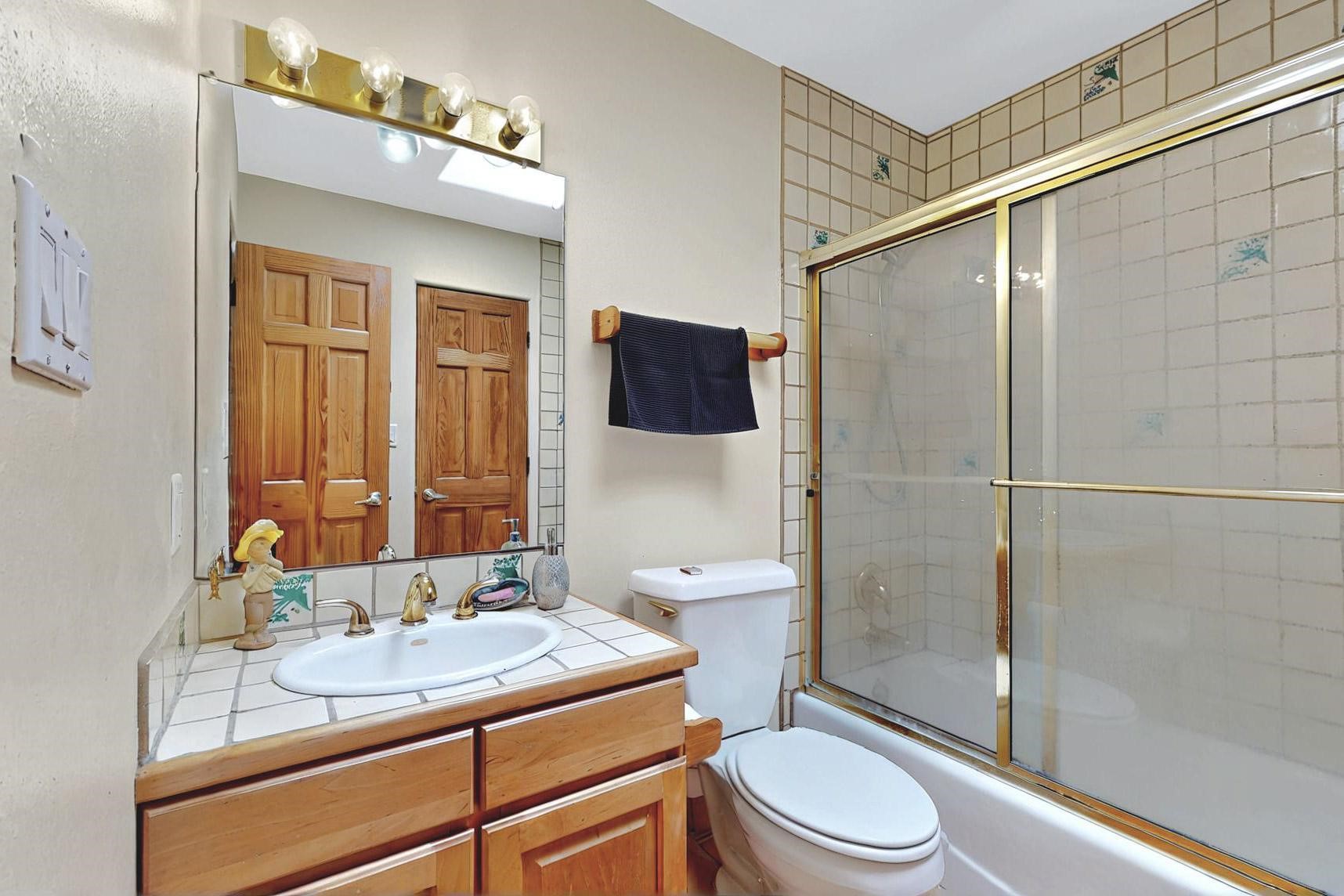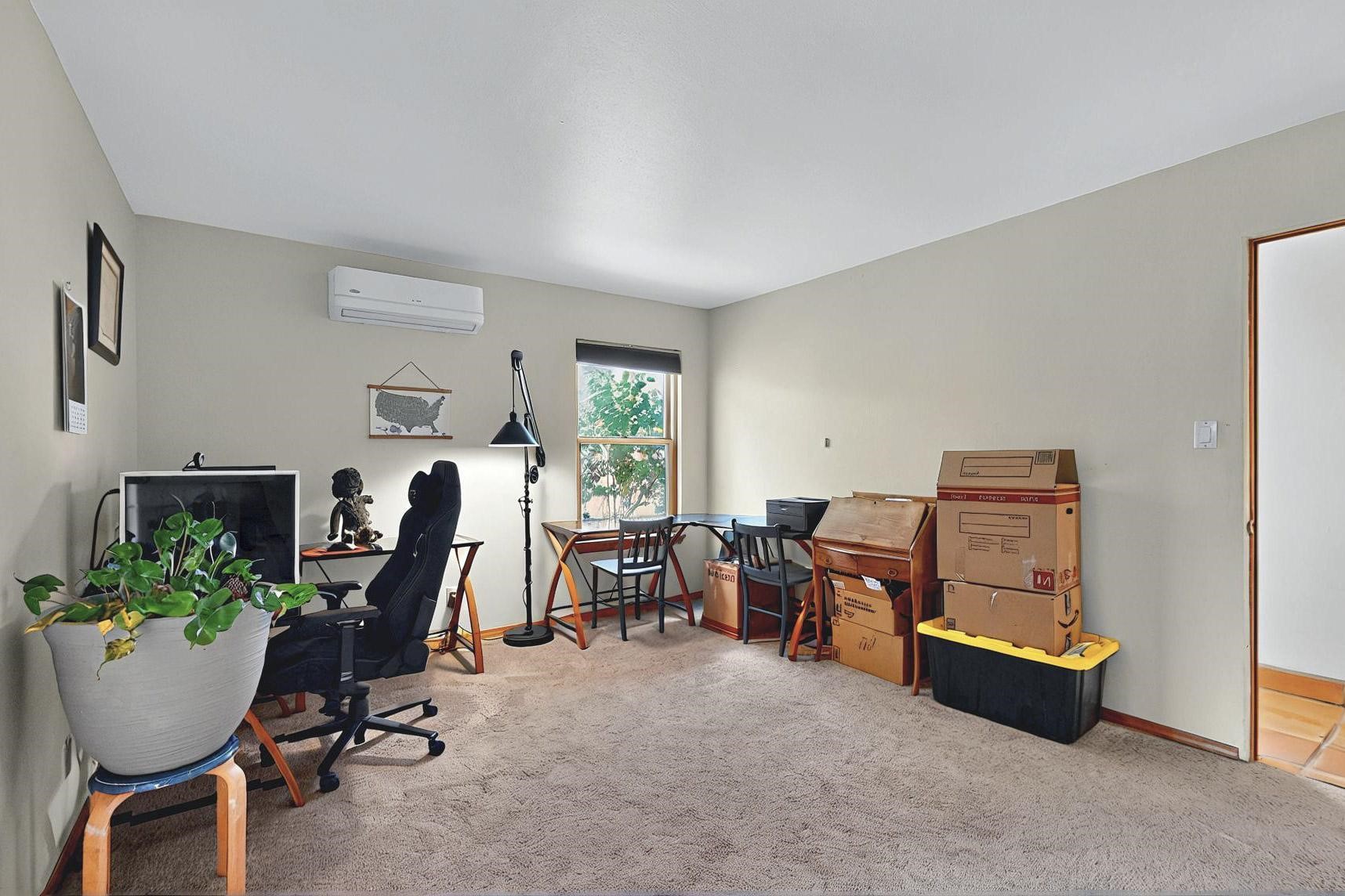 Great 2-bedroom + office/studio, 2-bath home tucked in a charming, secluded Plaza de Castillo that backs up to the Arroyo Chamisos Trail for walking/biking! This 1533-sq.ft, single-story home features an open floor plan, tall beamed ceiling with tongue/groove in living, kitchen, and dining areas, 2-kiva fireplaces, saltillo tile floors in entry, kitchen, dining areas, and both bathrooms, skylights in kitchen and bathrooms, and double-hung windows. The kitchen has maple cabinets, a gas range/oven, and a microwave. The primary bedroom has a large walk-in closet, and you can go out the back door to a covered back patio with a new 50 amp outlet at 220 volts for a hot tub! Five-year heating/cooling system, water heater, and roof. Nicely landscaped with mature trees and bushes. Get ready with your ideas! Easy access to shopping, schools, and the Genoveva Chavez Community Center.