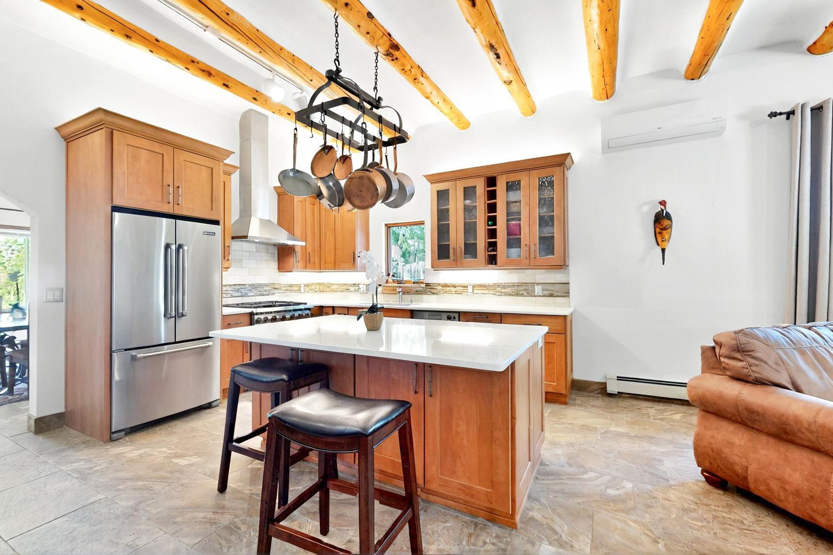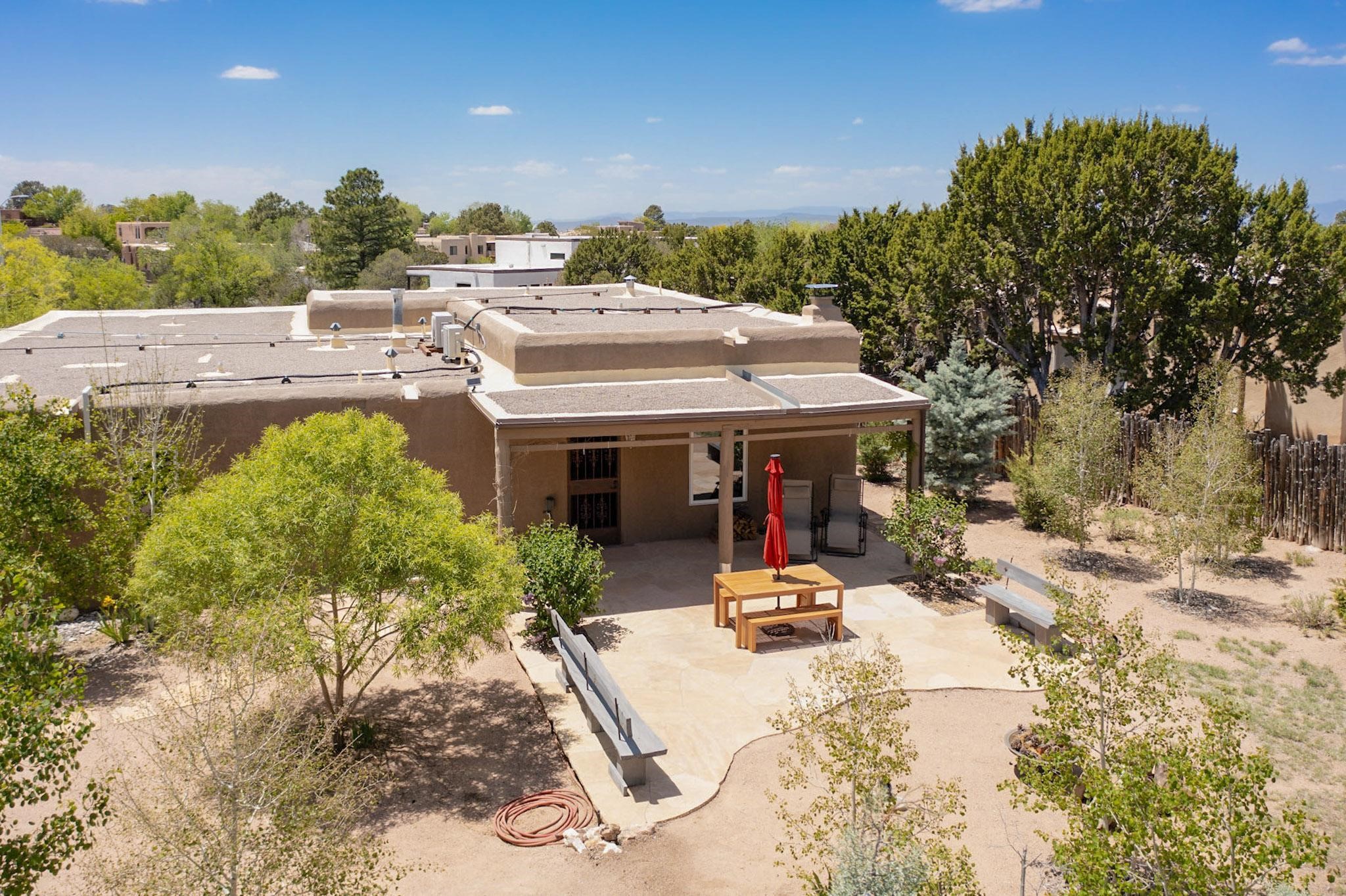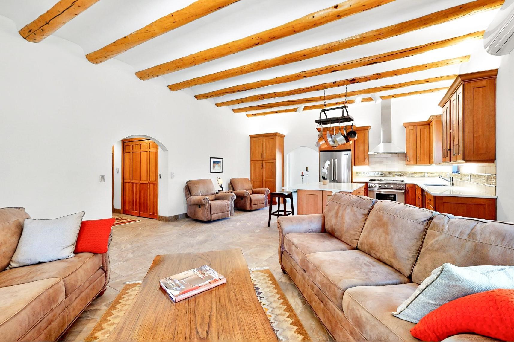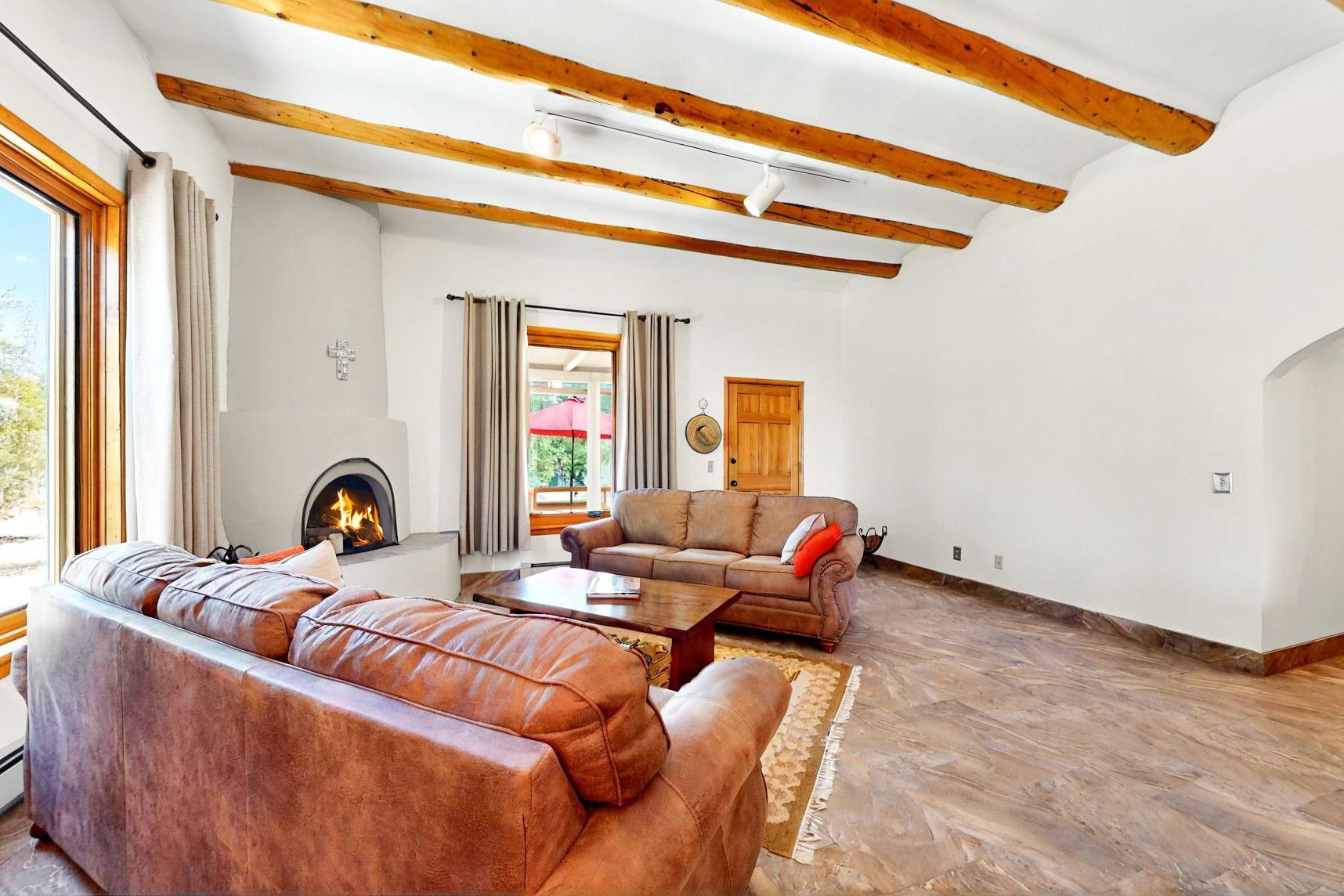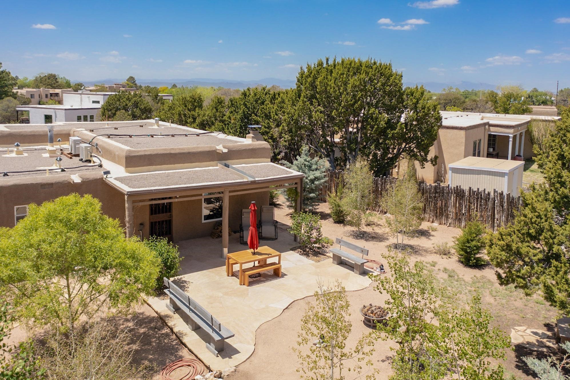 Discover this beautifully updated, move-in-ready single-level custom pueblo-style home in the desirable Villa Caballero subdivision. Ideally located less than 15 minutes from the Historic Santa Fe Plaza and close to parks, trails, and local amenities, this 3-bedroom, 2-bathroom residence offers 2,072 sq ft of comfortable living space on a spacious and gorgeous 0.28-acre lot. Tucked away in a quiet cul- de-sac, the home blends comfort, convenience, and tranquility. Step inside to soaring 11-foot ceilings that enhance the airy, open feel of the main living areas. The great room features a chef's kitchen with custom Alderwood cabinetry, under-cabinet lighting, soft-close drawers and doors, quartz countertops, a glass tile backsplash, and a custom island. Luxurious stainless steel appliances include a Wolf range with Zephyr hood and a counter-depth Jenn Air refrigerator. Oversized dual-pane windows with window treatments in the great room and primary bedroom allow for abundant natural light and improved energy efficiency. Arizona Porcelain tile flooring extends through the living areas, with plush new carpeting in the bedrooms. Both bathrooms are tastefully updated with modern finishes. The spacious primary suite includes a walk-in closet and a renovated en-suite bath. The private, fully enclosed backyard is perfect for entertaining with a rear patio, flagstone pathways, mature juniper and aspen trees, and a wooden garden shed for extra storage. Additional highlights include new Jeld-Wen dual pane windows in the great room and primary bedroom, baseboard heating, ductless mini-splits A/C, a cozy kiva fireplace, a finished two-car garage with built-in cabinetry, RV/boat parking, and recent roof maintenance with a three-year warranty, extendable to five years. This thoughtfully updated home offers the perfect combination of style, comfort, and location--schedule your private showing today!