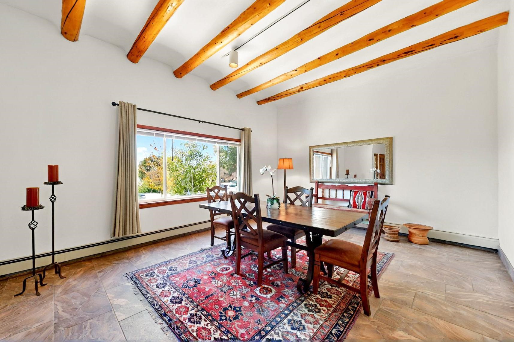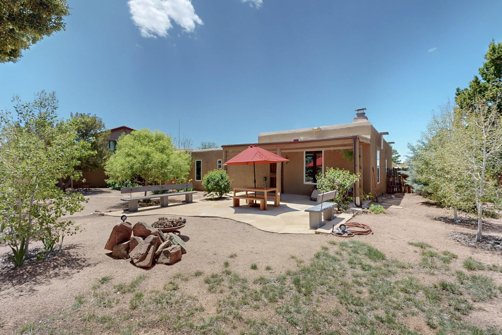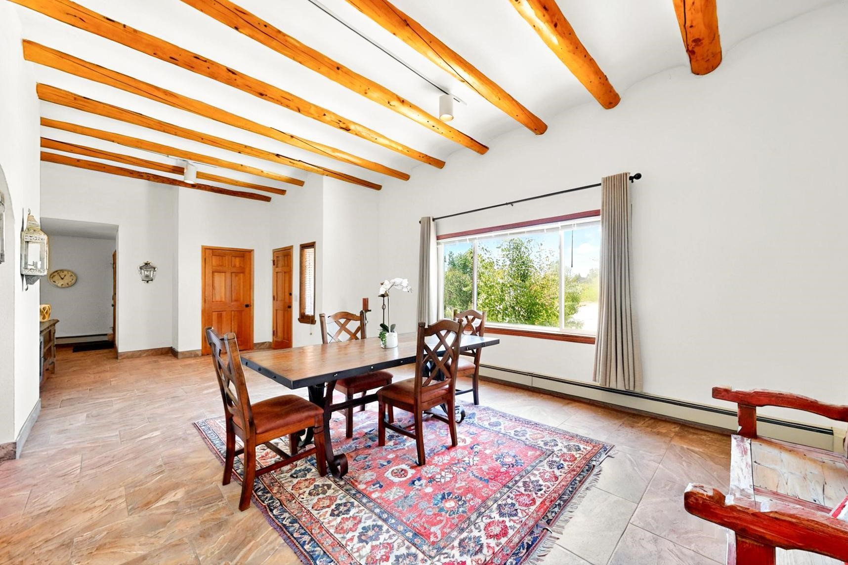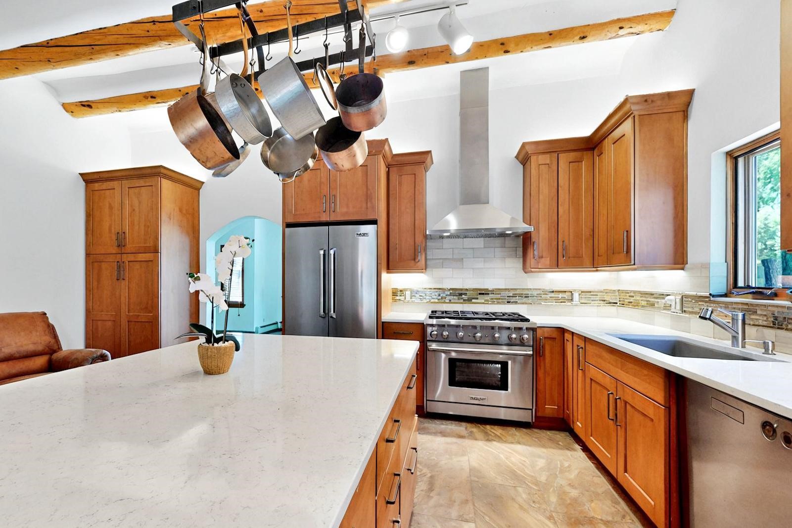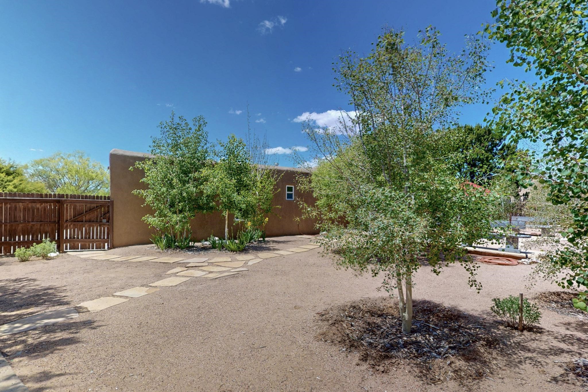 Discover this beautifully updated, move-in-ready single-level custom pueblo-style home in the desirable Villa Caballero subdivision. Ideally located less than 15 minutes from the Historic Santa Fe Plaza and close to parks, trails, and local amenities, this 3-bedroom, 2-bathroom residence offers 2,072 sq ft of comfortable living space on a spacious and gorgeous 0.28-acre lot. Tucked away in a quiet cul- de-sac, the home blends comfort, convenience, and tranquility. Step inside to soaring 11-foot ceilings that enhance the airy, open feel of the main living areas. The great room features a chef's kitchen with custom Alderwood cabinetry, under-cabinet lighting, soft-close drawers and doors, quartz countertops, a glass tile backsplash, and a custom island. Luxurious stainless steel appliances include a Wolf range with Zephyr hood and a counter-depth Jenn Air refrigerator. Oversized dual-pane windows with window treatments in the great room and primary bedroom allow for abundant natural light and improved energy efficiency. Arizona Porcelain tile flooring extends through the living areas, with plush new carpeting in the bedrooms. Both bathrooms are tastefully updated with modern finishes. The spacious primary suite includes a walk-in closet and a renovated en-suite bath. The private, fully enclosed backyard is perfect for entertaining with a rear patio, flagstone pathways, mature juniper and aspen trees, and a wooden garden shed for extra storage. Additional highlights include new Jeld-Wen dual pane windows in the great room and primary bedroom, baseboard heating, ductless mini-splits A/C, a cozy kiva fireplace, a finished two-car garage with built-in cabinetry, RV/boat parking, and recent roof maintenance with a three-year warranty, extendable to five years. This thoughtfully updated home offers the perfect combination of style, comfort, and location--schedule your private showing today!