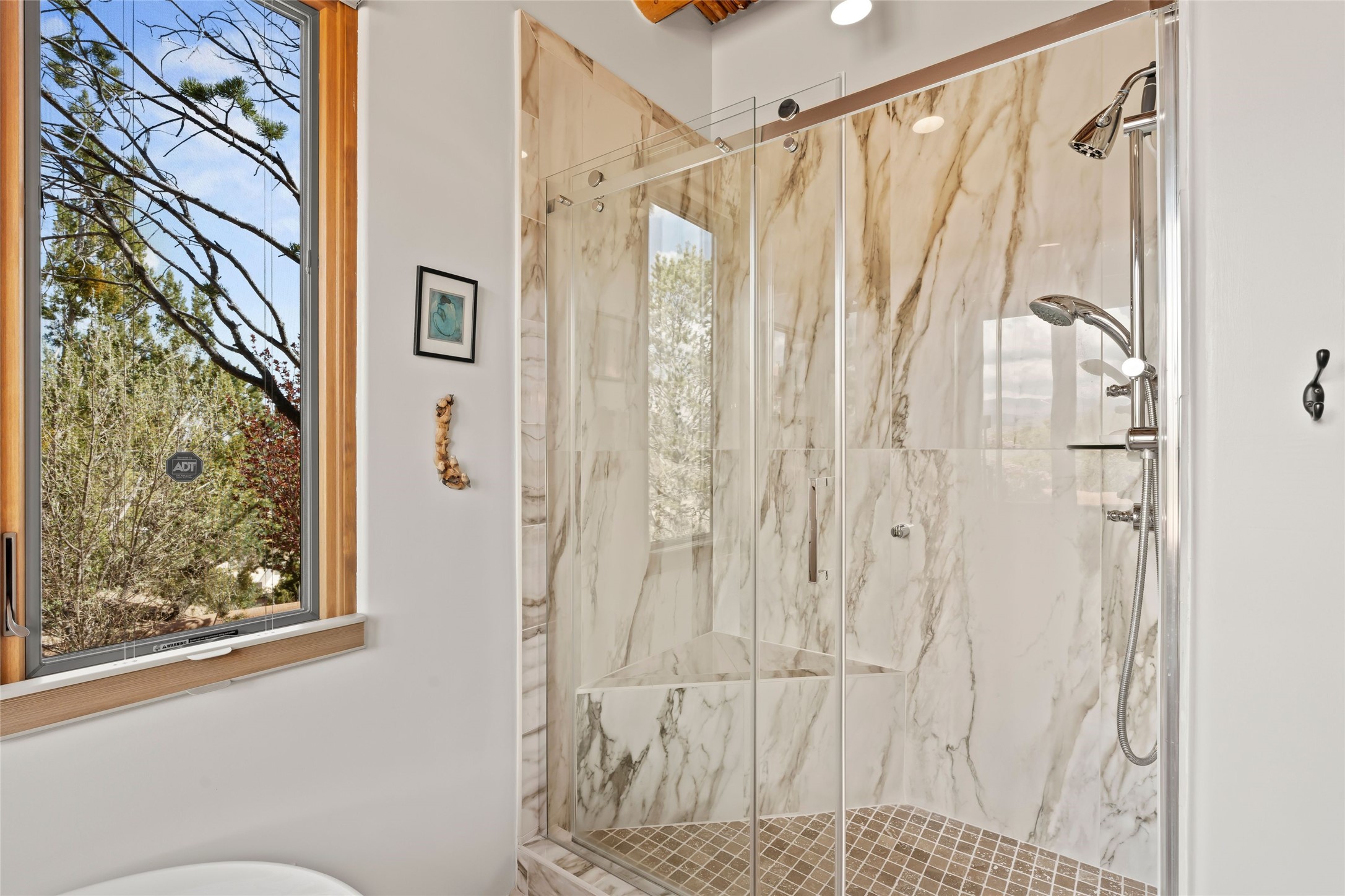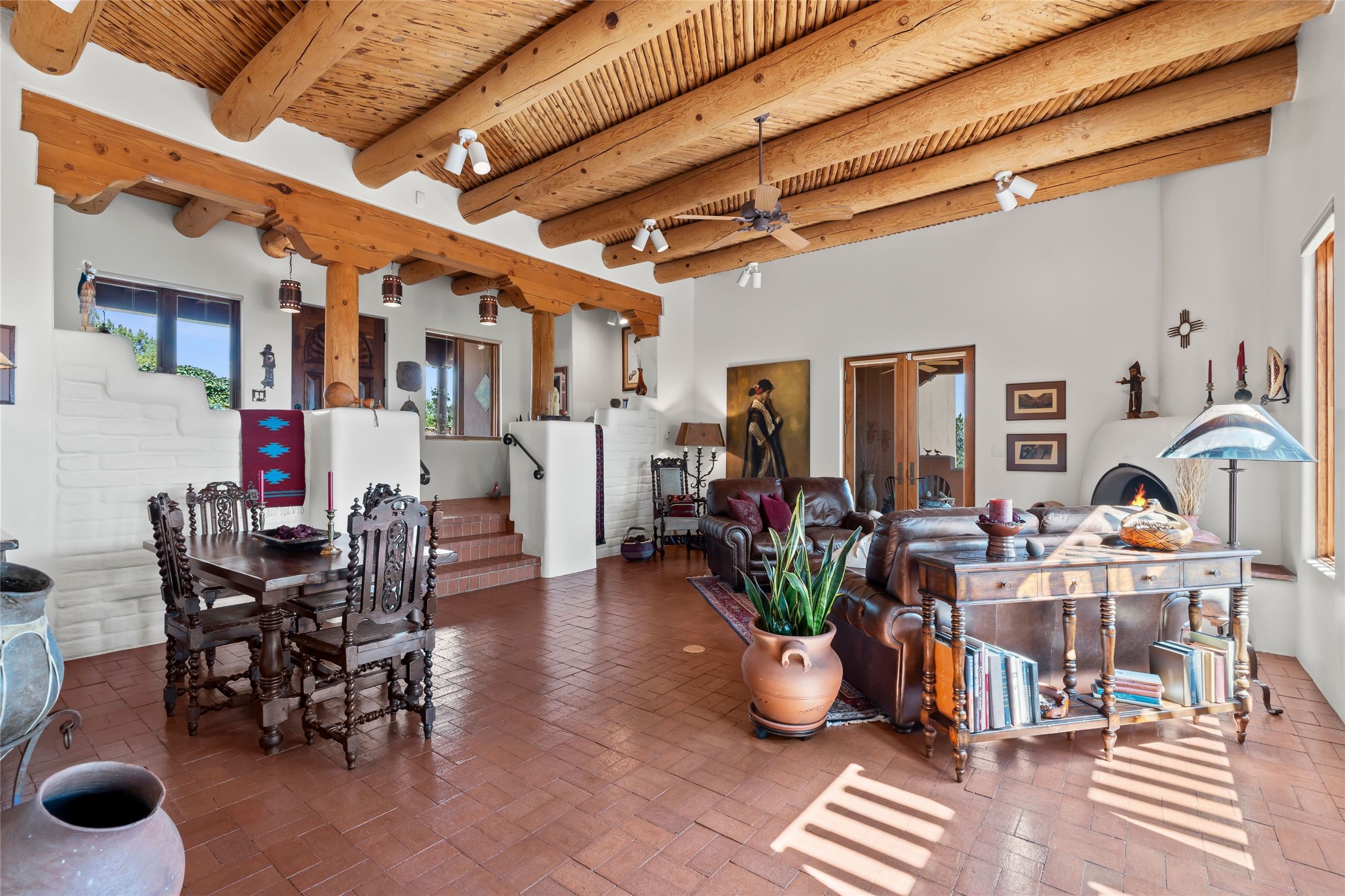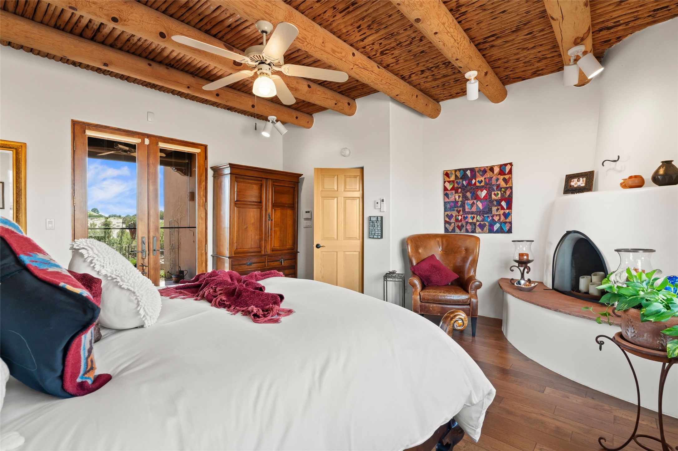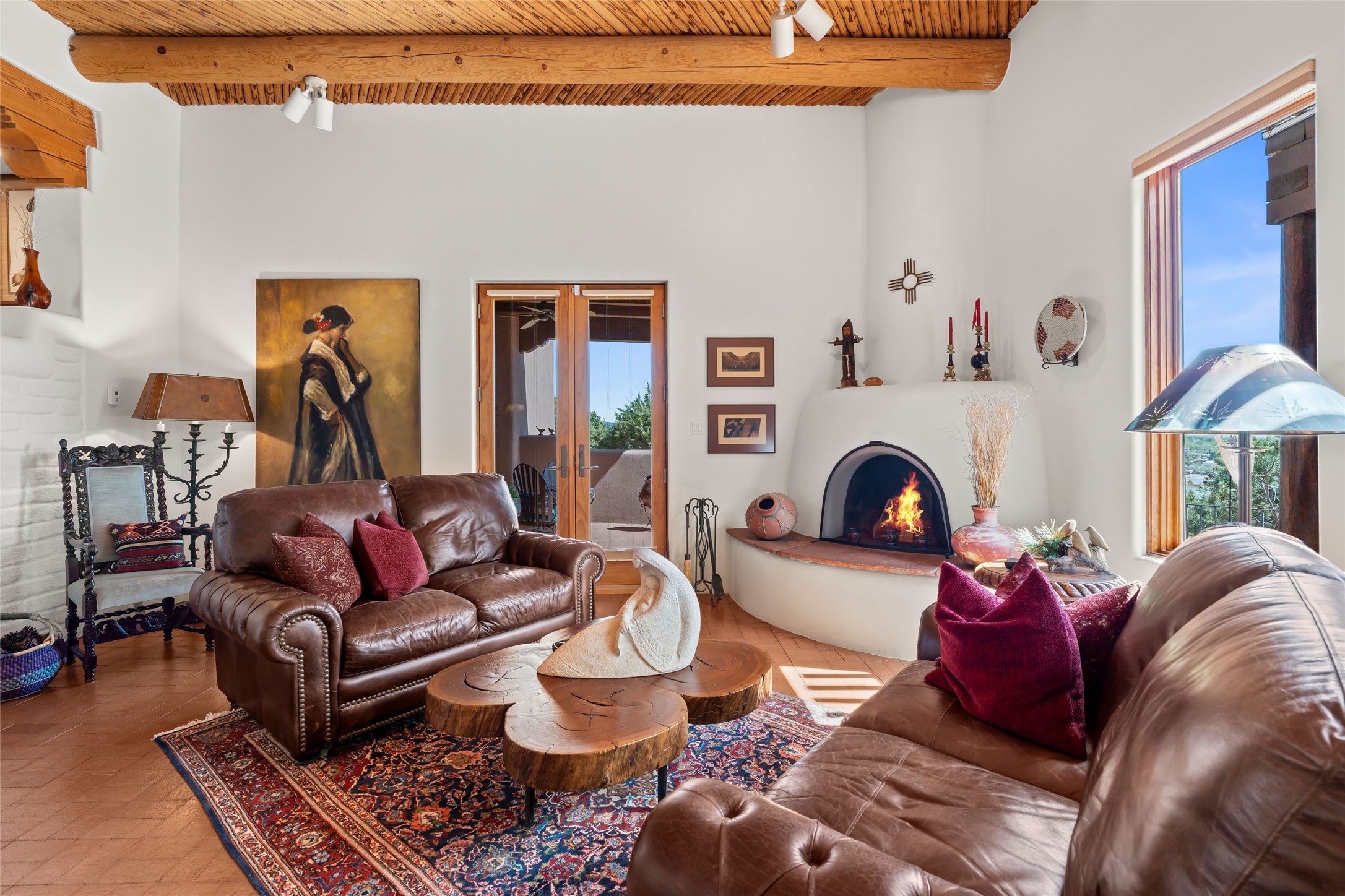 Step through the custom-designed front door and you're instantly welcomed by the charm of traditional Pueblo architecture--soaring ceilings with vigas and latillas, three cozy kiva fireplaces, and classic brick flooring. This thoughtfully updated home features fully remodeled bathrooms and kitchen, fresh paint throughout, redesigned closets, a walled courtyard, an epoxy-coated garage floor, and a modern alarm system. New windows frame breathtaking mountain and sky views from three sides of the home, offering daily front-row seats to spectacular sunrises and sunsets. Enjoy three distinct outdoor living spaces, perfect for relaxing or entertaining in style. Nestled in a serene natural landscape at the end of a quiet cul-de-sac, this home provides exceptional privacy while still being part of a welcoming neighborhood--just 12 minutes from the historic Plaza.