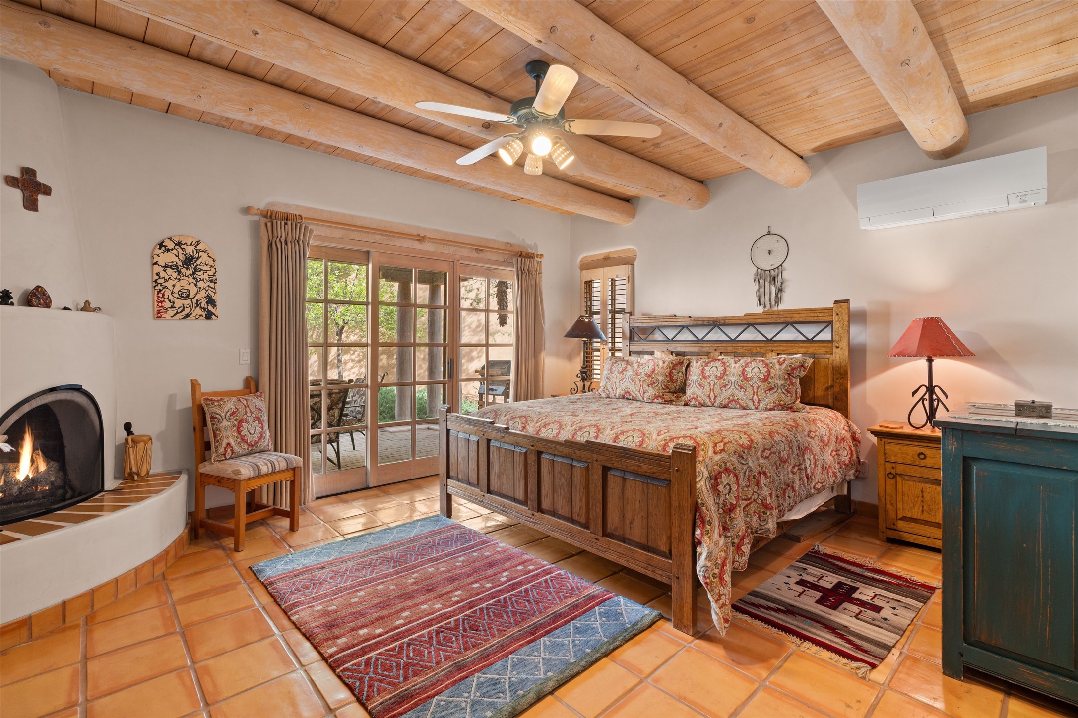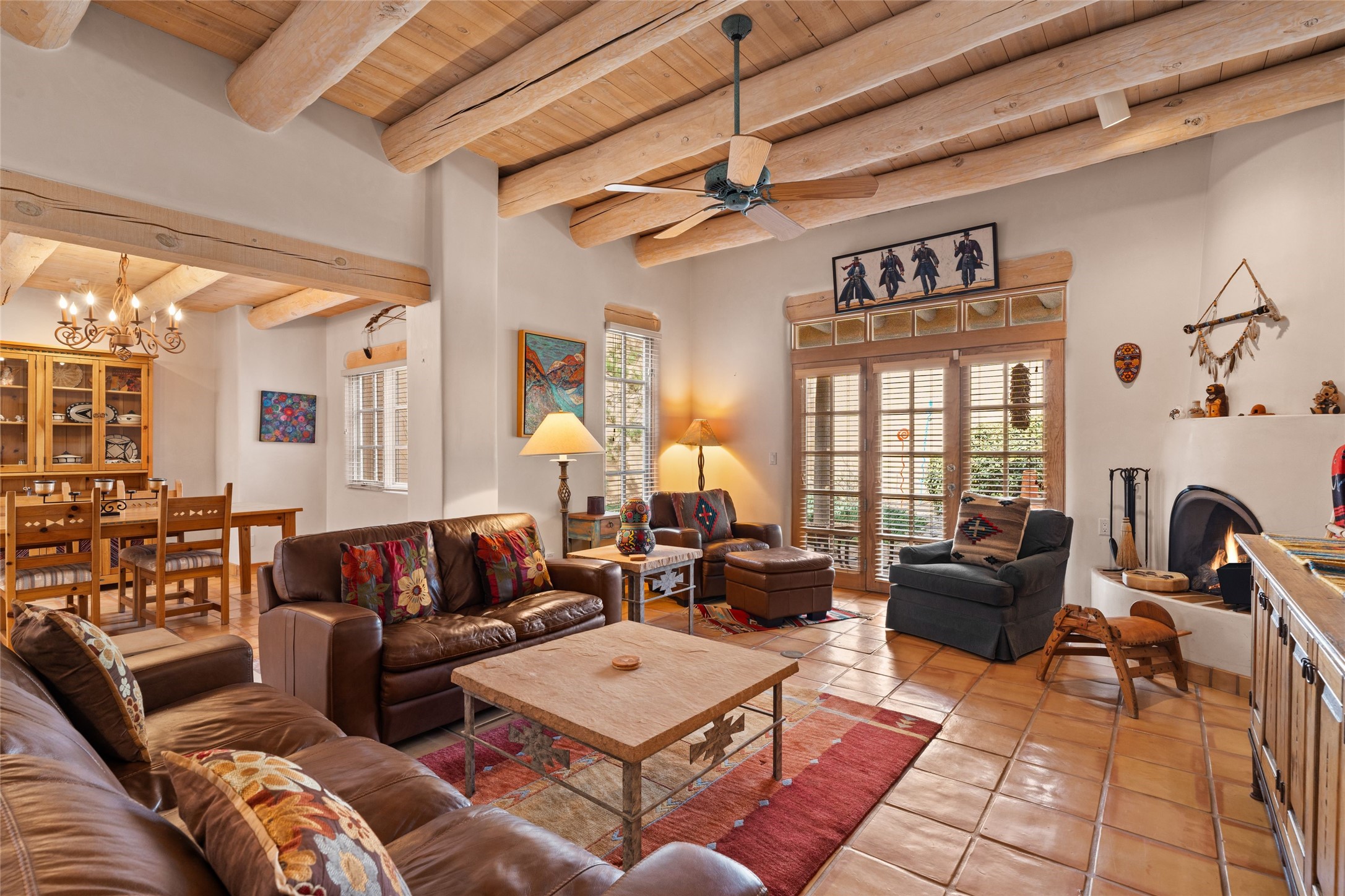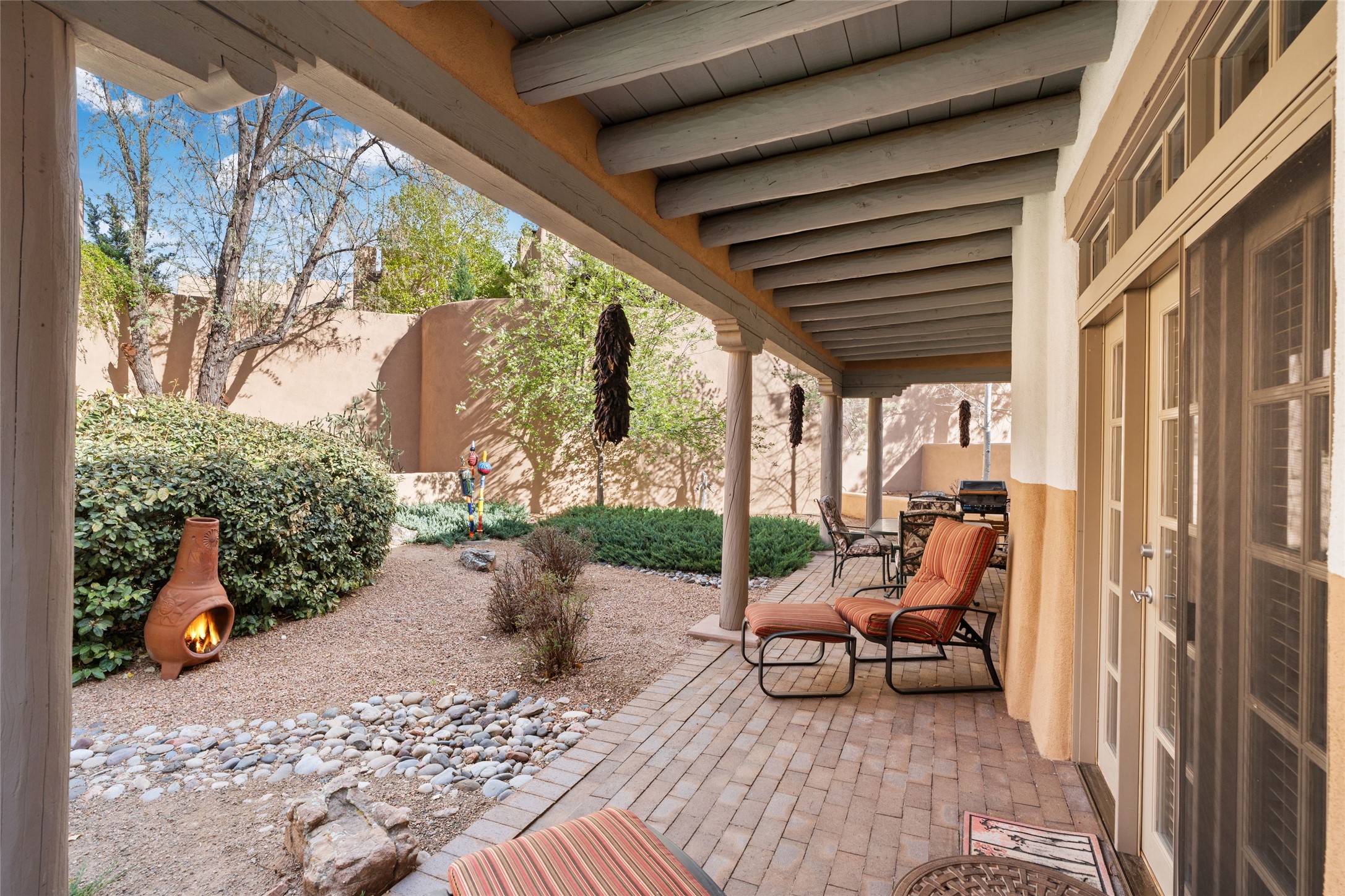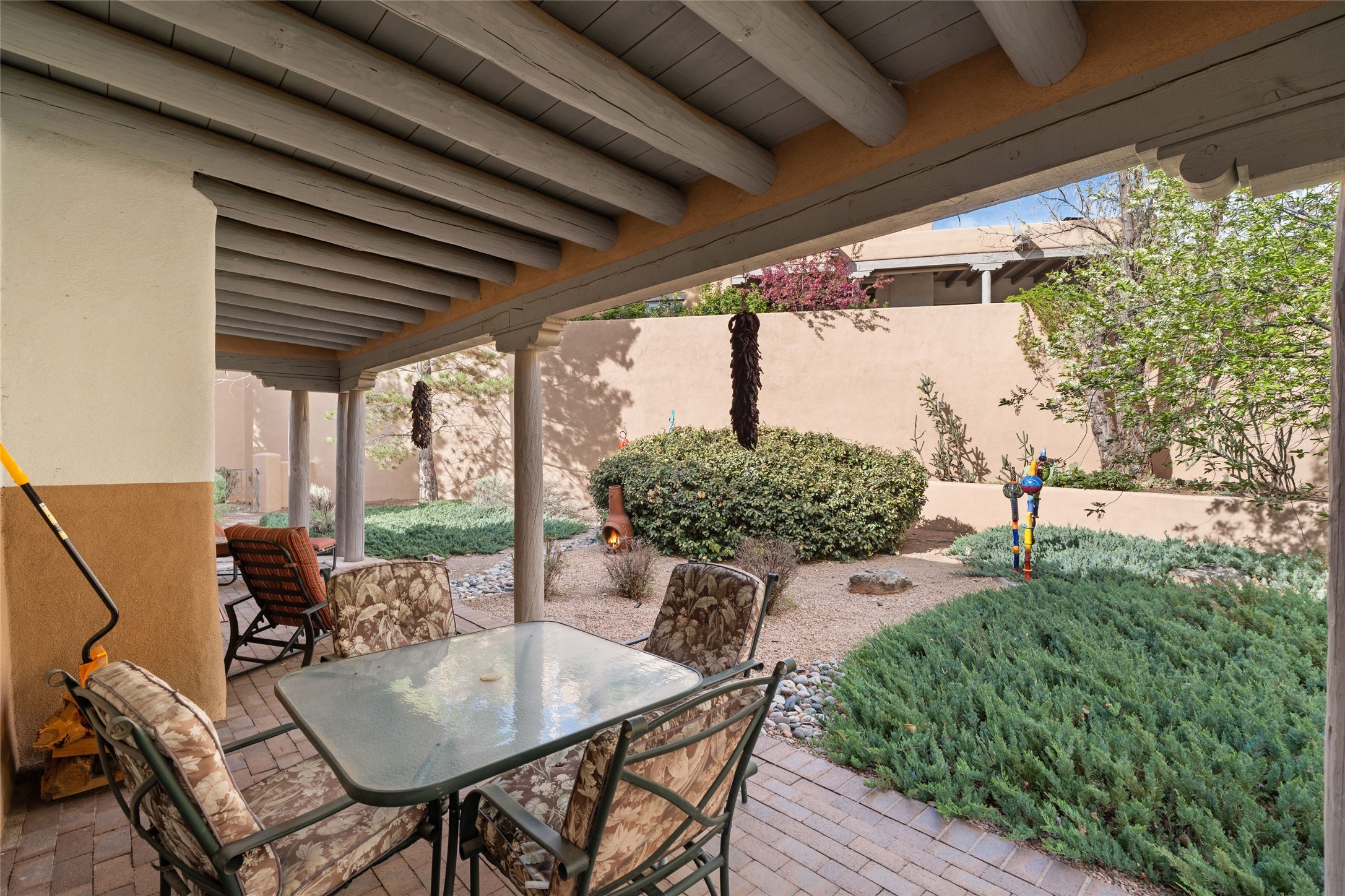 Classic Quail Run Pinon B with delightful outdoor spaces, charming Santa Fe style and an ideal floorplan. Enter through the spacious front courtyard which showcases views of the first green and those fabulous sunsets. The home will greet you with Saltillo floors, open living and optimal separation of bedrooms. Light filled kitchen nook compliments a spacious kitchen which extends to an alluring dining and living area. Sizable primary bedroom features a wood burning Kiva and opens to an ample back portal with lovely high desert landscape. Located on a quiet cul de sac in the midst of Santa Fe's premier condominium resort. Ownership at Quail Run includes 24 hour hosted security, beautiful grounds, state of the art gym and pool, multiple fitness classes, engaging 9 hole golf course, pickleball, tennis and much more. Come and experience!