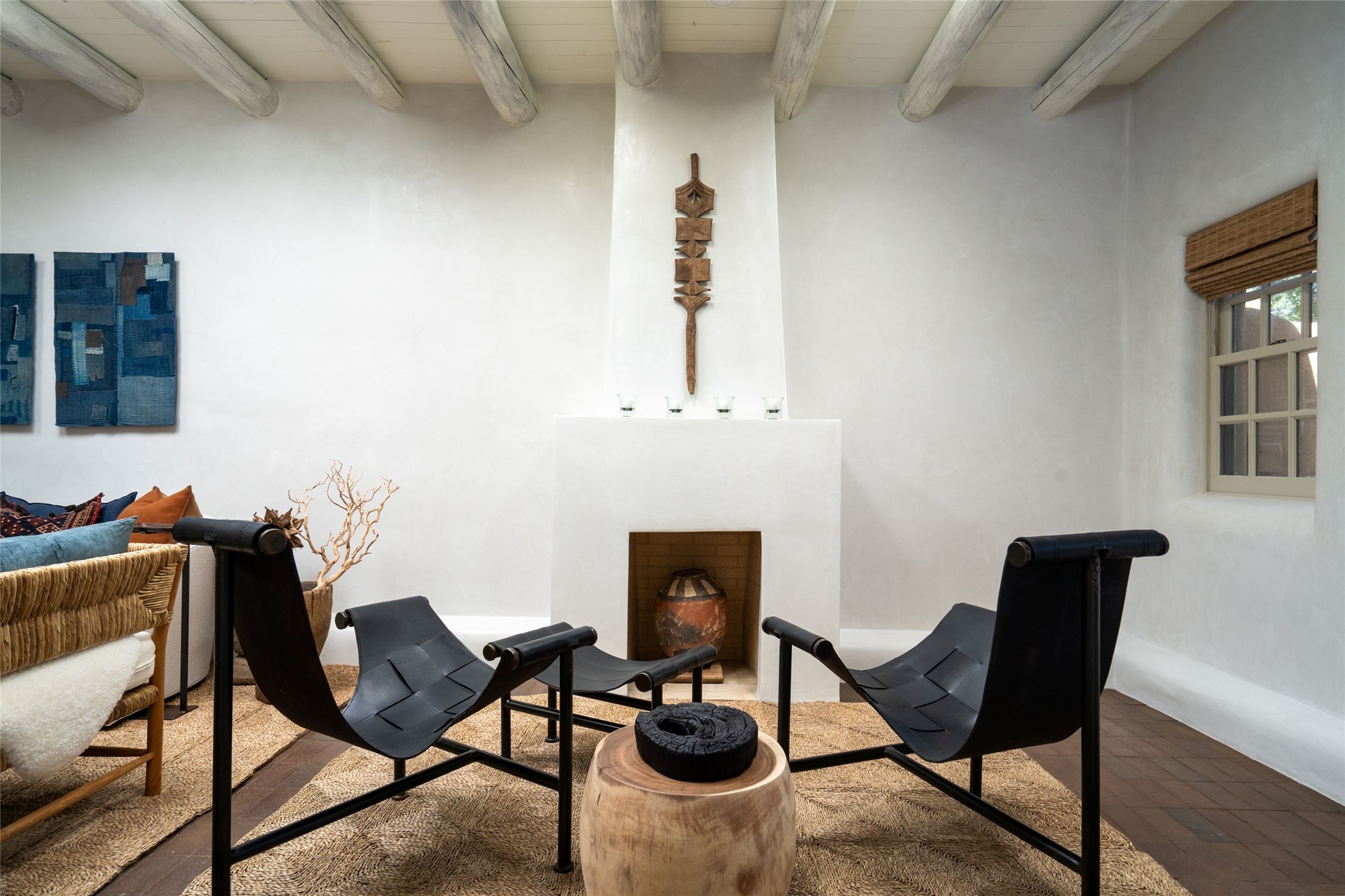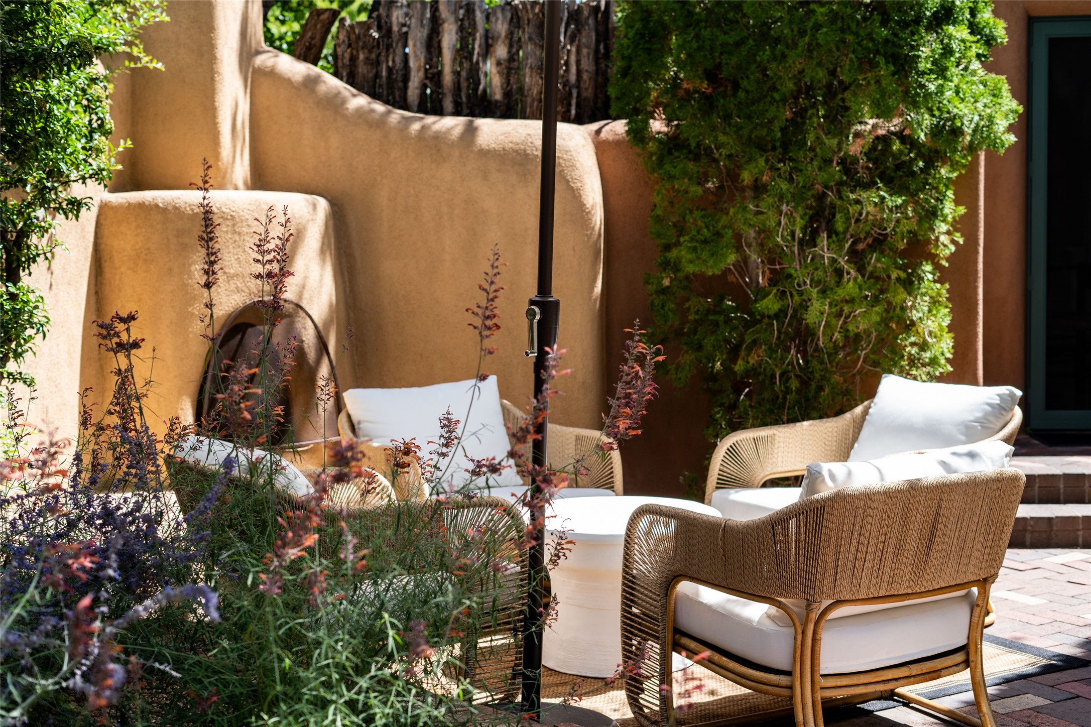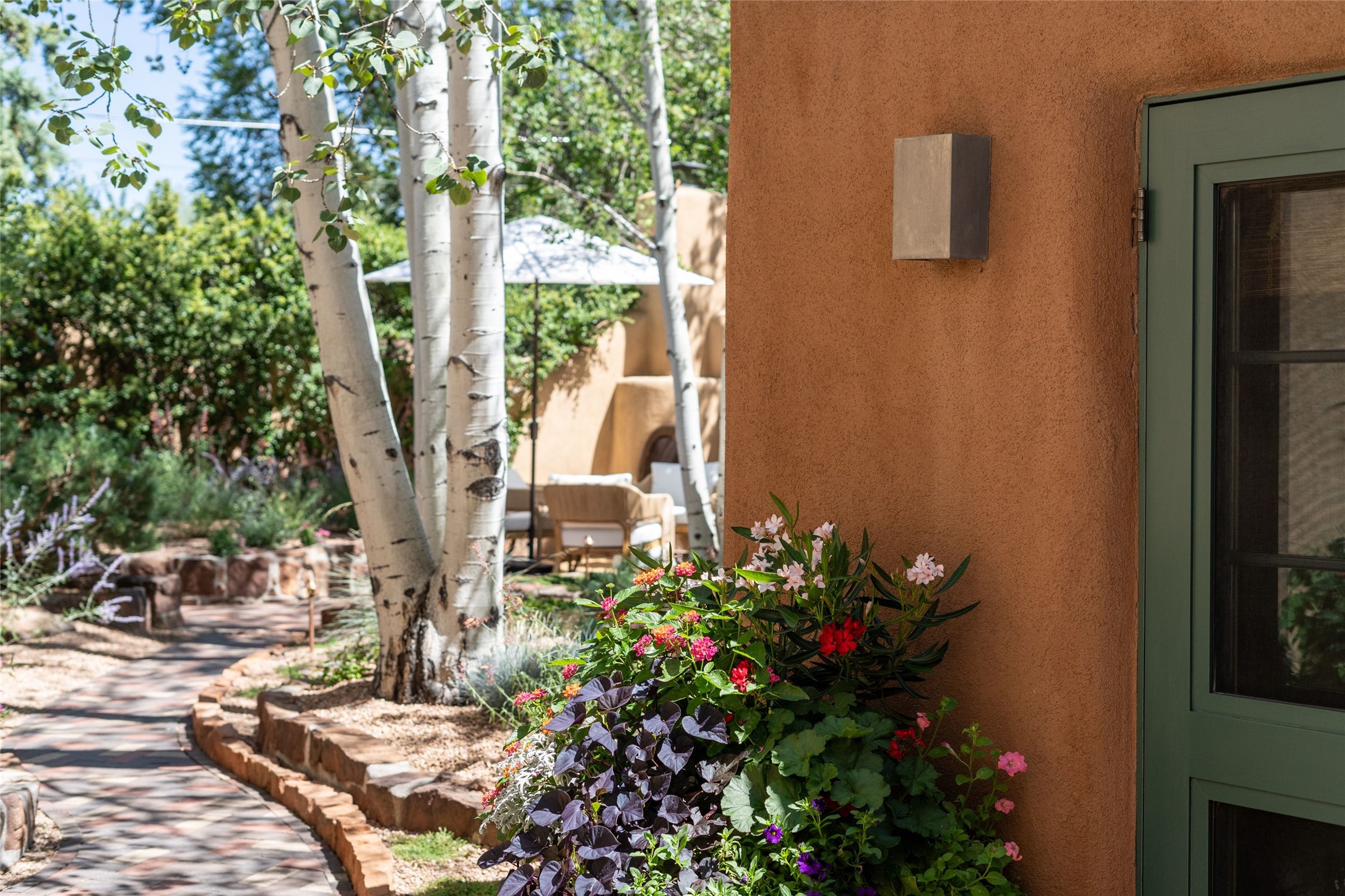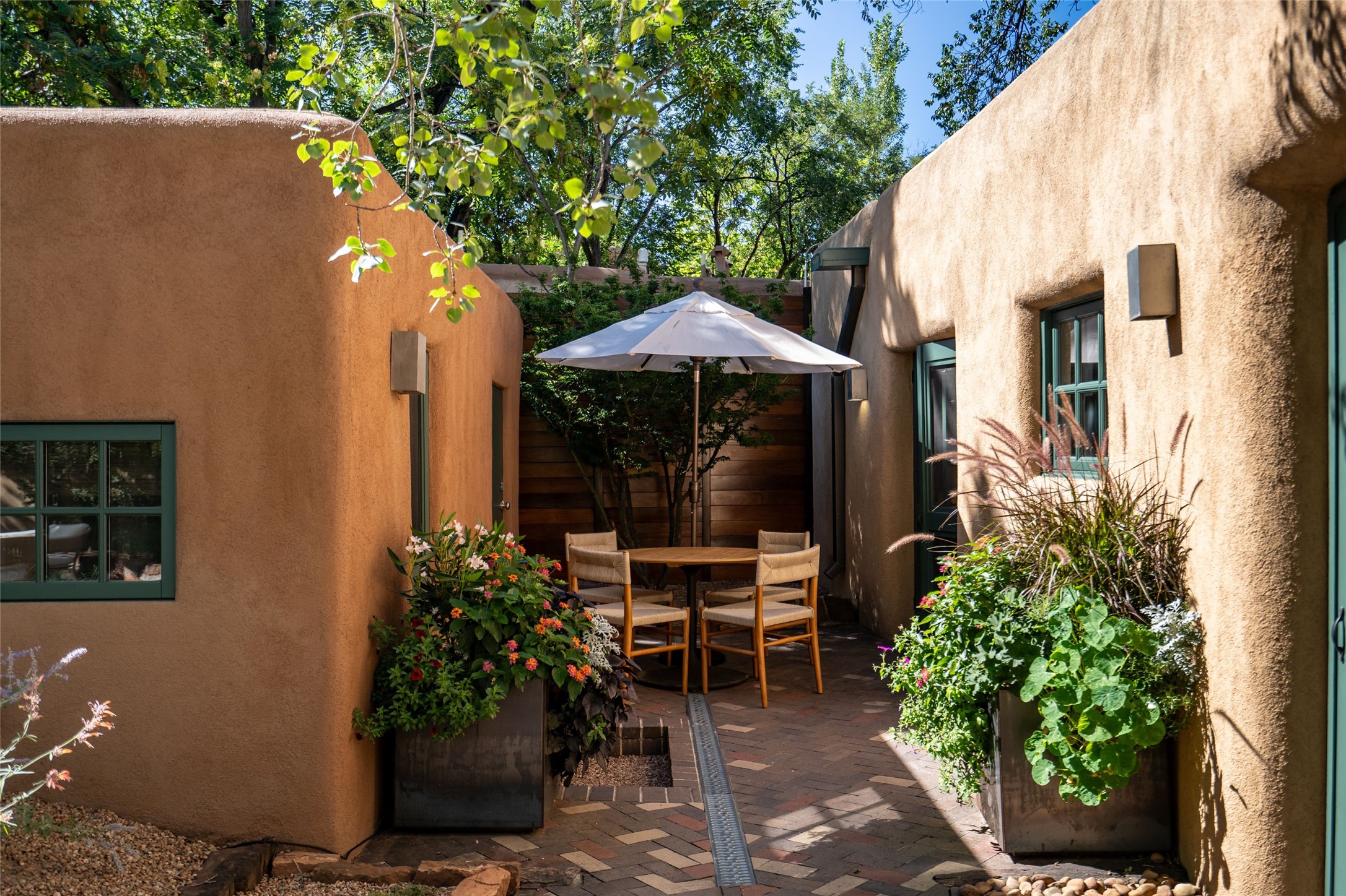 Recently renovated Pueblo-style compound that captures the spirit of Santa Fe in the heart of the coveted Historic Eastside. As you enter this enchanting property, you are greeted by a beautifully landscaped courtyard, a tranquil escape with multiple seating areas, perfect for indulging in quiet moments or lively gatherings. The property exudes old-world charm, featuring five wood-burning fireplaces, traditional vigas and beams, and a delightful mix of brick, tile, and wood floors that create a warm and welcoming atmosphere. The 1,521 sq. ft. main house offers 2 spacious bedrooms and 2.5 elegantly appointed baths. 2 dedicated parking spots lead to a private entrance. The thoughtfully remodeled interior showcases a redesigned kitchen that is both functional and exquisite, featuring custom cabinetry and high-end appliances. New primary suite is adorned with reclaimed terracotta Giallo-style tile, a chic wet bar, and a sophisticated Domingue waterproof plaster bath. Additionally, there is a rare finished 554 sq. ft. basement. Complementing the main residence is a charming 1,216 sq. ft. guesthouse. This newly renovated space features two parking spots and a gated entrance. With its open-concept design and skylights, the guesthouse is bathed in natural light, creating a bright and airy ambiance. Ideally located, just moments away from Downtown Subscription, a local coffee house and gathering spot, as well as Canyon Road, Kakawa Chocolate, and Kaune's Neighborhood Market